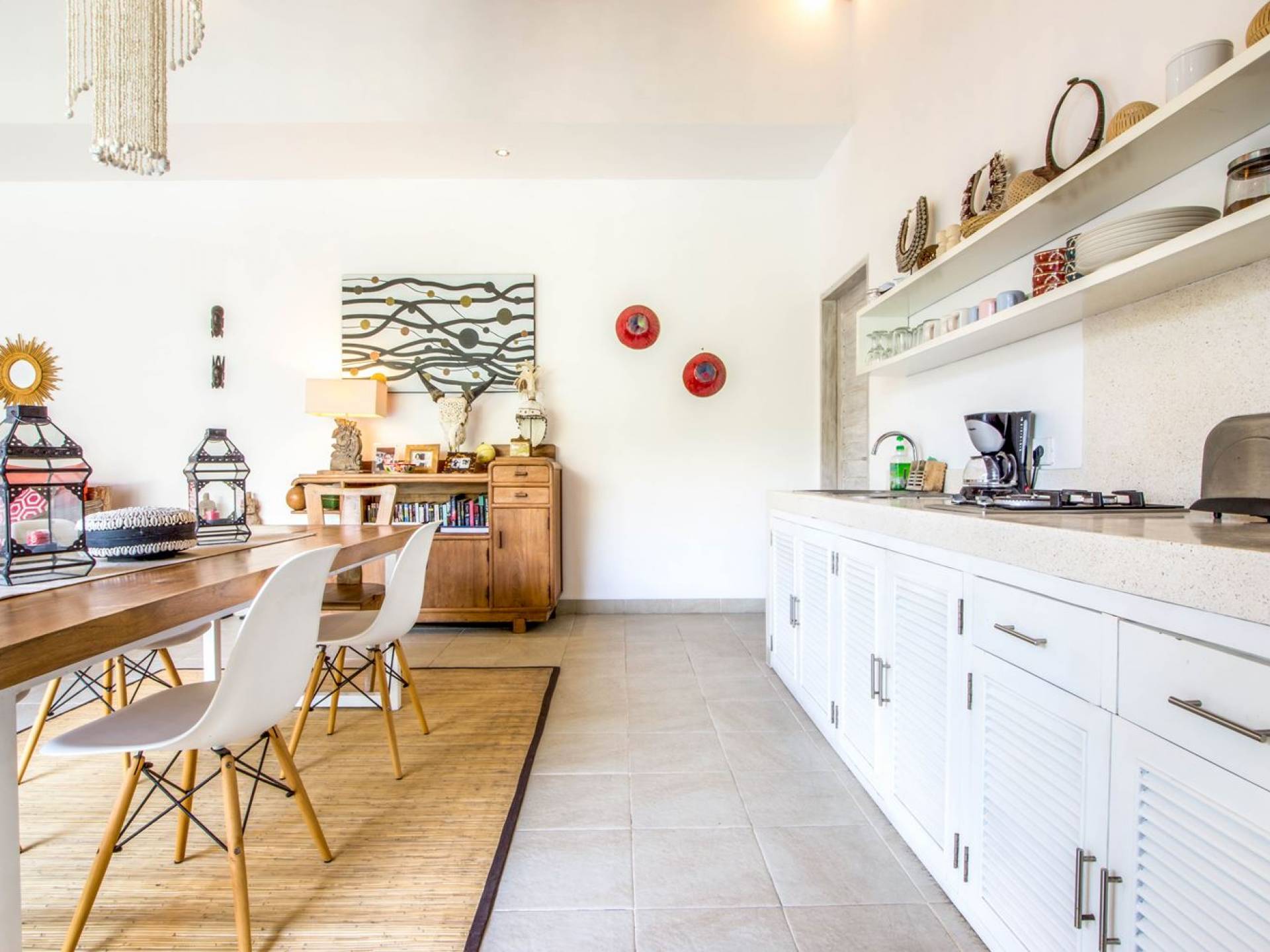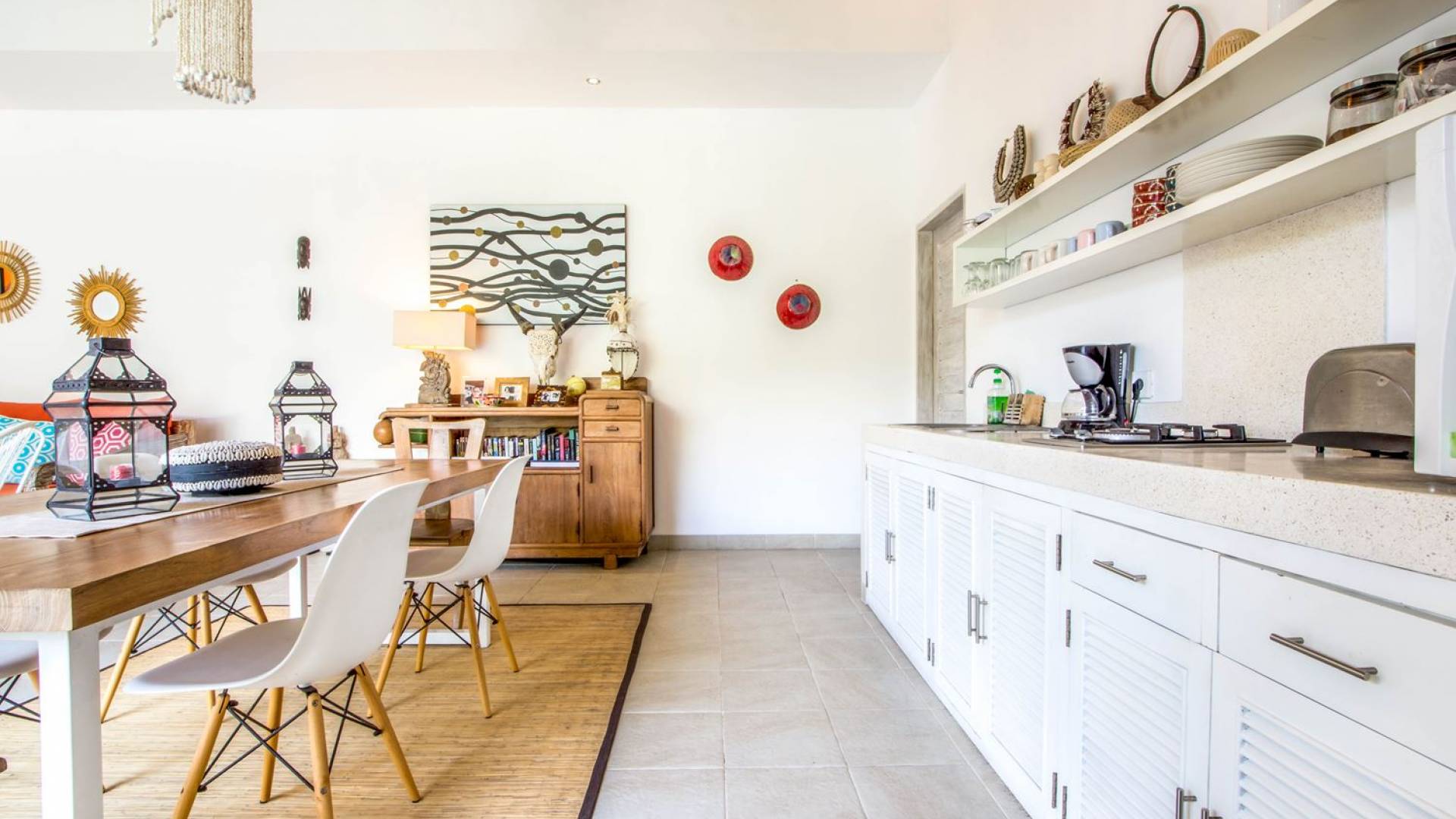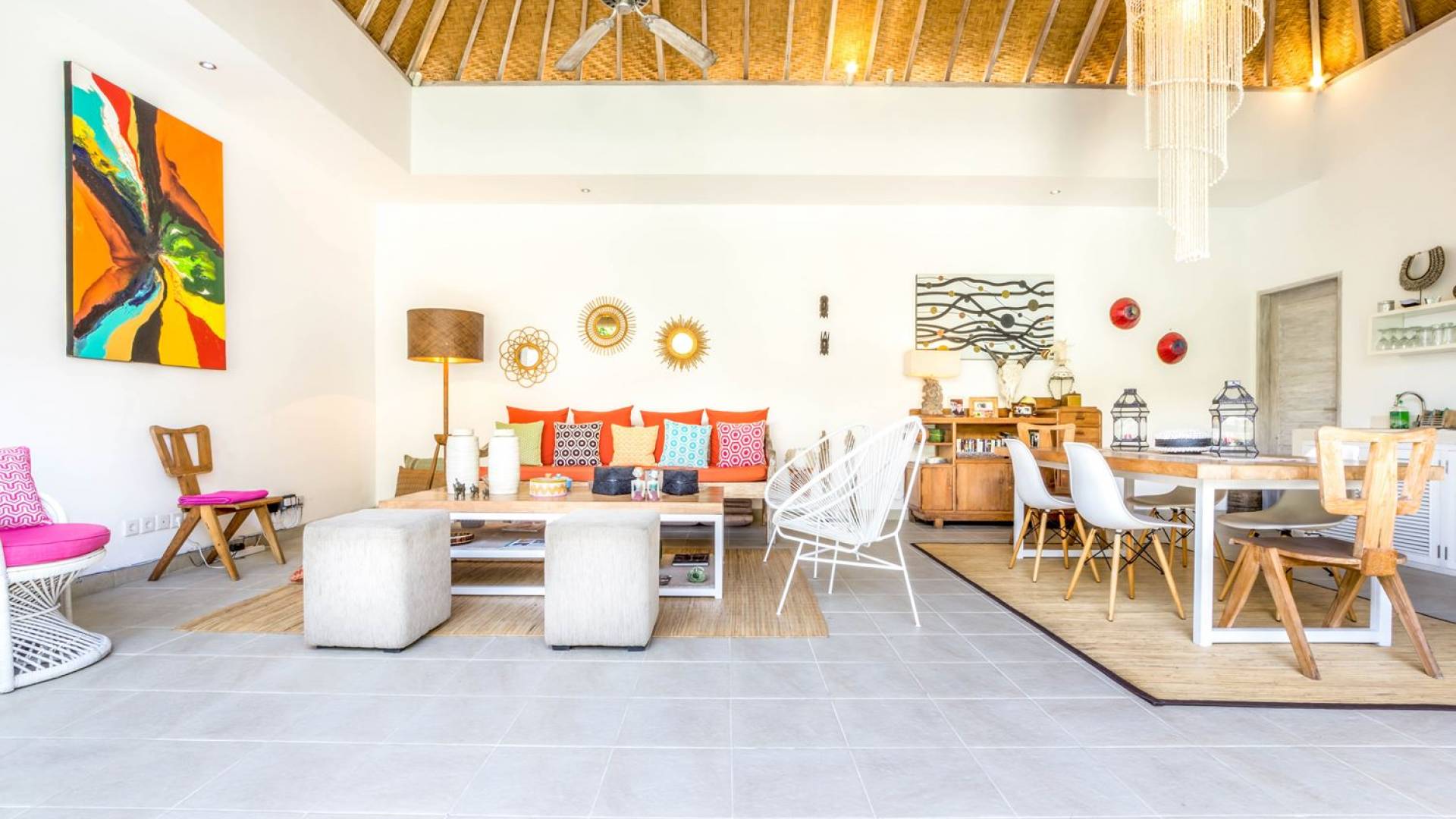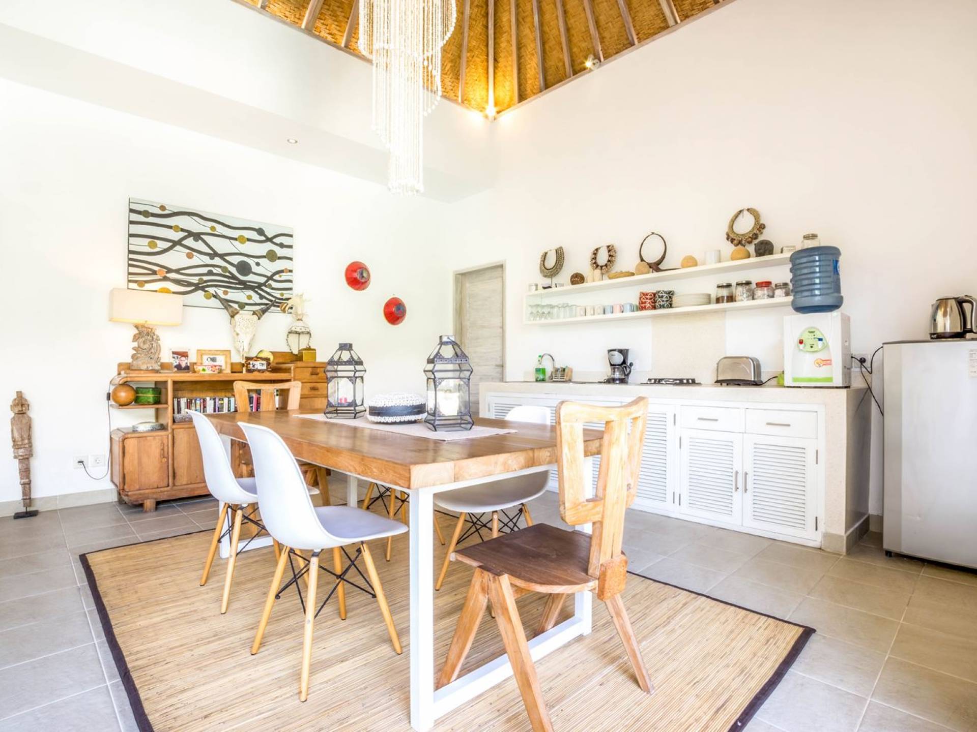 Το ζωντανό κιόσκι έχει υπέροχο σχεδιασμό ενιαίας διαρρύθμισης, που αγκαλιάζει τον τροπικό τρόπο ζωής και παρέχει εύκολη πρόσβαση στην πισίνα. Αυτό είναι επίσης χρήσιμο όταν οι γονείς θέλουν να χαλαρώσουν με ένα καλό ποτήρι κρασί, έχοντας ακόμα τη δυνατότητα να παρακολουθούν τα παιδιά που παίζουν έξω στην πισίνα. Κάτω από την ψηλή παραδοσιακή ταράτσα, η εσωτερική διακόσμηση του σαλονιού κυριαρχείται από έντονα χρώματα, έργα τέχνης και έπιπλα από το Μπαλί. Στη μία πλευρά βρίσκεται μια άνετη, άνετη γωνιά σαλονιού με έναν μπαλινέζικο καναπέ, μια δερμάτινη καρέκλα και μια μοναδική καρέκλα βασιλιά, όλα στρωμένα με μαξιλάρια σε φωτεινά χρώματα. Αυτό κάνει το τέλειο μέρος για να καθίσετε μαζί, να απολαύσετε ποτά, να διαβάσετε ένα βιβλίο ή να παρακολουθήσετε τηλεόραση το βράδυ. Τα γεύματα απολαμβάνετε στην όμορφη τραπεζαρία από ξύλο τικ για έξι άτομα και η κουζίνα είναι καλά εξοπλισμένη για την απόλυτη άνεση στο σπίτι σας στο νησί του Μπαλί.