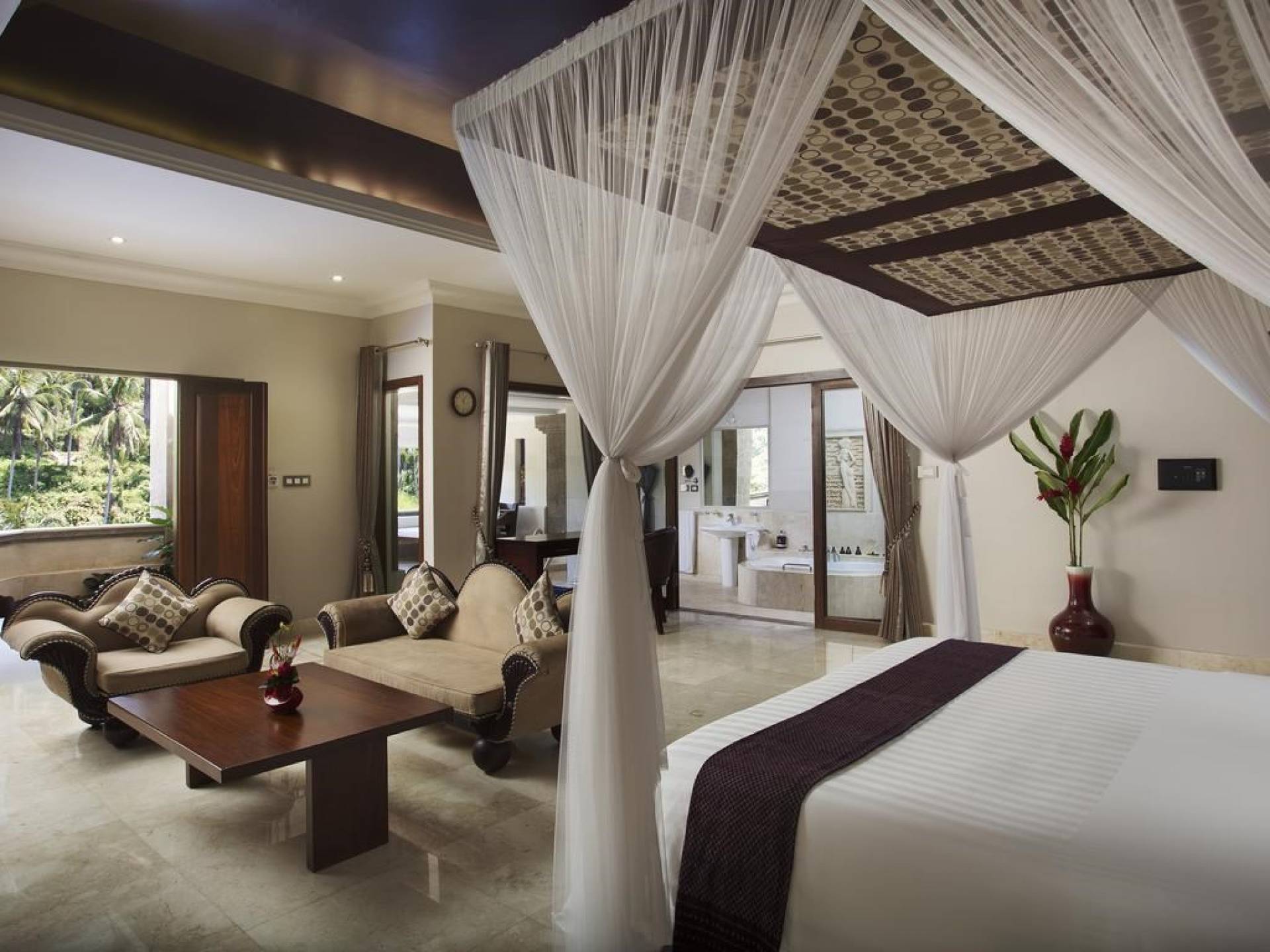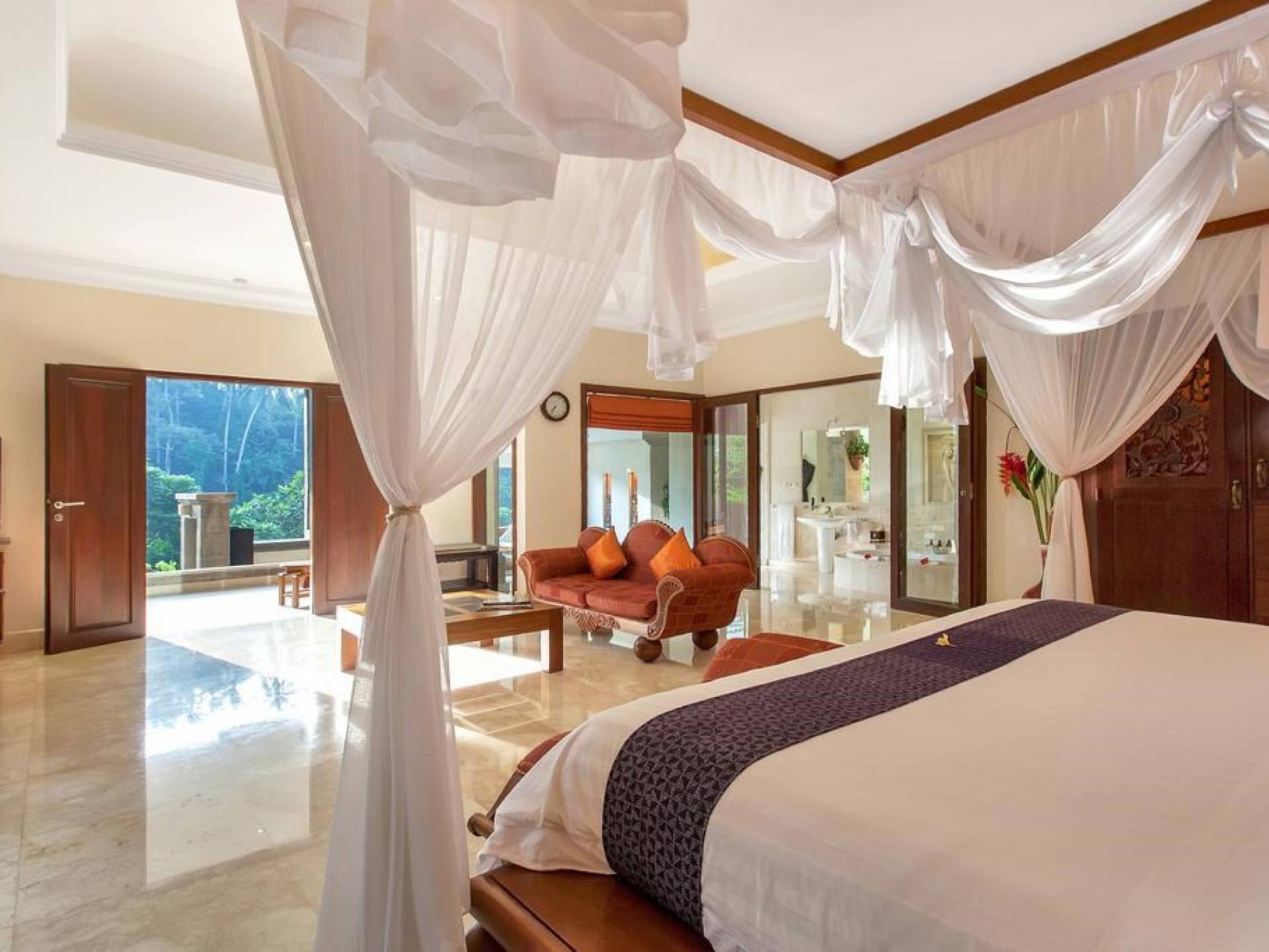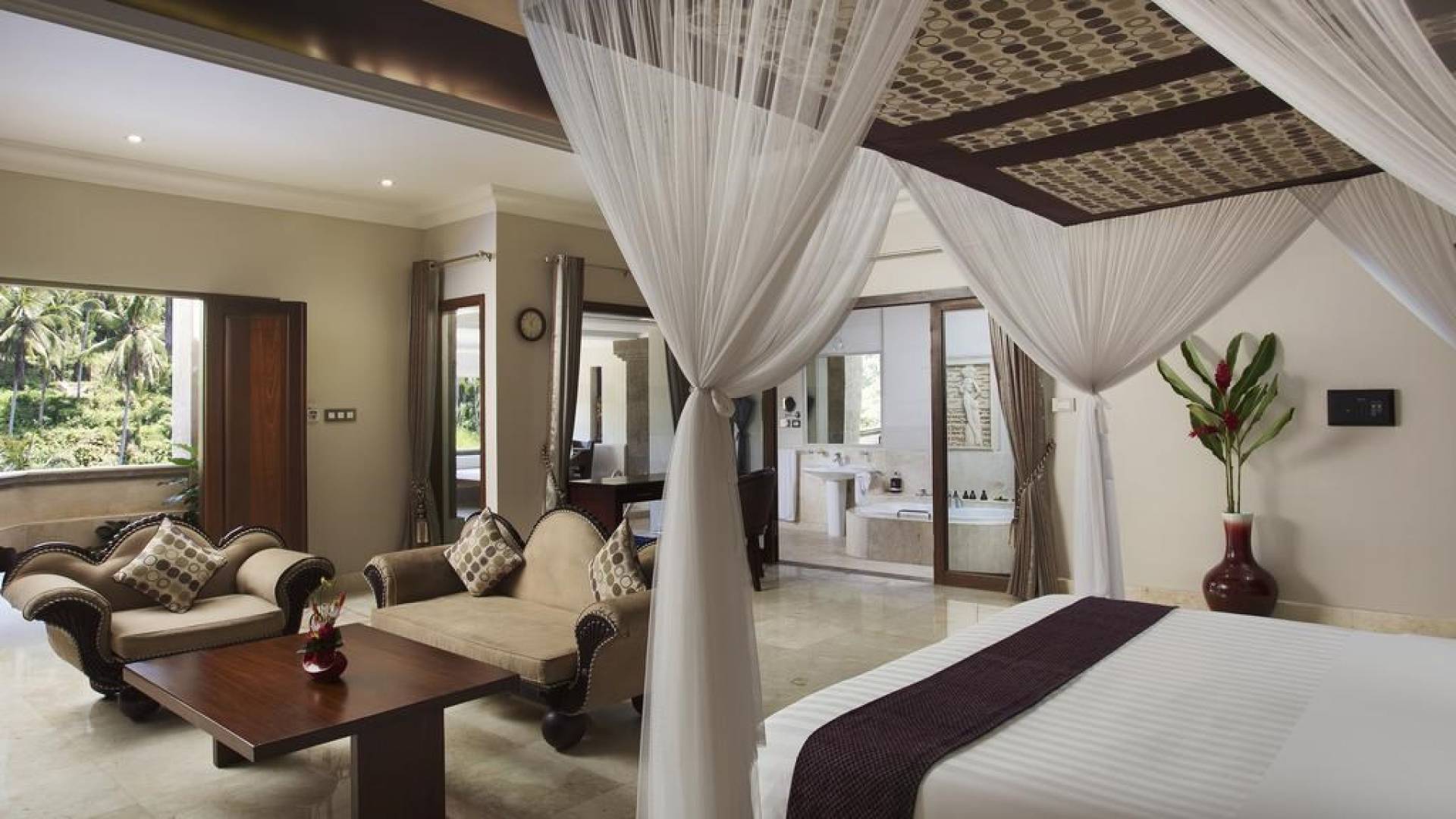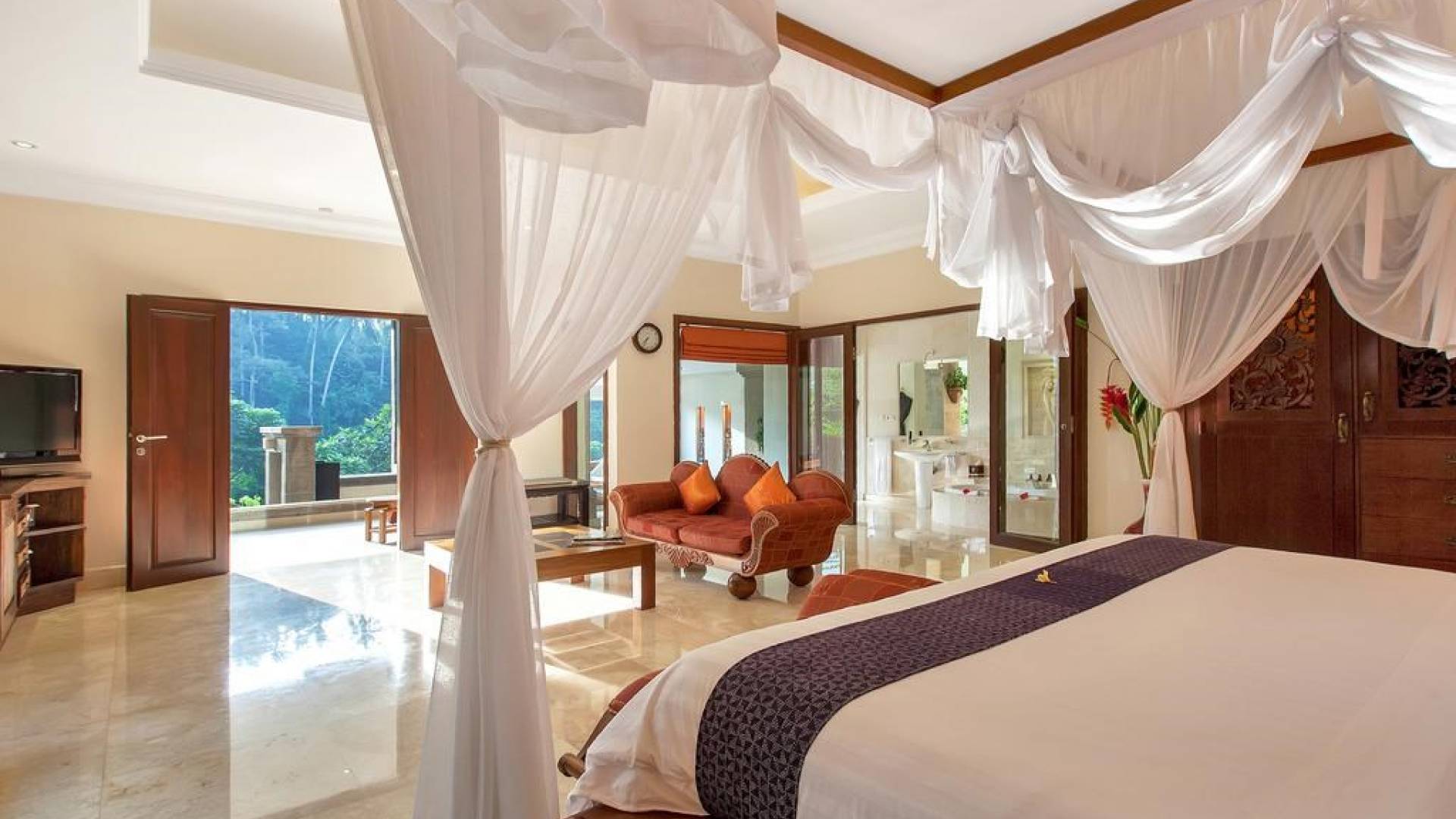 Το ανάκλιντρο και το σκεπασμένο κατάστρωμα παρέχουν άφθονη άνεση και χώρο για να απολαύσετε την εντυπωσιακή θέα στη ζούγκλα, ενώ προστατεύονται από τα στοιχεία. Μέσα στο υπνοδωμάτιο και το σαλόνι, περιμένετε έναν γενναιόδωρο χώρο για χαλάρωση και άφθονες ανέσεις. Τα καταλύματα στο Ubud με ιδιωτικές σουίτες πισίνας είναι ενός υπνοδωματίου και έχουν μέγεθος 150 m2 (1615 ft2).