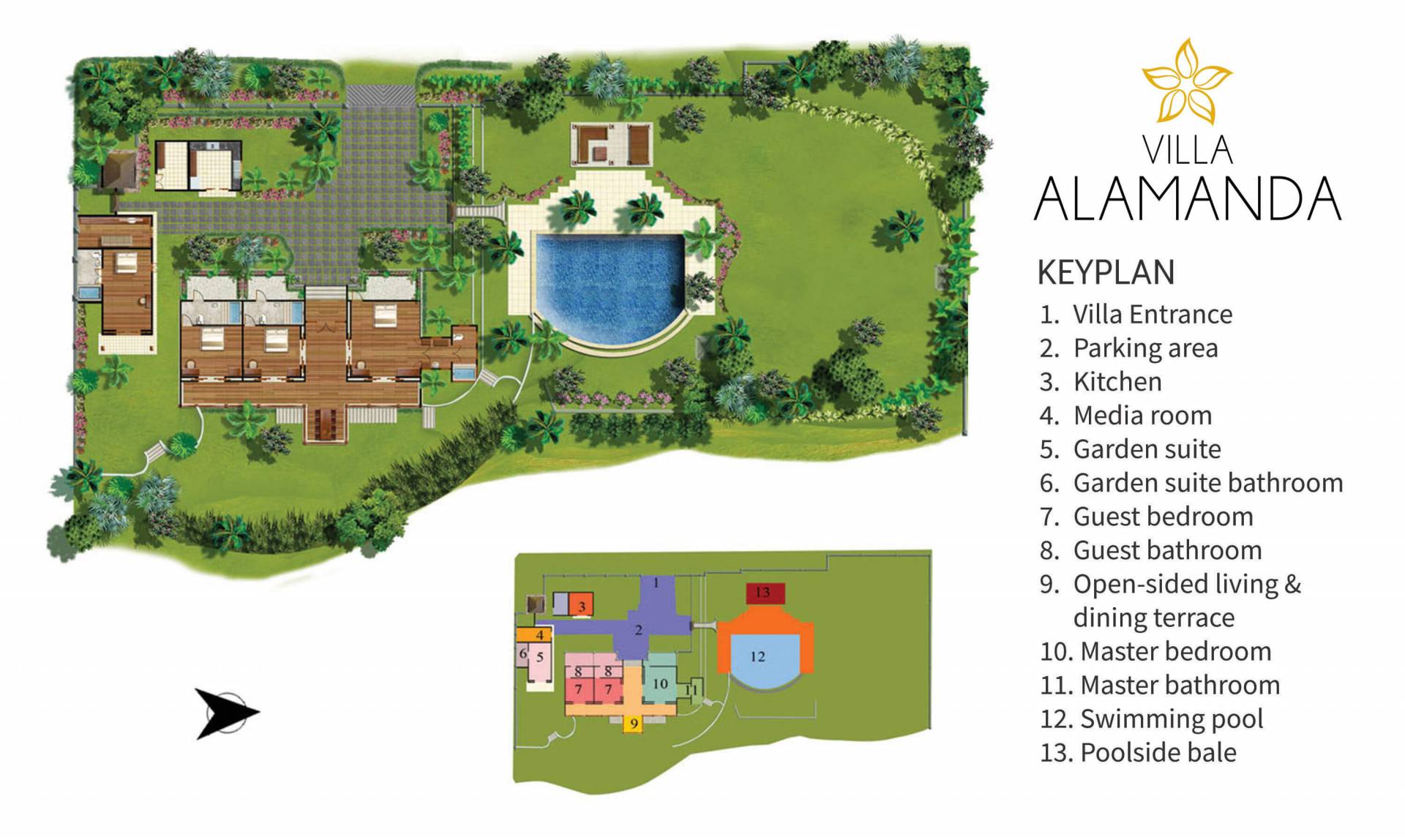 Το έμπειρο και φιλόξενο προσωπικό θα ικανοποιήσει τις ανάγκες σας, ενώ ο επαγγελματίας σεφ μπορεί να σας ετοιμάσει νόστιμα γεύματα από φρέσκα υλικά. Αγκαλιάζοντας τη χάρη και την ομορφιά του φυσικού περιβάλλοντος που προστατεύεται από πλούσιους καταπράσινους κήπους και μια πανέμορφη πισίνα. Με τη Villa Alamanda, οι ιδανικές διακοπές μπορούν να μετατραπούν σε μια μοναδική αξέχαστη εμπειρία.
