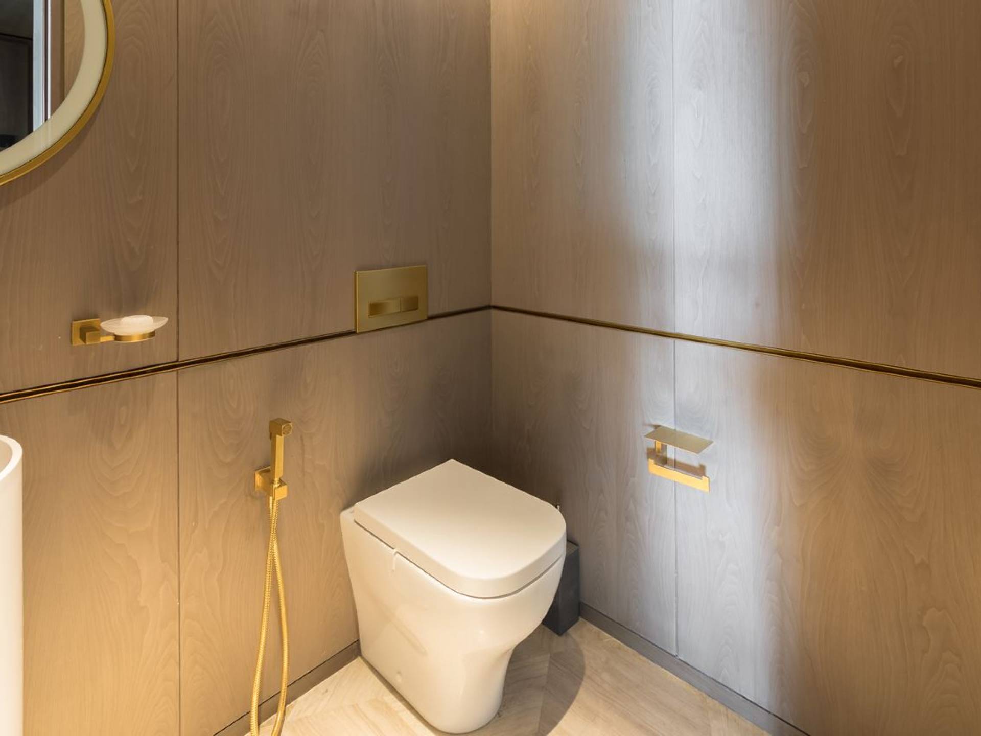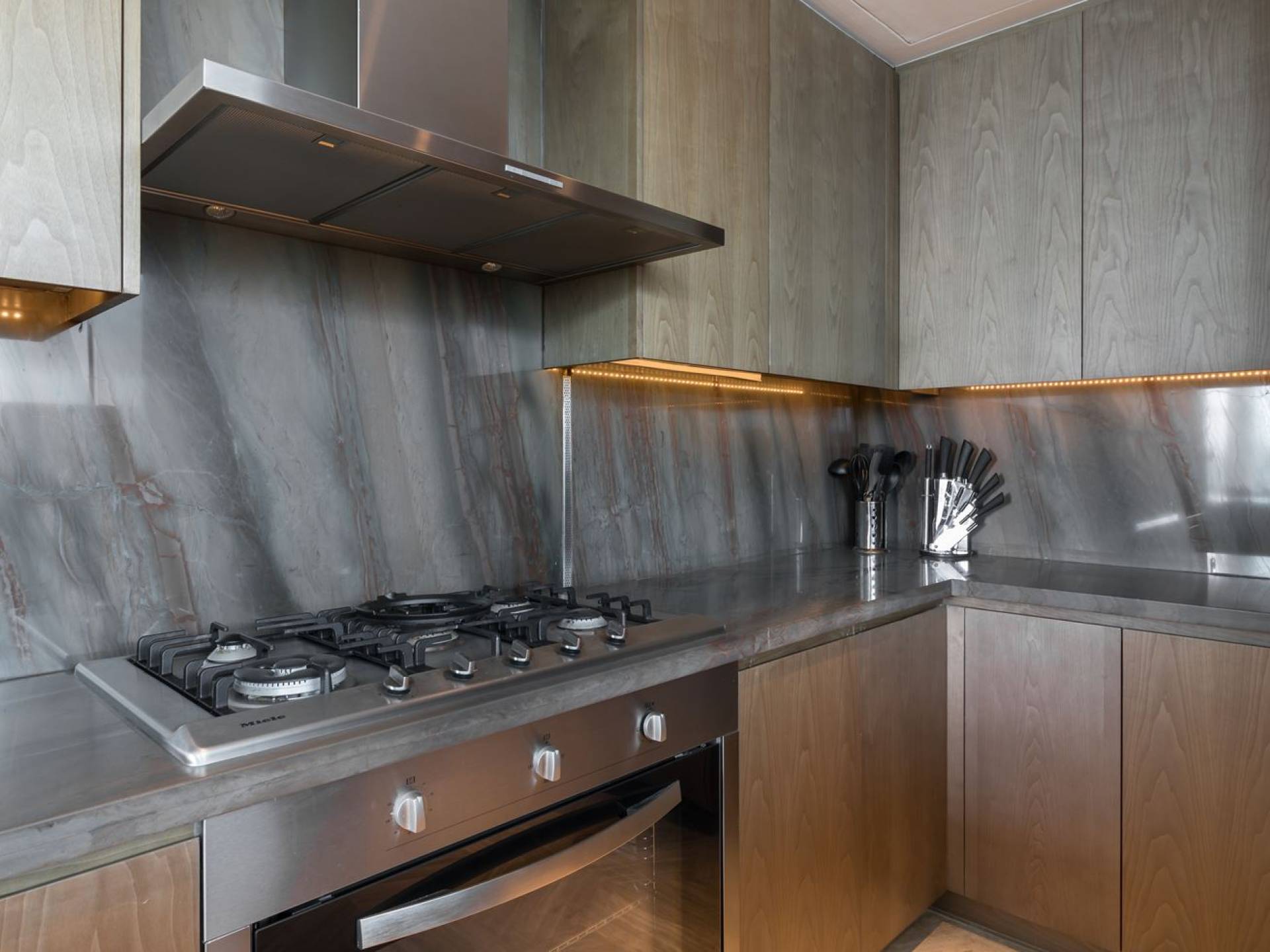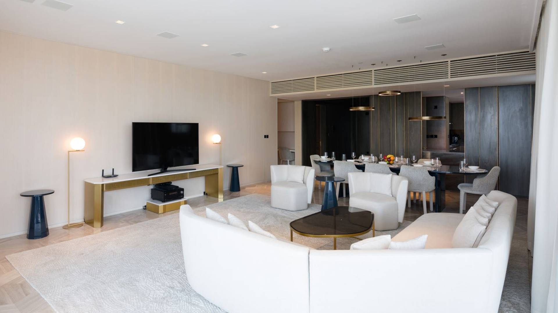 Ένας φωτεινός, αλλά χαλαρωτικός χώρος σαλονιού με παράθυρα από το δάπεδο μέχρι την οροφή που αποκαλύπτουν το εμβληματικό σκηνικό του ορίζοντα του Ντουμπάι και τη θέα στη θάλασσα, επιπλωμένο με ένα μεγάλο τραπέζι φαγητού για οκτώ άτομα, έναν μεγάλο γωνιακό καναπέ, πολυθρόνες και μεγάλη επίπεδη οθόνη ΤΗΛΕΟΡΑΣΗ. Διακριτικά κρυμμένη πίσω από το σκούρο ξύλο και την επένδυση με χρυσό τόνο στέκεται η κουζίνα που περιέχει εντυπωσιακούς μαρμάρινους πάγκους και πιτσιλιές με ντουλάπια από σκούρο ξύλο. Είναι πλήρως εξοπλισμένο με όλες τις απαραίτητες συσκευές, όπως τοστιέρα, βραστήρα και καφετιέρα για την εξυπηρέτησή σας.