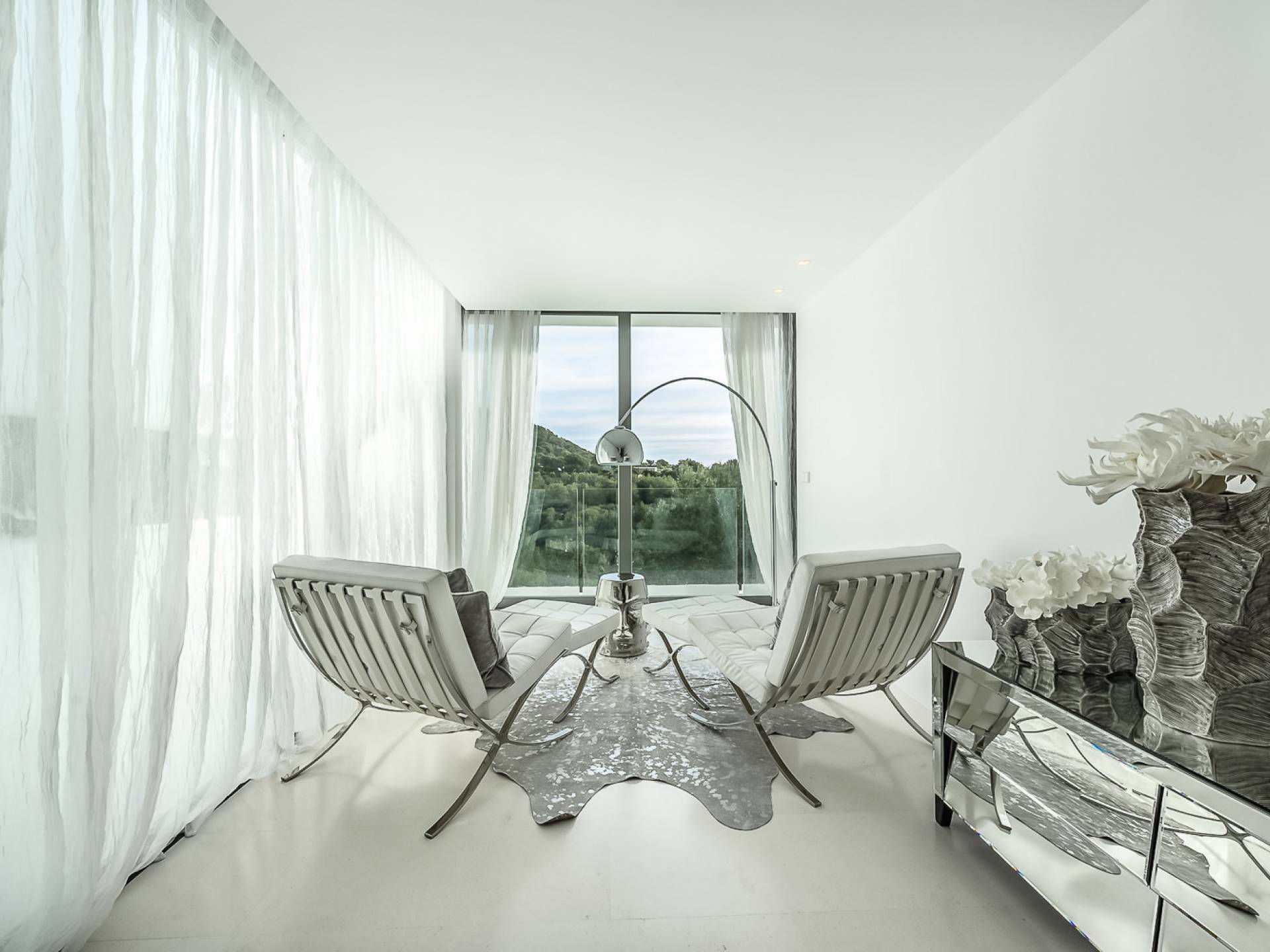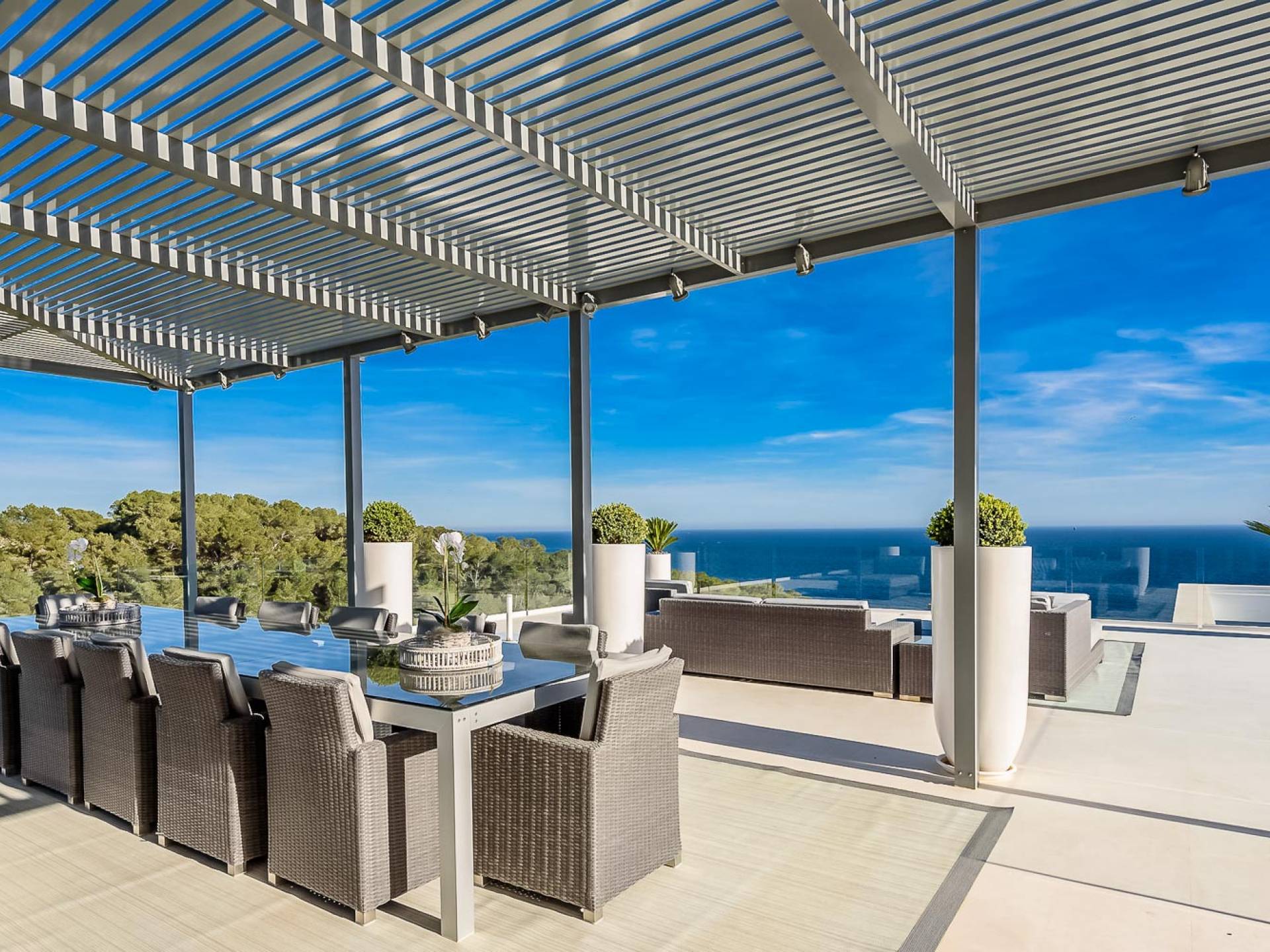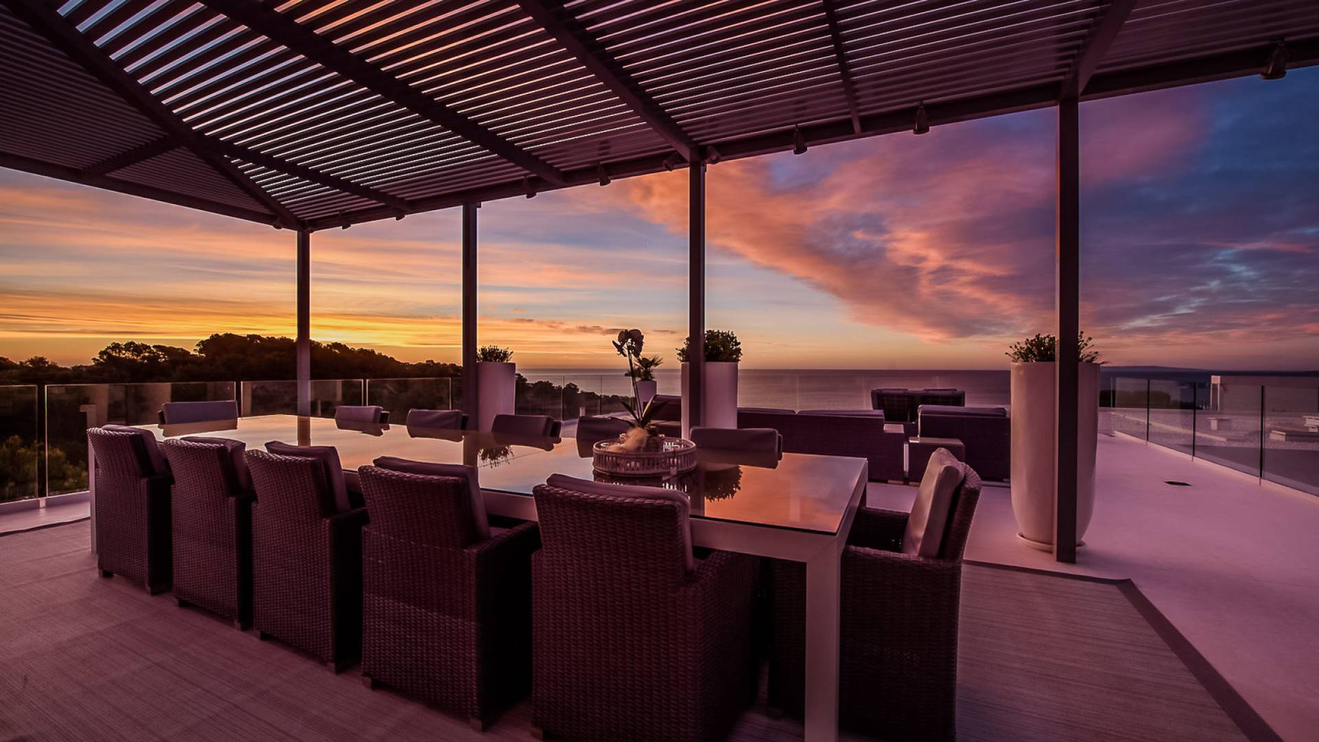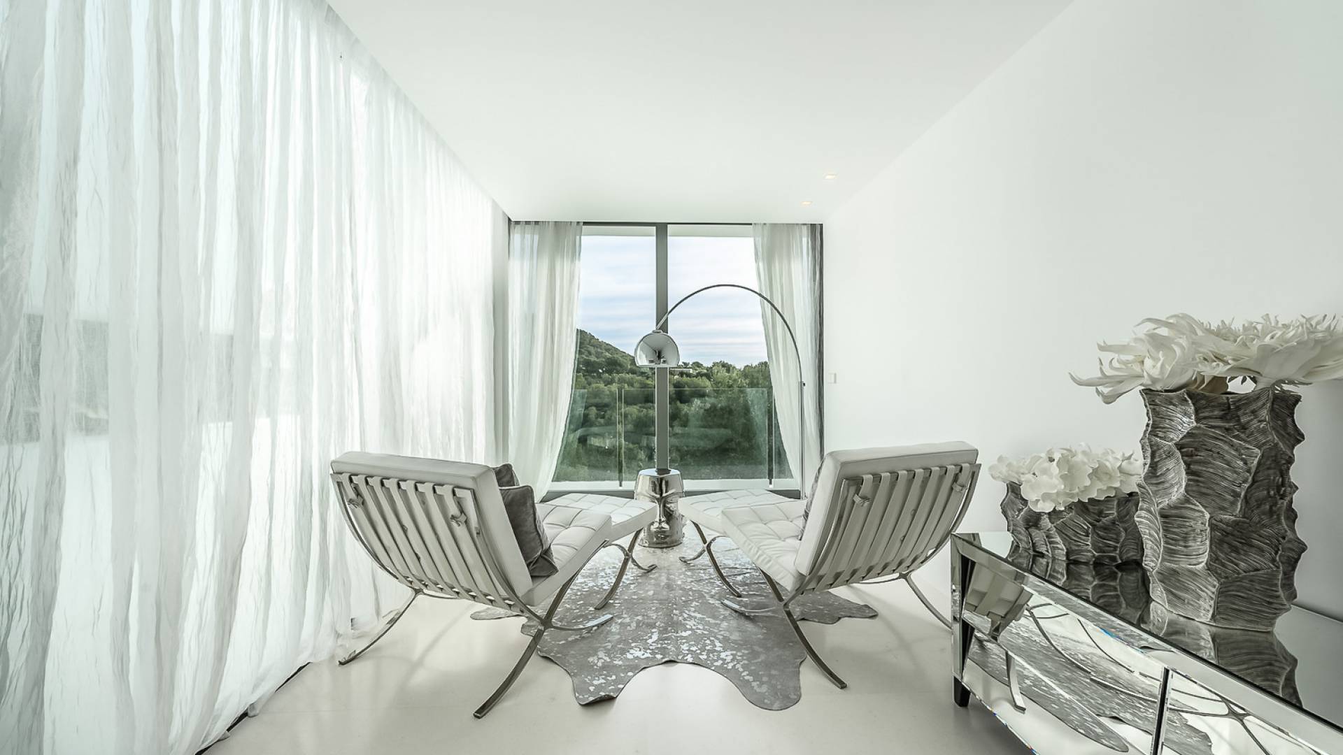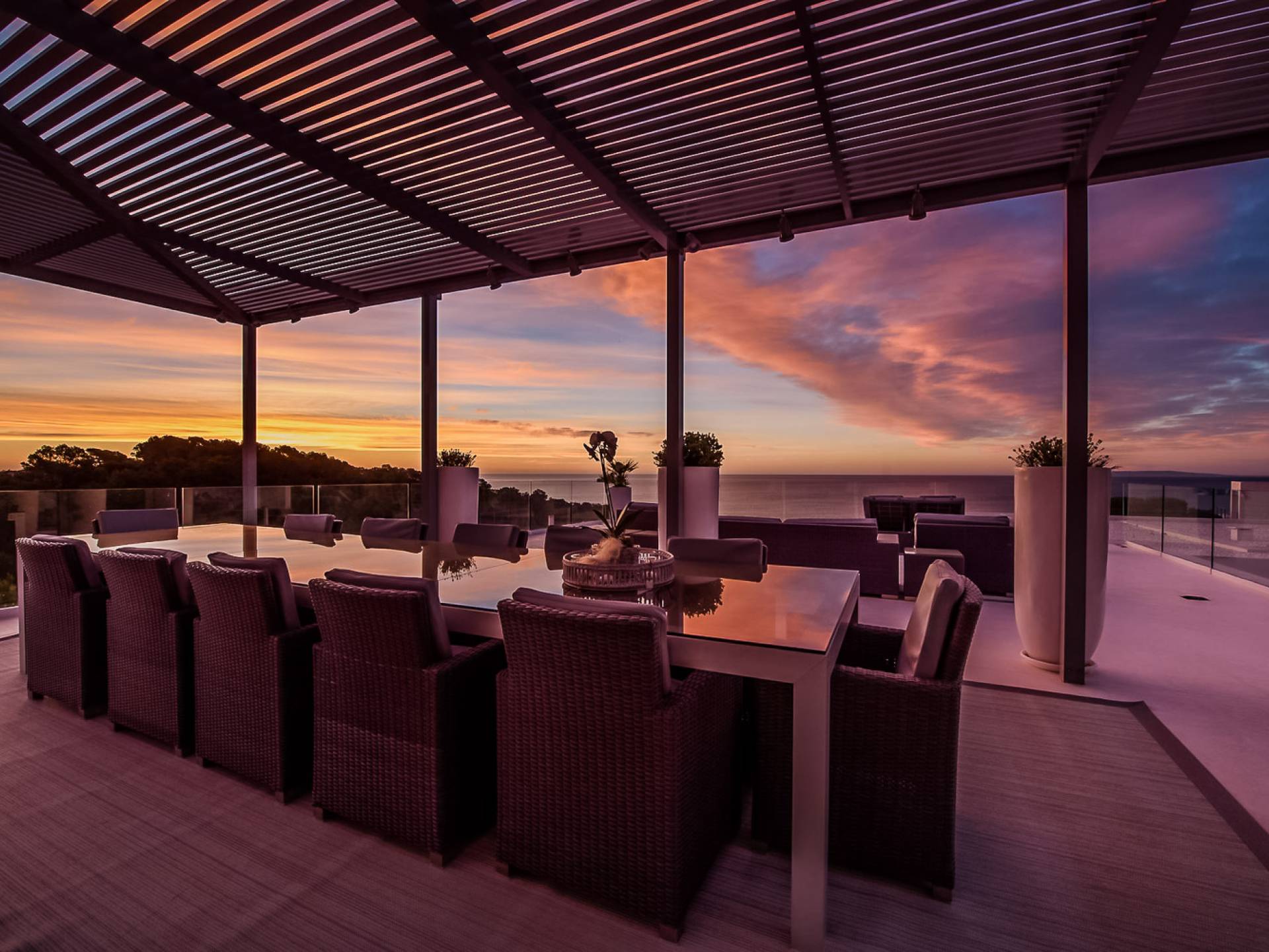 Κρυμμένη ανάμεσα σε πεύκα και όμορφα διατηρημένους κήπους, αυτή η βίλα 850 τετραγωνικών μέτρων ανοίγει σε τεράστιες εξωτερικές βεράντες και κήπους, διαθέτει ιδιωτική πισίνα υπερχείλισης και τζακούζι με φανταστική θέα στη Μεσόγειο Θάλασσα και τη γύρω ύπαιθρο. Η βεράντα του τελευταίου ορόφου προσφέρει άνετα υπαίθρια καθίσματα καναπέ και τραπέζι φαγητού – ιδανικό για κοκτέιλ στο ηλιοβασίλεμα ή δείπνο με υπέροχη θέα στους κήπους, στο πευκοδάσος και στη θάλασσα.