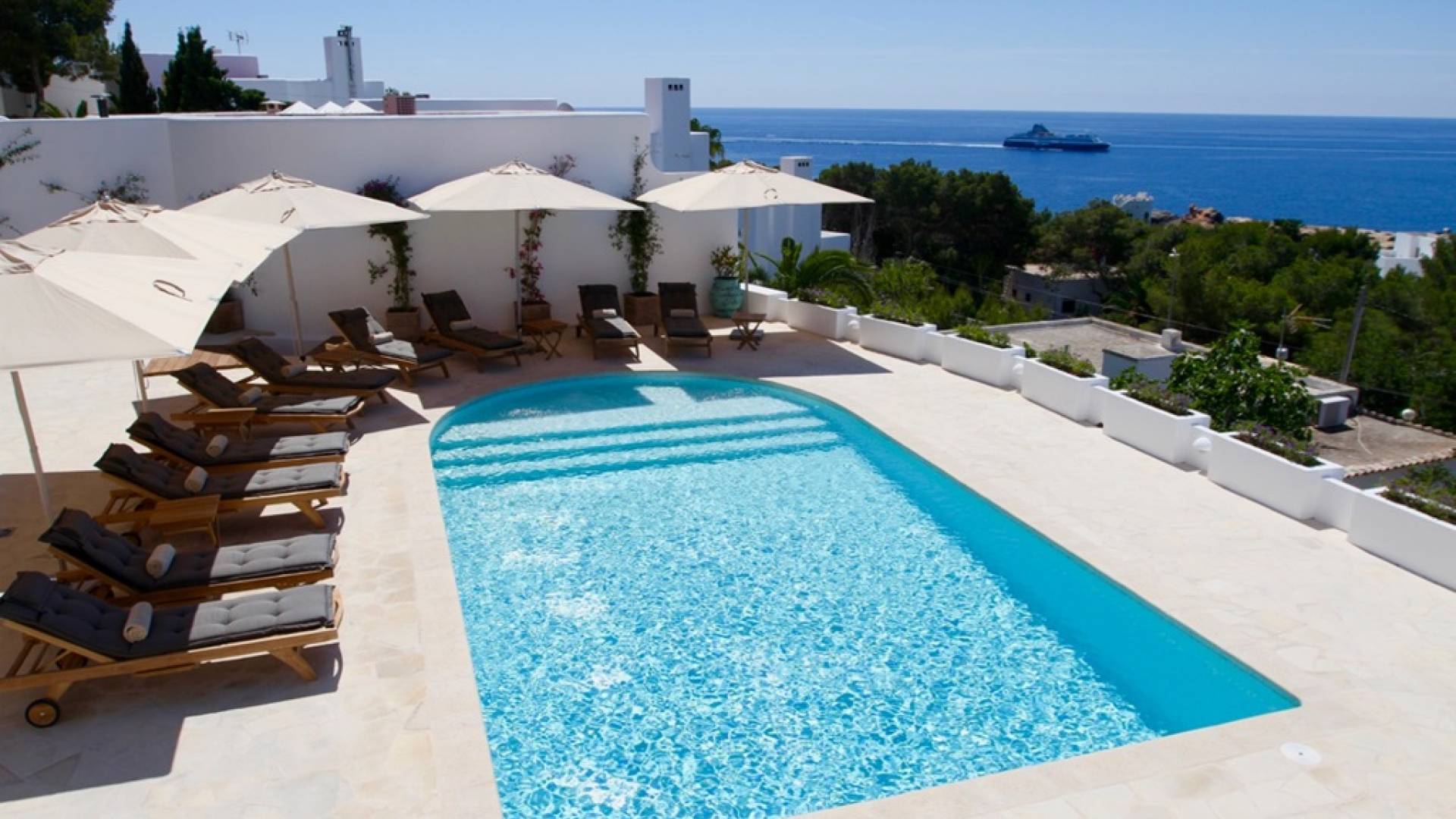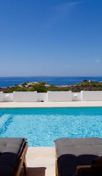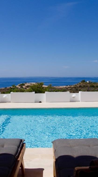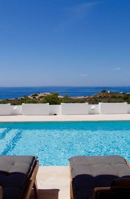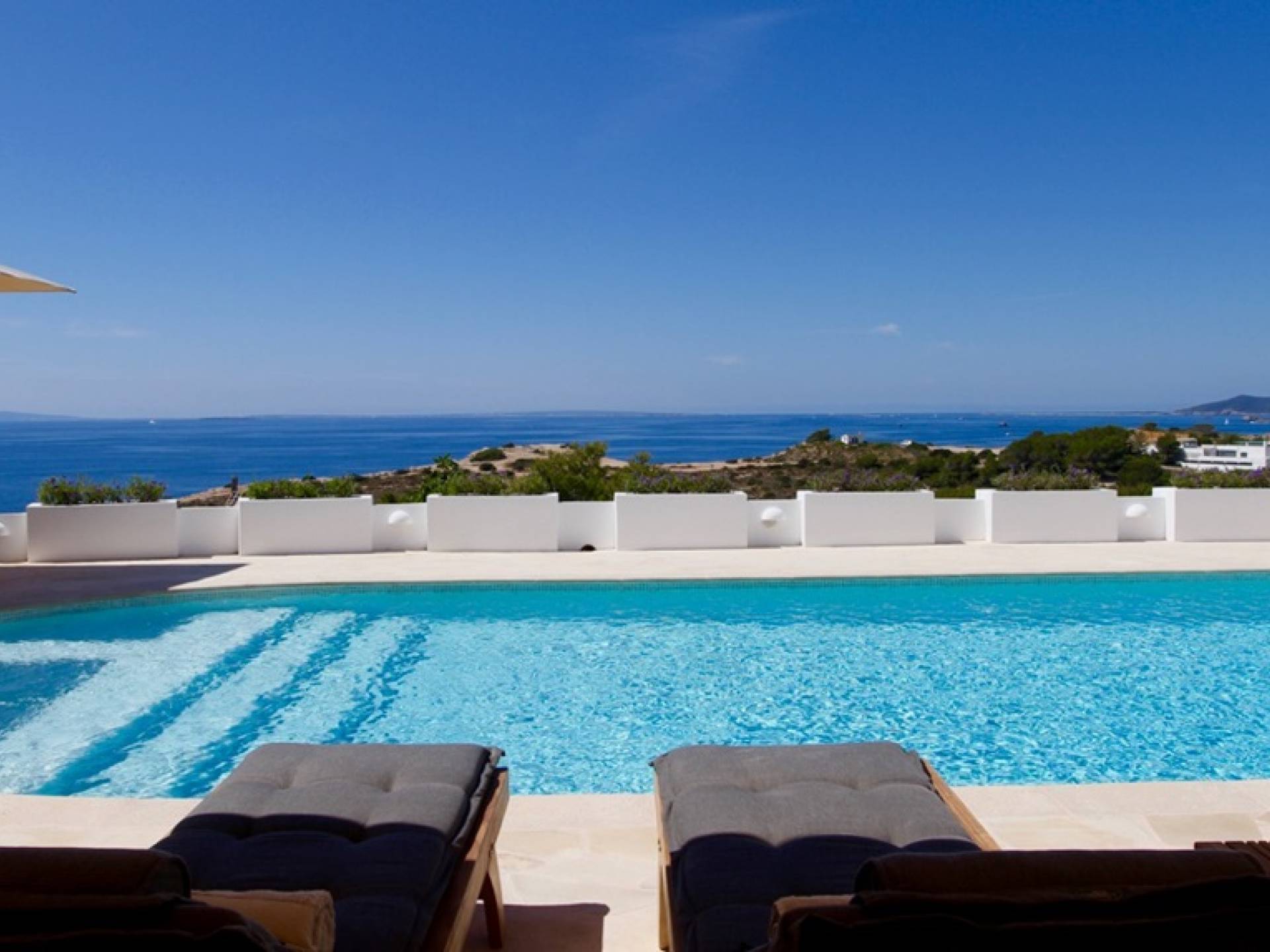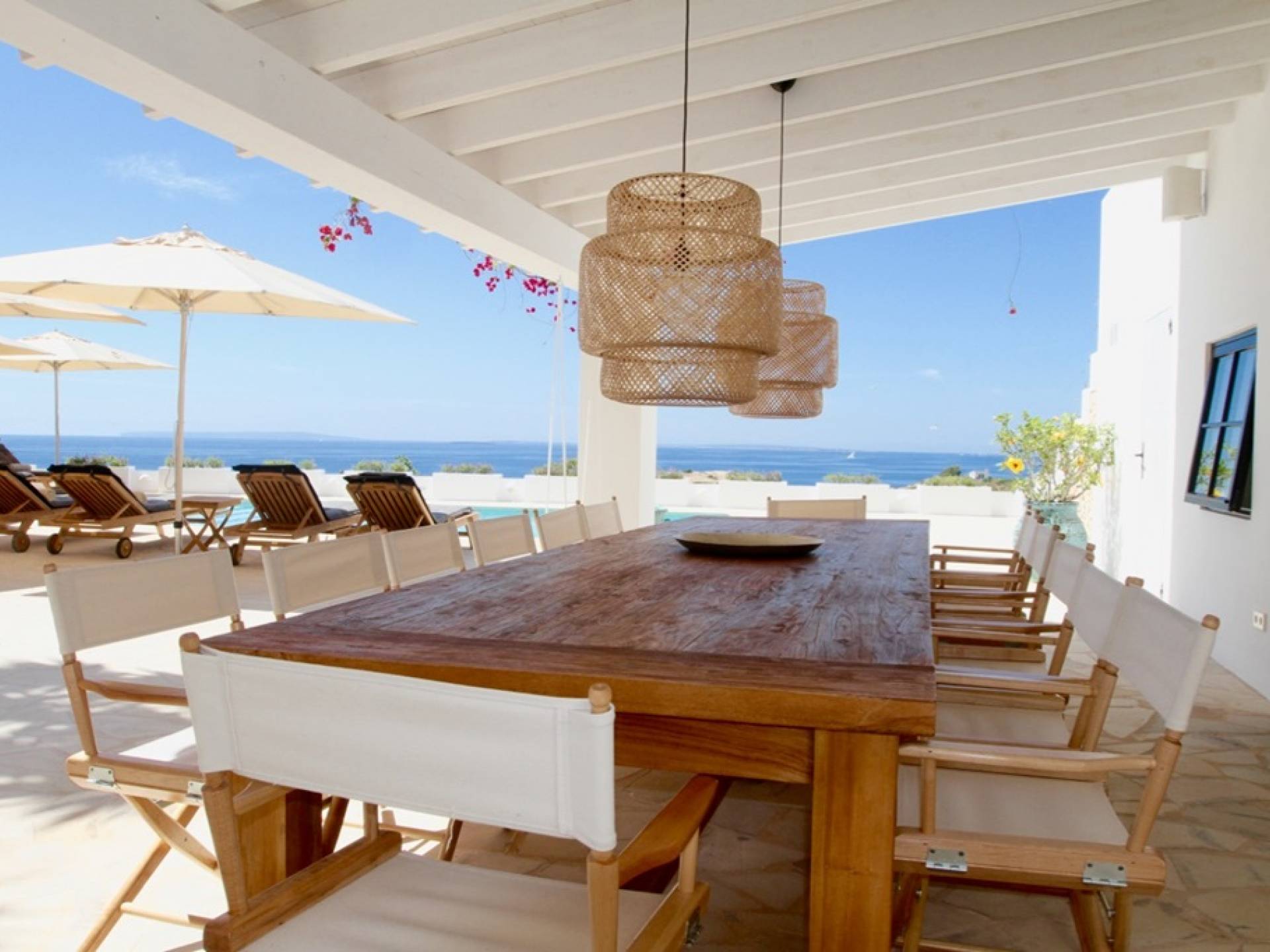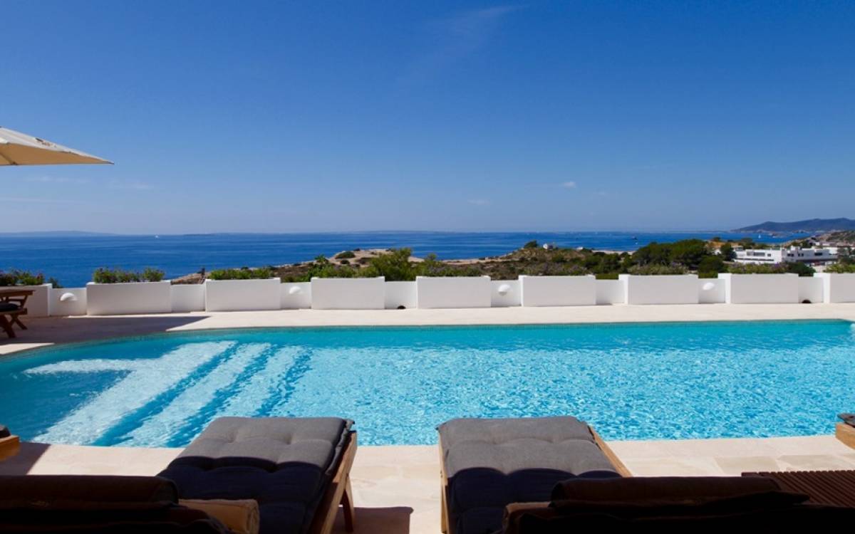 Η σκιερή τραπεζαρία δίπλα στην πισίνα διαθέτει μπάρμπεκιου αερίου και μπορεί να φιλοξενήσει 12 άτομα. Μονές ξαπλώστρες είναι διαθέσιμες στην ευρύχωρη βεράντα δίπλα στην πισίνα, στον ήλιο και σε σκιερούς χώρους. Η βεράντα για κοκτέιλ και η τραπεζαρία στο κεντρικό επίπεδο είναι ιδανικά για χαλάρωση με ποτά οποιαδήποτε στιγμή της ημέρας, ειδικά το ηλιοβασίλεμα και την ανατολή του ηλίου. Η πισίνα με θαλασσινό νερό 10 x 5 m προσφέρει εκπληκτική θέα στη θάλασσα, τη Formentera και την παλιά πόλη της Ίμπιζα. Το περιβάλλον lounge περιλαμβάνει ξαπλώστρες, ψυγείο, καταψύκτη και υπαίθριο ντους.