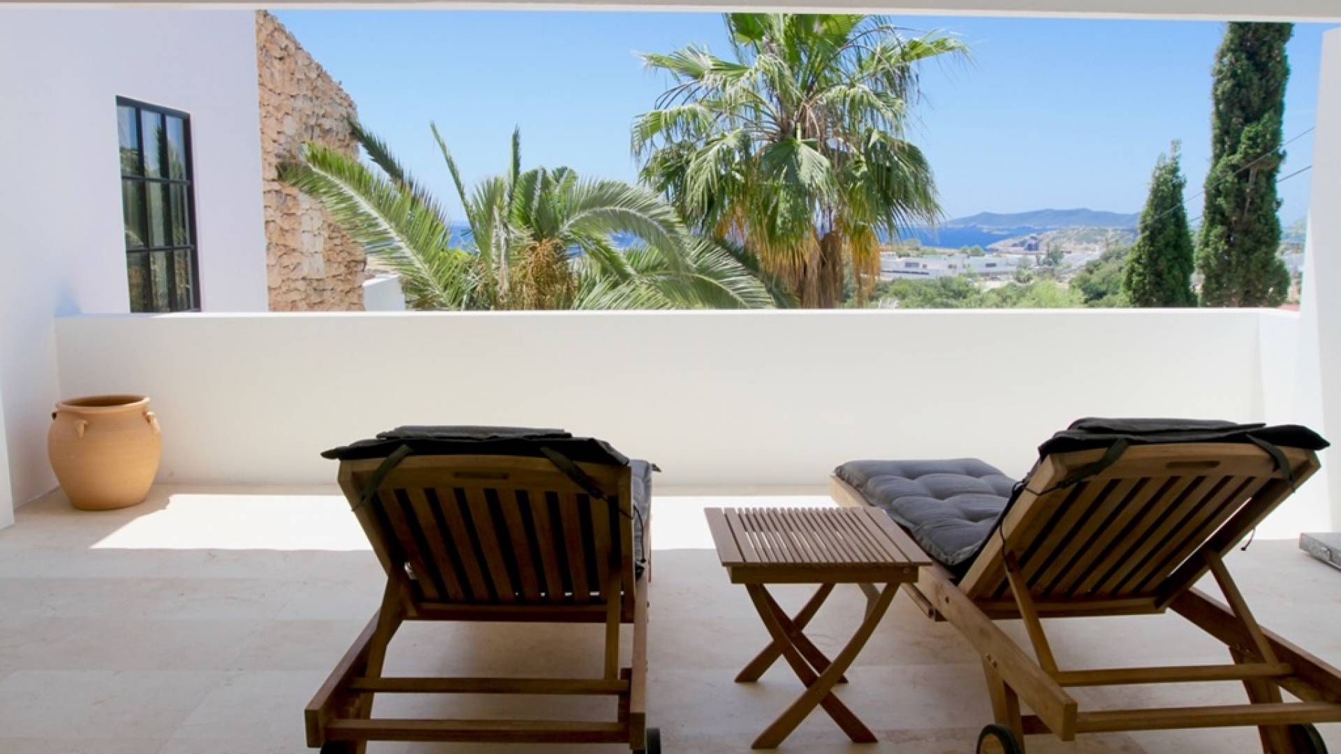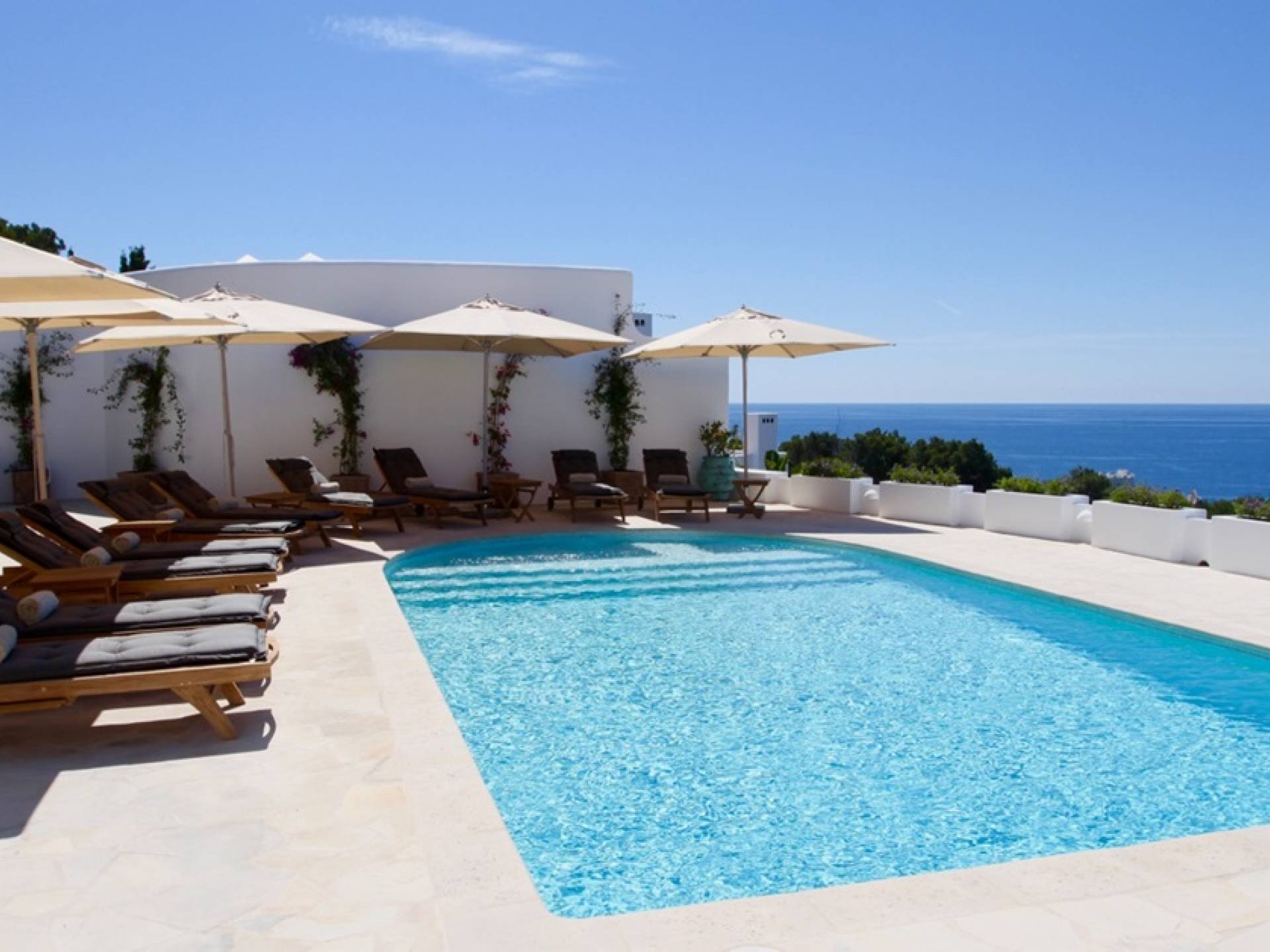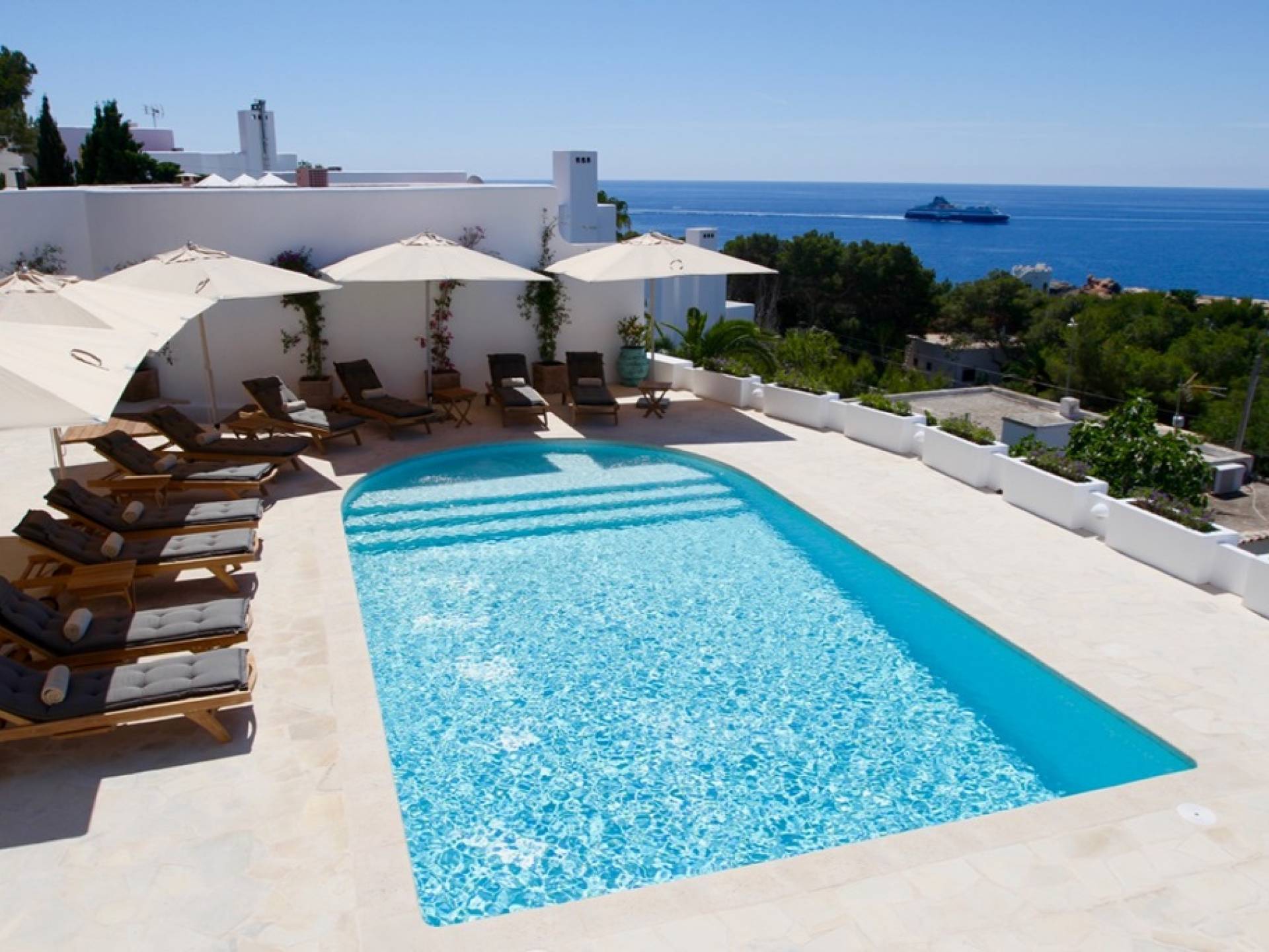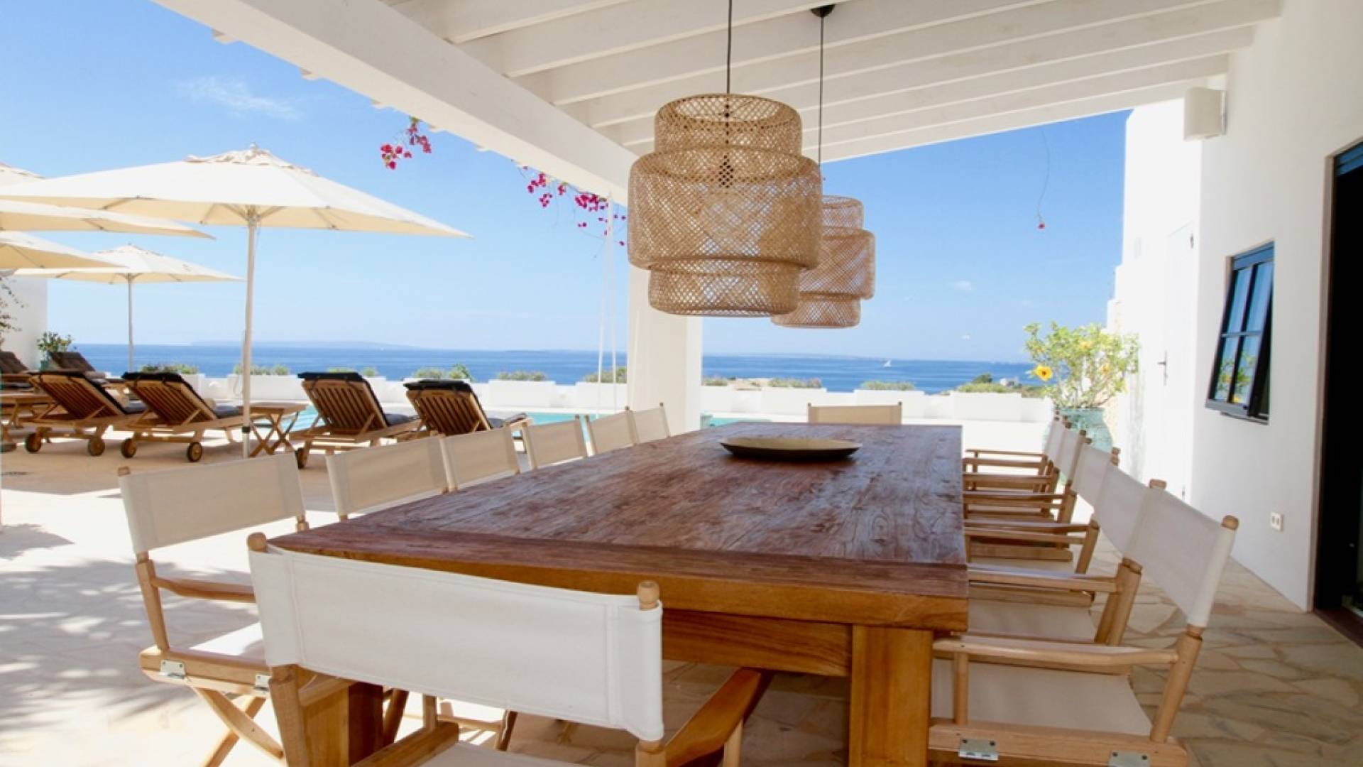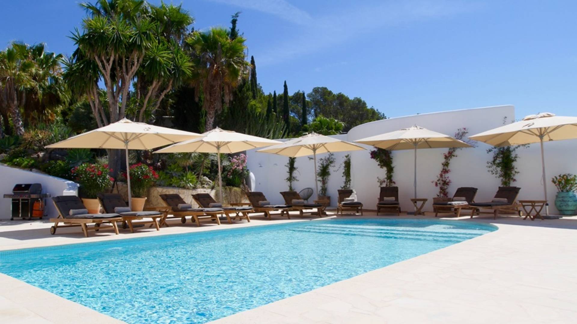 Η σκιερή τραπεζαρία δίπλα στην πισίνα διαθέτει μπάρμπεκιου αερίου και μπορεί να φιλοξενήσει 12 άτομα. Μονές ξαπλώστρες είναι διαθέσιμες στην ευρύχωρη βεράντα δίπλα στην πισίνα, στον ήλιο και σε σκιερούς χώρους. Η βεράντα για κοκτέιλ και η τραπεζαρία στο κεντρικό επίπεδο είναι ιδανικά για χαλάρωση με ποτά οποιαδήποτε στιγμή της ημέρας, ειδικά το ηλιοβασίλεμα και την ανατολή του ηλίου. Η πισίνα με θαλασσινό νερό 10 x 5 m προσφέρει εκπληκτική θέα στη θάλασσα, τη Formentera και την παλιά πόλη της Ίμπιζα. Το περιβάλλον lounge περιλαμβάνει ξαπλώστρες, ψυγείο, καταψύκτη και υπαίθριο ντους.