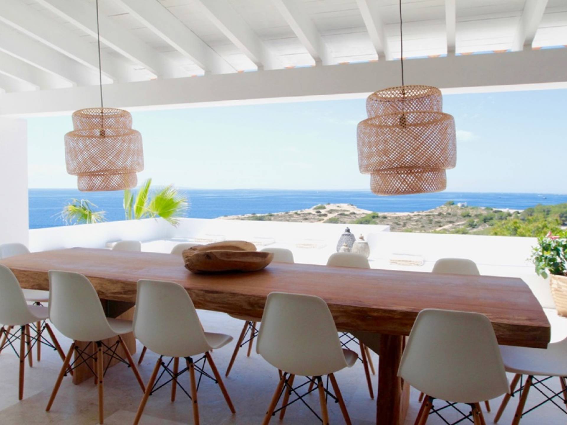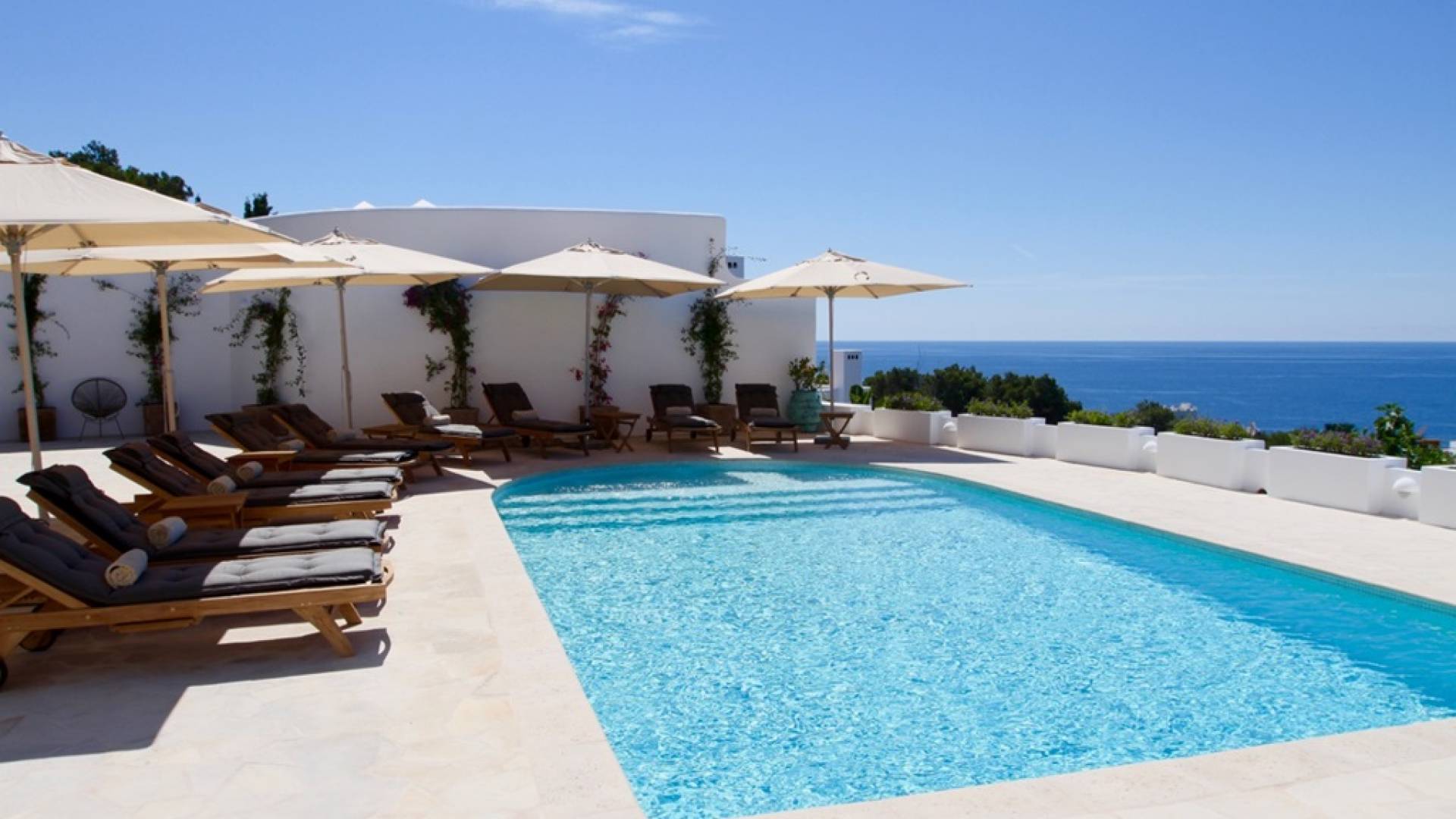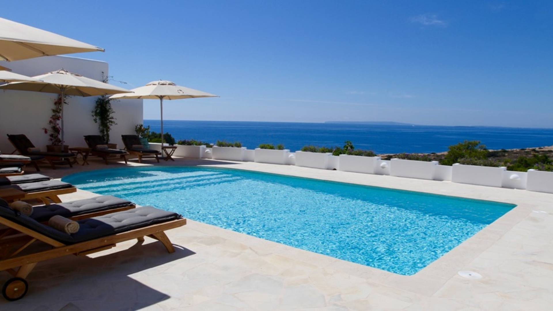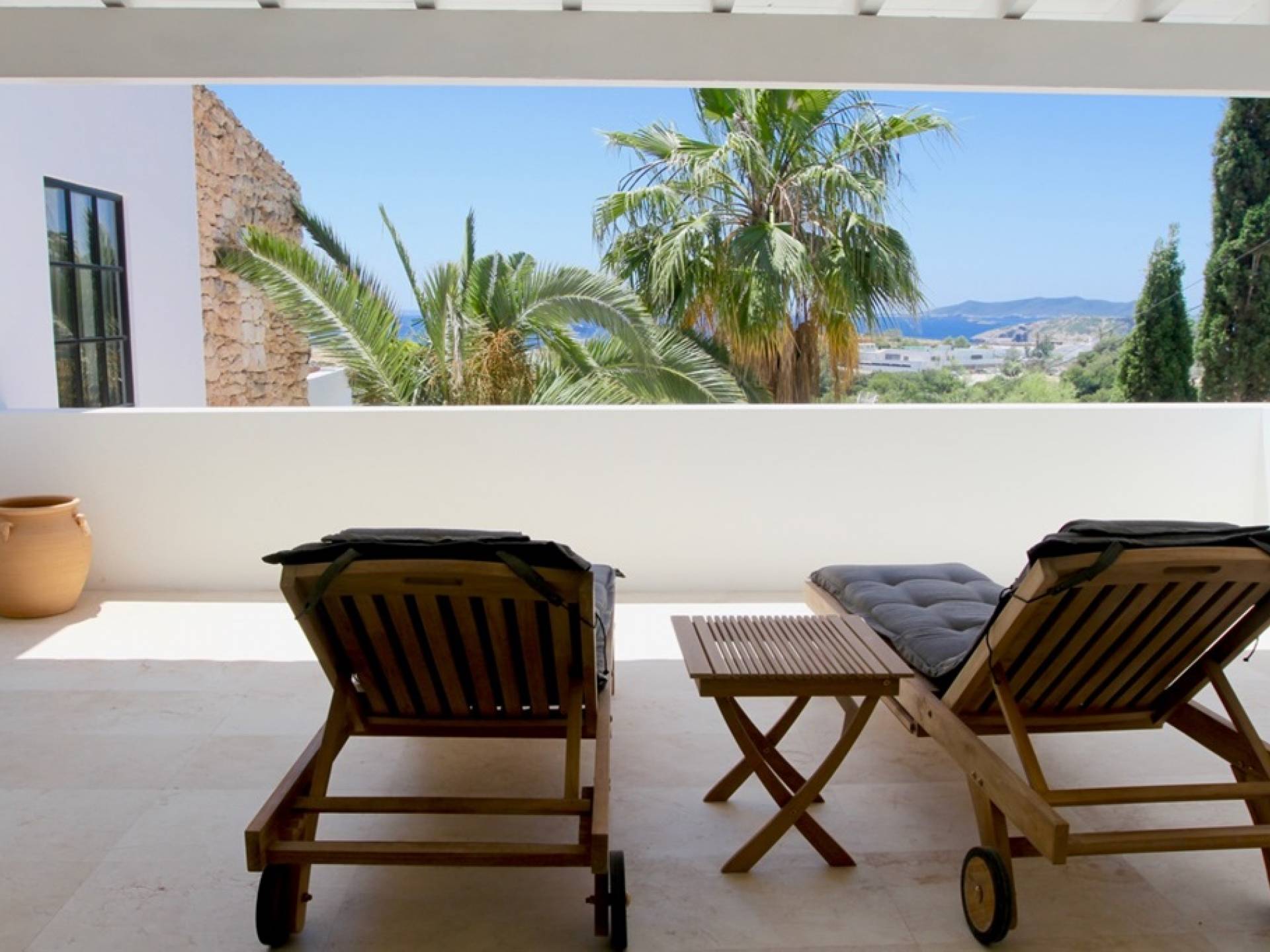 Η σκιερή τραπεζαρία δίπλα στην πισίνα διαθέτει μπάρμπεκιου αερίου και μπορεί να φιλοξενήσει 12 άτομα. Μονές ξαπλώστρες είναι διαθέσιμες στην ευρύχωρη βεράντα δίπλα στην πισίνα, στον ήλιο και σε σκιερούς χώρους. Η βεράντα για κοκτέιλ και η τραπεζαρία στο κεντρικό επίπεδο είναι ιδανικά για χαλάρωση με ποτά οποιαδήποτε στιγμή της ημέρας, ειδικά το ηλιοβασίλεμα και την ανατολή του ηλίου. Η πισίνα με θαλασσινό νερό 10 x 5 m προσφέρει εκπληκτική θέα στη θάλασσα, τη Formentera και την παλιά πόλη της Ίμπιζα. Το περιβάλλον lounge περιλαμβάνει ξαπλώστρες, ψυγείο, καταψύκτη και υπαίθριο ντους.