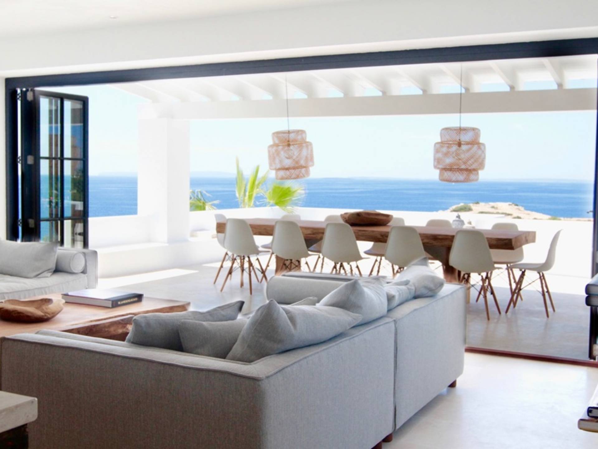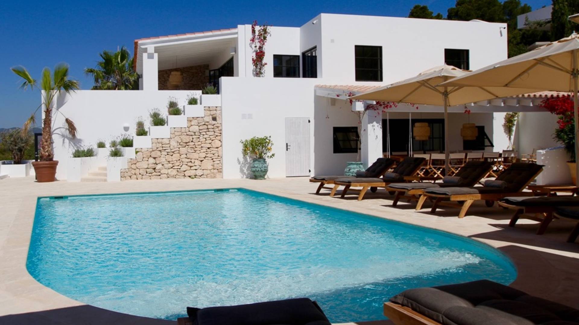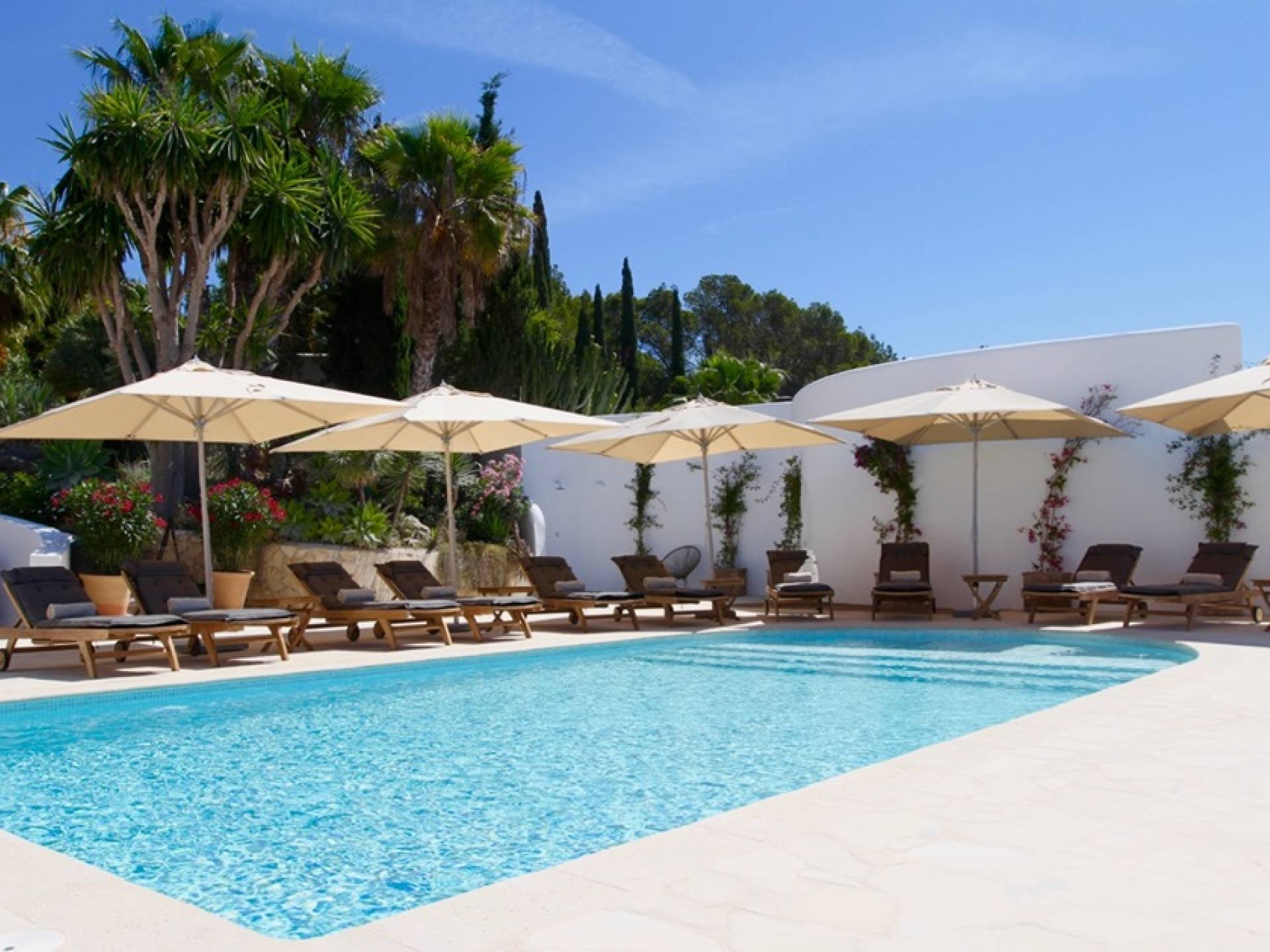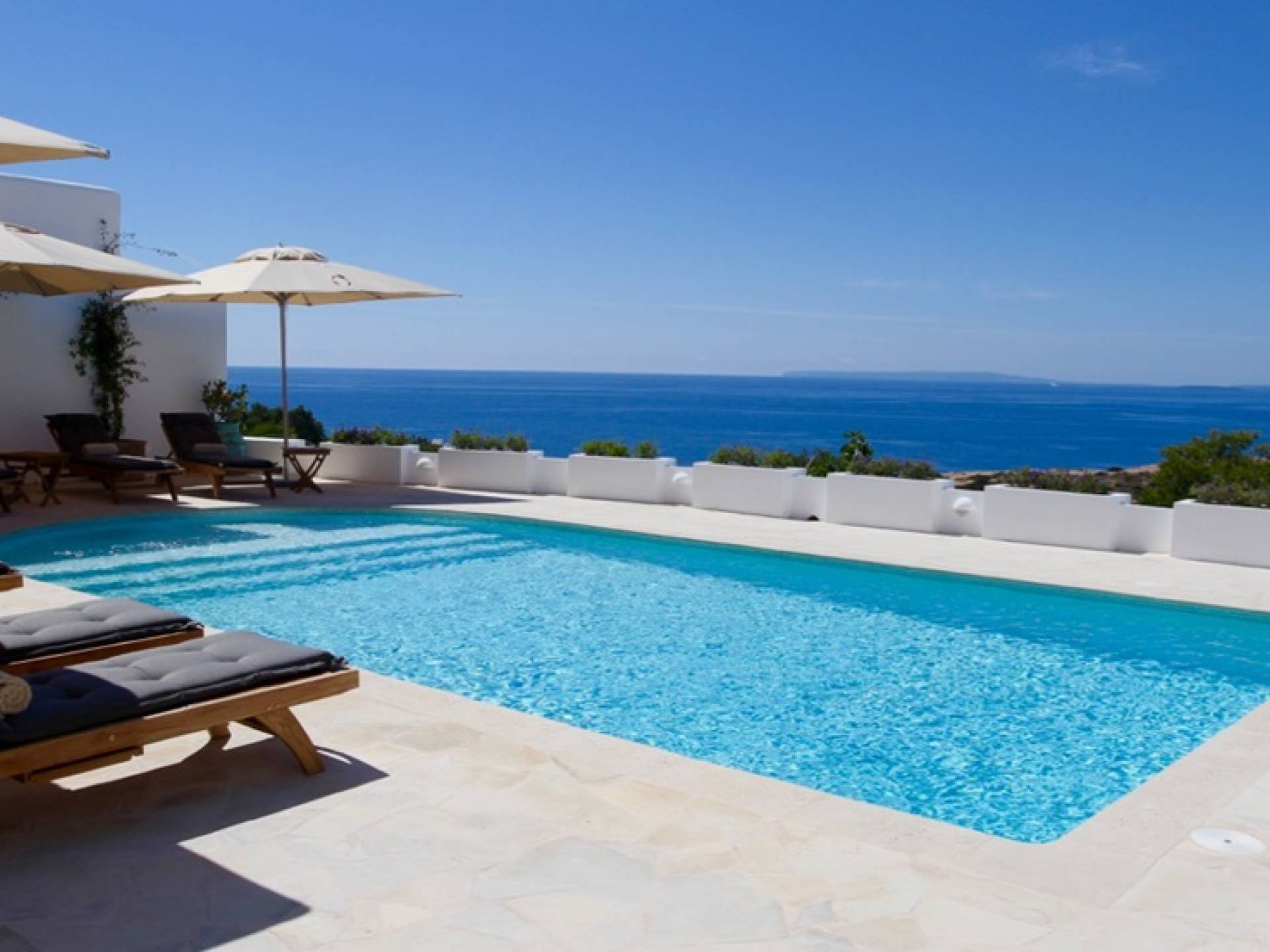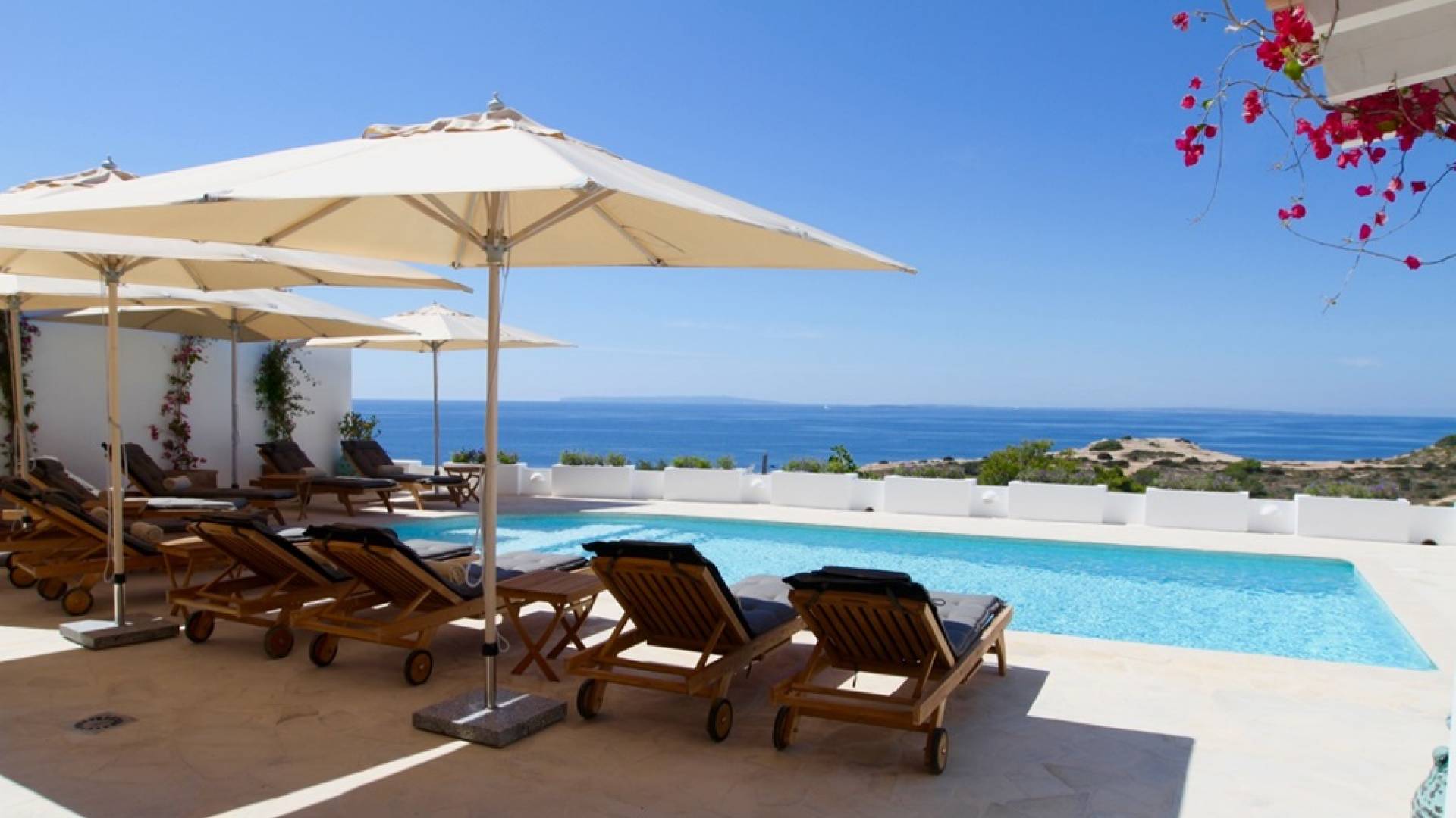 Η σκιερή τραπεζαρία δίπλα στην πισίνα διαθέτει μπάρμπεκιου αερίου και μπορεί να φιλοξενήσει 12 άτομα. Μονές ξαπλώστρες είναι διαθέσιμες στην ευρύχωρη βεράντα δίπλα στην πισίνα, στον ήλιο και σε σκιερούς χώρους. Η βεράντα για κοκτέιλ και η τραπεζαρία στο κεντρικό επίπεδο είναι ιδανικά για χαλάρωση με ποτά οποιαδήποτε στιγμή της ημέρας, ειδικά το ηλιοβασίλεμα και την ανατολή του ηλίου. Η πισίνα με θαλασσινό νερό 10 x 5 m προσφέρει εκπληκτική θέα στη θάλασσα, τη Formentera και την παλιά πόλη της Ίμπιζα. Το περιβάλλον lounge περιλαμβάνει ξαπλώστρες, ψυγείο, καταψύκτη και υπαίθριο ντους.
