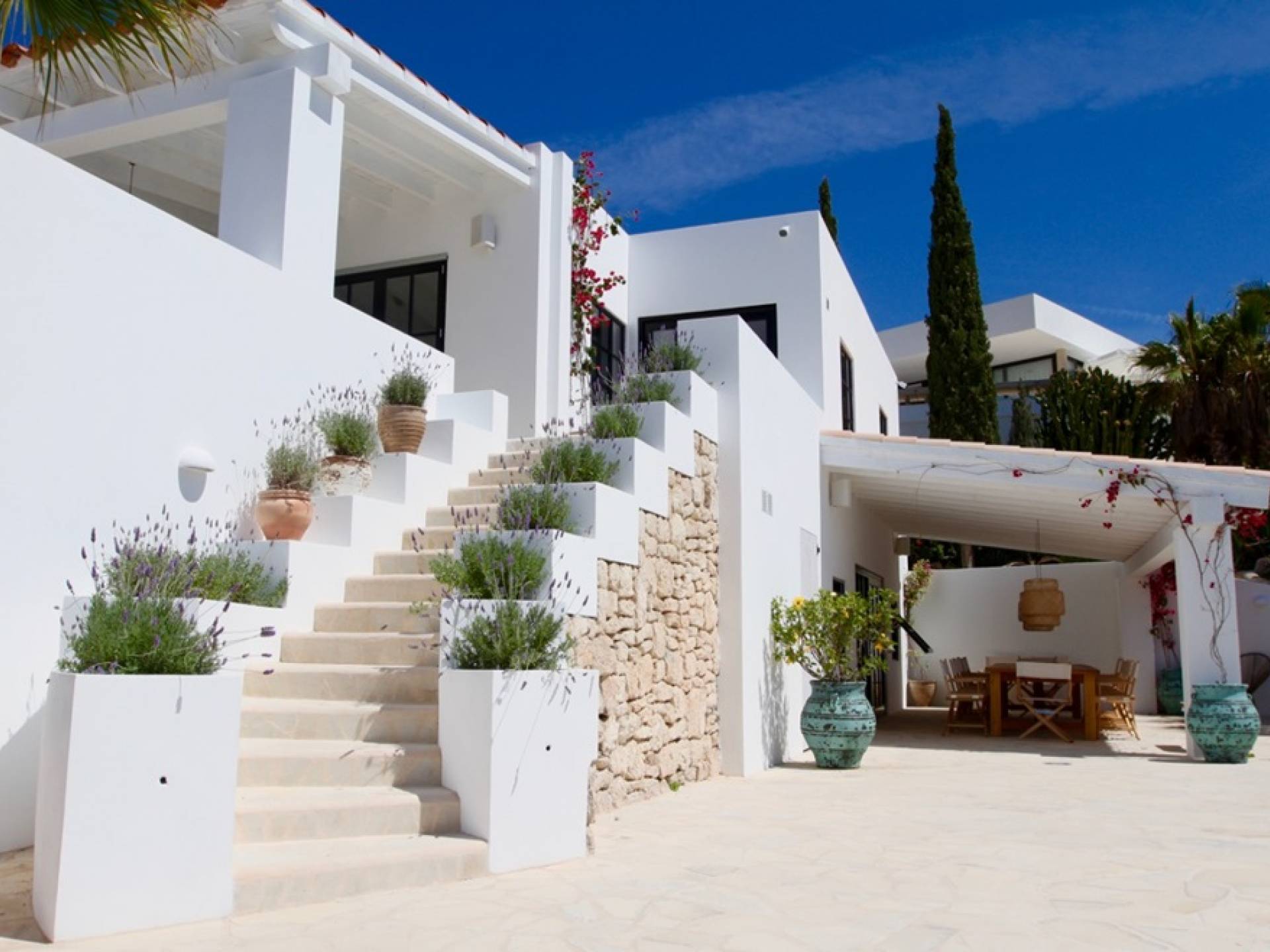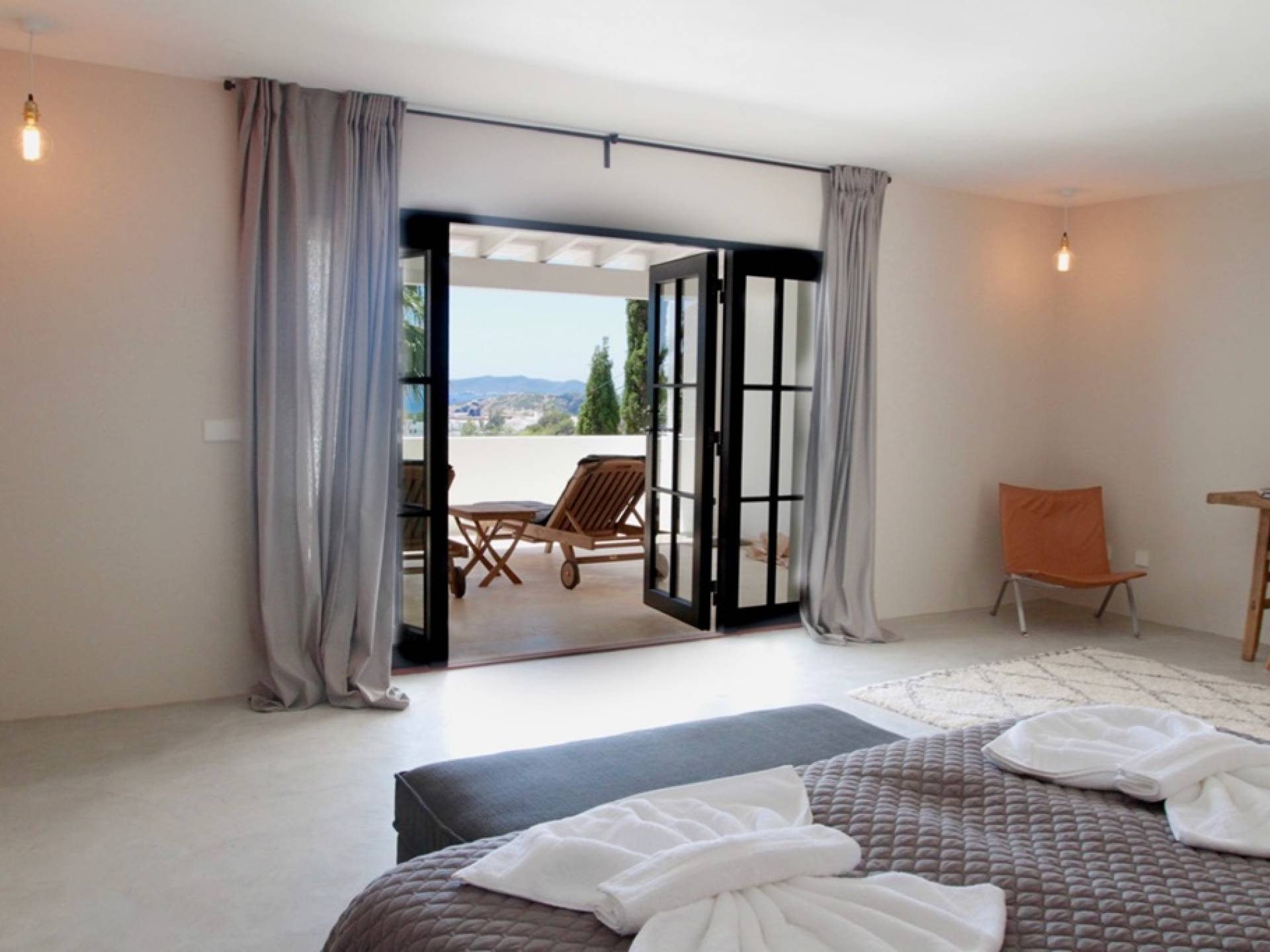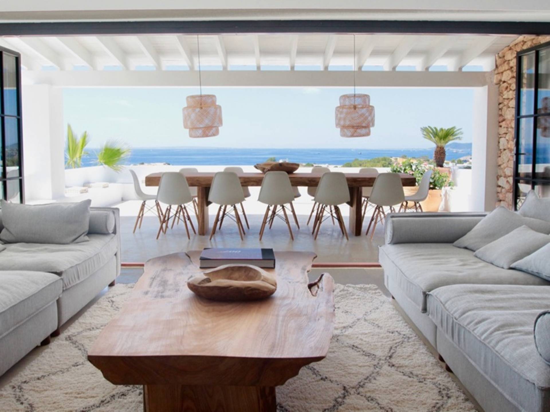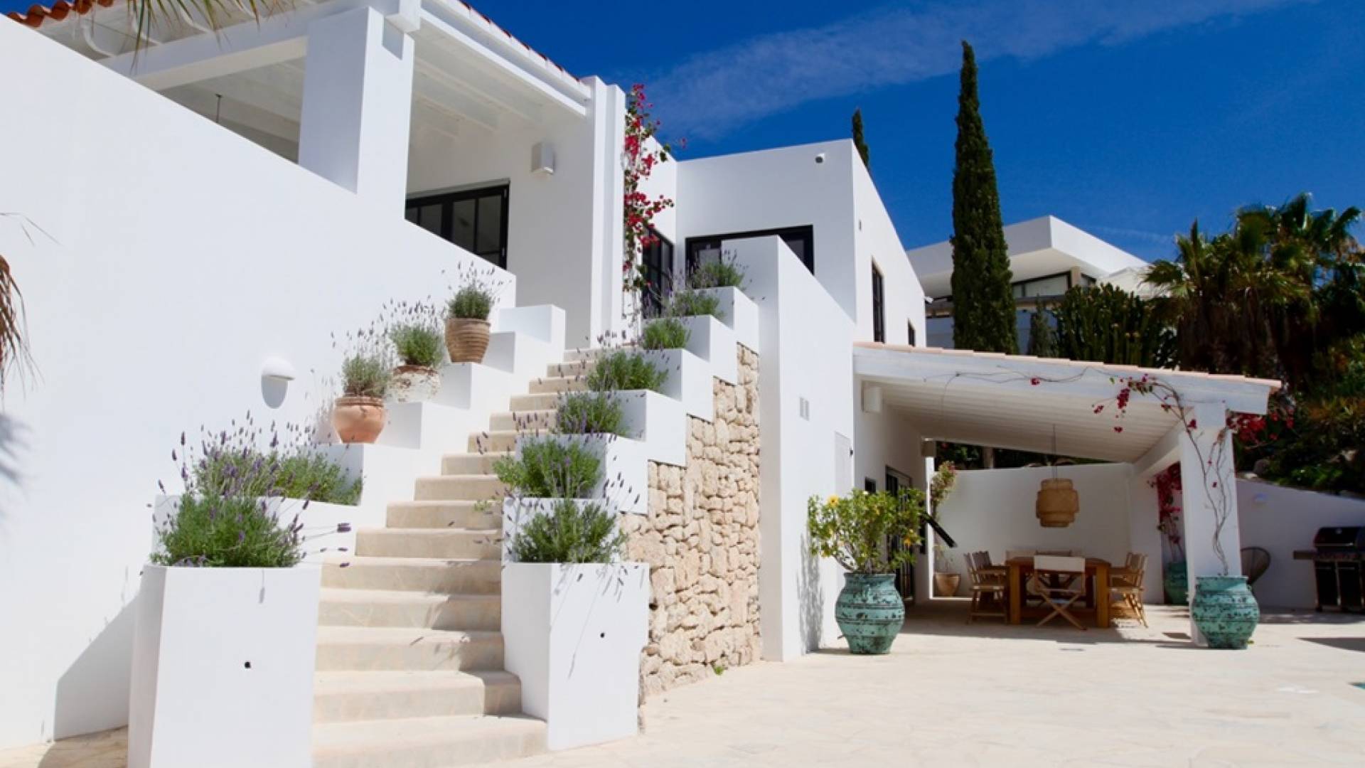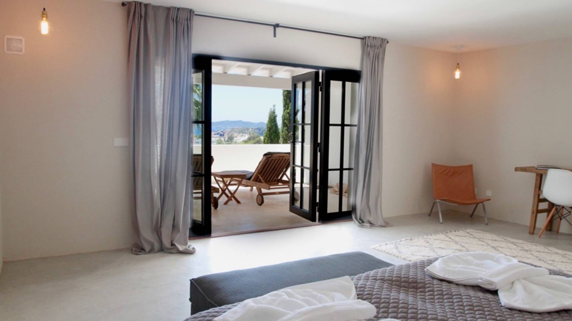Η σκιερή τραπεζαρία δίπλα στην πισίνα διαθέτει μπάρμπεκιου αερίου και μπορεί να φιλοξενήσει 12 άτομα. Μονές ξαπλώστρες είναι διαθέσιμες στην ευρύχωρη βεράντα δίπλα στην πισίνα, στον ήλιο και σε σκιερούς χώρους. Η βεράντα για κοκτέιλ και η τραπεζαρία στο κεντρικό επίπεδο είναι ιδανικά για χαλάρωση με ποτά οποιαδήποτε στιγμή της ημέρας, ειδικά το ηλιοβασίλεμα και την ανατολή του ηλίου. Η πισίνα με θαλασσινό νερό 10 x 5 m προσφέρει εκπληκτική θέα στη θάλασσα, τη Formentera και την παλιά πόλη της Ίμπιζα. Το περιβάλλον lounge περιλαμβάνει ξαπλώστρες, ψυγείο, καταψύκτη και υπαίθριο ντους.