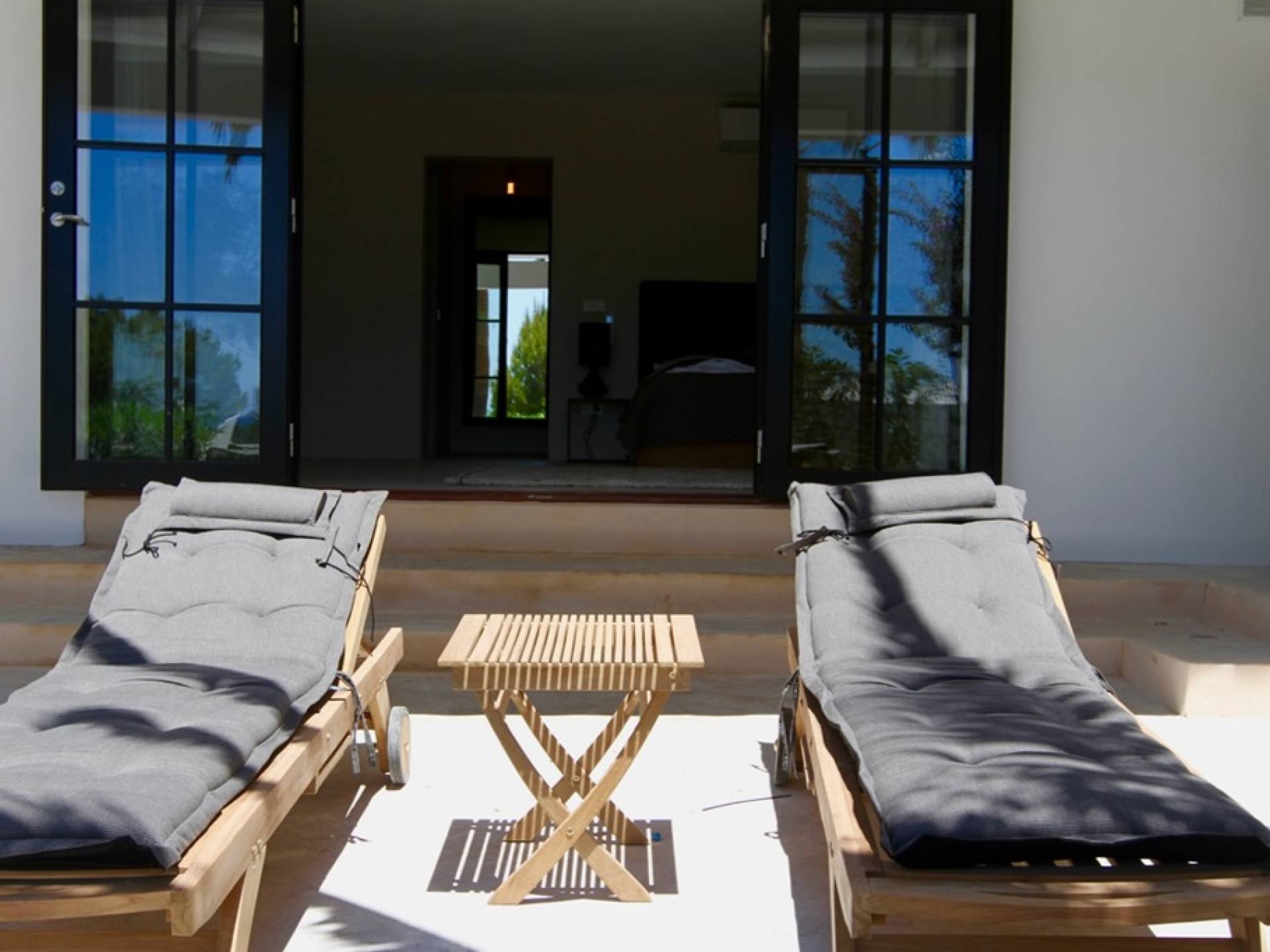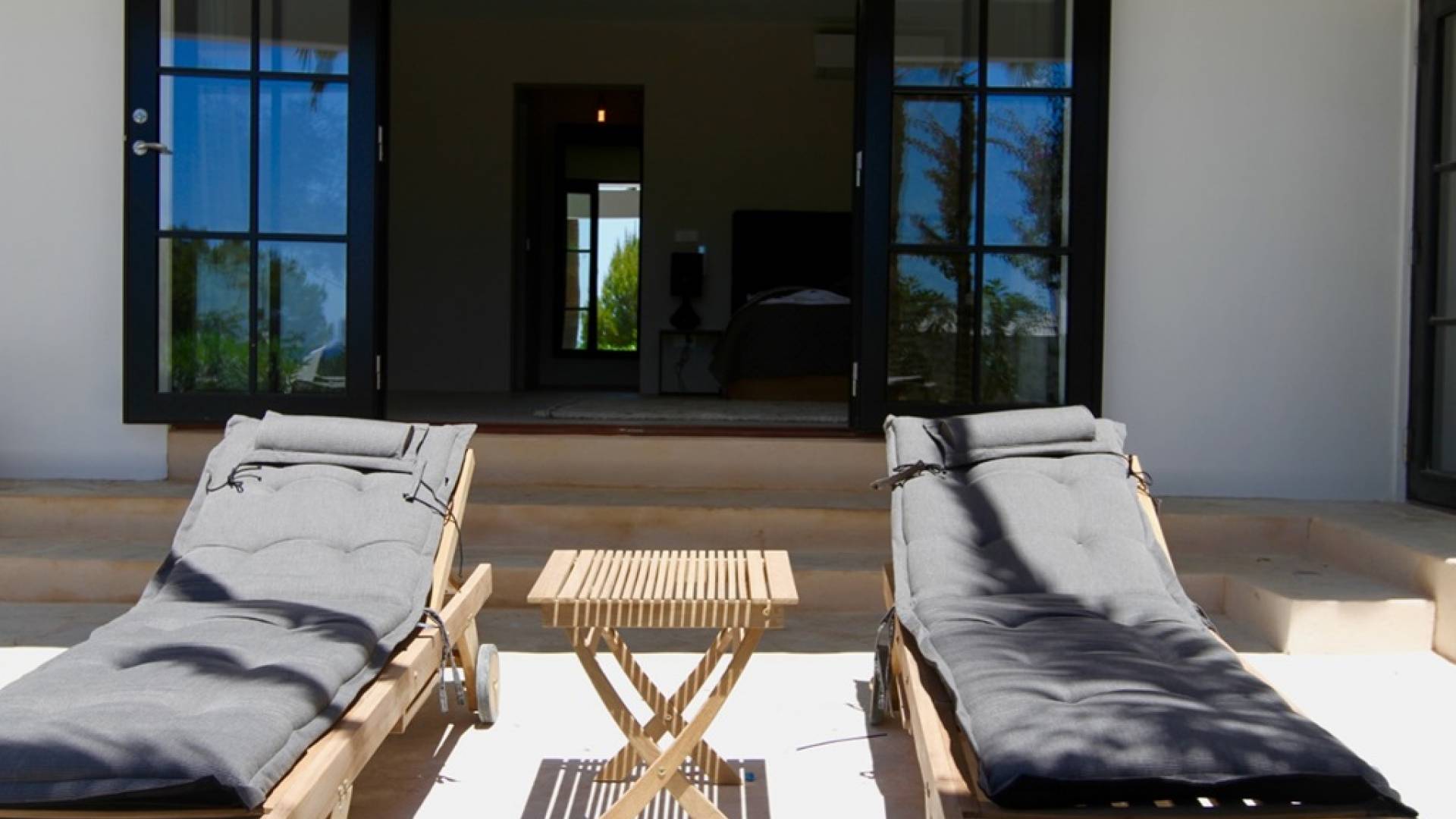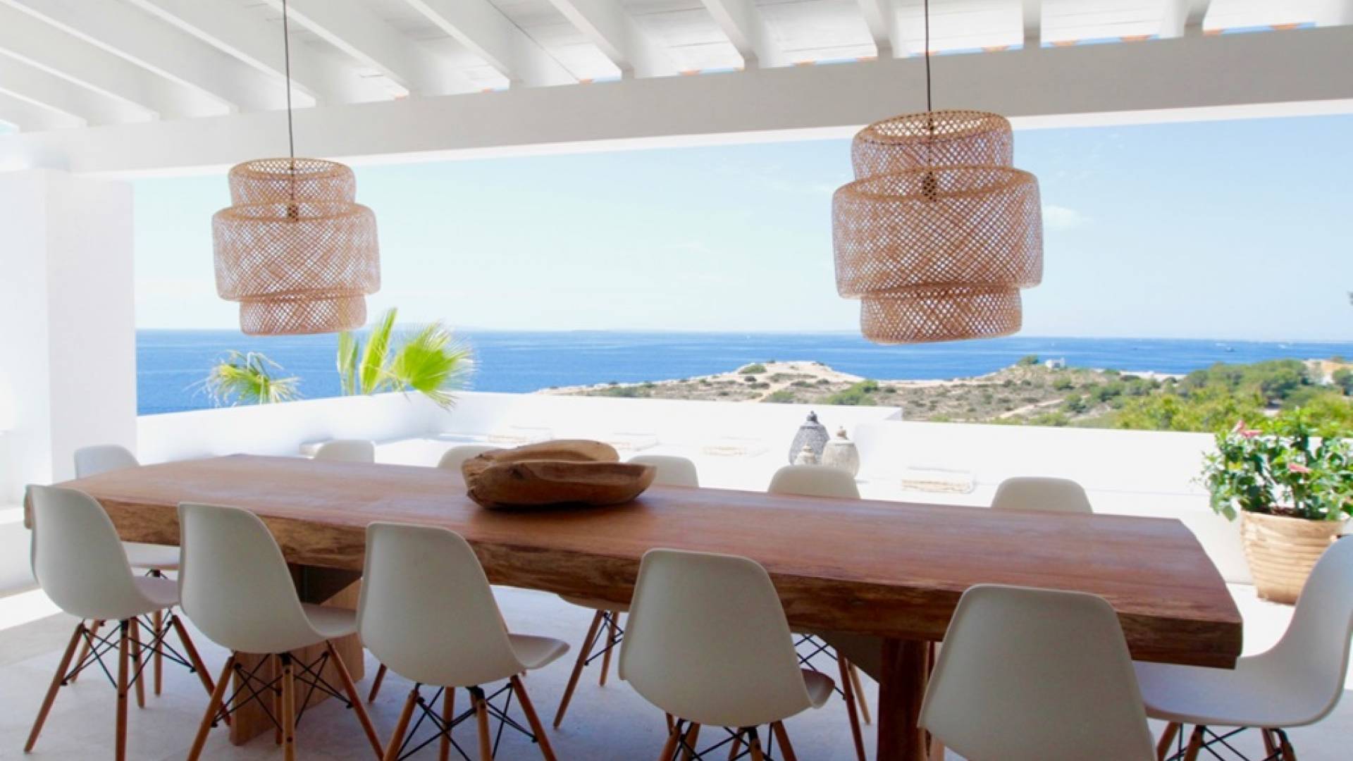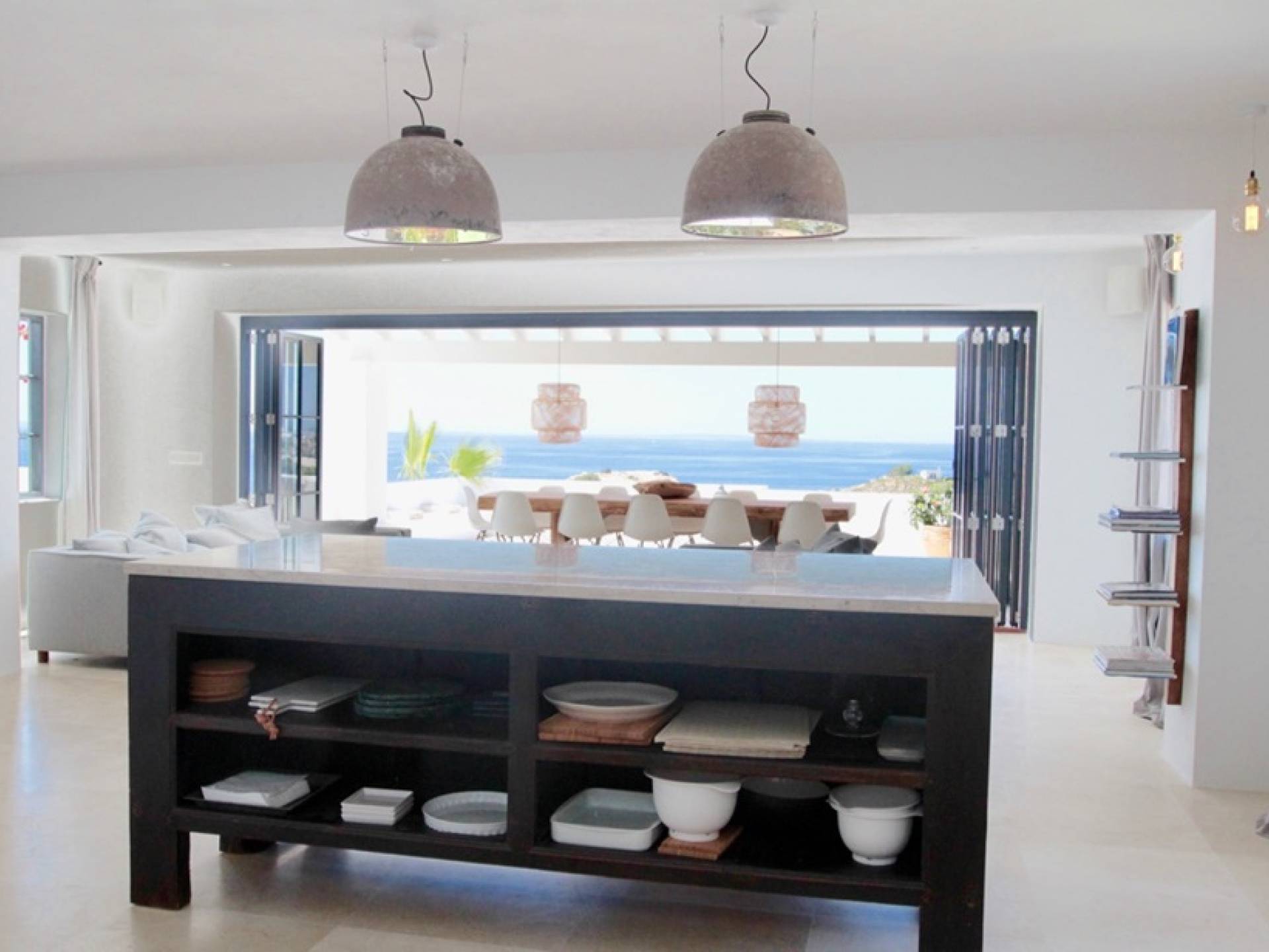 Η σκιερή τραπεζαρία δίπλα στην πισίνα διαθέτει μπάρμπεκιου αερίου και μπορεί να φιλοξενήσει 12 άτομα. Μονές ξαπλώστρες είναι διαθέσιμες στην ευρύχωρη βεράντα δίπλα στην πισίνα, στον ήλιο και σε σκιερούς χώρους. Η βεράντα για κοκτέιλ και η τραπεζαρία στο κεντρικό επίπεδο είναι ιδανικά για χαλάρωση με ποτά οποιαδήποτε στιγμή της ημέρας, ειδικά το ηλιοβασίλεμα και την ανατολή του ηλίου. Η πισίνα με θαλασσινό νερό 10 x 5 m προσφέρει εκπληκτική θέα στη θάλασσα, τη Formentera και την παλιά πόλη της Ίμπιζα. Το περιβάλλον lounge περιλαμβάνει ξαπλώστρες, ψυγείο, καταψύκτη και υπαίθριο ντους.