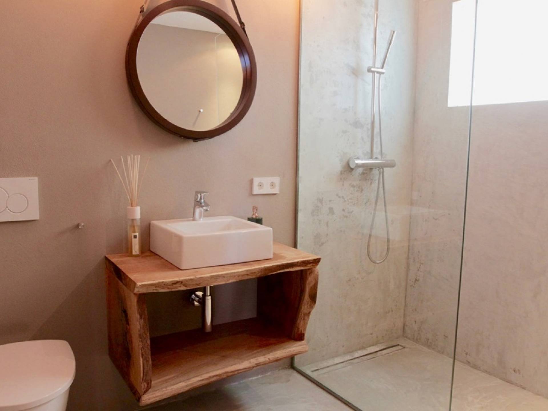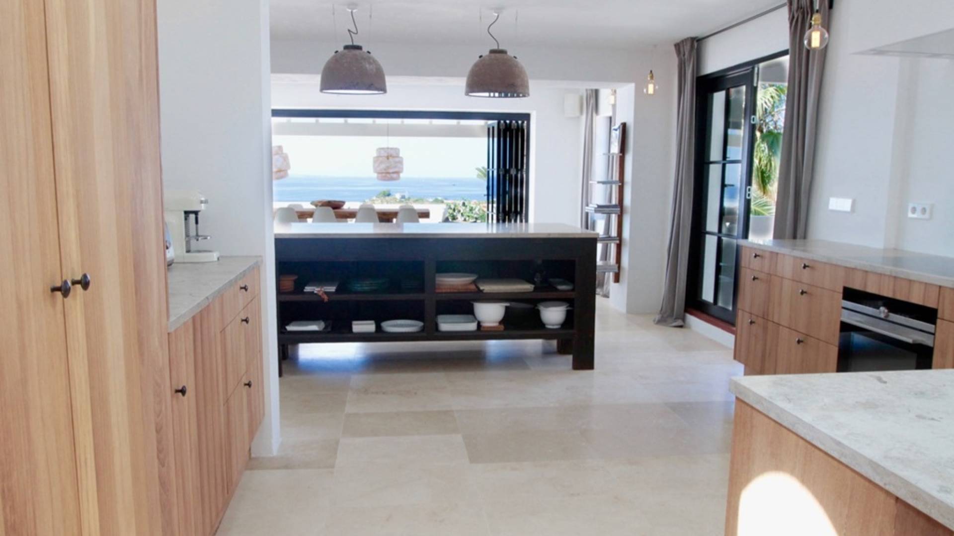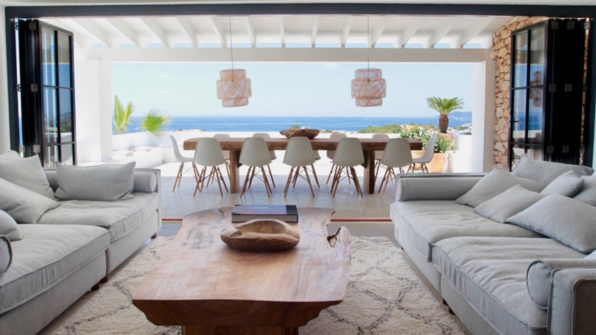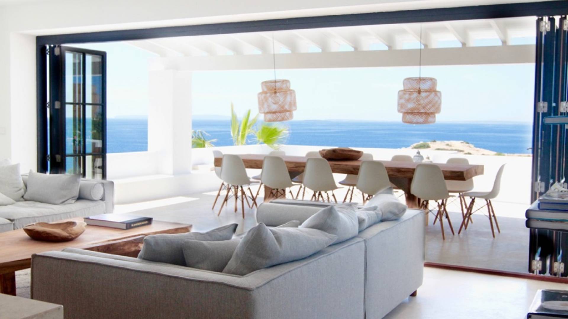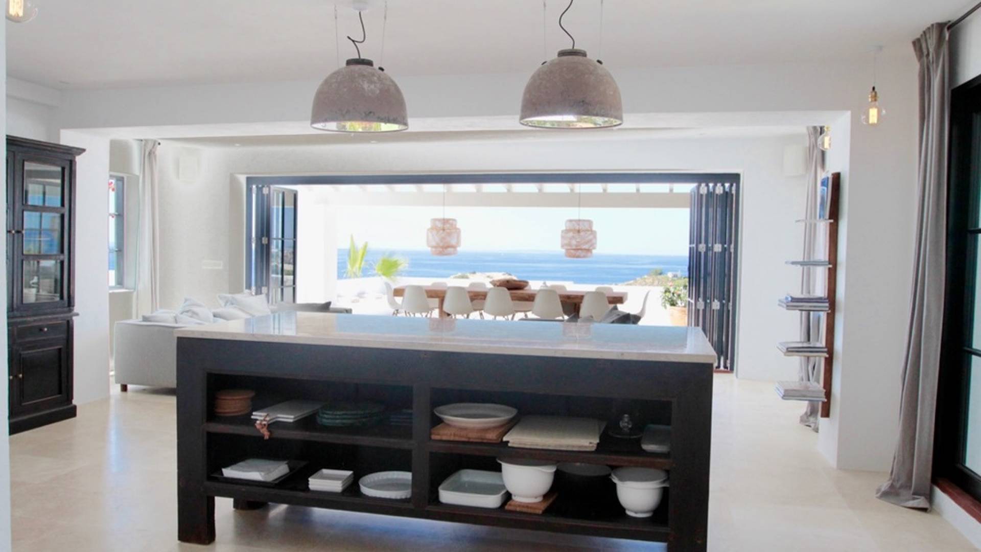 Η σκιερή τραπεζαρία δίπλα στην πισίνα διαθέτει μπάρμπεκιου αερίου και μπορεί να φιλοξενήσει 12 άτομα. Μονές ξαπλώστρες είναι διαθέσιμες στην ευρύχωρη βεράντα δίπλα στην πισίνα, στον ήλιο και σε σκιερούς χώρους. Η βεράντα για κοκτέιλ και η τραπεζαρία στο κεντρικό επίπεδο είναι ιδανικά για χαλάρωση με ποτά οποιαδήποτε στιγμή της ημέρας, ειδικά το ηλιοβασίλεμα και την ανατολή του ηλίου. Η πισίνα με θαλασσινό νερό 10 x 5 m προσφέρει εκπληκτική θέα στη θάλασσα, τη Formentera και την παλιά πόλη της Ίμπιζα. Το περιβάλλον lounge περιλαμβάνει ξαπλώστρες, ψυγείο, καταψύκτη και υπαίθριο ντους.