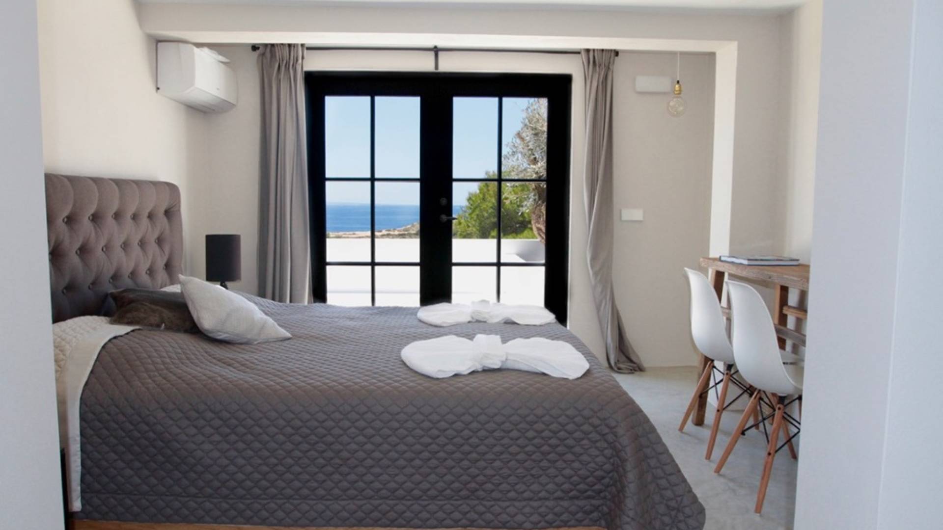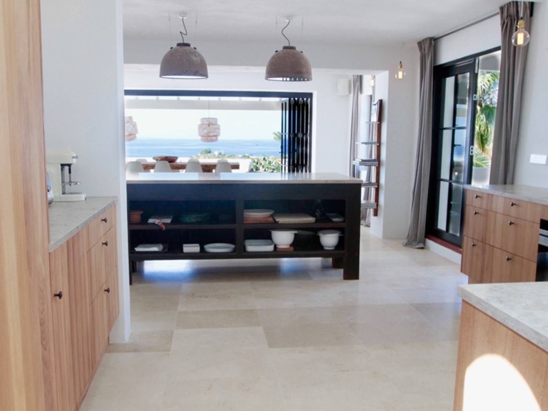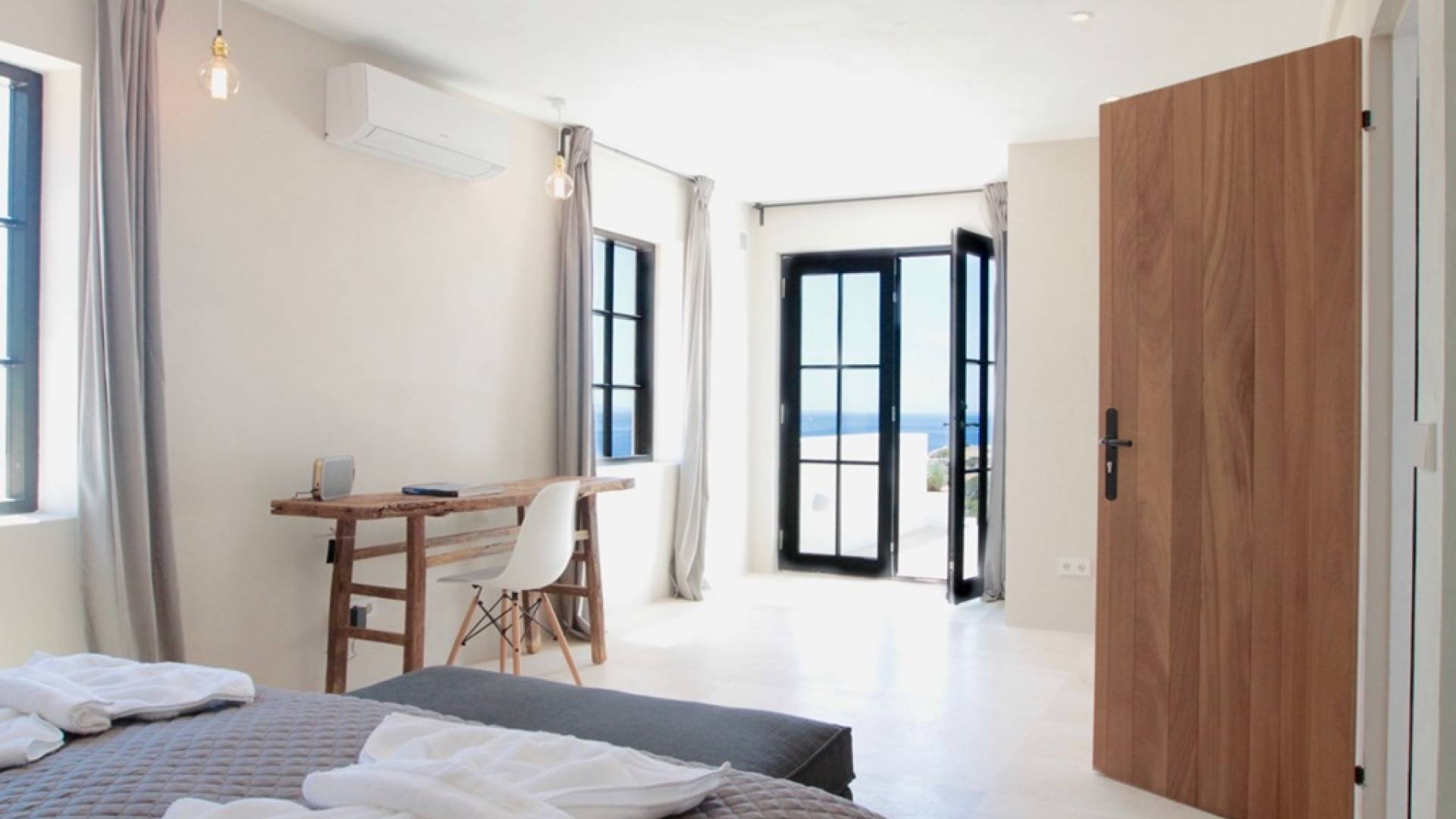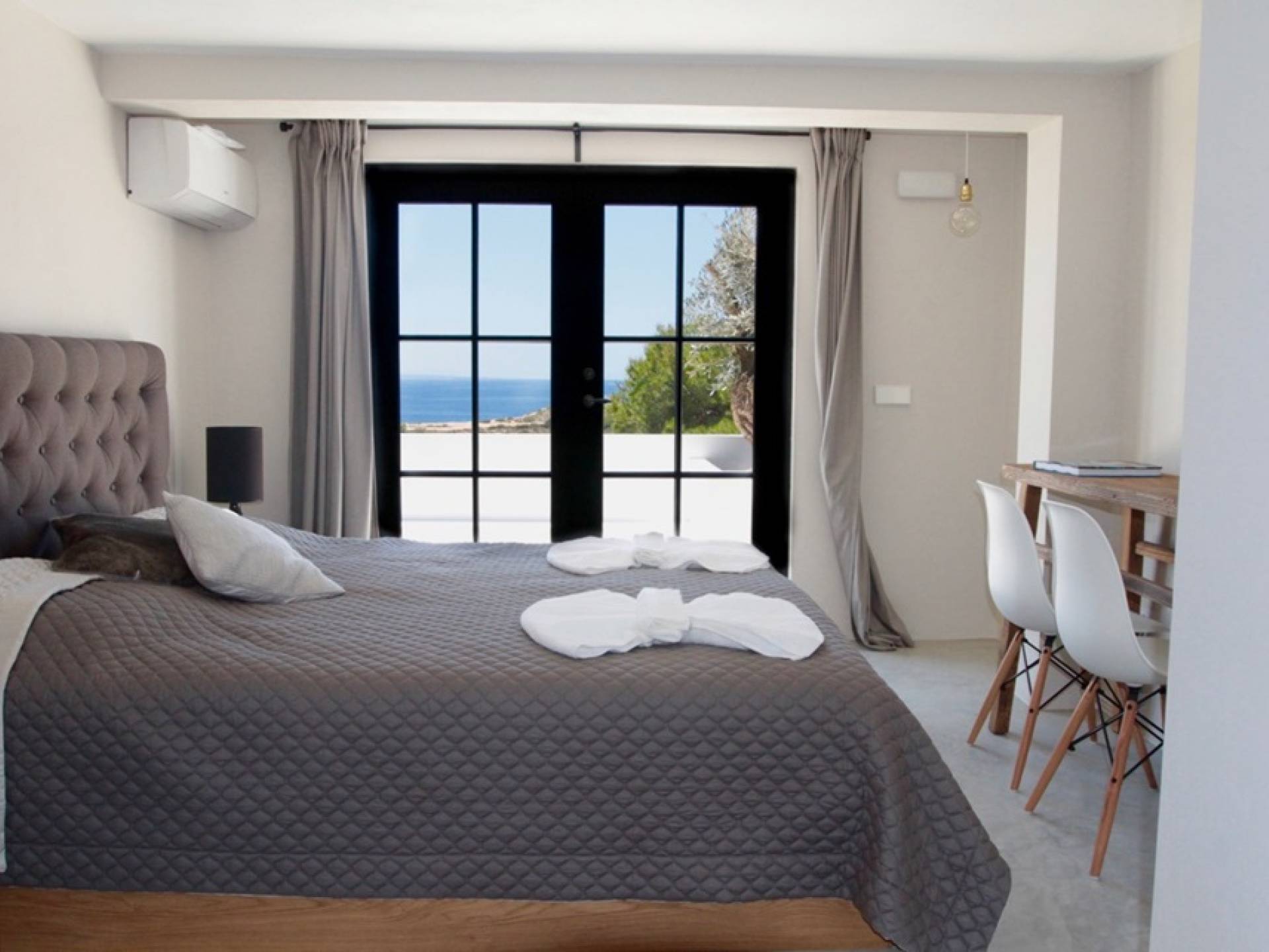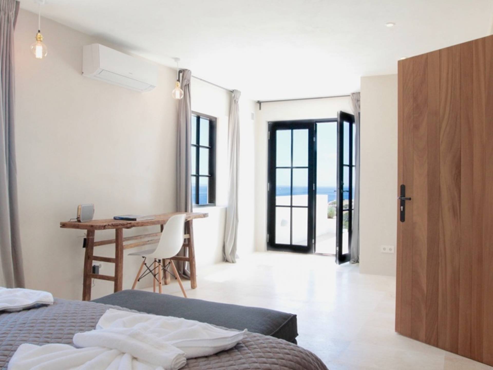 Στο κεντρικό επίπεδο, οι πόρτες του μεγάλου καθιστικού γλιστρούν και ανοίγουν σε μια βεράντα με τραπεζαρία για 12 άτομα και απίστευτη θέα στη θάλασσα. Θα βρείτε επίσης μια πλήρως εξοπλισμένη κουζίνα με νησίδα κουζίνας 3 μέτρων, σαλόνι με άνετους καναπέδες και βεστιάριο επισκεπτών με WC. Η πλήρως εξοπλισμένη κουζίνα διαθέτει τα εξής: 2 x ενσωματωμένο ψυγείο και 1 x καταψύκτη, 2 x πλυντήρια πιάτων, 4 μονάδες επαγωγής πιάτων, 1 x φούρνο με γκριλ, φούρνο μικροκυμάτων, καφετιέρα Nespresso, αποχυμωτή. Το χαμηλότερο επίπεδο διαθέτει γυμναστήριο, μεγάλη αίθουσα παιχνιδιού/κινηματογράφου με τηλεόραση επίπεδης οθόνης 55 ιντσών και βεστιάριο επισκεπτών με τουαλέτα. Διατίθενται σταθμοί βάσης για iPod σε όλους τους χώρους και η βίλα διαθέτει internet υψηλής ταχύτητας οπτικών ινών (σπάνιο στο νησί) με μέση ταχύτητα λήψης 50 MB, αλλά αυτό ποικίλλει. Καθώς αυτή η βίλα βρίσκεται σε κατοικημένη περιοχή, υπάρχει μηδενική ανοχή όσον αφορά τη μουσική και τον δυνατό θόρυβο μεταξύ 23:00 και 10:00. Η βίλα προστατεύεται καλά με εσωτερικό και εξωτερικό σύστημα συναγερμού συνδεδεμένο με GPS Security. Παρέχονται κούνιες, παιδικά καρεκλάκια και μια επιλογή από παιχνίδια και παιδικές τσάντες φασολιών.