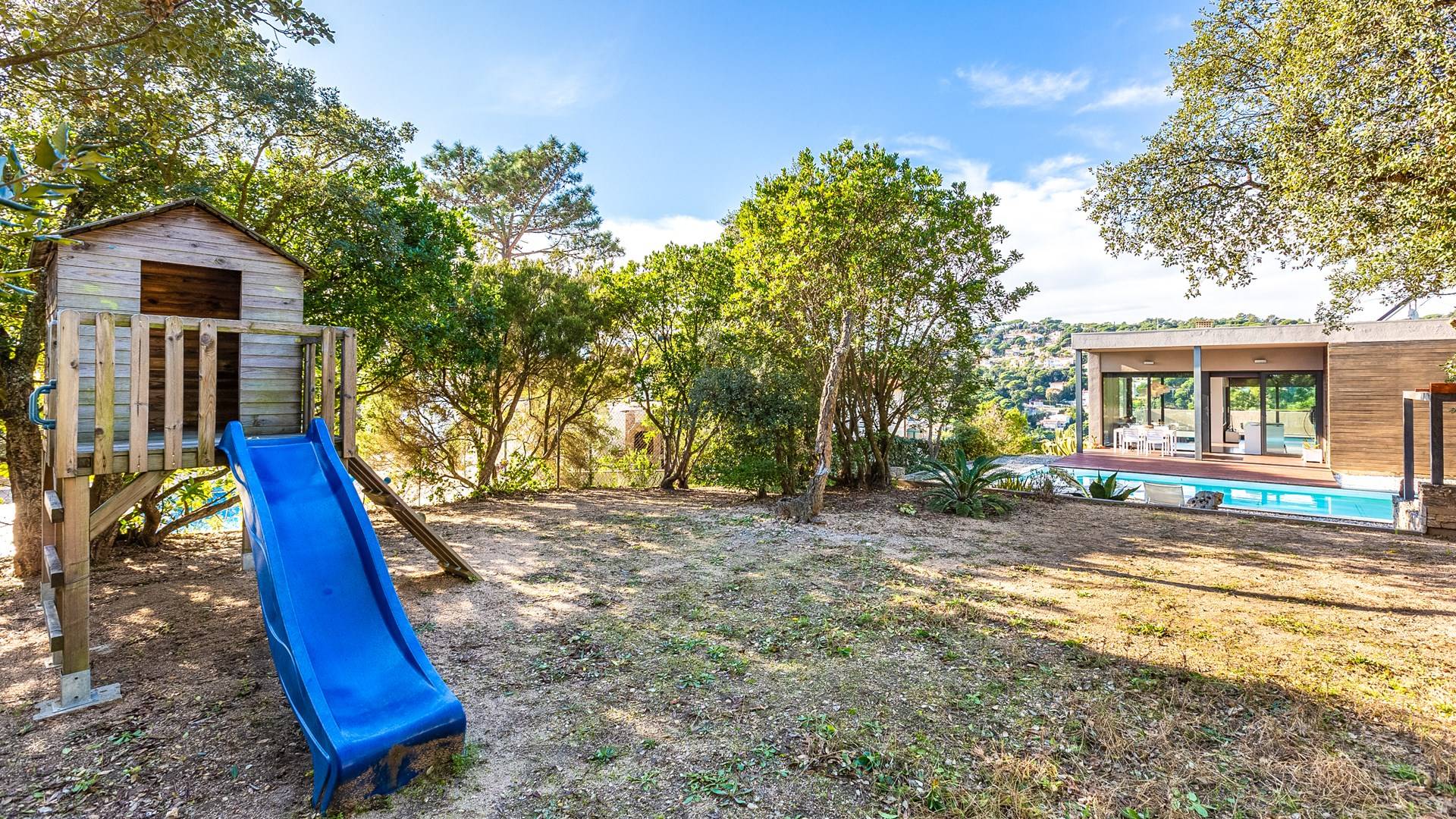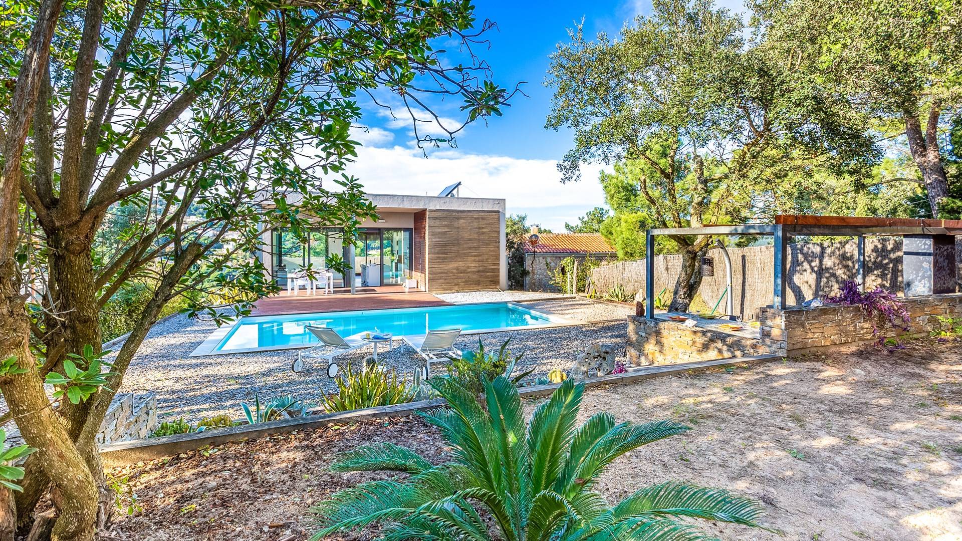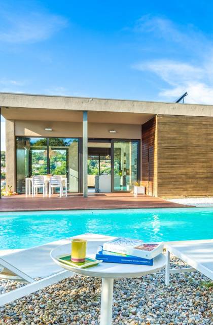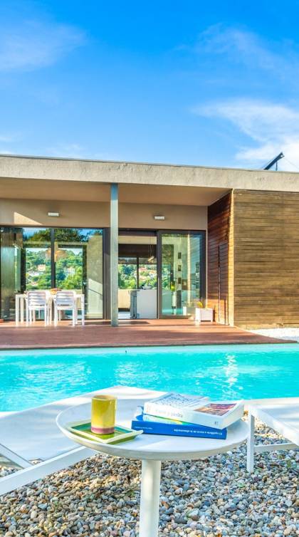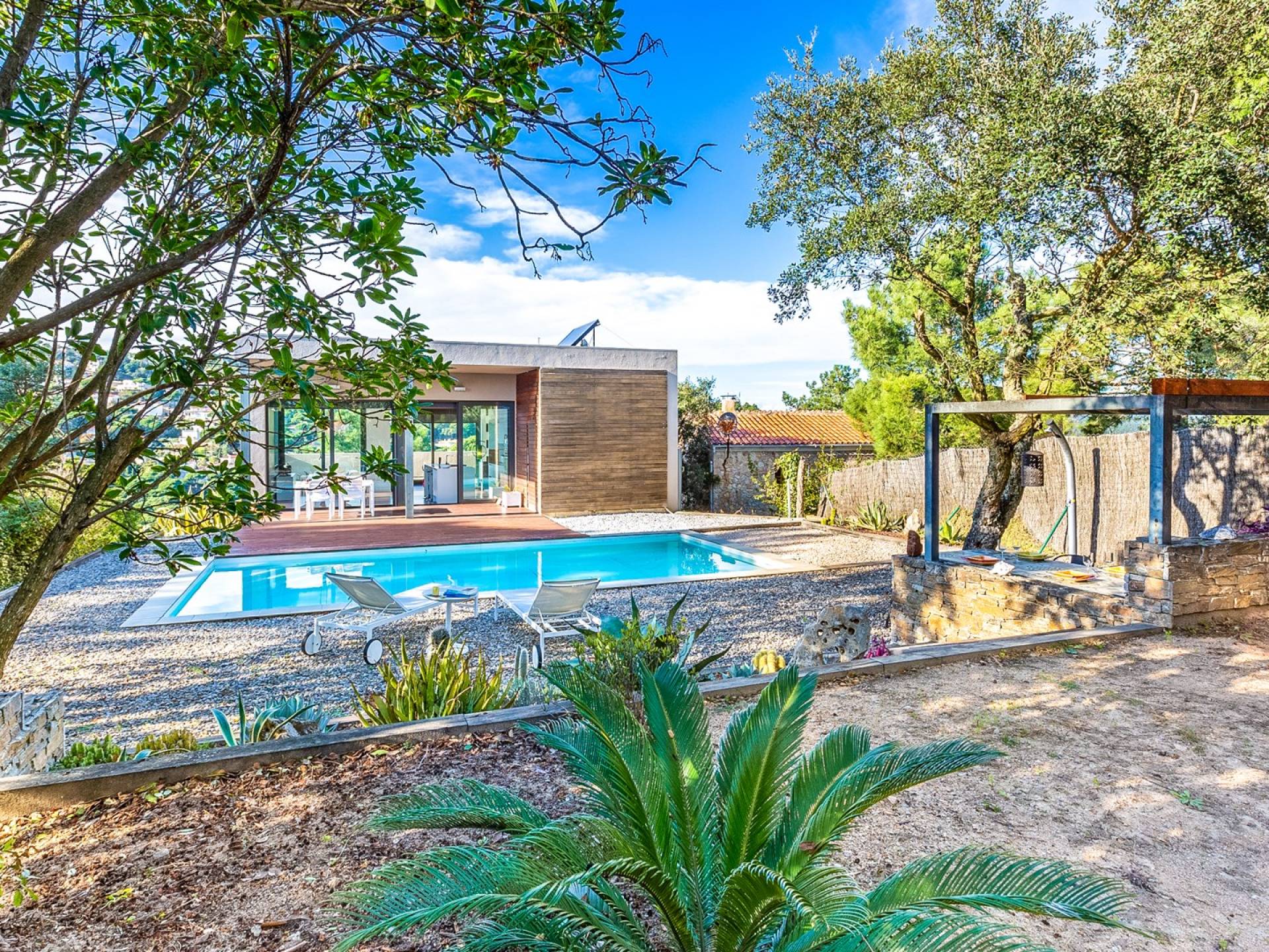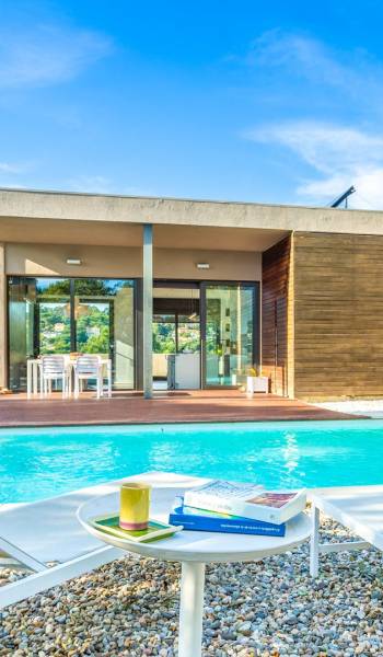Το σπίτι έχει πολλές εξωτερικές βεράντες από τις οποίες θα μπορείτε να θαυμάσετε τη θέα στον κόλπο και να απολαύσετε πρωινό στο ύπαιθρο. Ιδιωτική πισίνα 8x4μ. Υπαίθριος χώρος στάθμευσης, ιδιωτικός κήπος και πλήρως εξοπλισμένος χώρος παιχνιδιού για τα παιδιά. Εσωτερικός χώρος 166 m2 που περιλαμβάνει σαλόνι με τηλεόραση, τραπεζαρία και κουζίνα. Η κουζίνα έχει ένα μεγάλο νησί με γωνιά πρωινού και είναι πλήρως εξοπλισμένη (φούρνος, φούρνος μικροκυμάτων, πλυντήριο πιάτων, πλυντήριο ρούχων). Το σπίτι έχει δύο δίκλινα υπνοδωμάτια (180 x 200 cm et 140 x 200 cm), ένα υπνοδωμάτιο με κουκέτα και ένα γραφείο. Υπάρχει επίσης 1 μπάνιο με μπανιέρα και ένα με ντους.