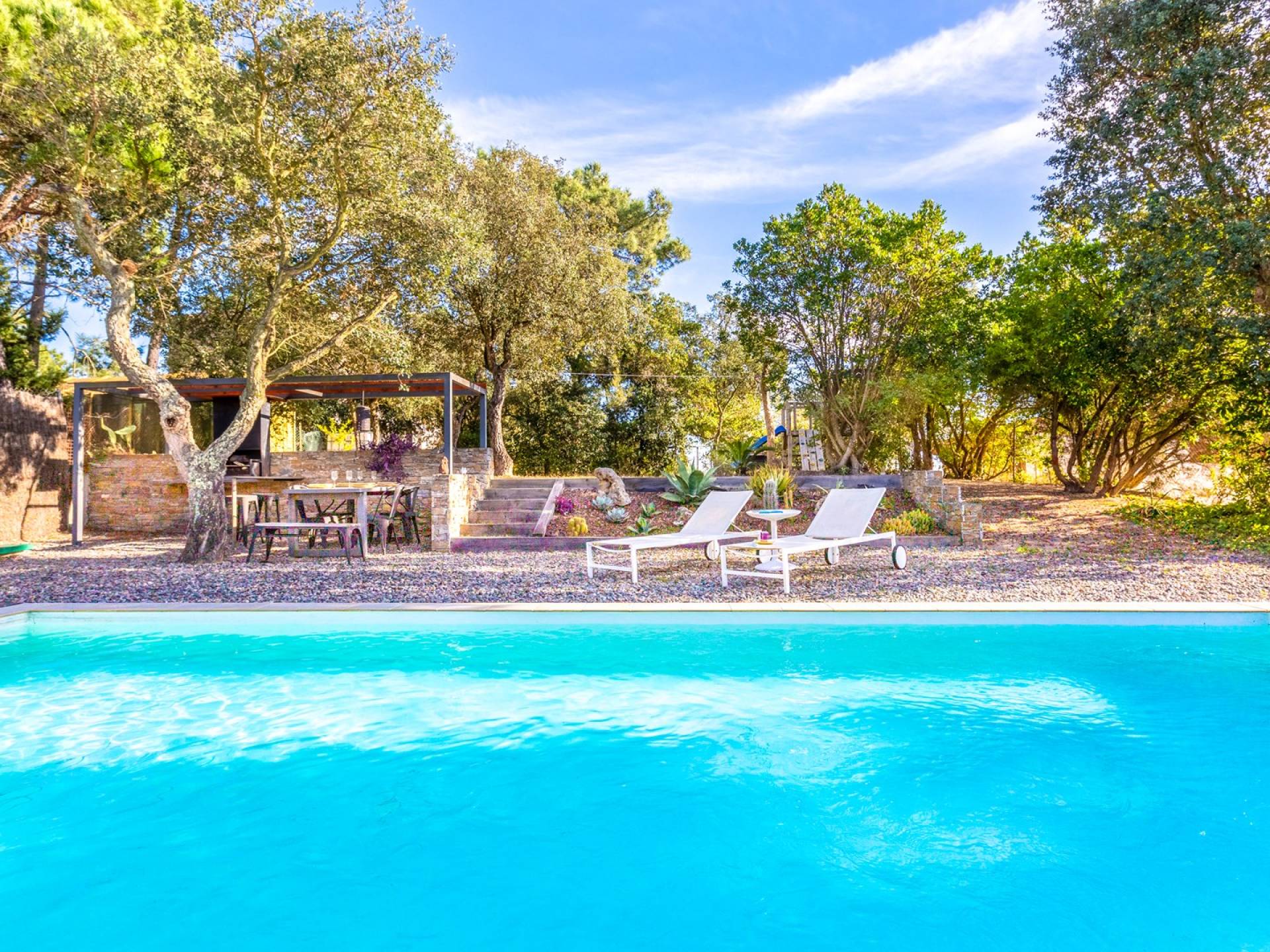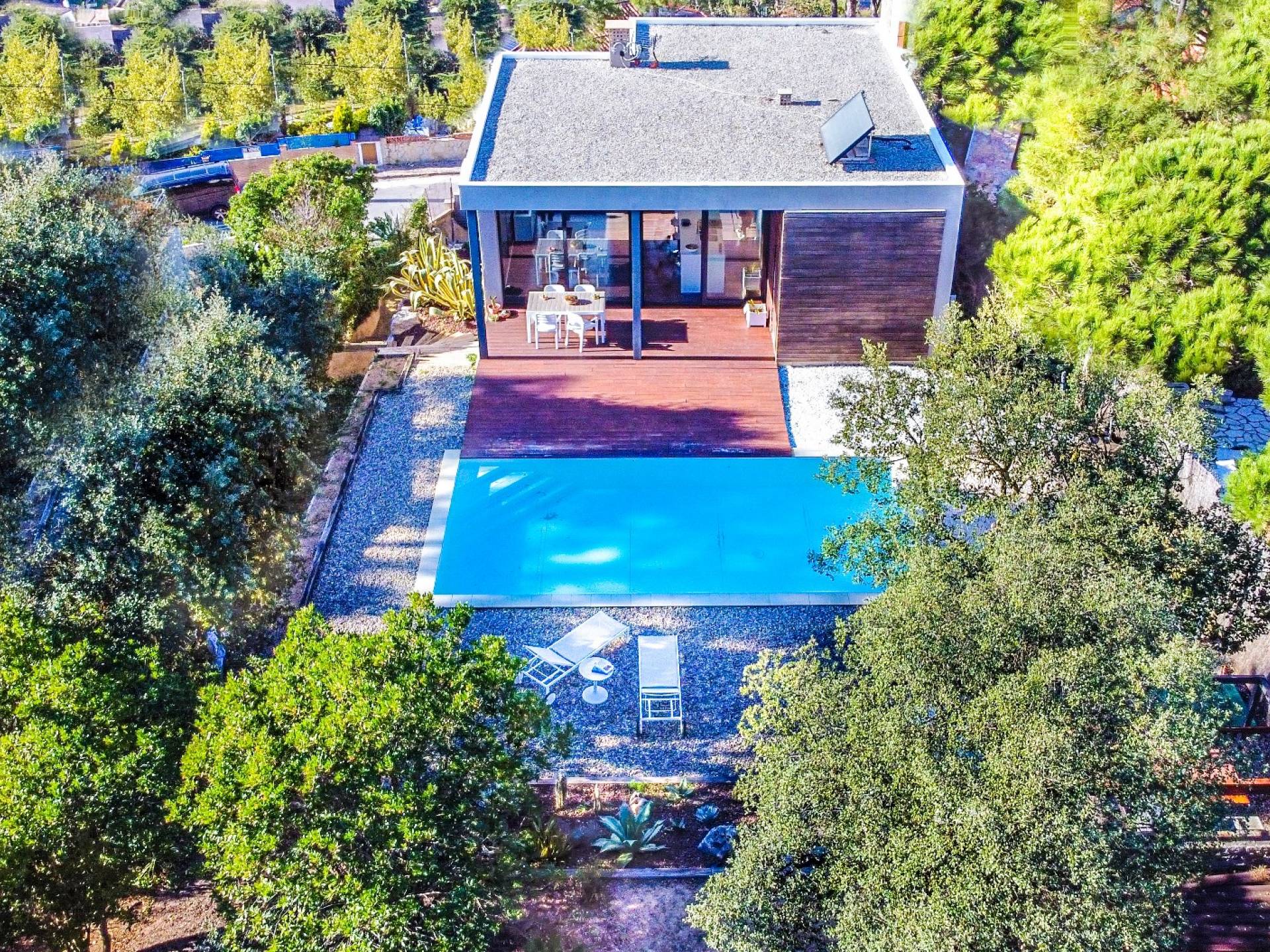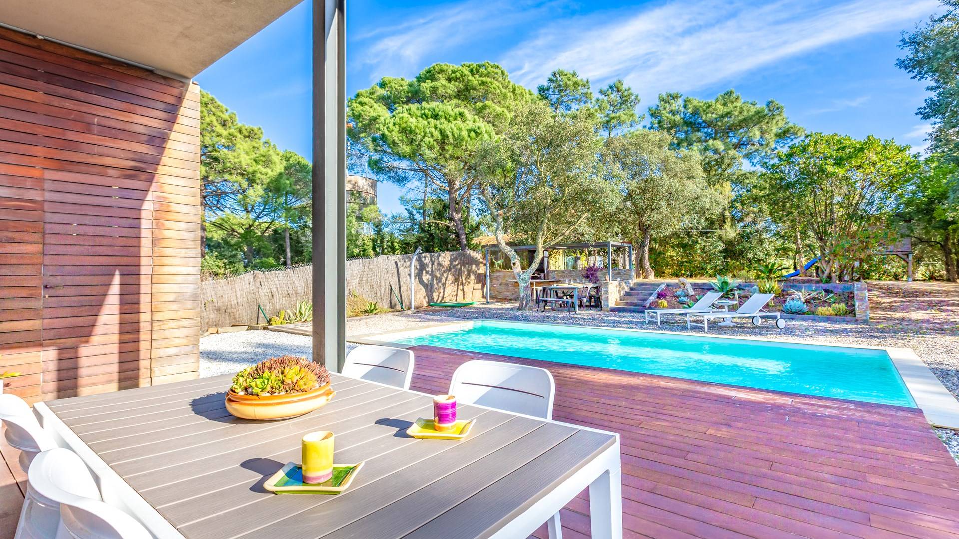 Το σπίτι έχει πολλές εξωτερικές βεράντες από τις οποίες θα μπορείτε να θαυμάσετε τη θέα στον κόλπο και να απολαύσετε πρωινό στο ύπαιθρο. Ιδιωτική πισίνα 8x4μ. Υπαίθριος χώρος στάθμευσης, ιδιωτικός κήπος και πλήρως εξοπλισμένος χώρος παιχνιδιού για τα παιδιά. Εσωτερικός χώρος 166 m2 που περιλαμβάνει σαλόνι με τηλεόραση, τραπεζαρία και κουζίνα. Η κουζίνα έχει ένα μεγάλο νησί με γωνιά πρωινού και είναι πλήρως εξοπλισμένη (φούρνος, φούρνος μικροκυμάτων, πλυντήριο πιάτων, πλυντήριο ρούχων). Το σπίτι έχει δύο δίκλινα υπνοδωμάτια (180 x 200 cm et 140 x 200 cm), ένα υπνοδωμάτιο με κουκέτα και ένα γραφείο. Υπάρχει επίσης 1 μπάνιο με μπανιέρα και ένα με ντους.