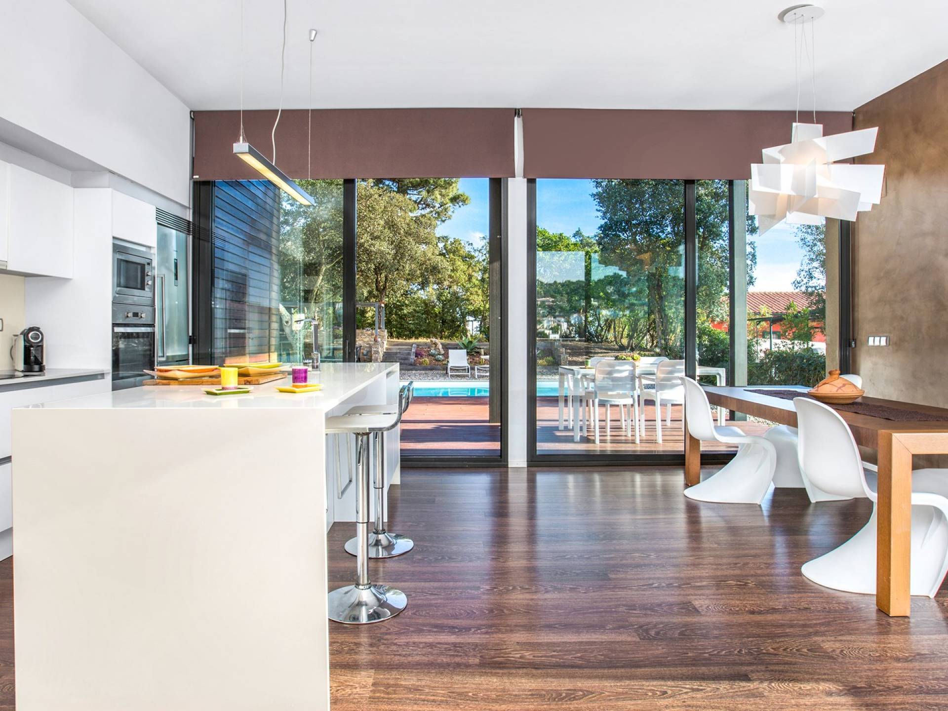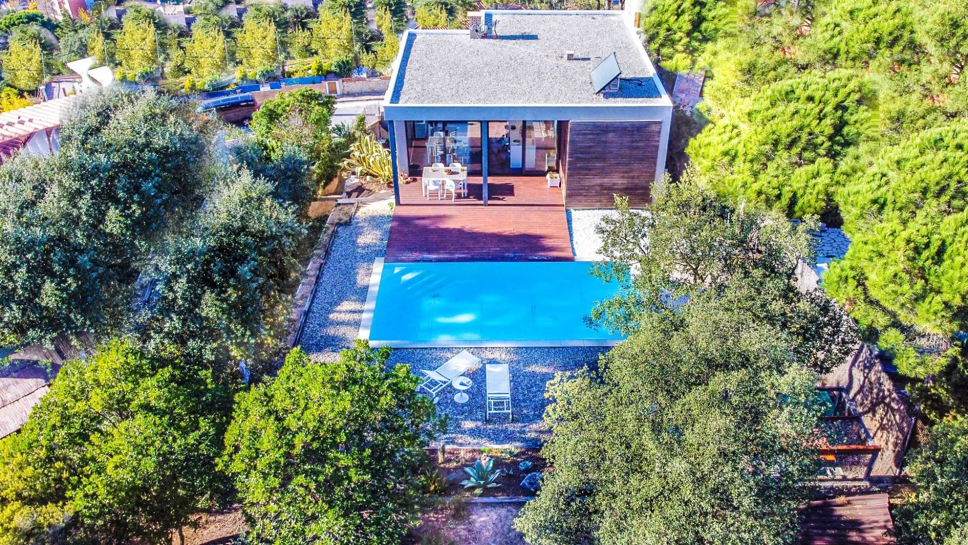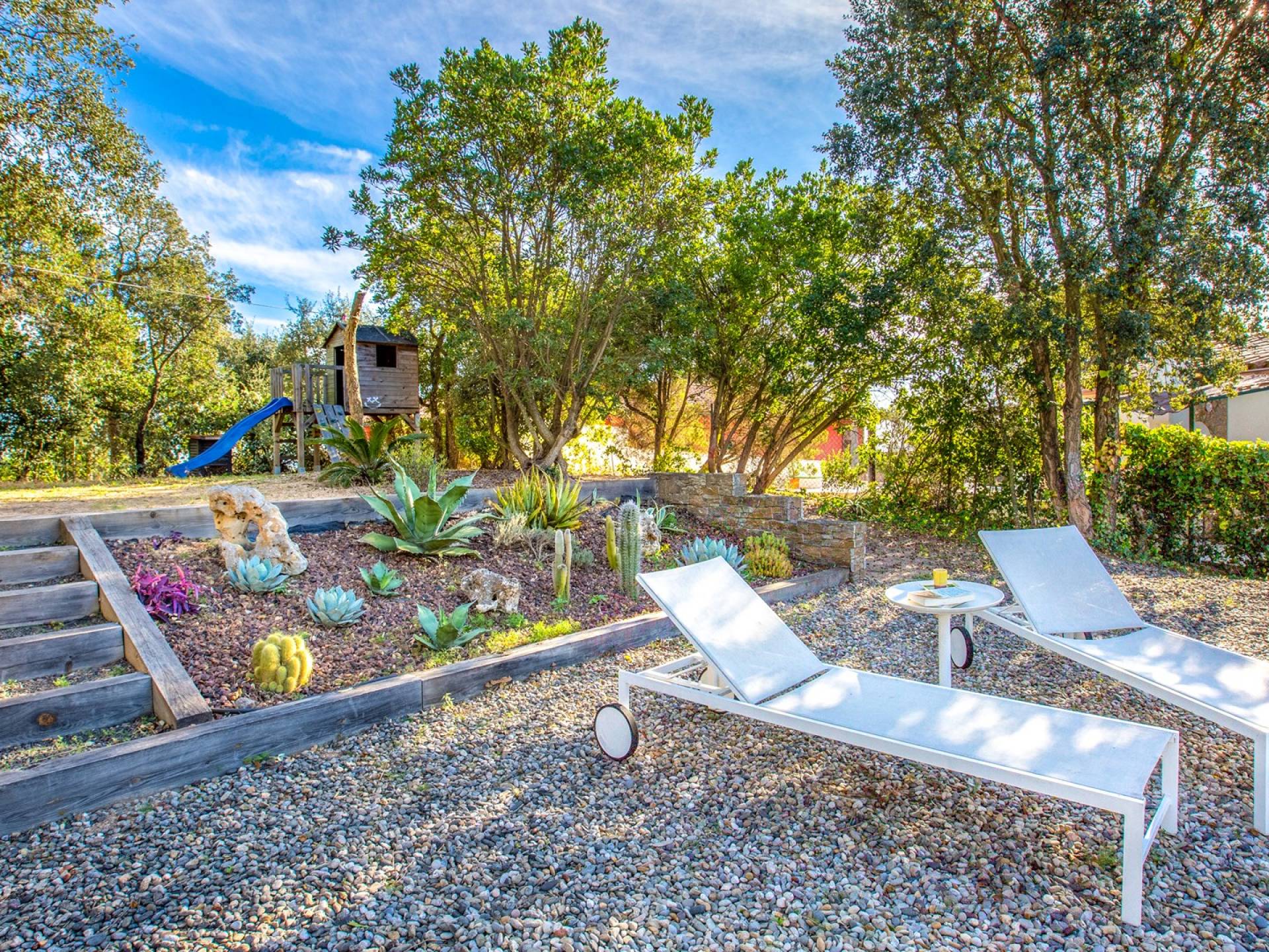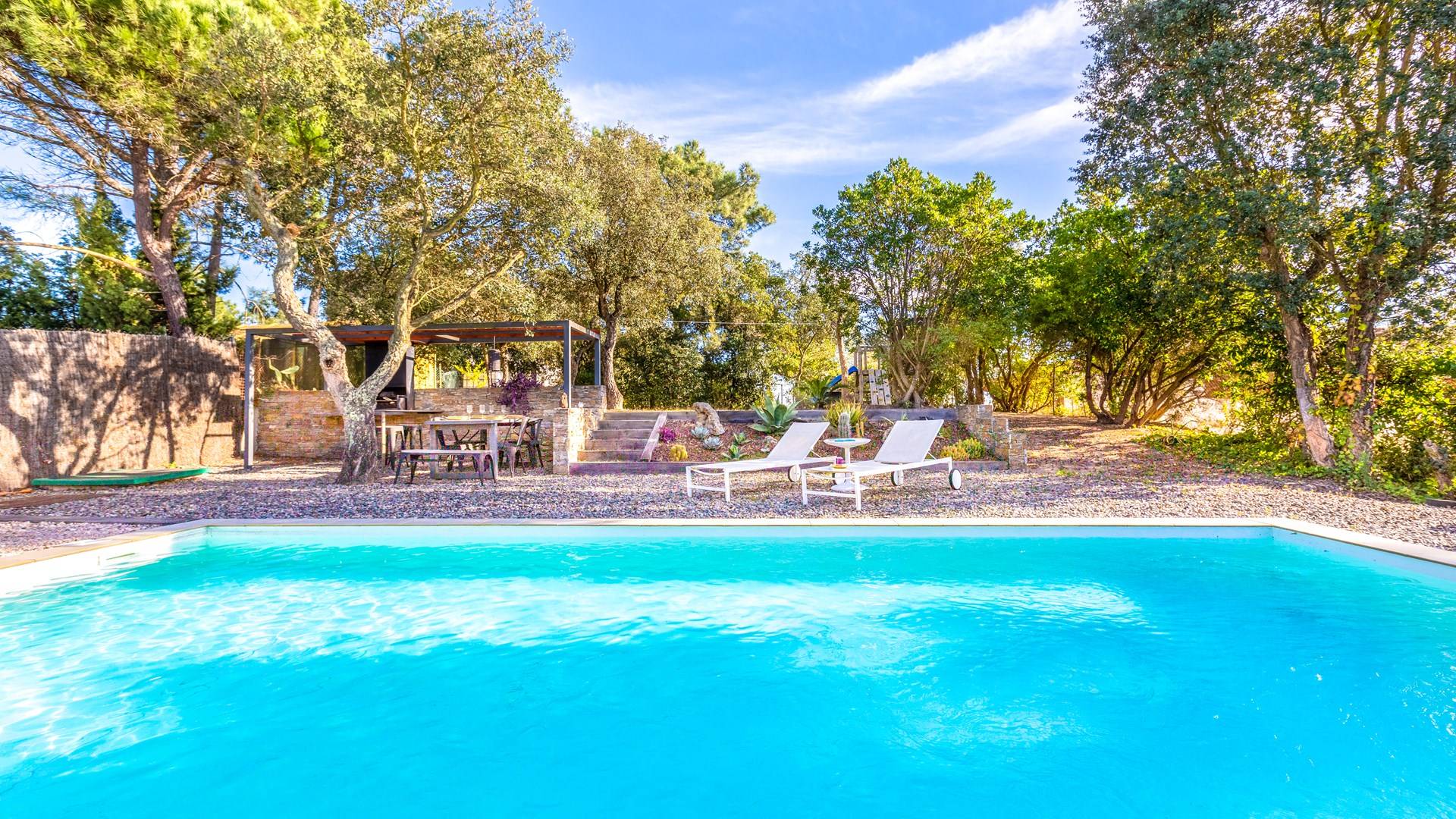 Το σπίτι έχει πολλές εξωτερικές βεράντες από τις οποίες θα μπορείτε να θαυμάσετε τη θέα στον κόλπο και να απολαύσετε πρωινό στο ύπαιθρο. Ιδιωτική πισίνα 8x4μ. Υπαίθριος χώρος στάθμευσης, ιδιωτικός κήπος και πλήρως εξοπλισμένος χώρος παιχνιδιού για τα παιδιά. Εσωτερικός χώρος 166 m2 που περιλαμβάνει σαλόνι με τηλεόραση, τραπεζαρία και κουζίνα. Η κουζίνα έχει ένα μεγάλο νησί με γωνιά πρωινού και είναι πλήρως εξοπλισμένη (φούρνος, φούρνος μικροκυμάτων, πλυντήριο πιάτων, πλυντήριο ρούχων). Το σπίτι έχει δύο δίκλινα υπνοδωμάτια (180 x 200 cm et 140 x 200 cm), ένα υπνοδωμάτιο με κουκέτα και ένα γραφείο. Υπάρχει επίσης 1 μπάνιο με μπανιέρα και ένα με ντους.