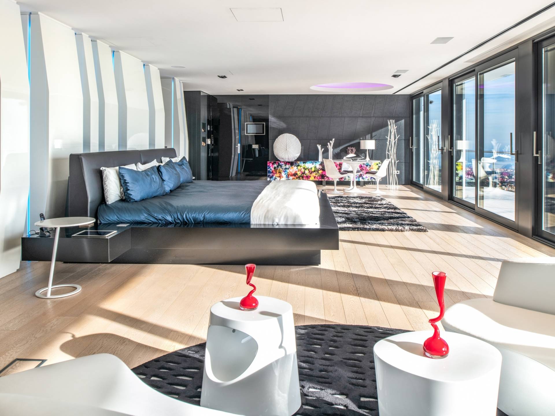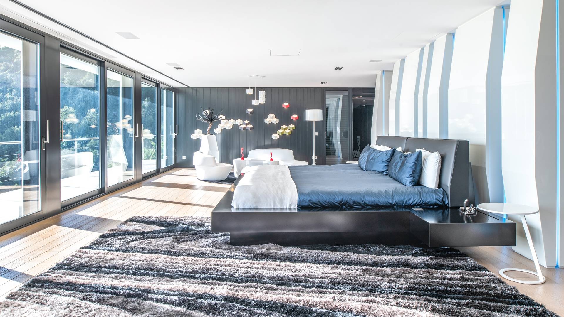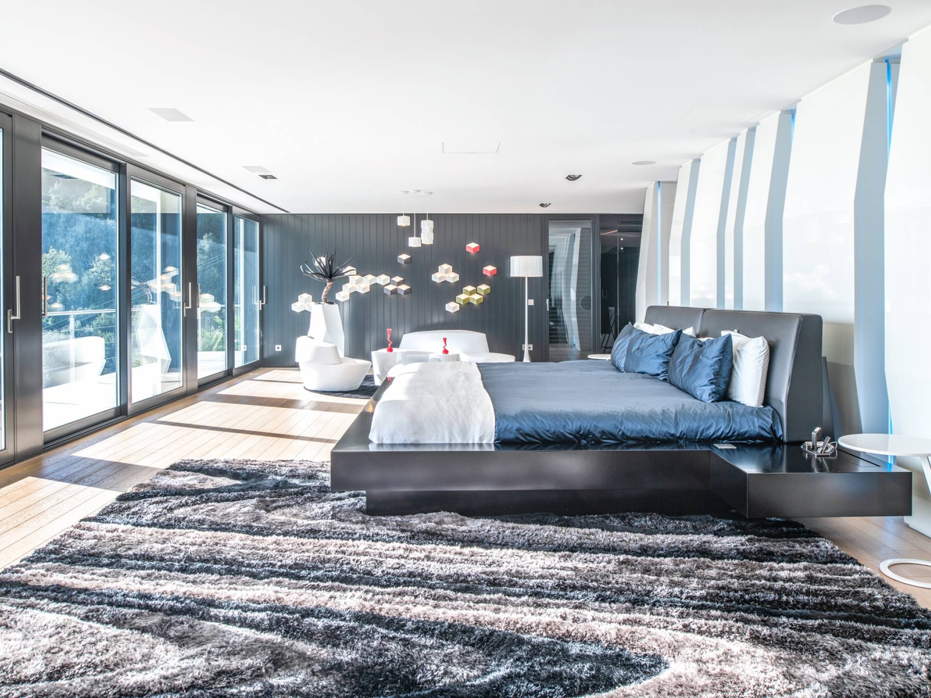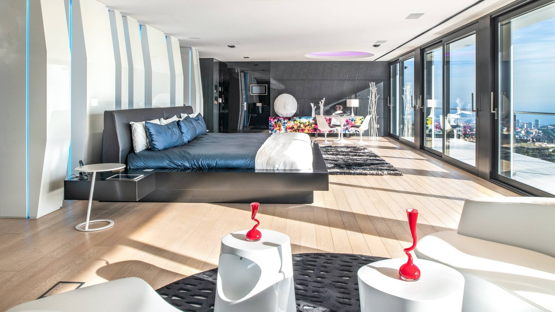 Στον 4ο όροφο, υπάρχει η υπέροχη κύρια κρεβατοκάμαρα με ένα πολύ μεγάλο king-size κρεβάτι (3x2 μέτρα), ένα γυάλινο τζάμι (τούρκικο λουτρό), ένα μεγάλο ντους ψιλής βροχής και ένα κρεβάτι μασάζ. Οι μεγάλες γυάλινες πόρτες επιτρέπουν μια πανοραμική θέα στη θάλασσα και μερικά άλλα παράθυρα που σας επιτρέπουν να δείτε το εσωτερικό της πισίνας. Στον 3ο όροφο, μπορείτε να βρείτε ένα υπερσύγχρονο γυμναστήριο, καθώς και έναν χώρο γραφείου με επιφάνεια εργασίας μήκους 5 μέτρων. Υπάρχουν επίσης 4 δωμάτια και 3 μπάνια. Στον 2ο έχετε ένα ανεξάρτητο υπνοδωμάτιο με το μπάνιο του. Το laundry room βρίσκεται στον 1ο όροφο. Ο 3ος και ο 4ος όροφος προστατεύονται με μέγιστα μέτρα ασφαλείας.
