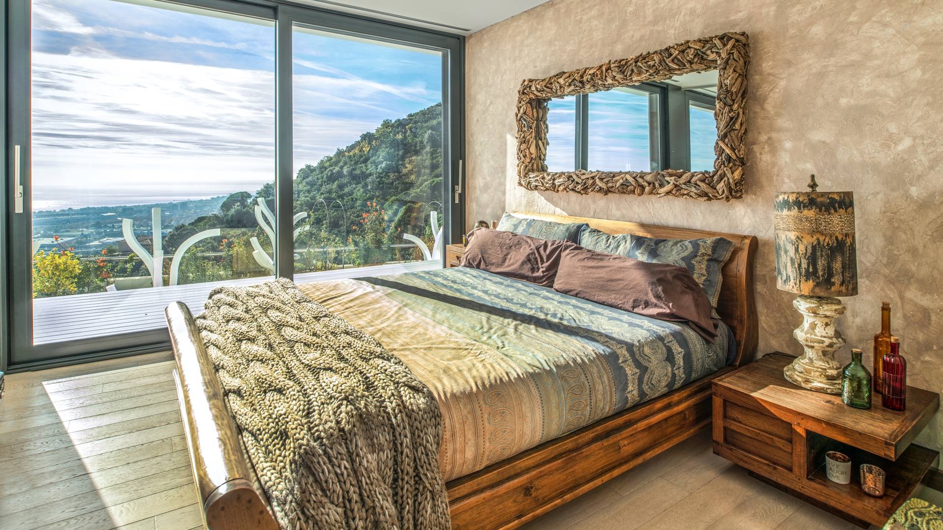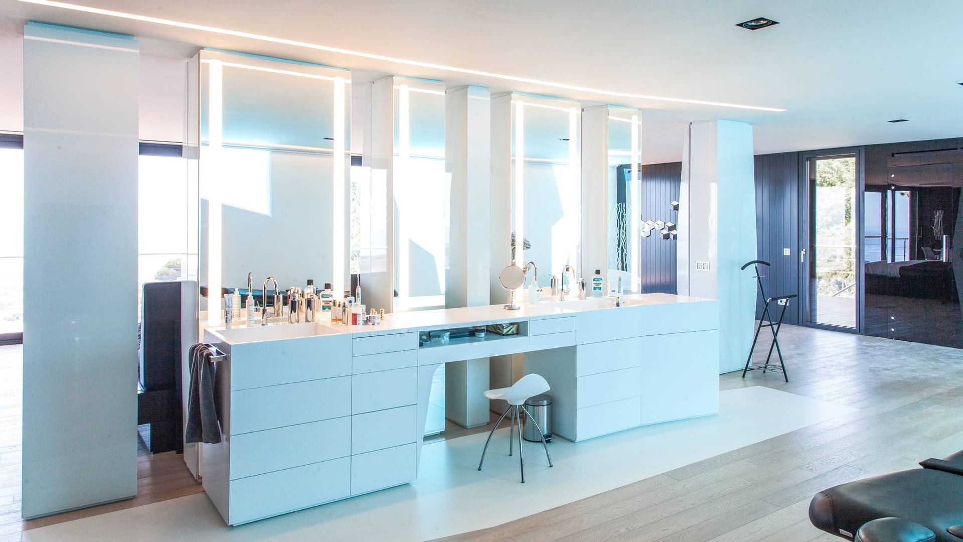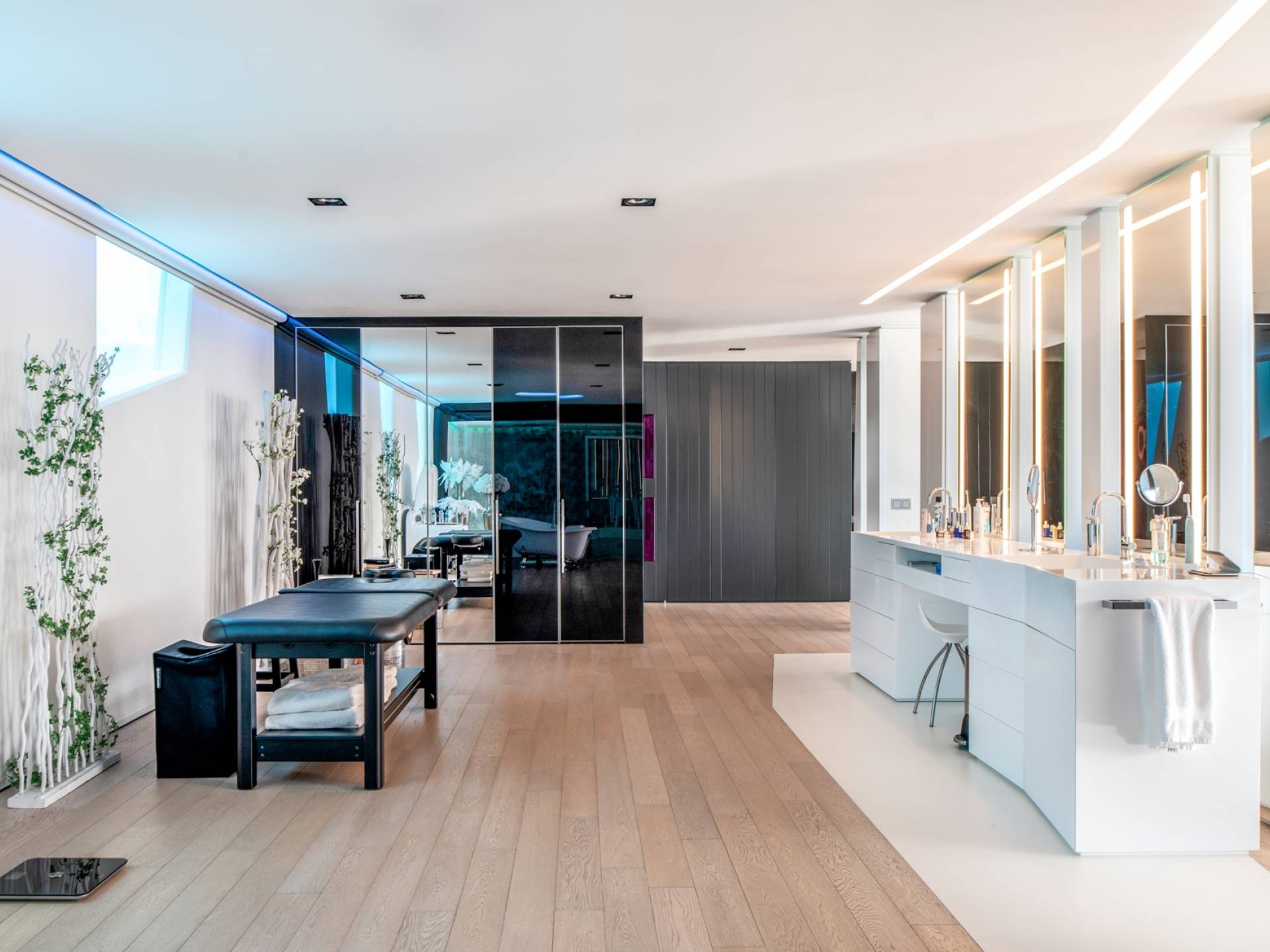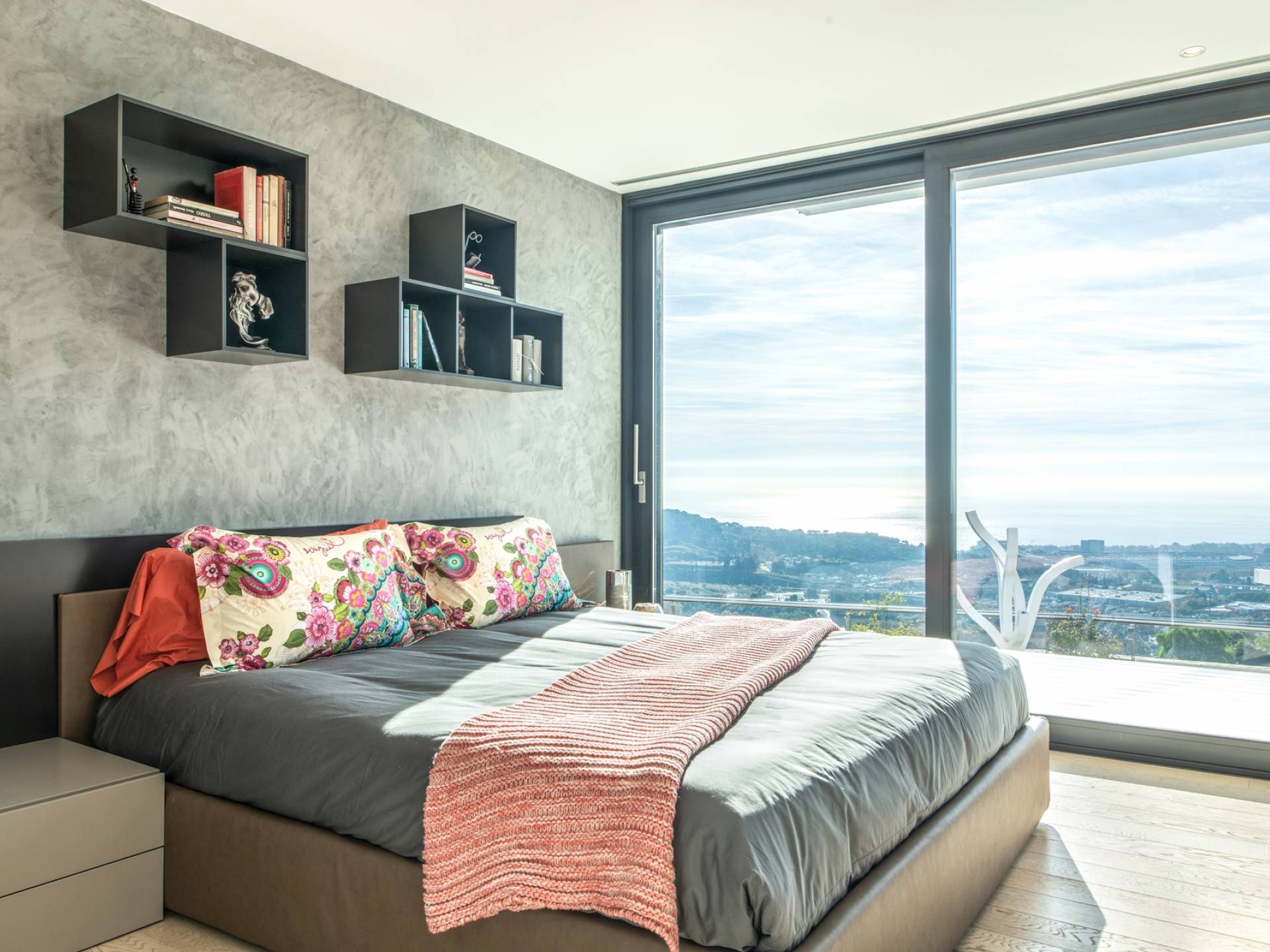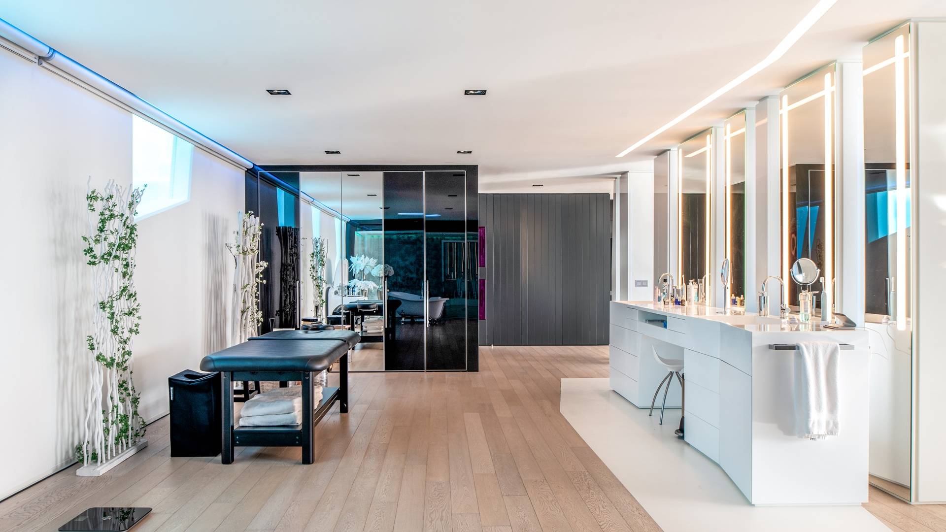 Στον 4ο όροφο, υπάρχει η υπέροχη κύρια κρεβατοκάμαρα με ένα πολύ μεγάλο king-size κρεβάτι (3x2 μέτρα), ένα γυάλινο τζάμι (τούρκικο λουτρό), ένα μεγάλο ντους ψιλής βροχής και ένα κρεβάτι μασάζ. Οι μεγάλες γυάλινες πόρτες επιτρέπουν μια πανοραμική θέα στη θάλασσα και μερικά άλλα παράθυρα που σας επιτρέπουν να δείτε το εσωτερικό της πισίνας. Στον 3ο όροφο, μπορείτε να βρείτε ένα υπερσύγχρονο γυμναστήριο, καθώς και έναν χώρο γραφείου με επιφάνεια εργασίας μήκους 5 μέτρων. Υπάρχουν επίσης 4 δωμάτια και 3 μπάνια. Στον 2ο έχετε ένα ανεξάρτητο υπνοδωμάτιο με το μπάνιο του. Το laundry room βρίσκεται στον 1ο όροφο. Ο 3ος και ο 4ος όροφος προστατεύονται με μέγιστα μέτρα ασφαλείας.