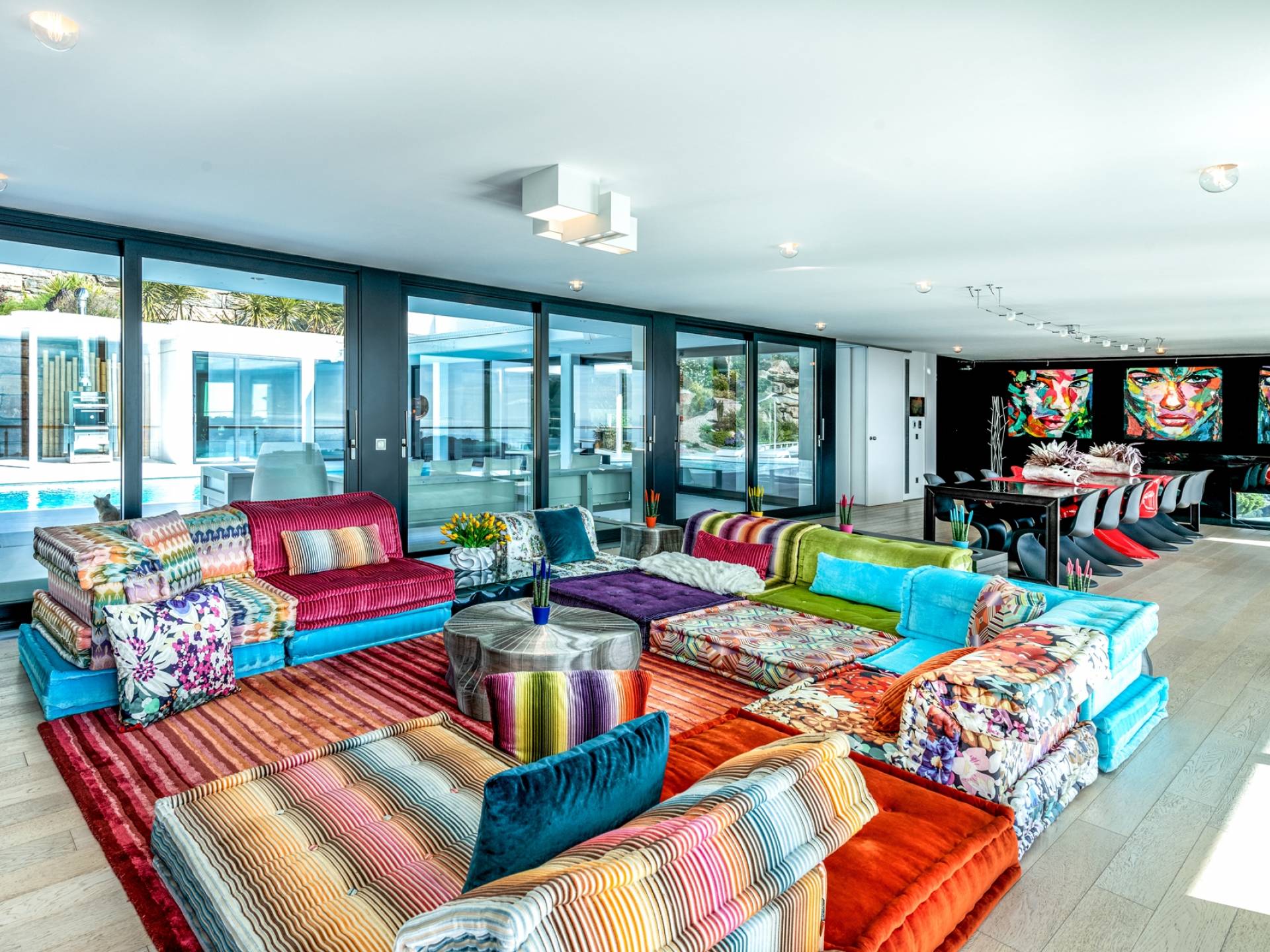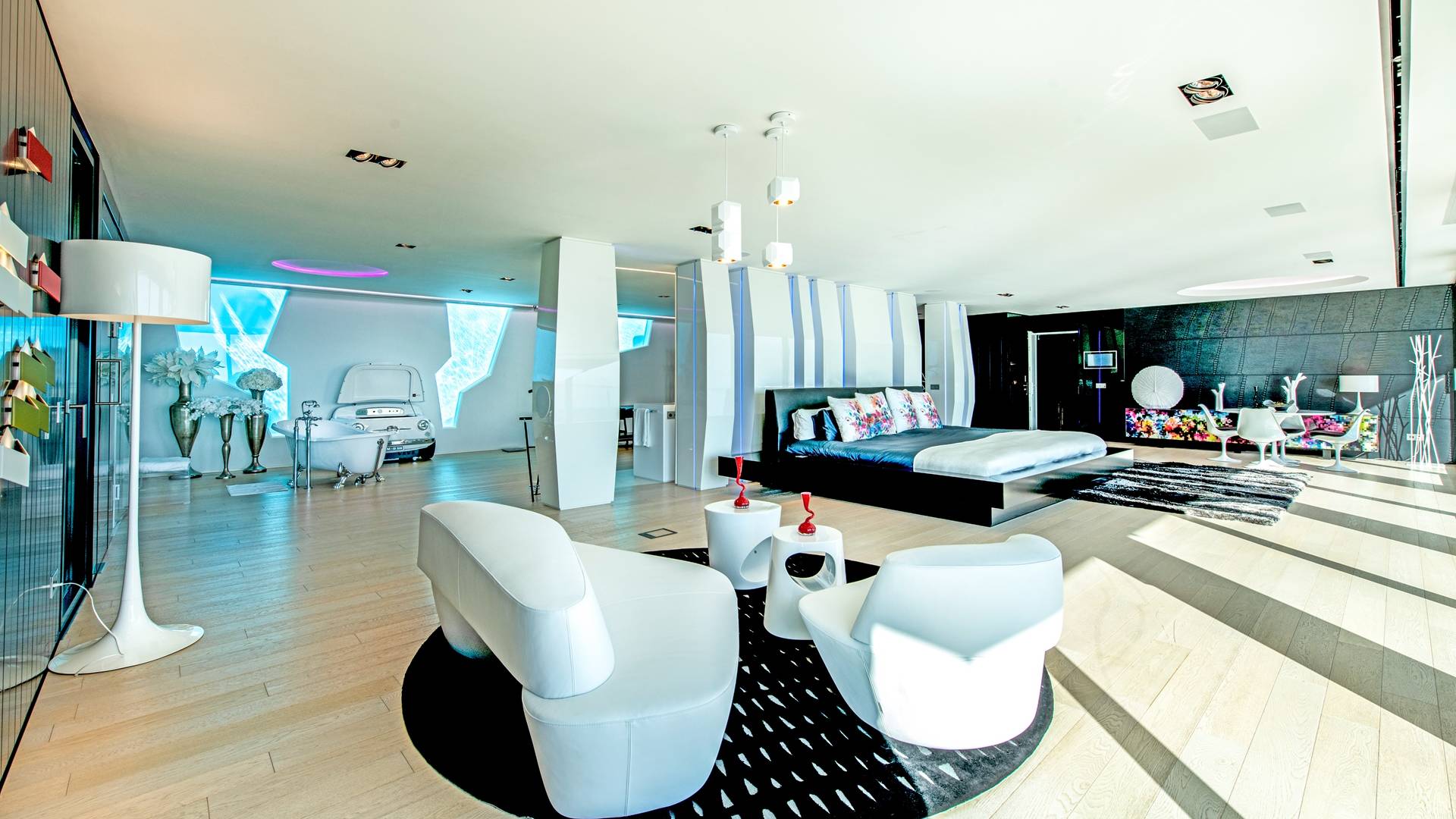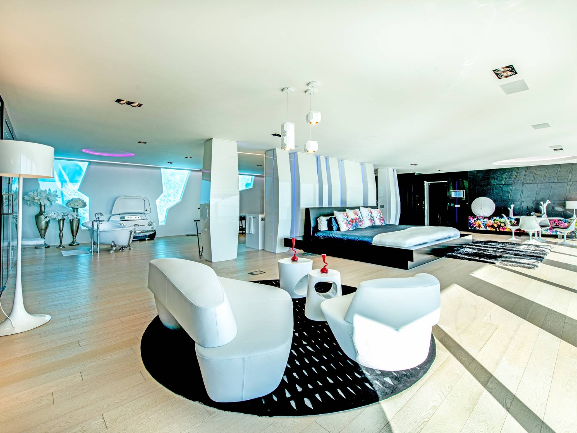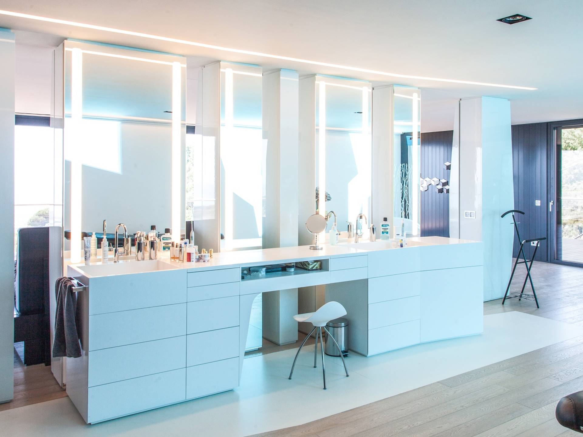 Στον 4ο όροφο, υπάρχει η υπέροχη κύρια κρεβατοκάμαρα με ένα πολύ μεγάλο king-size κρεβάτι (3x2 μέτρα), ένα γυάλινο τζάμι (τούρκικο λουτρό), ένα μεγάλο ντους ψιλής βροχής και ένα κρεβάτι μασάζ. Οι μεγάλες γυάλινες πόρτες επιτρέπουν μια πανοραμική θέα στη θάλασσα και μερικά άλλα παράθυρα που σας επιτρέπουν να δείτε το εσωτερικό της πισίνας. Στον 3ο όροφο, μπορείτε να βρείτε ένα υπερσύγχρονο γυμναστήριο, καθώς και έναν χώρο γραφείου με επιφάνεια εργασίας μήκους 5 μέτρων. Υπάρχουν επίσης 4 δωμάτια και 3 μπάνια. Στον 2ο έχετε ένα ανεξάρτητο υπνοδωμάτιο με το μπάνιο του. Το laundry room βρίσκεται στον 1ο όροφο. Ο 3ος και ο 4ος όροφος προστατεύονται με μέγιστα μέτρα ασφαλείας.