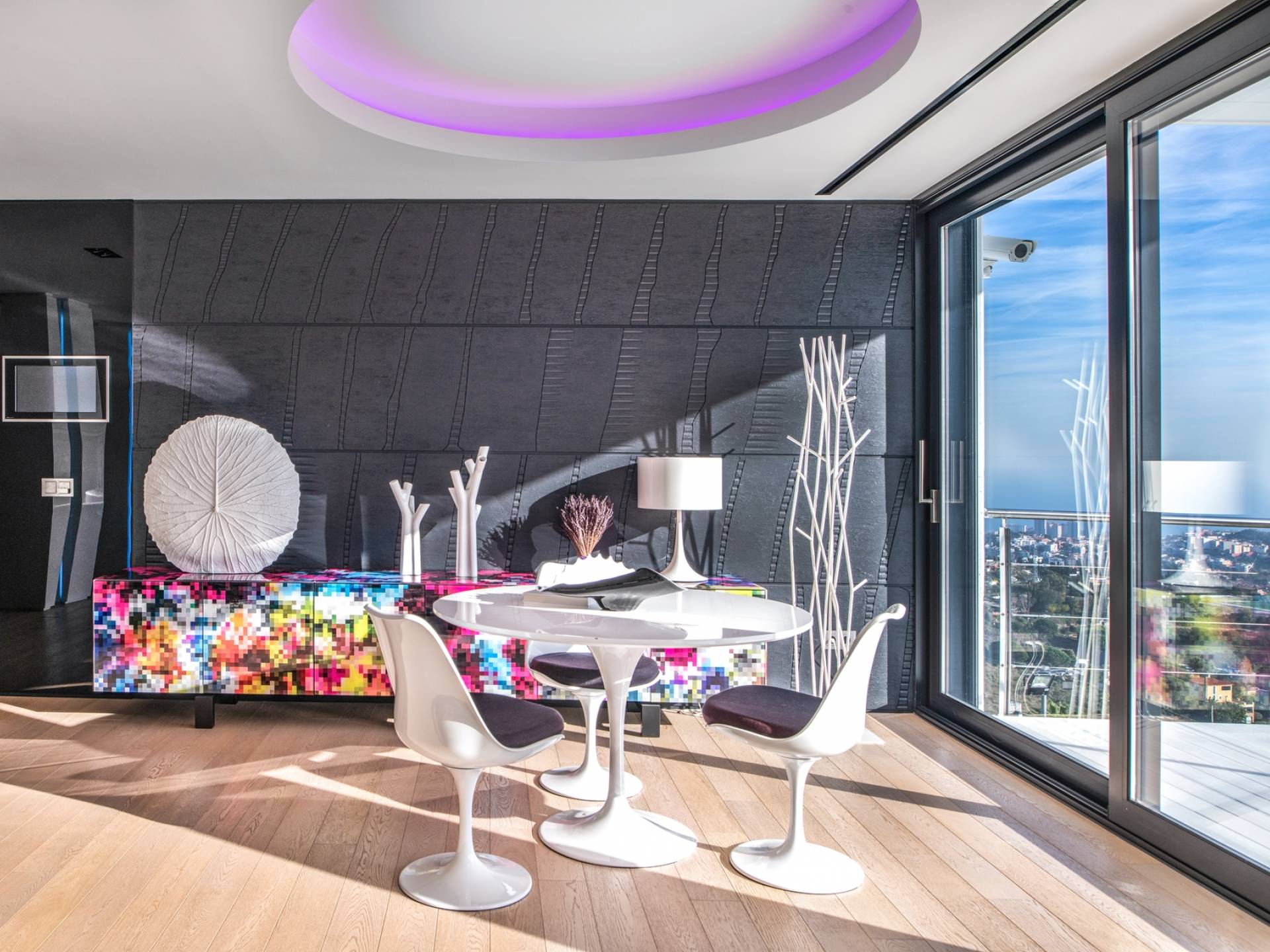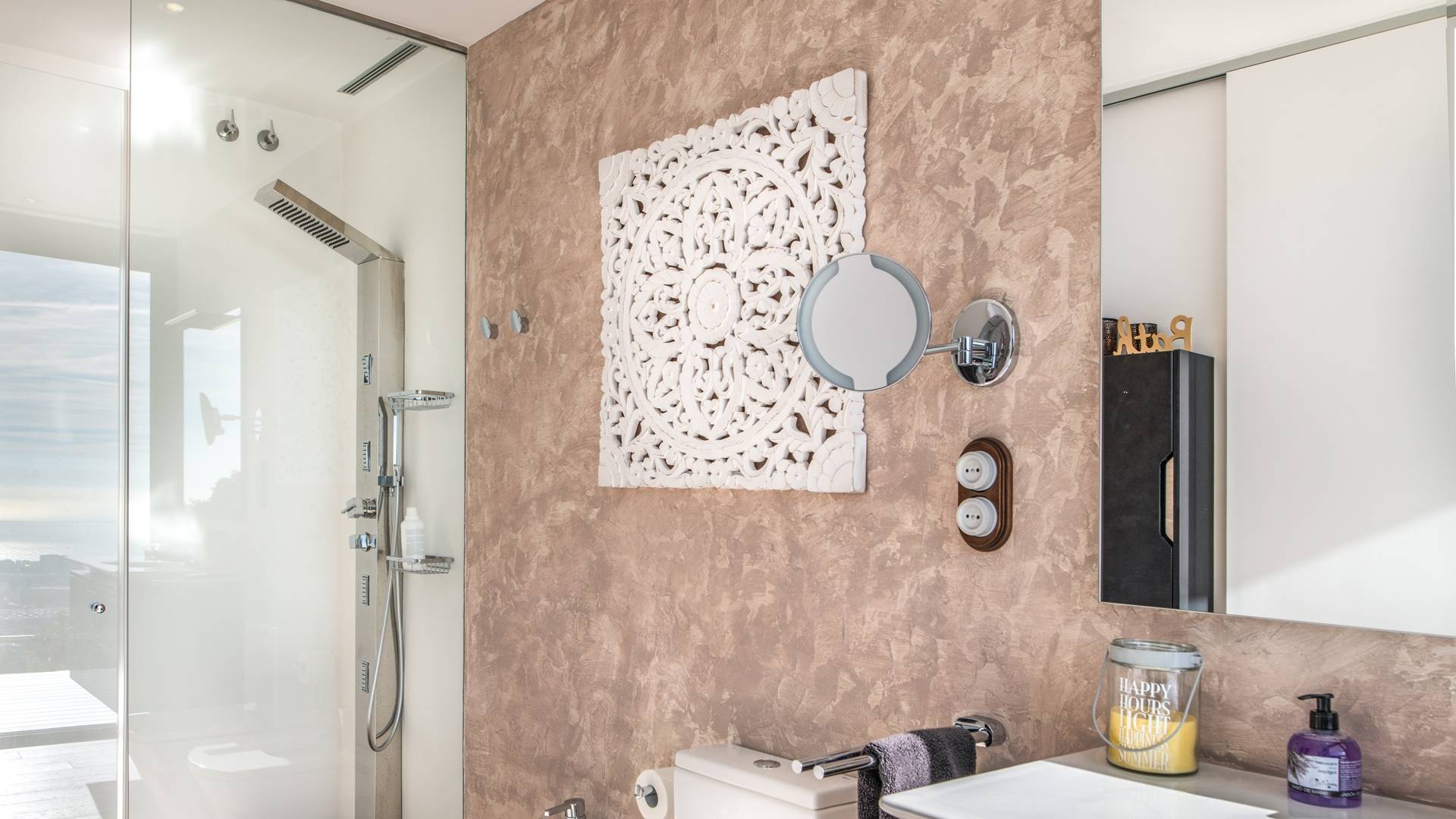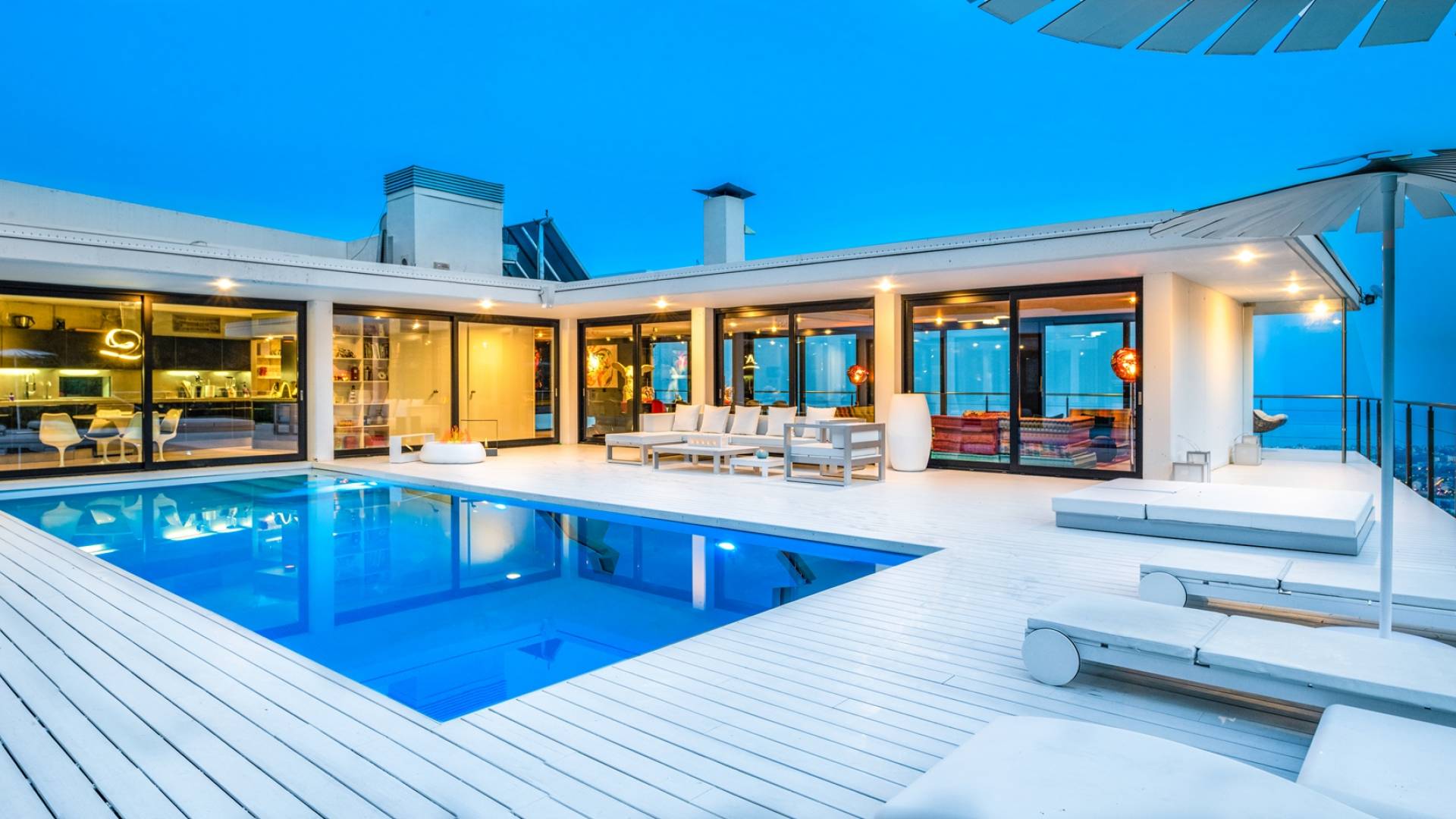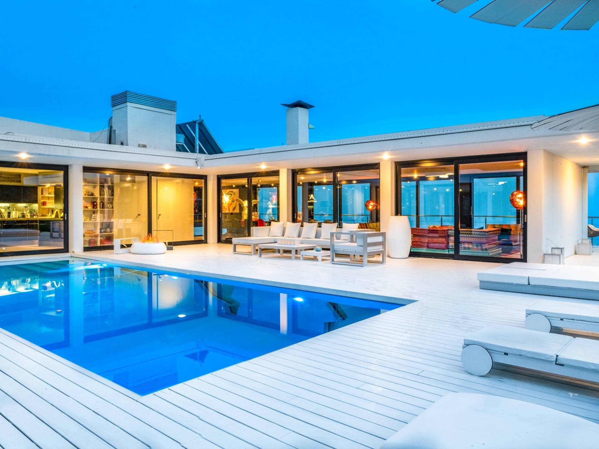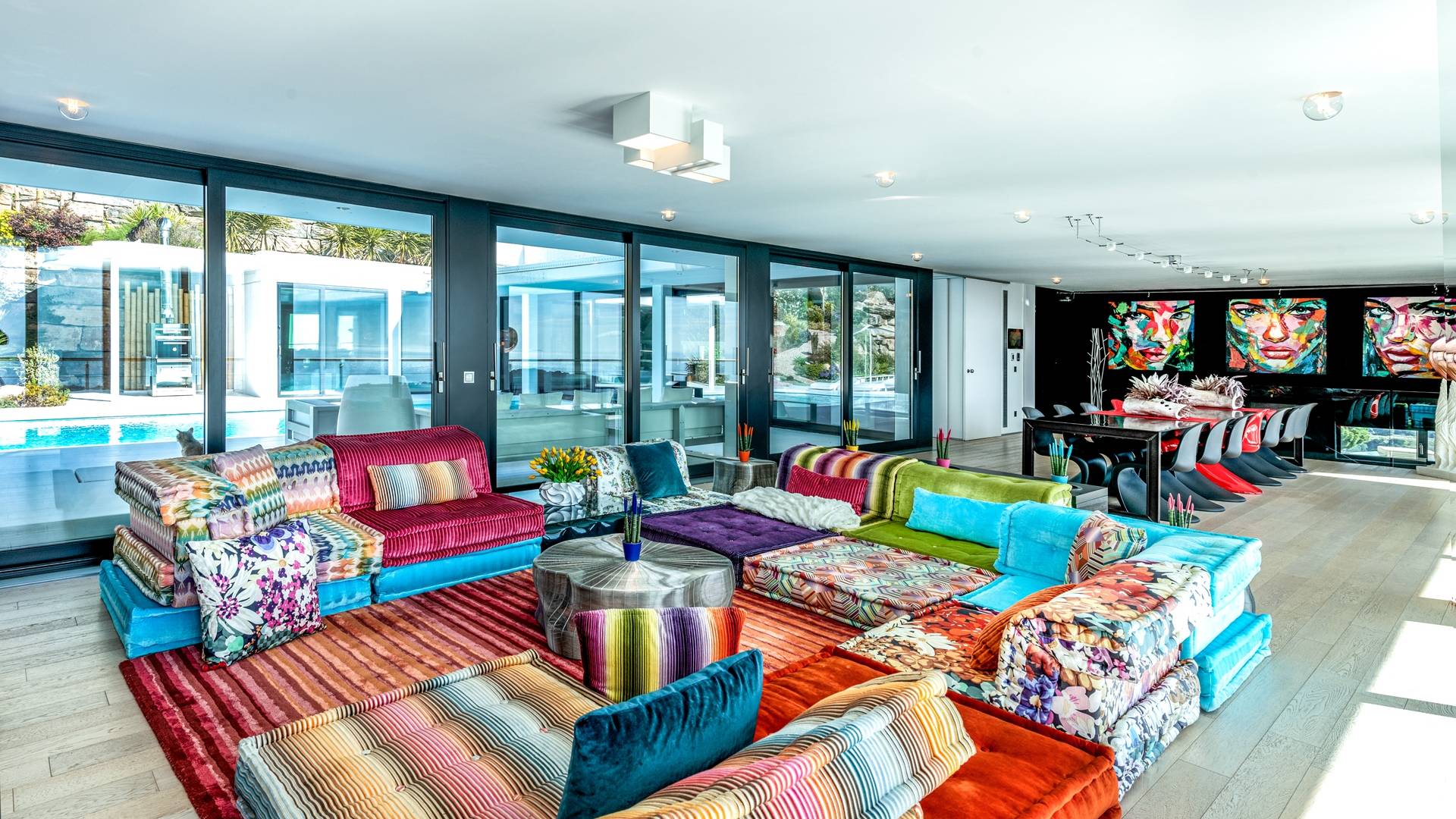 Στον 4ο όροφο, υπάρχει η υπέροχη κύρια κρεβατοκάμαρα με ένα πολύ μεγάλο king-size κρεβάτι (3x2 μέτρα), ένα γυάλινο τζάμι (τούρκικο λουτρό), ένα μεγάλο ντους ψιλής βροχής και ένα κρεβάτι μασάζ. Οι μεγάλες γυάλινες πόρτες επιτρέπουν μια πανοραμική θέα στη θάλασσα και μερικά άλλα παράθυρα που σας επιτρέπουν να δείτε το εσωτερικό της πισίνας. Στον 3ο όροφο, μπορείτε να βρείτε ένα υπερσύγχρονο γυμναστήριο, καθώς και έναν χώρο γραφείου με επιφάνεια εργασίας μήκους 5 μέτρων. Υπάρχουν επίσης 4 δωμάτια και 3 μπάνια. Στον 2ο έχετε ένα ανεξάρτητο υπνοδωμάτιο με το μπάνιο του. Το laundry room βρίσκεται στον 1ο όροφο. Ο 3ος και ο 4ος όροφος προστατεύονται με μέγιστα μέτρα ασφαλείας.