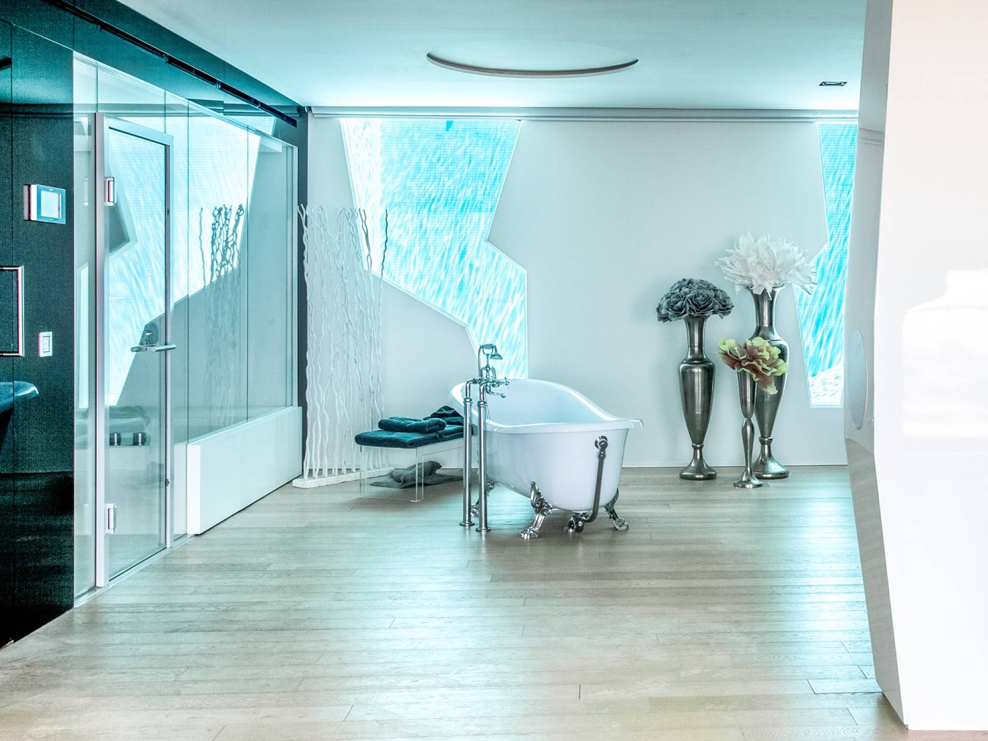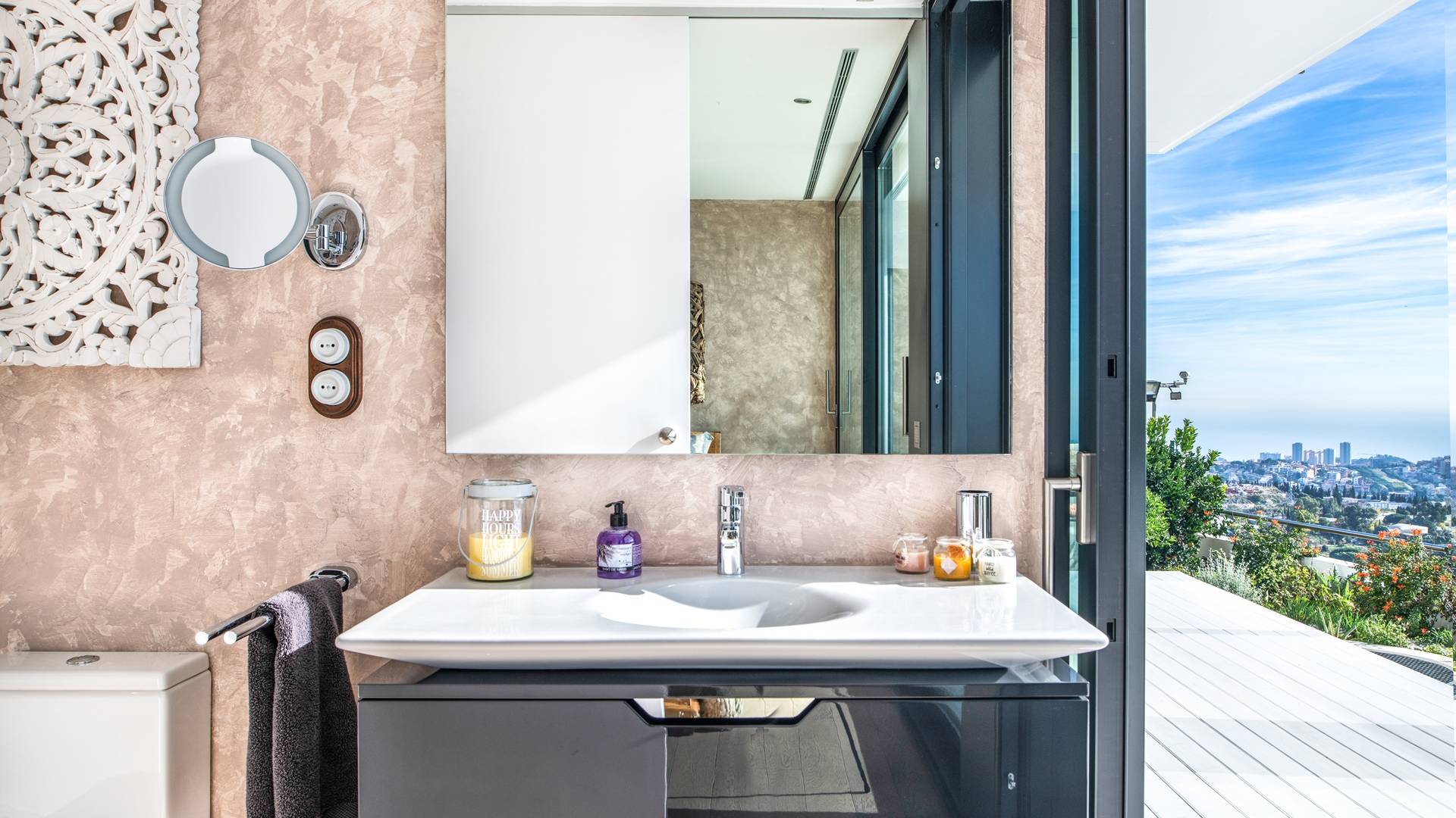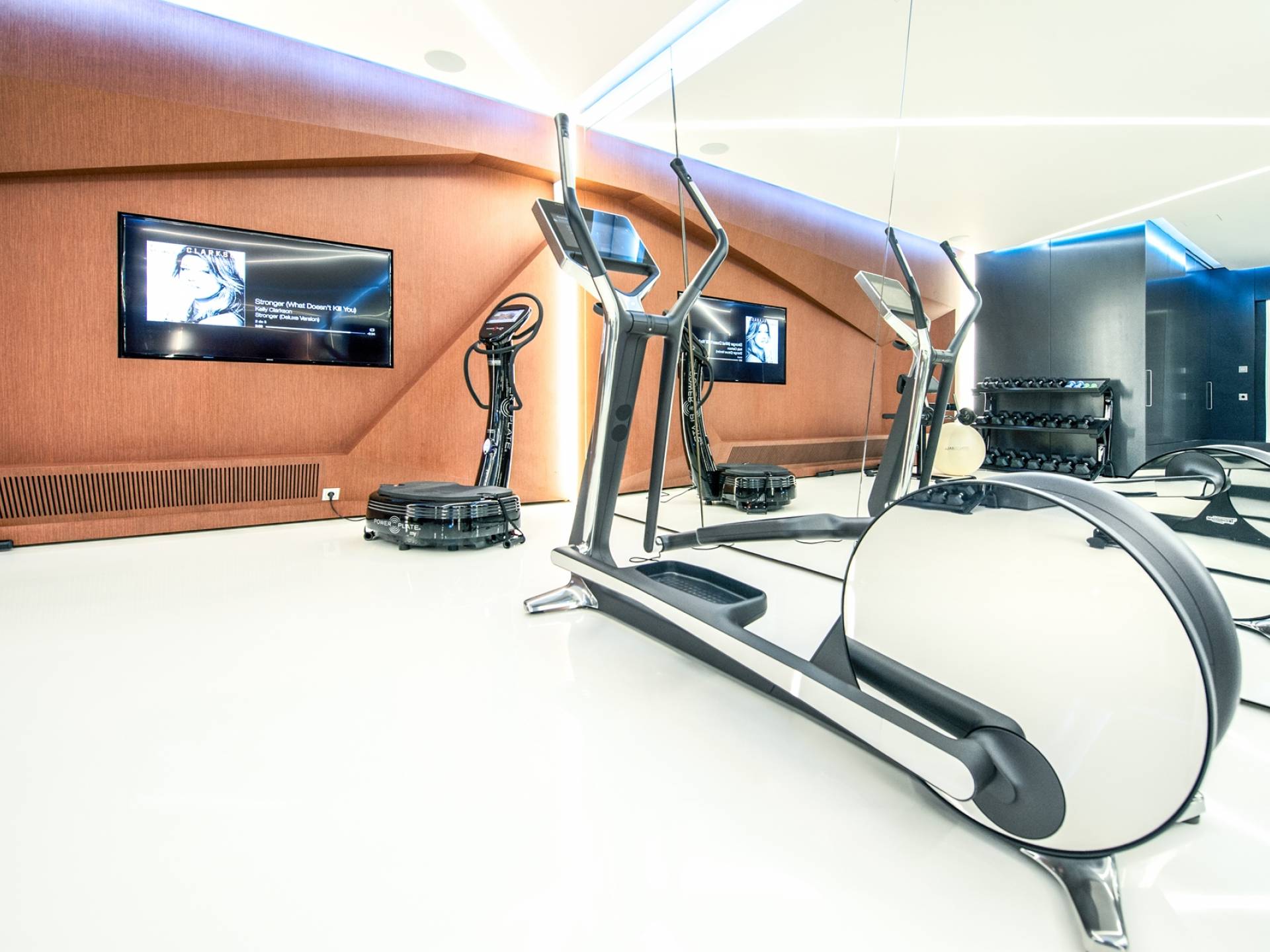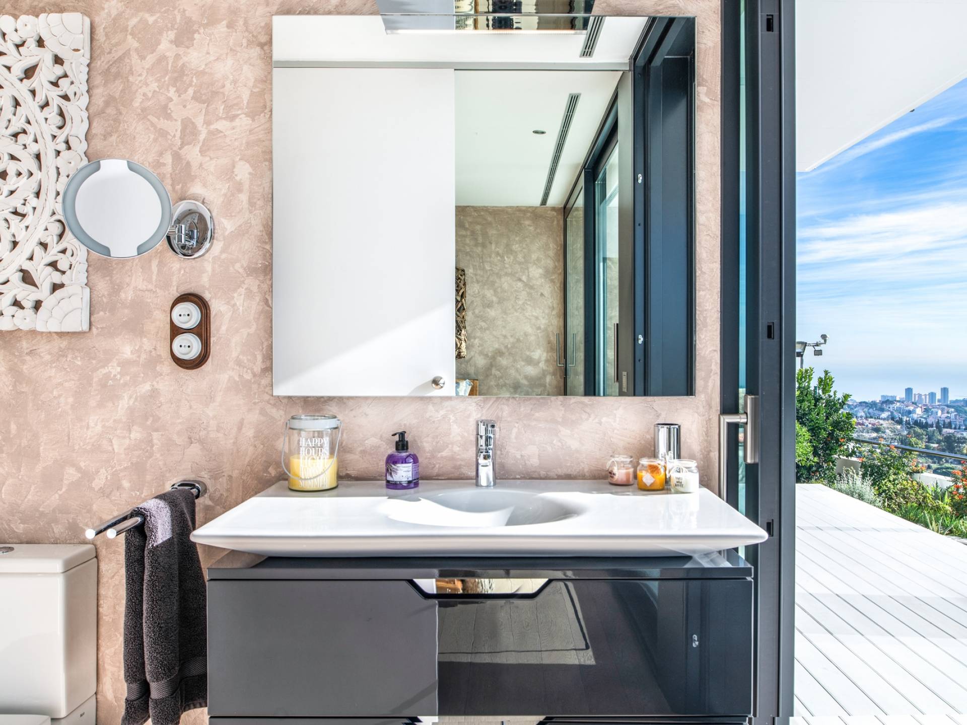 Στον 4ο όροφο, υπάρχει η υπέροχη κύρια κρεβατοκάμαρα με ένα πολύ μεγάλο king-size κρεβάτι (3x2 μέτρα), ένα γυάλινο τζάμι (τούρκικο λουτρό), ένα μεγάλο ντους ψιλής βροχής και ένα κρεβάτι μασάζ. Οι μεγάλες γυάλινες πόρτες επιτρέπουν μια πανοραμική θέα στη θάλασσα και μερικά άλλα παράθυρα που σας επιτρέπουν να δείτε το εσωτερικό της πισίνας. Στον 3ο όροφο, μπορείτε να βρείτε ένα υπερσύγχρονο γυμναστήριο, καθώς και έναν χώρο γραφείου με επιφάνεια εργασίας μήκους 5 μέτρων. Υπάρχουν επίσης 4 δωμάτια και 3 μπάνια. Στον 2ο έχετε ένα ανεξάρτητο υπνοδωμάτιο με το μπάνιο του. Το laundry room βρίσκεται στον 1ο όροφο. Ο 3ος και ο 4ος όροφος προστατεύονται με μέγιστα μέτρα ασφαλείας.