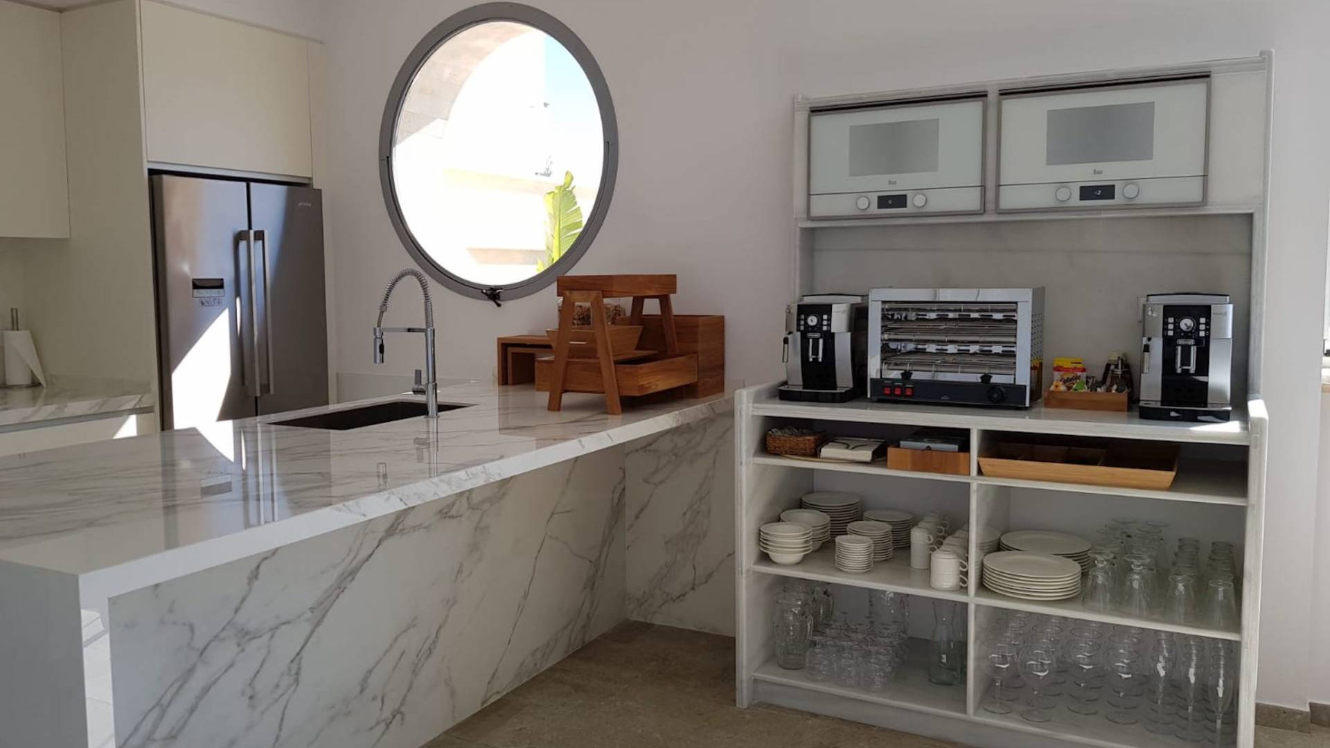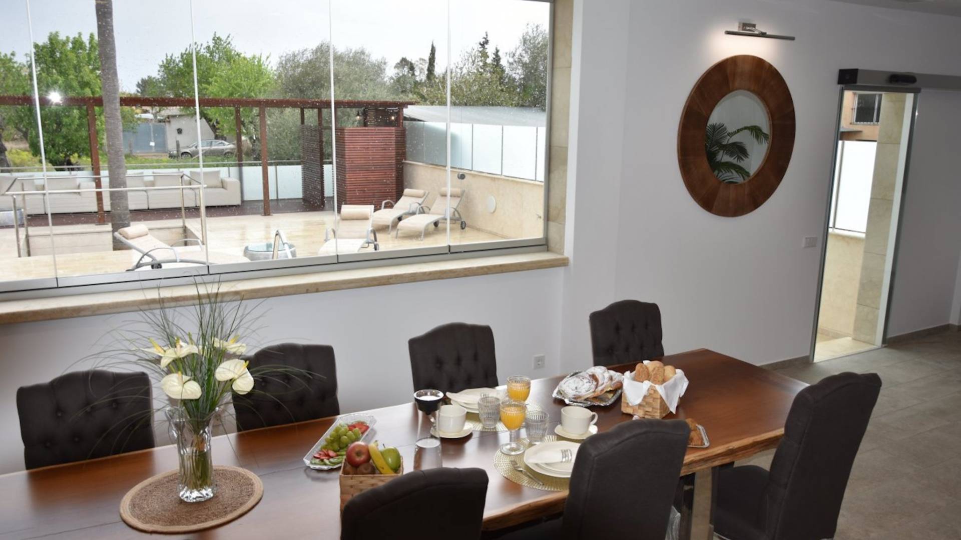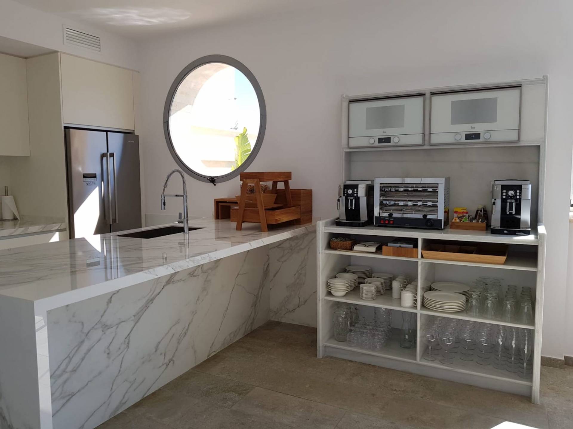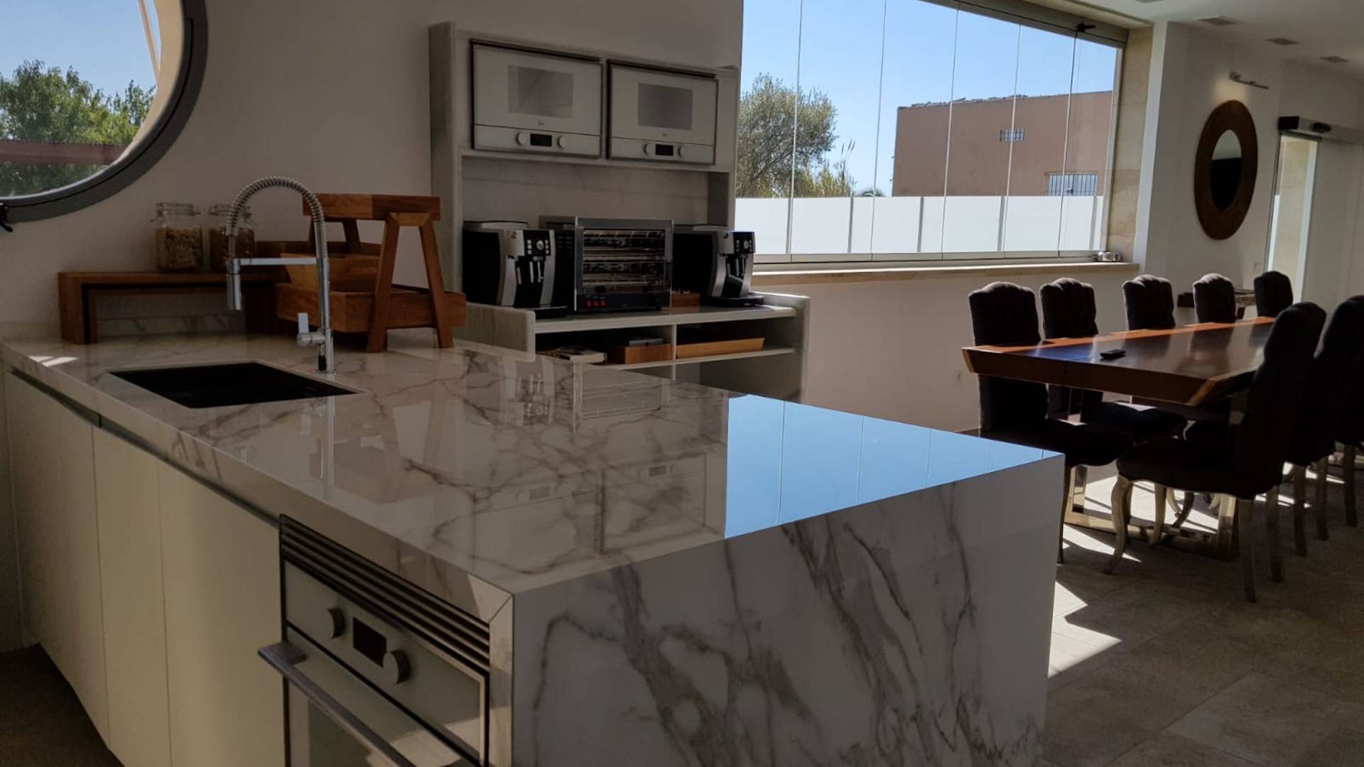 Στο ισόγειο, με θέα στην πισίνα και θέα στα βουνά Serra de Tramuntana, υπάρχει μια πλήρως εξοπλισμένη κουζίνα, ενιαίας διαρρύθμισης με τη μεγάλη τραπεζαρία με ένα τεράστιο ξύλινο τραπέζι που μπορεί να φιλοξενήσει έως 14 άτομα. Στο κάτω ισόγειο υπάρχει ένα φιλόξενο σαλόνι με σαλόνι όπου μπορείτε να χαλαρώσετε, να διαβάσετε, να παρακολουθήσετε τηλεόραση ή να απολαύσετε ένα ποτό στο μπαρ.