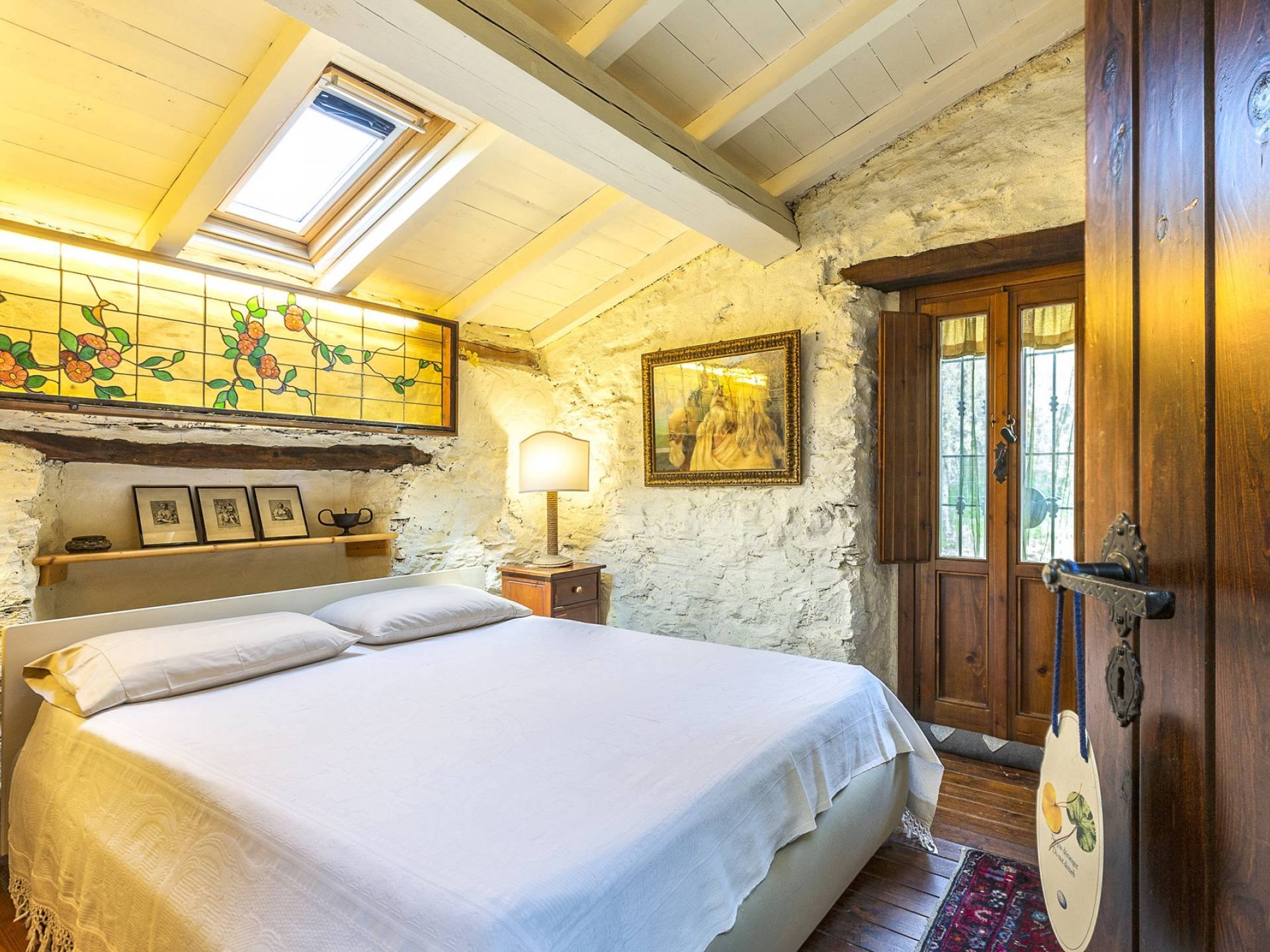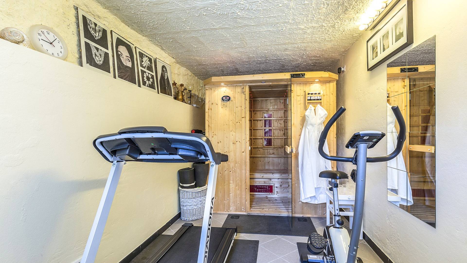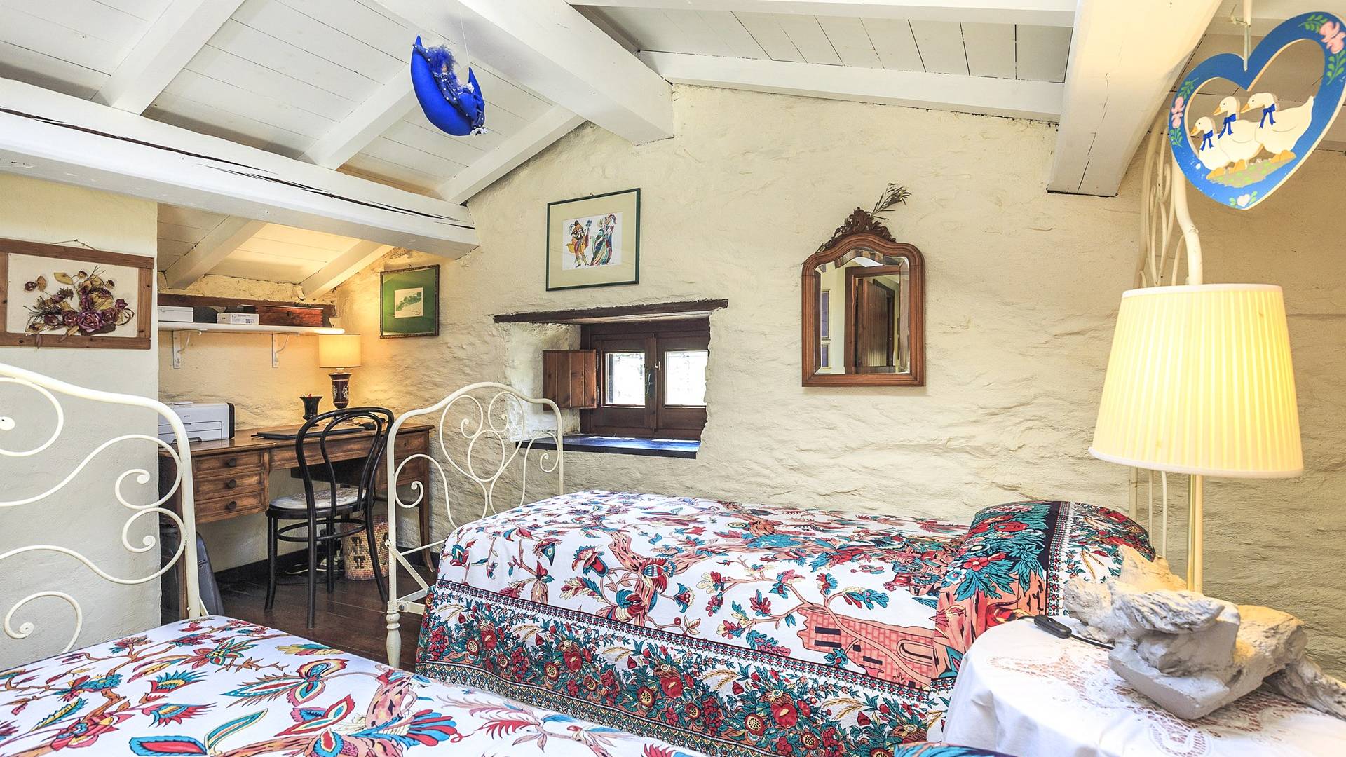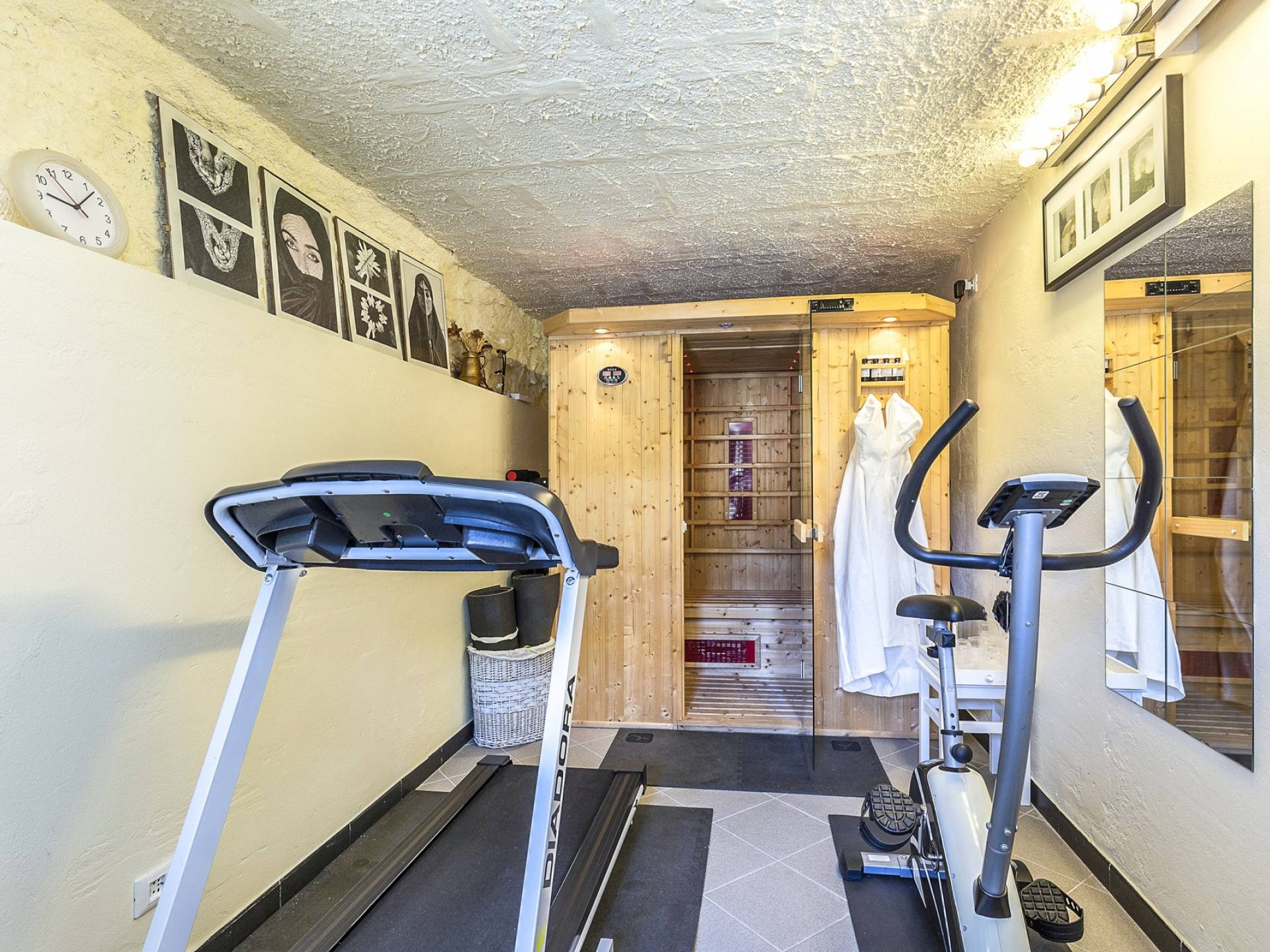 Στον κύριο όροφο υπάρχει μια ευρύχωρη και γοητευτική βεράντα με μεγάλο ξύλινο τραπέζι και καθιστικό, κουζίνα, σαλόνι με τηλεόραση, καναπέδες, ανοιχτό τζάκι, τραπεζαρία και μπάνιο με ντους. Στον πρώτο όροφο υπάρχει ένα υπνοδωμάτιο με διπλό κρεβάτι και τηλεόραση, ένα υπνοδωμάτιο με 2 μονά κρεβάτια και ένα μπάνιο με μπανιέρα. Αυτά τα 2 υπνοδωμάτια διαθέτουν κλιματισμό. Η πρόσβαση από το χώρο της πισίνας (δεν υπάρχει εσωτερική σύνδεση από το σπίτι) είναι ένα δωμάτιο ευεξίας με σάουνα και εξοπλισμό γυμναστηρίου. Περαιτέρω σε αυτόν τον όροφο υπάρχει επίσης ένα υπνοδωμάτιο με διπλό κρεβάτι, ένα μπάνιο με ντους, ένα μεγάλο υπνοδωμάτιο με διπλό κρεβάτι (δείτε τις σημειώσεις ενοικίασης παρακάτω), ένα τραπέζι και τηλεόραση.