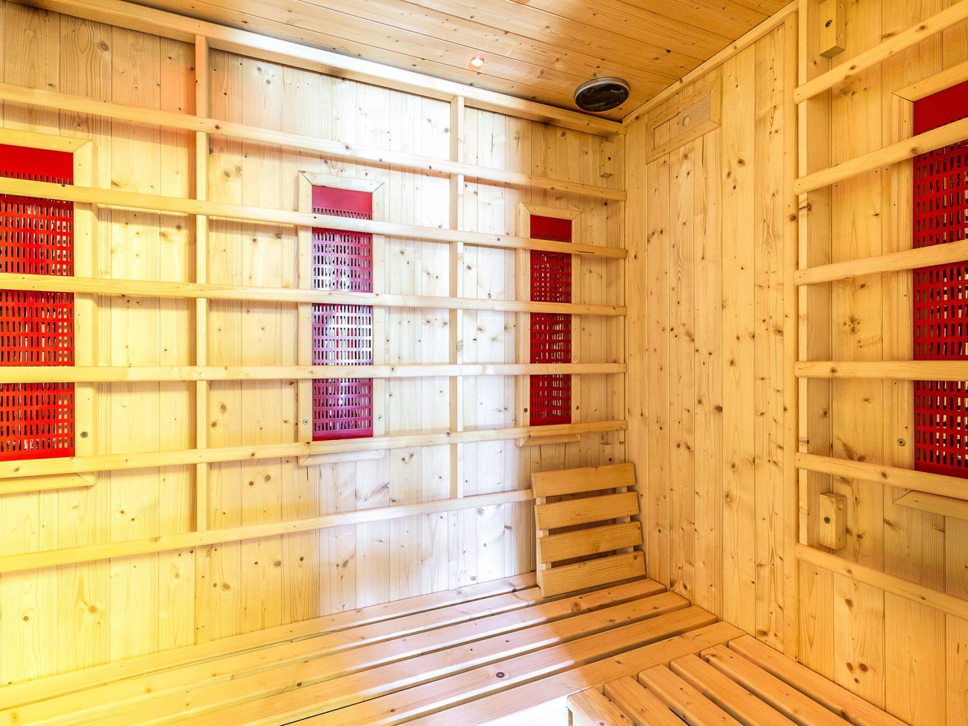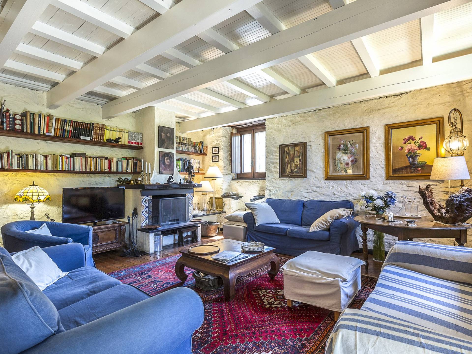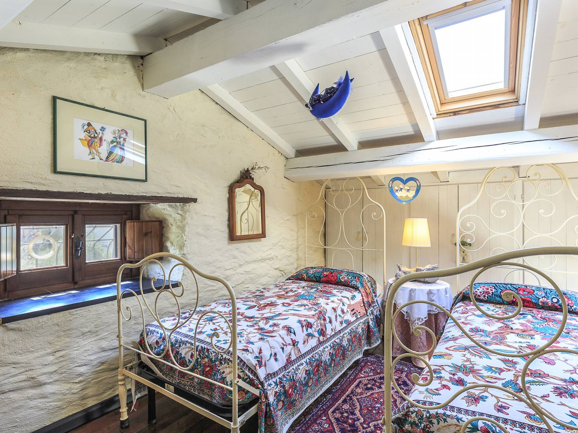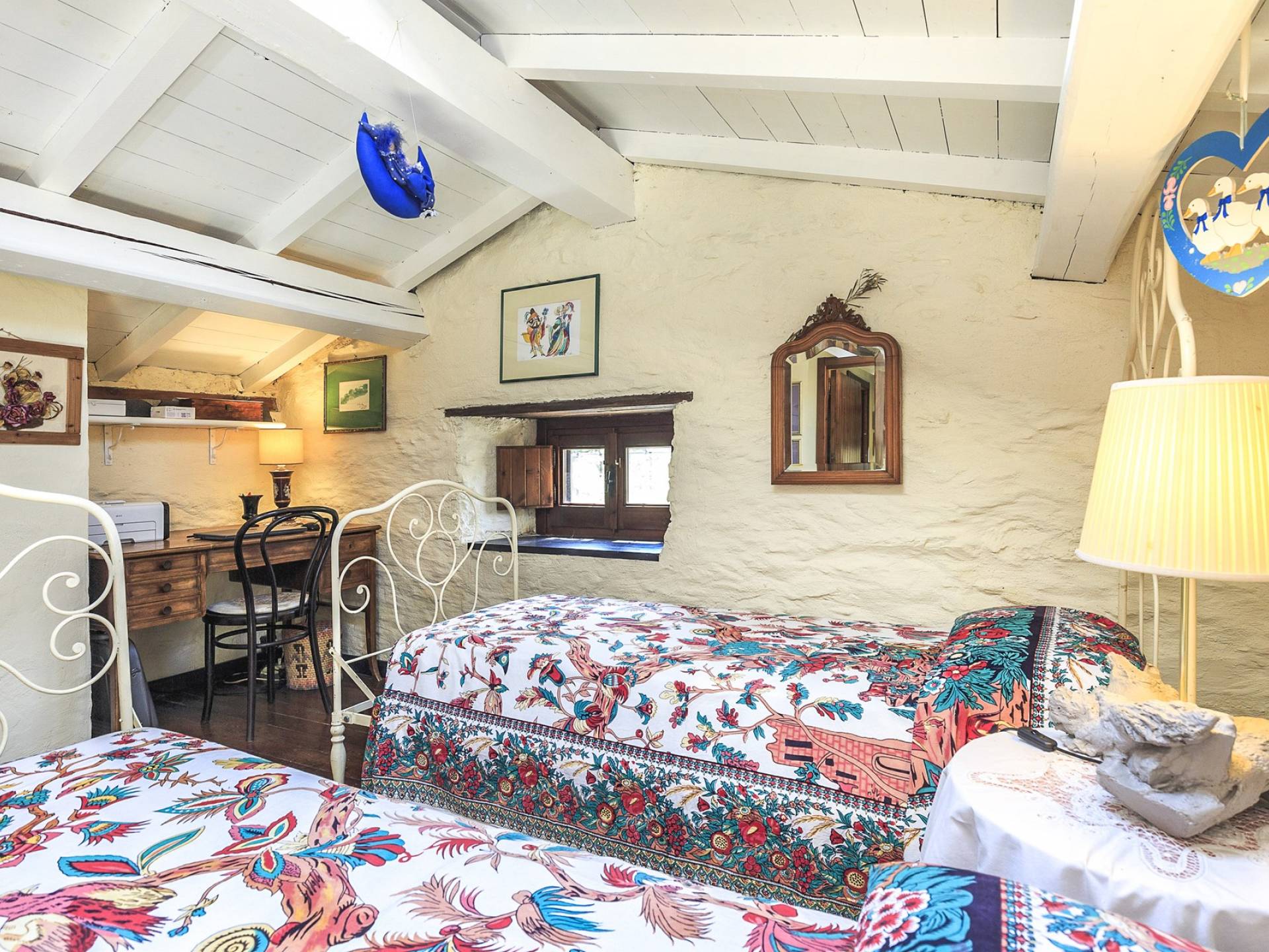 Στον κύριο όροφο υπάρχει μια ευρύχωρη και γοητευτική βεράντα με μεγάλο ξύλινο τραπέζι και καθιστικό, κουζίνα, σαλόνι με τηλεόραση, καναπέδες, ανοιχτό τζάκι, τραπεζαρία και μπάνιο με ντους. Στον πρώτο όροφο υπάρχει ένα υπνοδωμάτιο με διπλό κρεβάτι και τηλεόραση, ένα υπνοδωμάτιο με 2 μονά κρεβάτια και ένα μπάνιο με μπανιέρα. Αυτά τα 2 υπνοδωμάτια διαθέτουν κλιματισμό. Η πρόσβαση από το χώρο της πισίνας (δεν υπάρχει εσωτερική σύνδεση από το σπίτι) είναι ένα δωμάτιο ευεξίας με σάουνα και εξοπλισμό γυμναστηρίου. Περαιτέρω σε αυτόν τον όροφο υπάρχει επίσης ένα υπνοδωμάτιο με διπλό κρεβάτι, ένα μπάνιο με ντους, ένα μεγάλο υπνοδωμάτιο με διπλό κρεβάτι (δείτε τις σημειώσεις ενοικίασης παρακάτω), ένα τραπέζι και τηλεόραση.