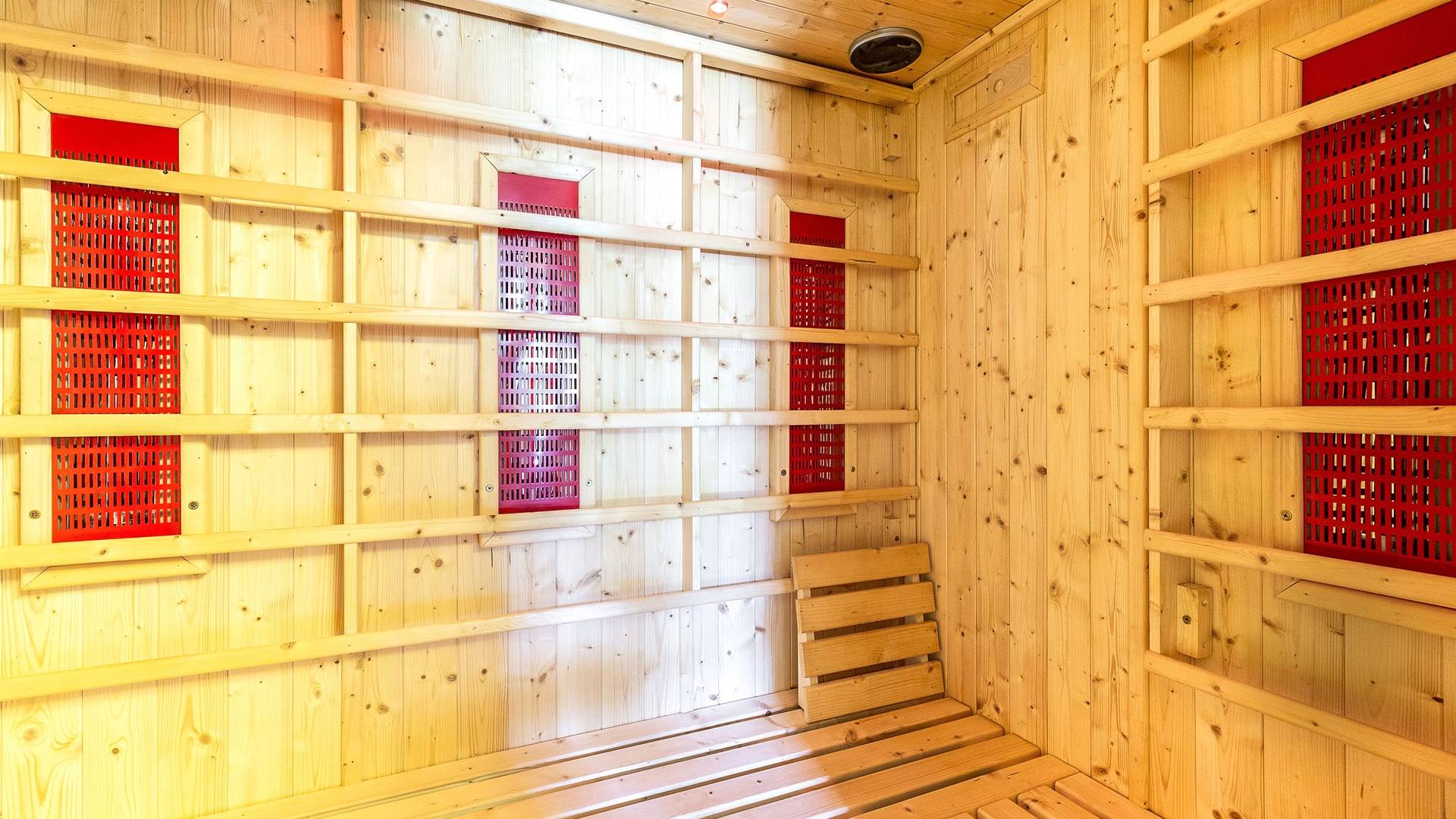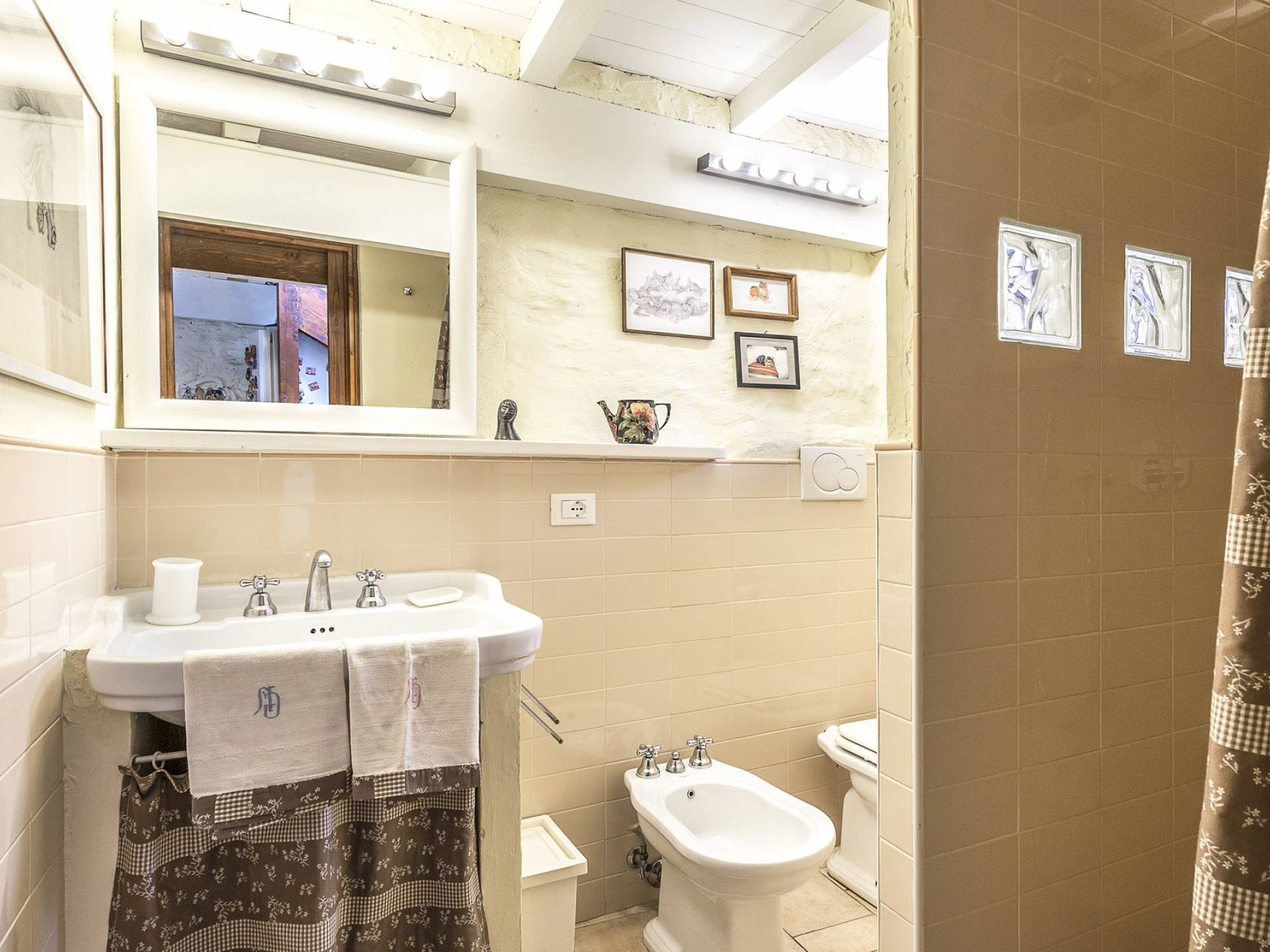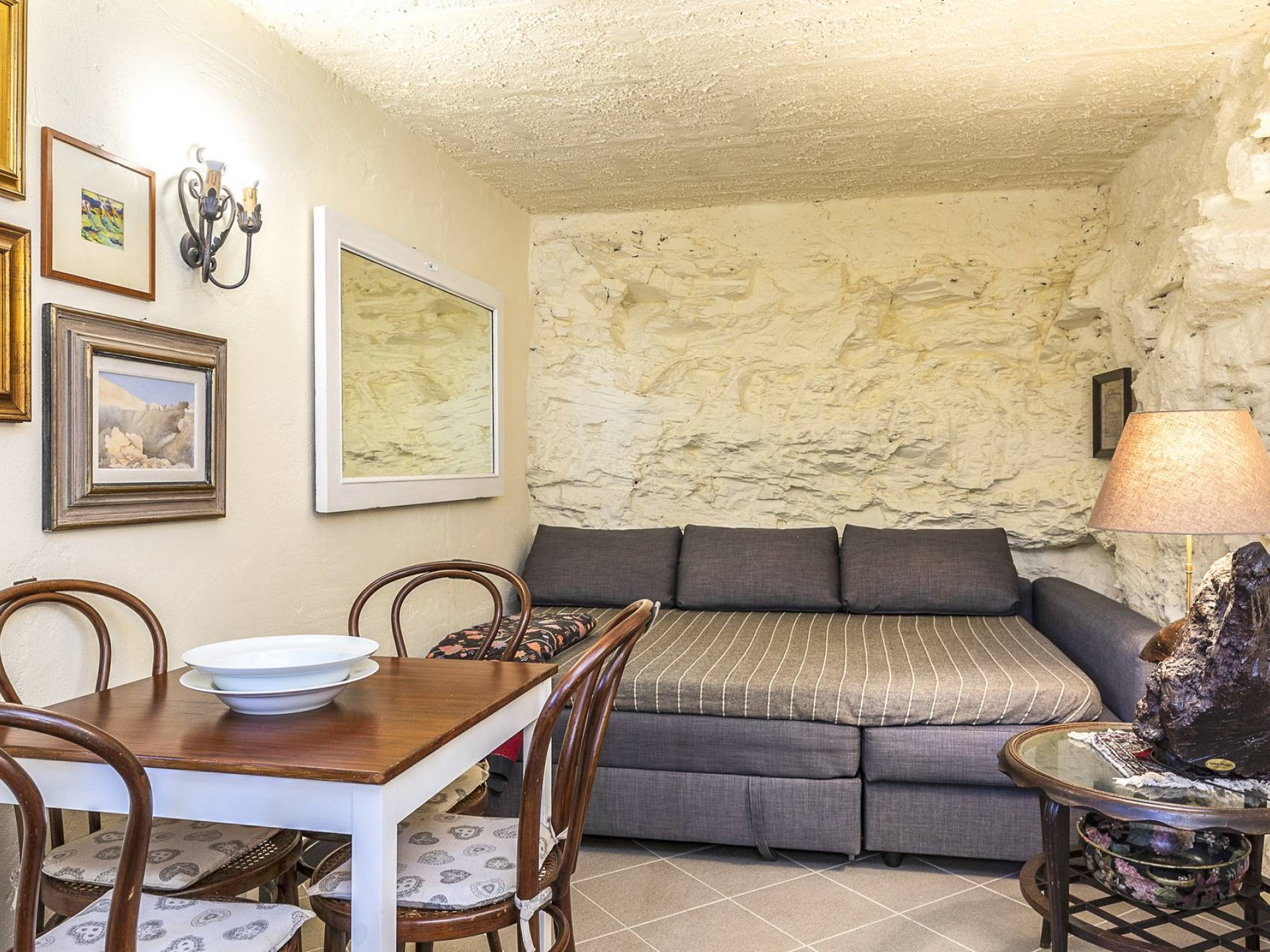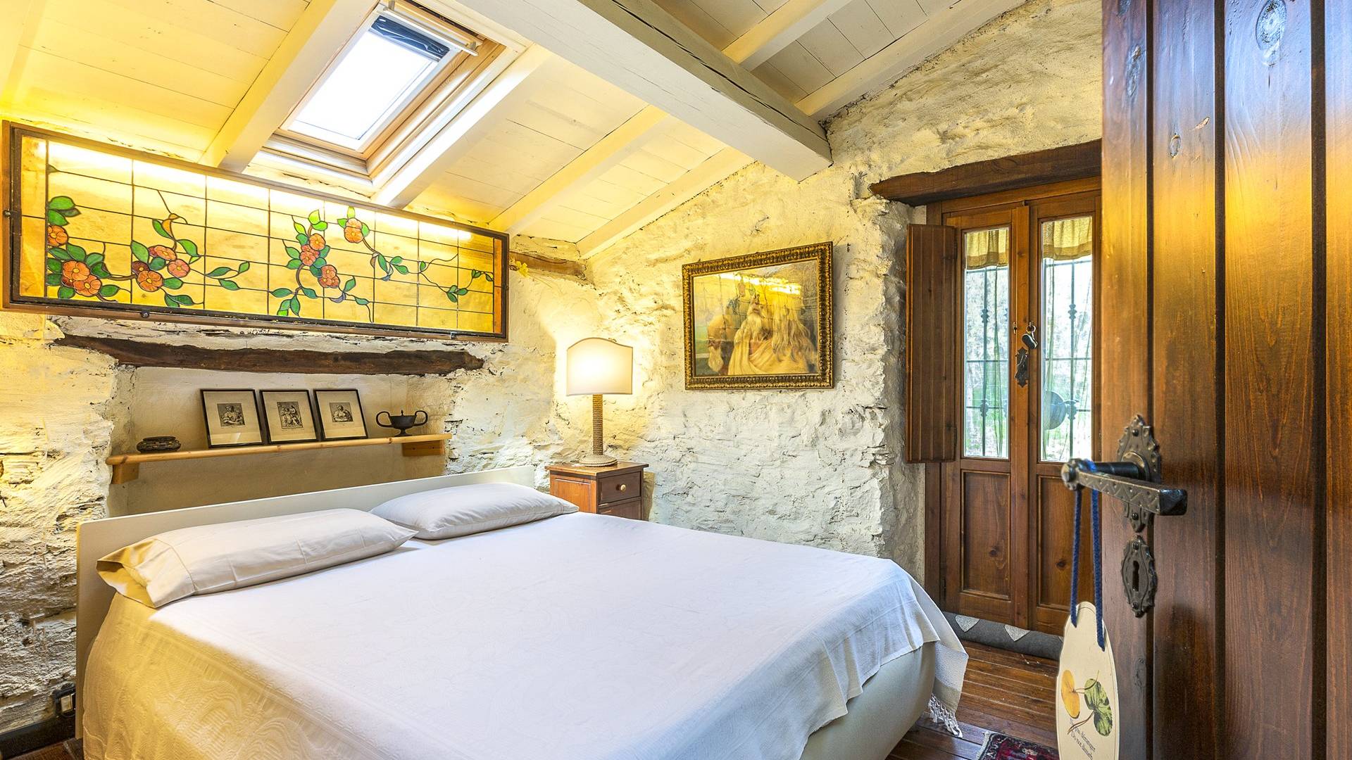 Στον κύριο όροφο υπάρχει μια ευρύχωρη και γοητευτική βεράντα με μεγάλο ξύλινο τραπέζι και καθιστικό, κουζίνα, σαλόνι με τηλεόραση, καναπέδες, ανοιχτό τζάκι, τραπεζαρία και μπάνιο με ντους. Στον πρώτο όροφο υπάρχει ένα υπνοδωμάτιο με διπλό κρεβάτι και τηλεόραση, ένα υπνοδωμάτιο με 2 μονά κρεβάτια και ένα μπάνιο με μπανιέρα. Αυτά τα 2 υπνοδωμάτια διαθέτουν κλιματισμό. Η πρόσβαση από το χώρο της πισίνας (δεν υπάρχει εσωτερική σύνδεση από το σπίτι) είναι ένα δωμάτιο ευεξίας με σάουνα και εξοπλισμό γυμναστηρίου. Περαιτέρω σε αυτόν τον όροφο υπάρχει επίσης ένα υπνοδωμάτιο με διπλό κρεβάτι, ένα μπάνιο με ντους, ένα μεγάλο υπνοδωμάτιο με διπλό κρεβάτι (δείτε τις σημειώσεις ενοικίασης παρακάτω), ένα τραπέζι και τηλεόραση.