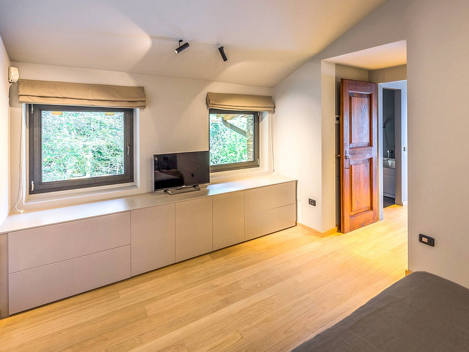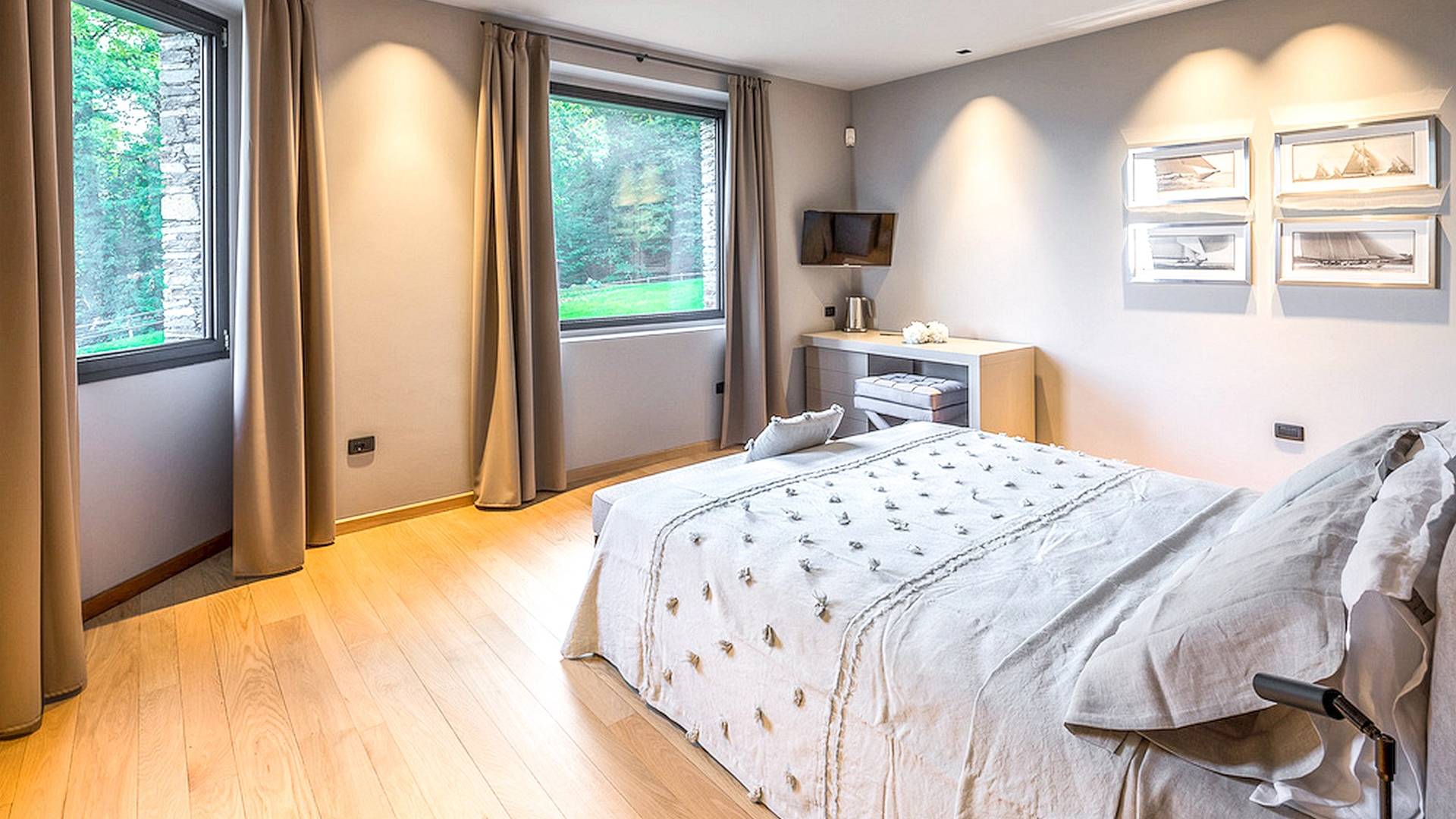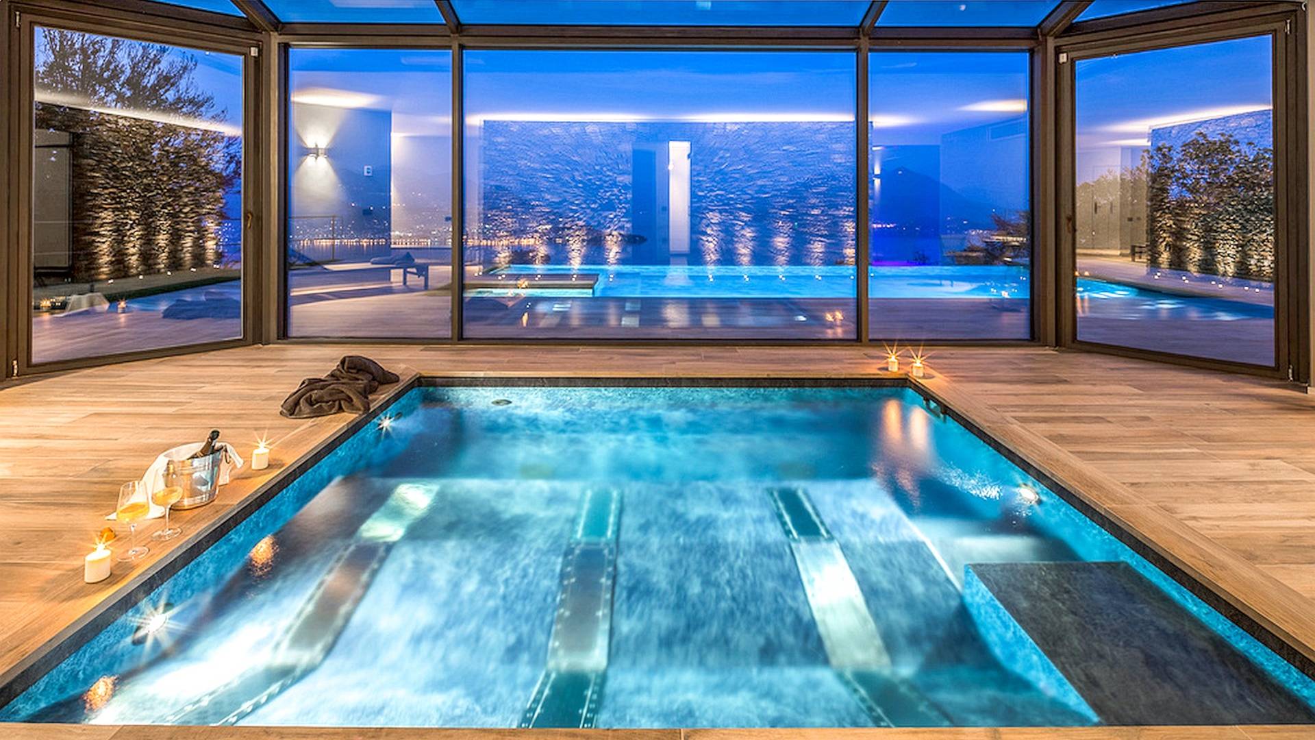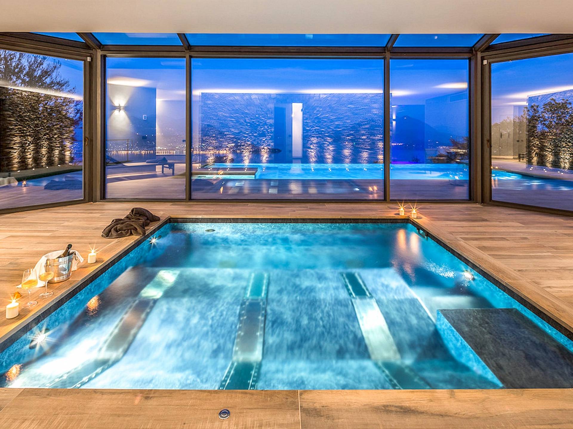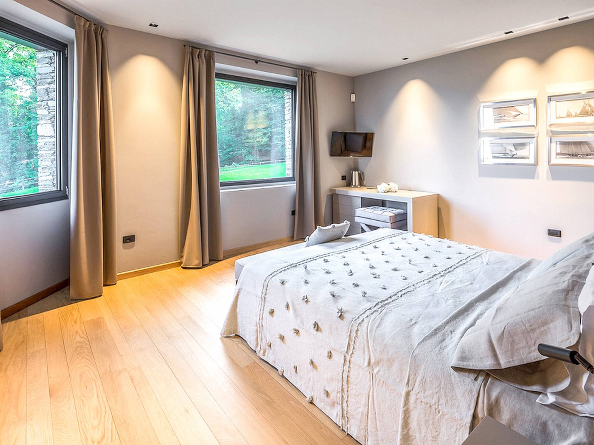 Η κλιματιζόμενη βίλα (500 m²) φιλοξενεί άνετα 8 άτομα σε 4 υπνοδωμάτια. Το ισόγειο αποτελείται από ένα ευρύχωρο σαλόνι με παράθυρα από το δάπεδο μέχρι την οροφή για να απολαύσετε την απίστευτη θέα στη λίμνη, μια τραπεζαρία, μια γωνιά καθιστικού με άνετους καναπέδες και τηλεόραση και ένα τζάκι. Η κουζίνα, εξοπλισμένη με υψηλής ποιότητας συσκευές, παρέχει πρόσβαση στο εξωτερικό τραπέζι και στον κήπο. Τουαλέτα. Στο χώρο ύπνου, θα βρείτε ένα μεγάλο υπνοδωμάτιο με ένα διπλό κρεβάτι και ιδιωτικό μπάνιο με μπανιέρα, και ένα δεύτερο υπνοδωμάτιο με ένα διπλό κρεβάτι και ιδιωτικό μπάνιο με ντους. Μέσω της αριστοκρατικής σπειροειδούς σκάλας, θα φτάσετε στον πρώτο όροφο με ένα άνετο καθιστικό με καναπέδες (μπορεί να μετατραπεί σε δύο μονά κρεβάτια), τηλεόραση και γραφείο. Ο χώρος ύπνου σε αυτόν τον όροφο αποτελείται από ένα υπνοδωμάτιο με διπλό κρεβάτι, ένα υπνοδωμάτιο με δύο μονά κρεβάτια και ένα μπάνιο με μπανιέρα με τζακούζι και ντους. Στον κάτω όροφο, θα βρείτε τον ιδιωτικό χώρο σπα με μίνι πισίνα με μασάζ αέρα, ένα συναισθηματικό ντους και έναν χώρο χαλάρωσης με μια επιλογή από τσάι από βότανα. Πρόσβαση στην εξωτερική πισίνα.