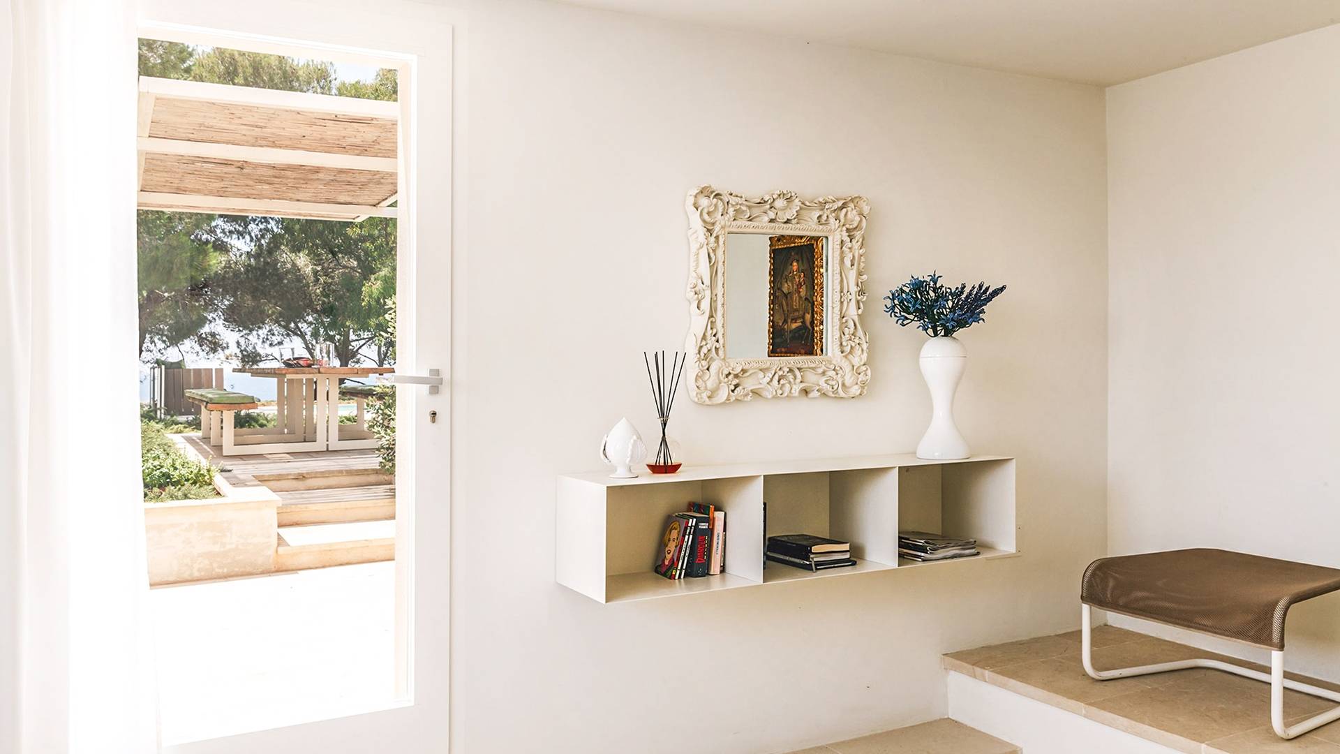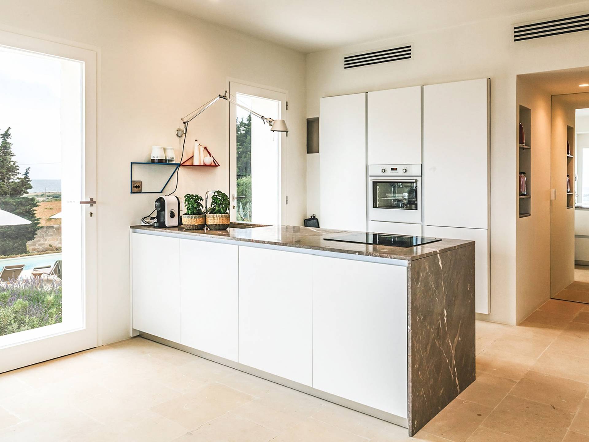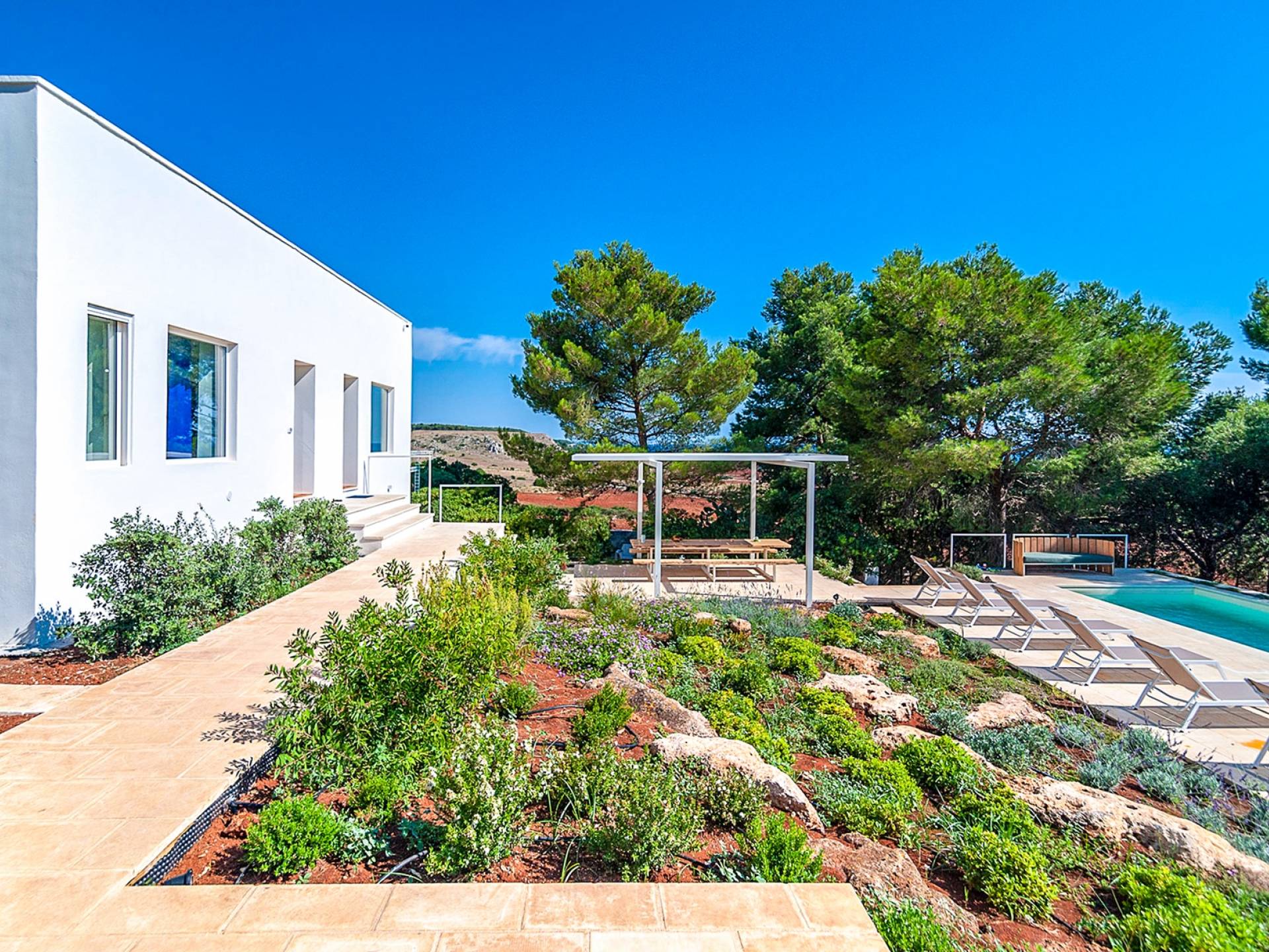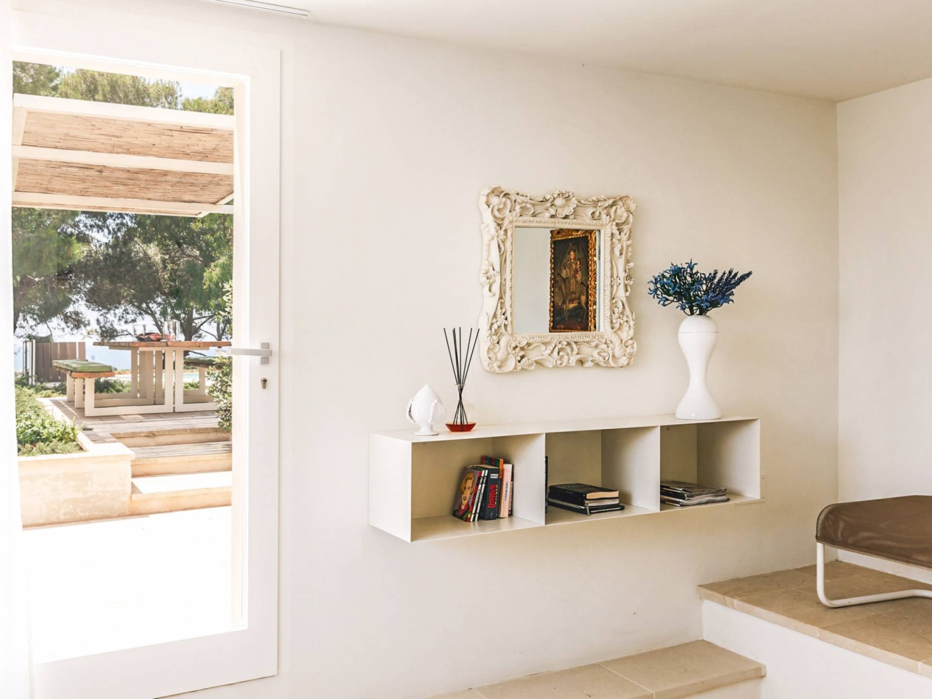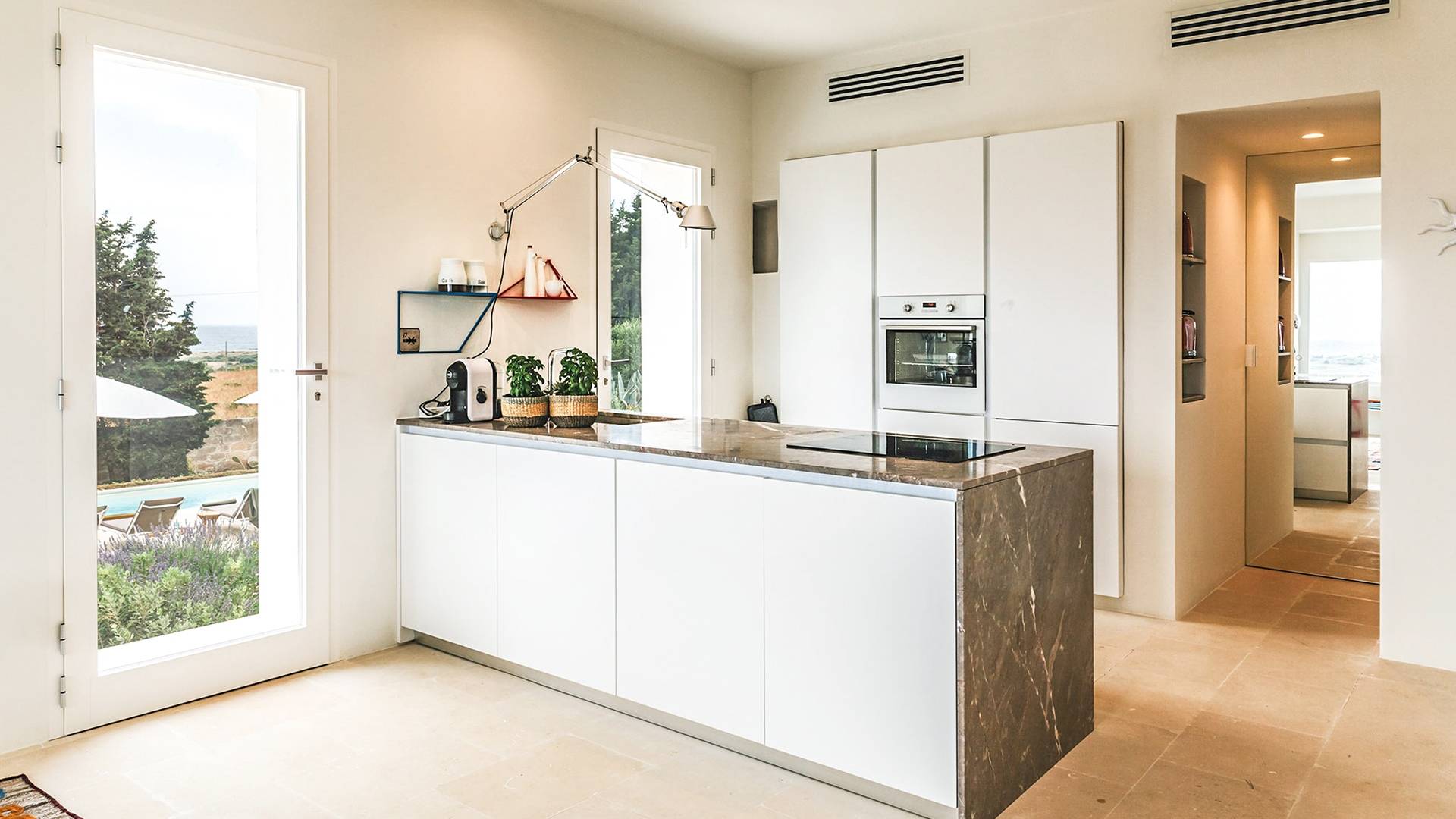 Οι λευκοί τοίχοι του σπιτιού και η χρήση μαρμάρου σχεδόν παντού, θα δώσουν μια μοναδική γαλήνη στις μέρες σας. Η δομή μπορεί να φιλοξενήσει έως και έξι επισκέπτες στα τρία υπνοδωμάτια, αλλά στους εξωτερικούς χώρους οι διακοπές σας θα εμπλουτιστούν με ευχάριστες εκπλήξεις. Εκτός από τον υπέροχο ιδιωτικό κήπο, στην πραγματικότητα, θα έχετε μια πισίνα 14 μέτρων σε απόσταση αναπνοής από τη θάλασσα. Επίσης έξω υπάρχουν χώροι για ηλιοθεραπεία, σκιεροί χώροι χαλάρωσης, καθώς και μια μεγάλη τραπεζαρία για 14 άτομα εξοπλισμένη με τραπέζια, καρέκλες, καναπέδες και μπάρμπεκιου.