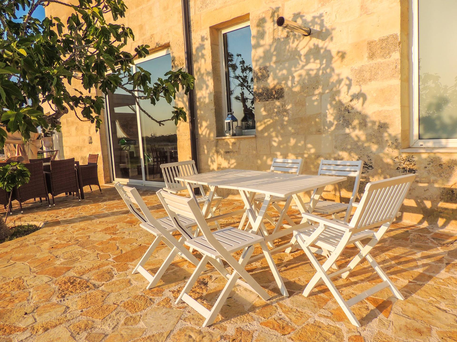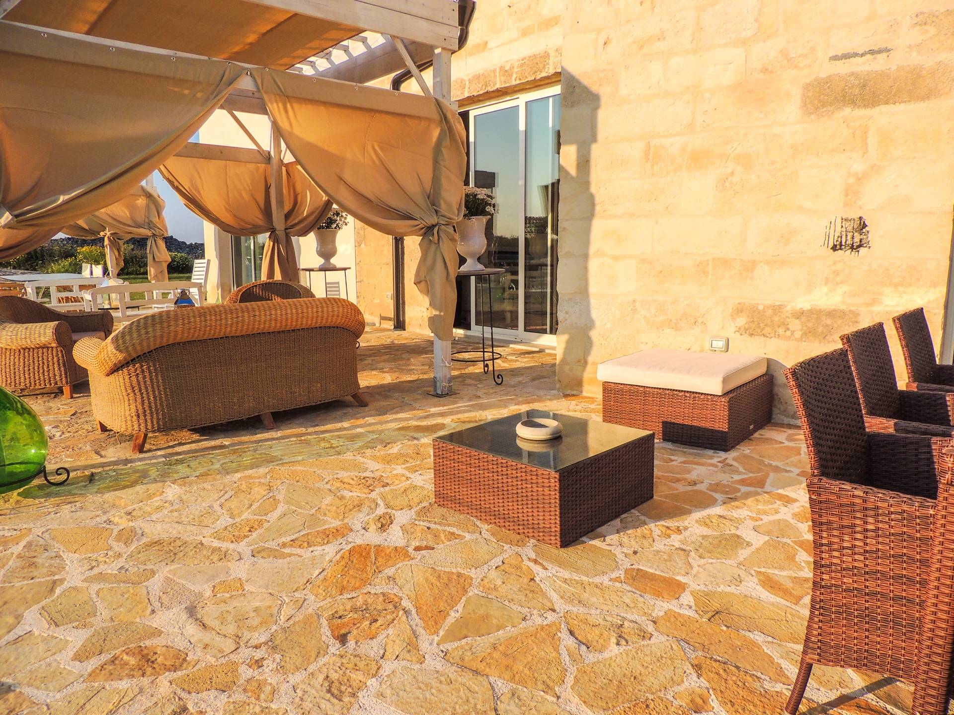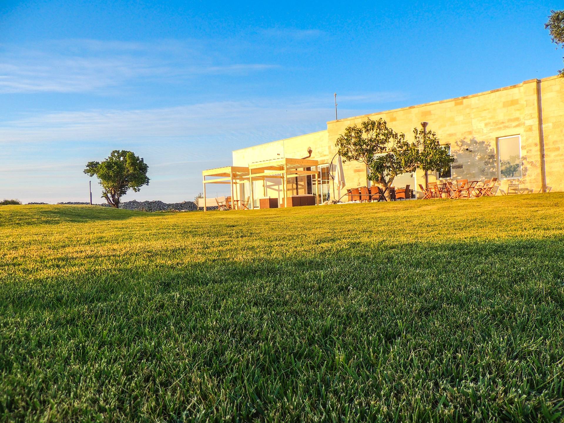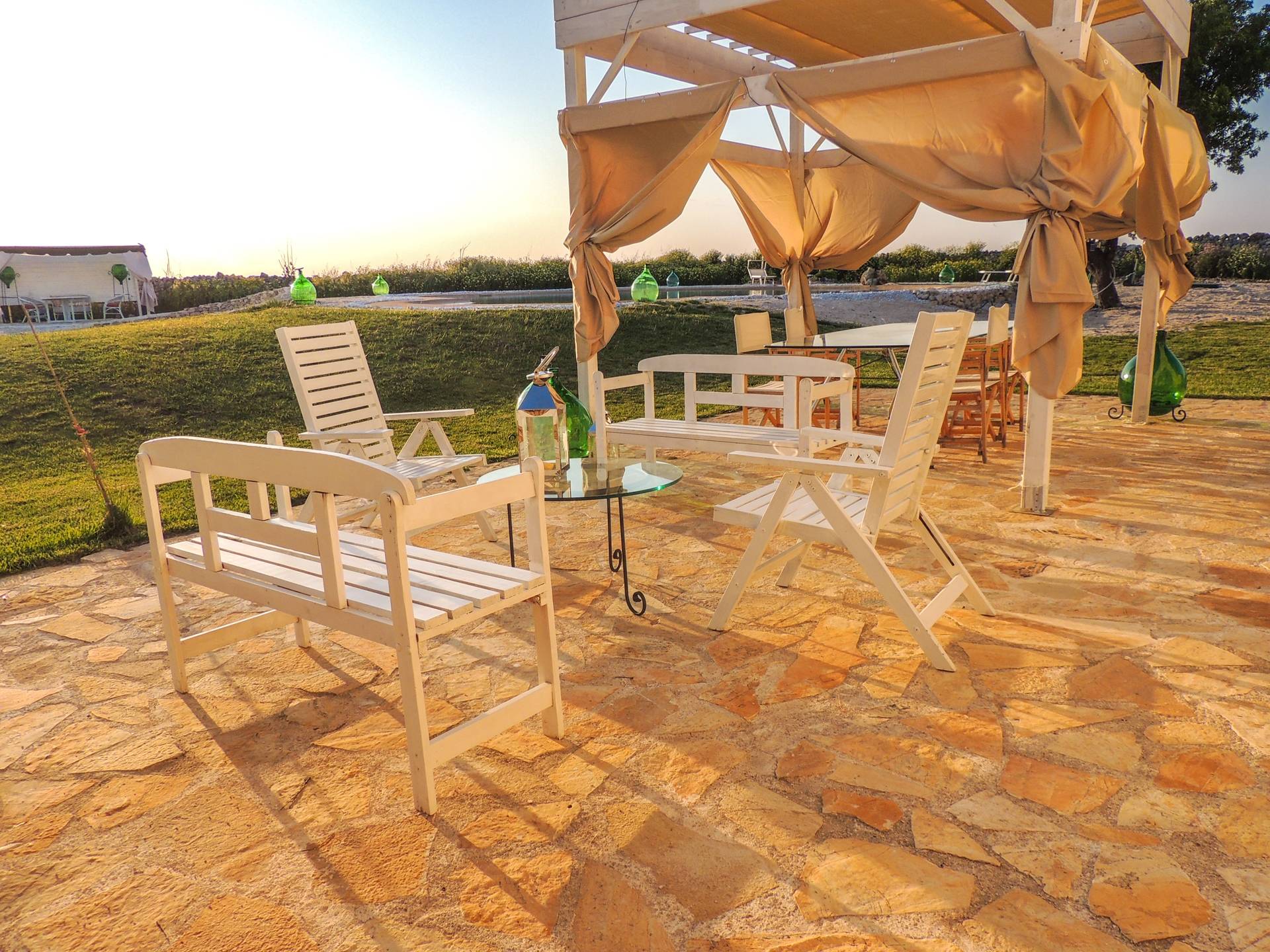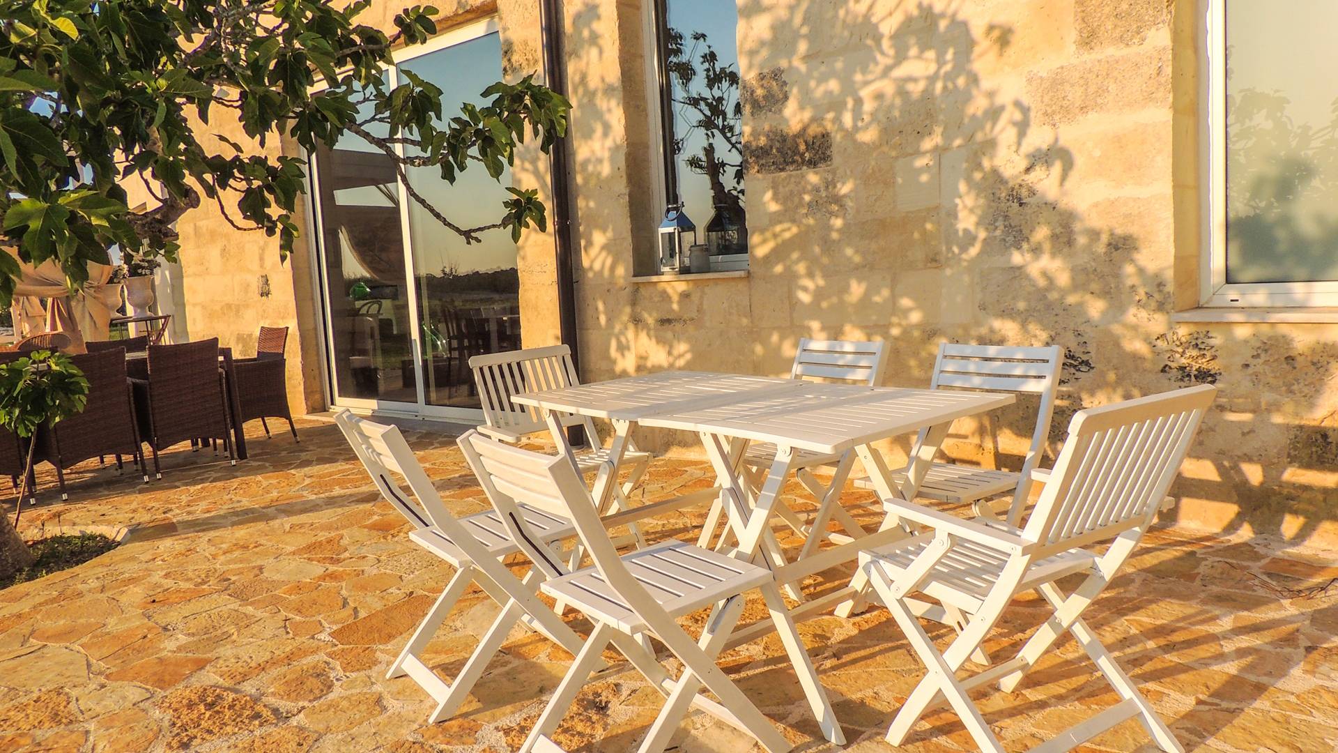 Ακόμη και οι εξωτερικοί χώροι της Villa Emma, μιας όασης γαλήνης και ομορφιάς, πρέπει να βιωθούν. Η Maseria περιφραγμένη από ξερολιθιές και ανοίγει σε μια εξοχή που θα κάνει την ιδιωτικότητά σας μοναδική και θα σας μαγέψει. Η πιρόγα ενός μικρού λόφου, η μεγάλη εξωτερική πισίνα θα μοιάζει με θαύμα στα μάτια σας, όπου μπορείτε να κάνετε ηλιοθεραπεία μεταξύ μιας βουτιάς και της άλλης, να πιείτε ένα ποτό ή ένα κοκτέιλ. Καθίστε στο μεγάλο σολάριουμ, εξοπλισμένο με καρέκλες και ξαπλώστρες, απολαύστε ένα εξαιρετικό μπάρμπεκιου στον ευρύχωρο χώρο μπάρμπεκιου σε σχήμα αμφιθεάτρου ή χαλαρώστε κάτω από ένα από τα μεγάλα κιόσκια. Η κατασκευή γεννήθηκε με μια πράσινη τάση, καθώς σχεδιάστηκε εξ ολοκλήρου με γυαλί χαμηλών εκπομπών, για να την απομονώνει από τη θερμότητα, τα πάνελ και τις ανεμογεννήτριες για ενέργεια.