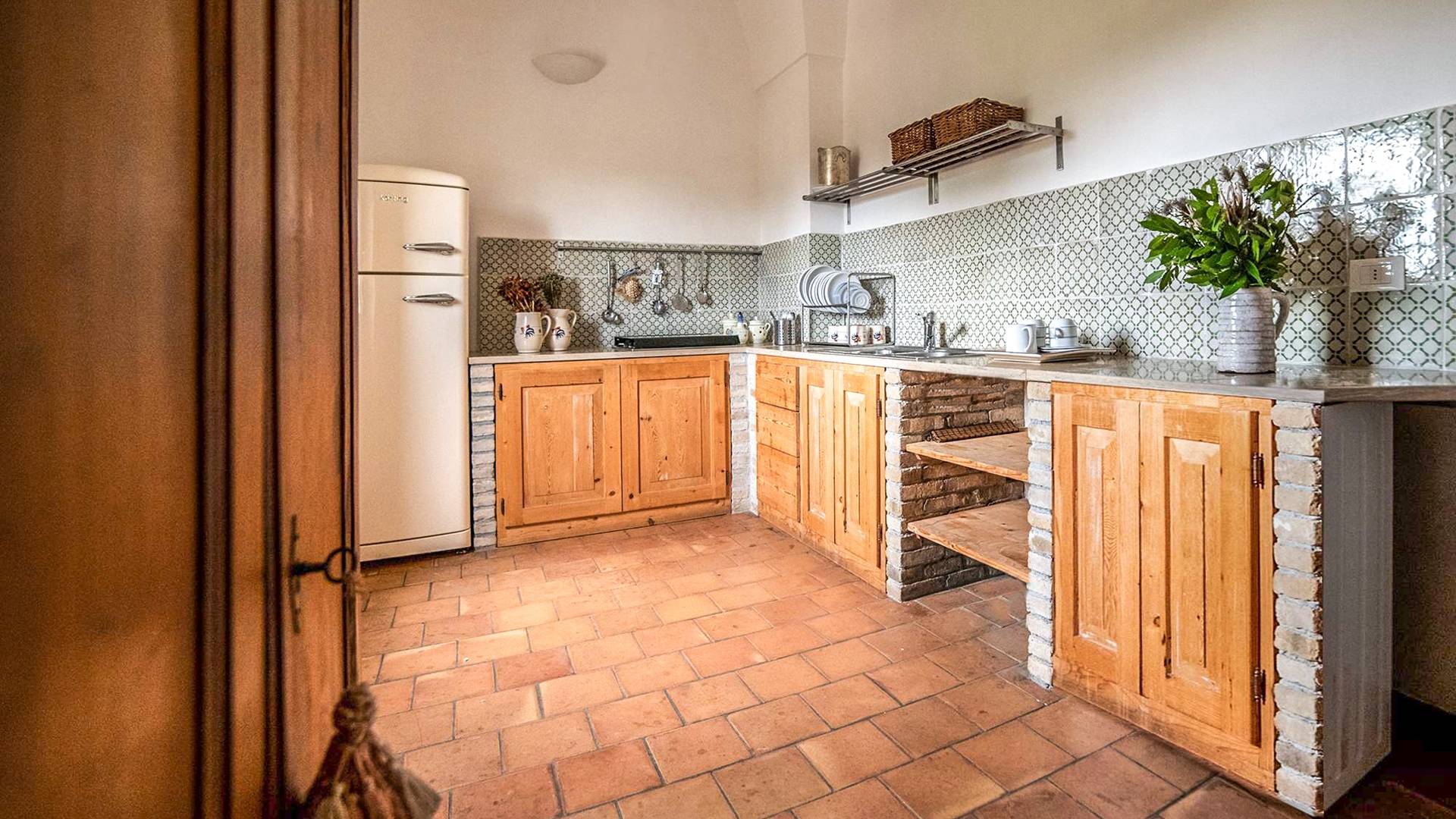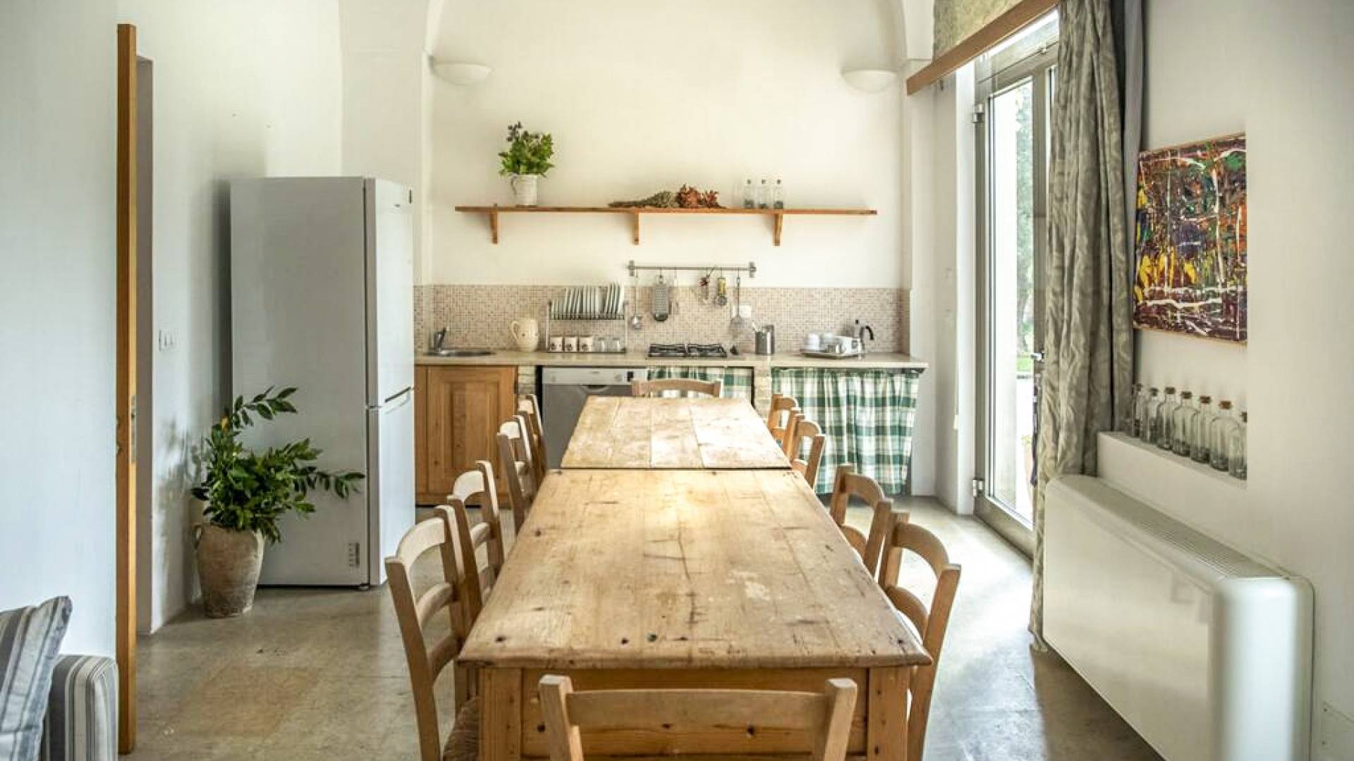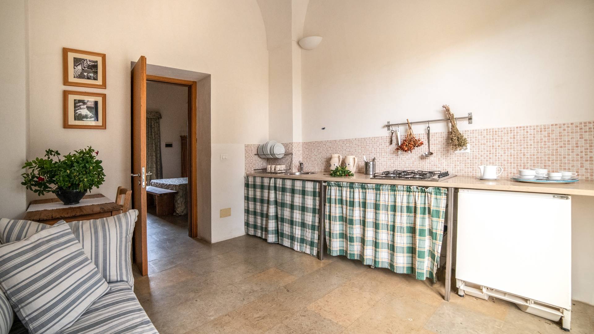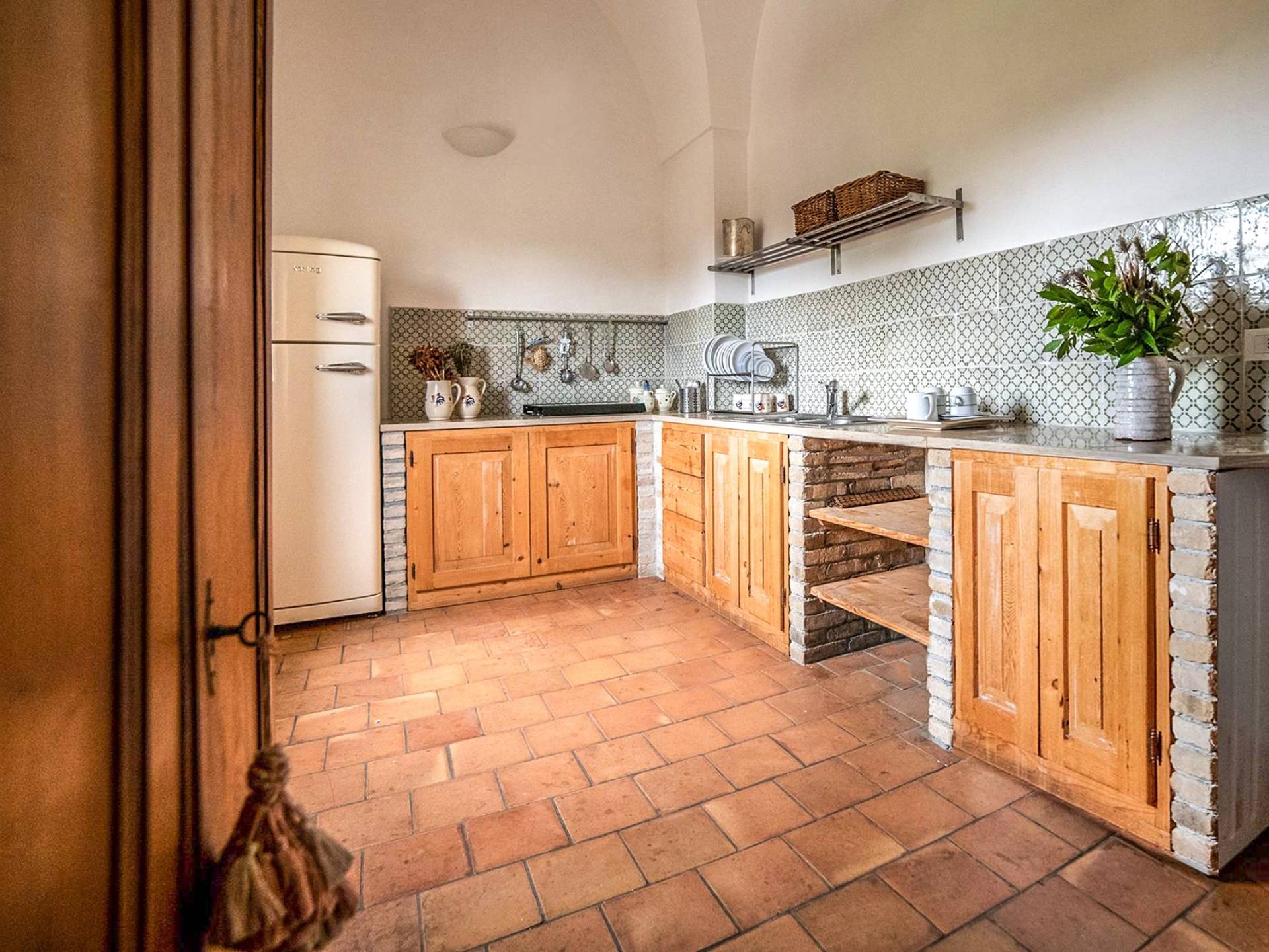 Η εσωτερική επίπλωση, όλα σε αρμονία με την περιοχή, συνδυάζονται με το αυθεντικό στυλ αυτής της αρχαίας κατοικίας: καθρέφτες, σεντούκια, ντουλάπες και ξύλινα κομοδίνα, παίζουν τέλειο ρόλο με τις τυπικές θολωτές οροφές και μερικά εμφανή δοκάρια, με τα δάπεδα σε πέτρα Λέτσε είναι χειροποίητη τερακότα. Ιδιαίτερα φιλόξενο είναι το μεγάλο δωμάτιο που λειτουργεί ως σαλόνι με τον όμορφο λευκό καναπέ, το πέτρινο τζάκι στο κέντρο, ένα τραπεζάκι από μασίφ ξύλο και μια φωτεινή θέα στην πανοραμική βεράντα. Στην τραπεζαρία, υπάρχει χώρος για 16 άτομα χάρη στο μεγάλο ξύλινο τραπέζι. Χαρακτηριστικό και πραγματικά εξοπλισμένο με όλα όσα χρειάζεστε, ακόμα και την κουζίνα του σπιτιού.