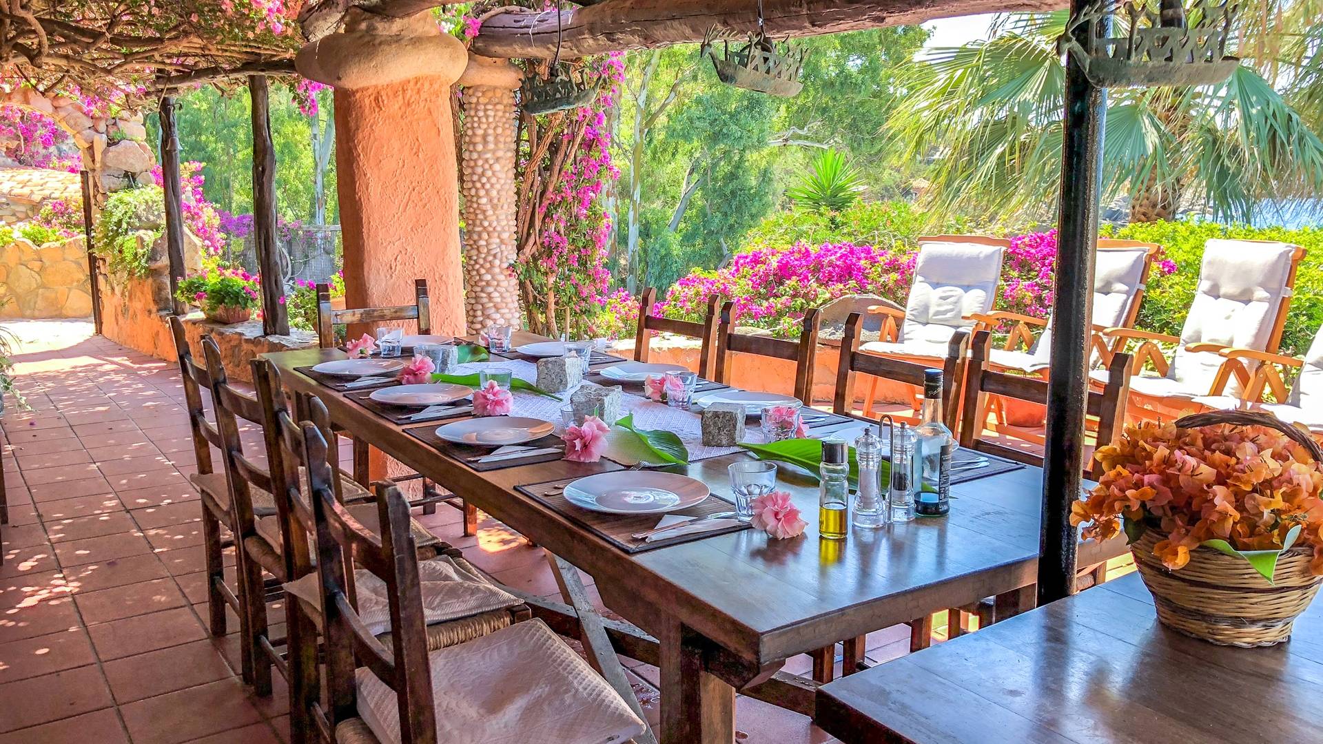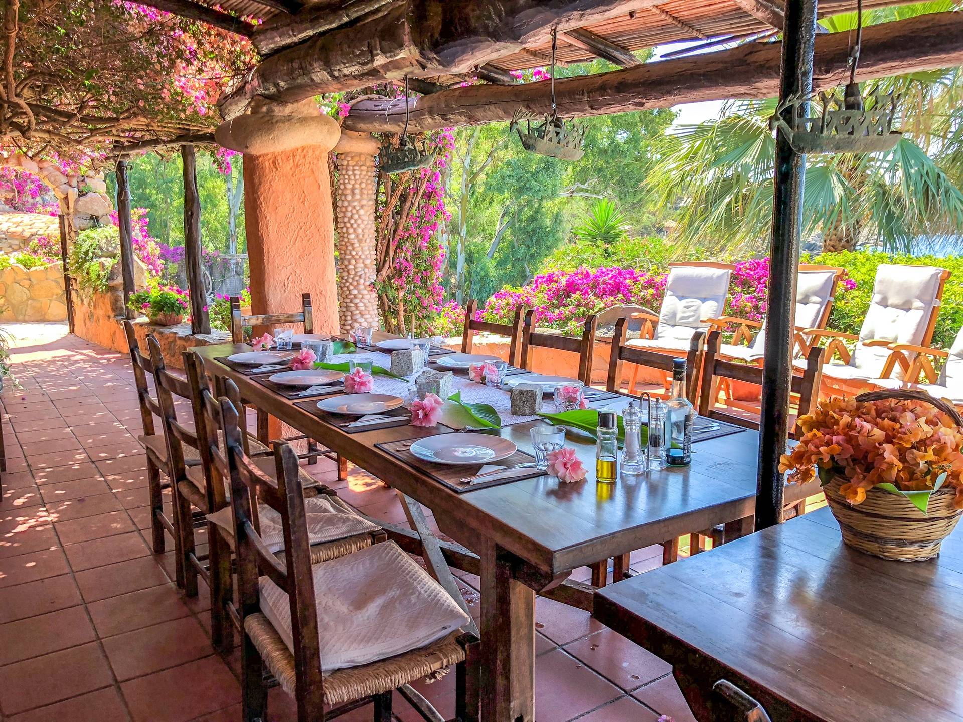 Η Villa Pacifica Sardinia είναι χτισμένη σε γυψομάρμαρο, ξύλο, cotto με εκτεταμένη χρήση τοπικών πετρών. Διαθέτει βεράντα με καθιστικό, πέτρινα τραπέζια, αίθρια όλα με θέα στη θάλασσα και υπαίθριο χώρο για 20 άτομα. Ο εξωτερικός χώρος είναι 2.000 m2, όπου μπορείτε να βρείτε έναν μεσογειακό κήπο με εκπληκτική θέα στη θάλασσα και πολλές βεράντες και κήπους για να απολαύσετε την ύπαιθρο. Τέτοιοι μεγάλοι χώροι διατίθενται για εκδηλώσεις με επιπλέον κόστος: 150 άτομα κάθονται στον κήπο. Στην αίθουσα γιόγκα διατίθεται εσωτερικός χώρος για 80 καθήμενους επισκέπτες.