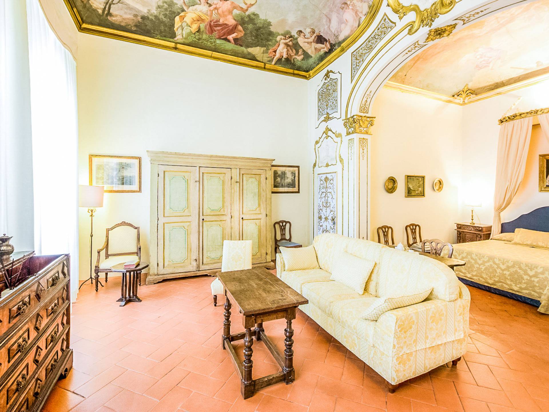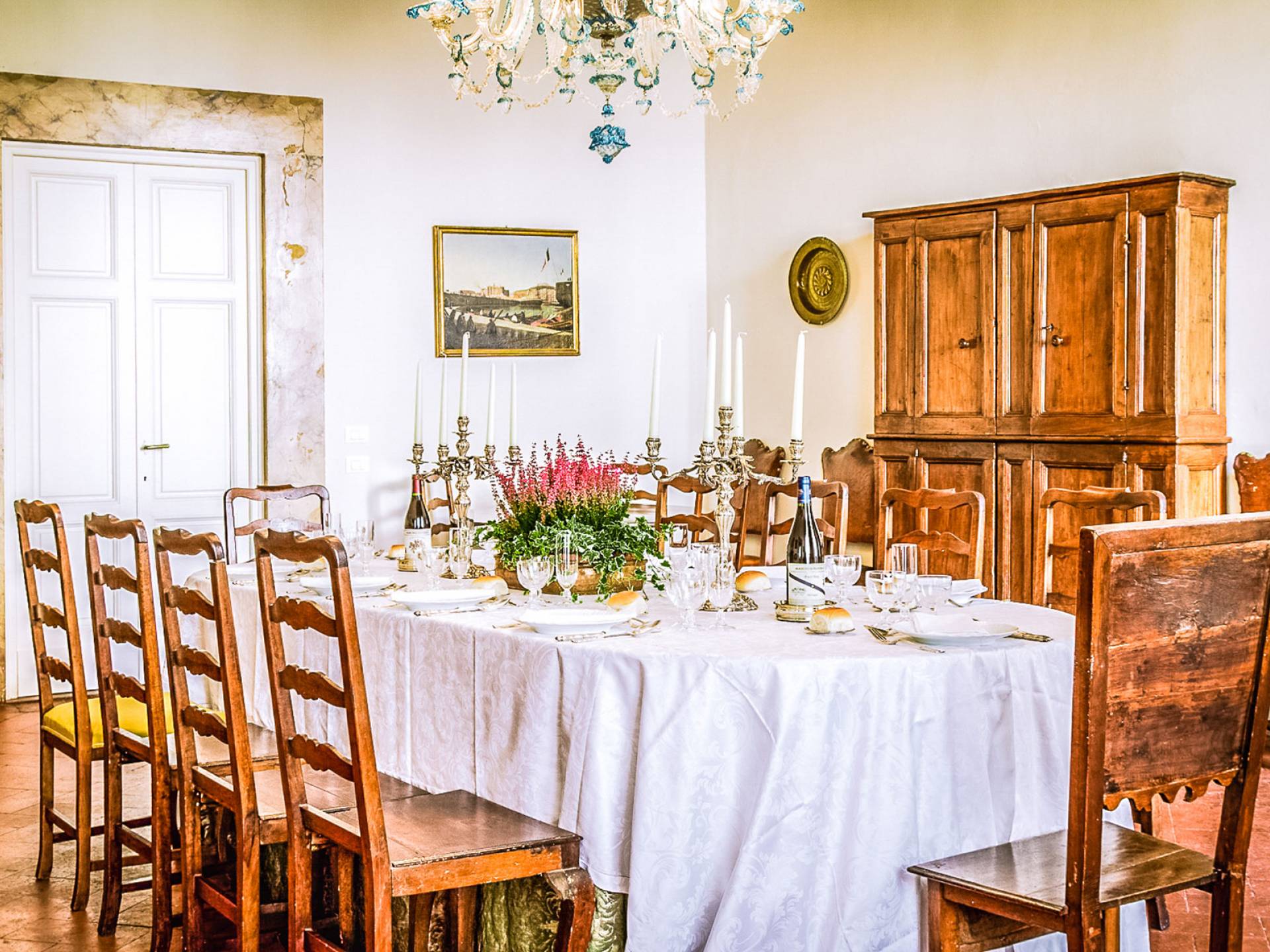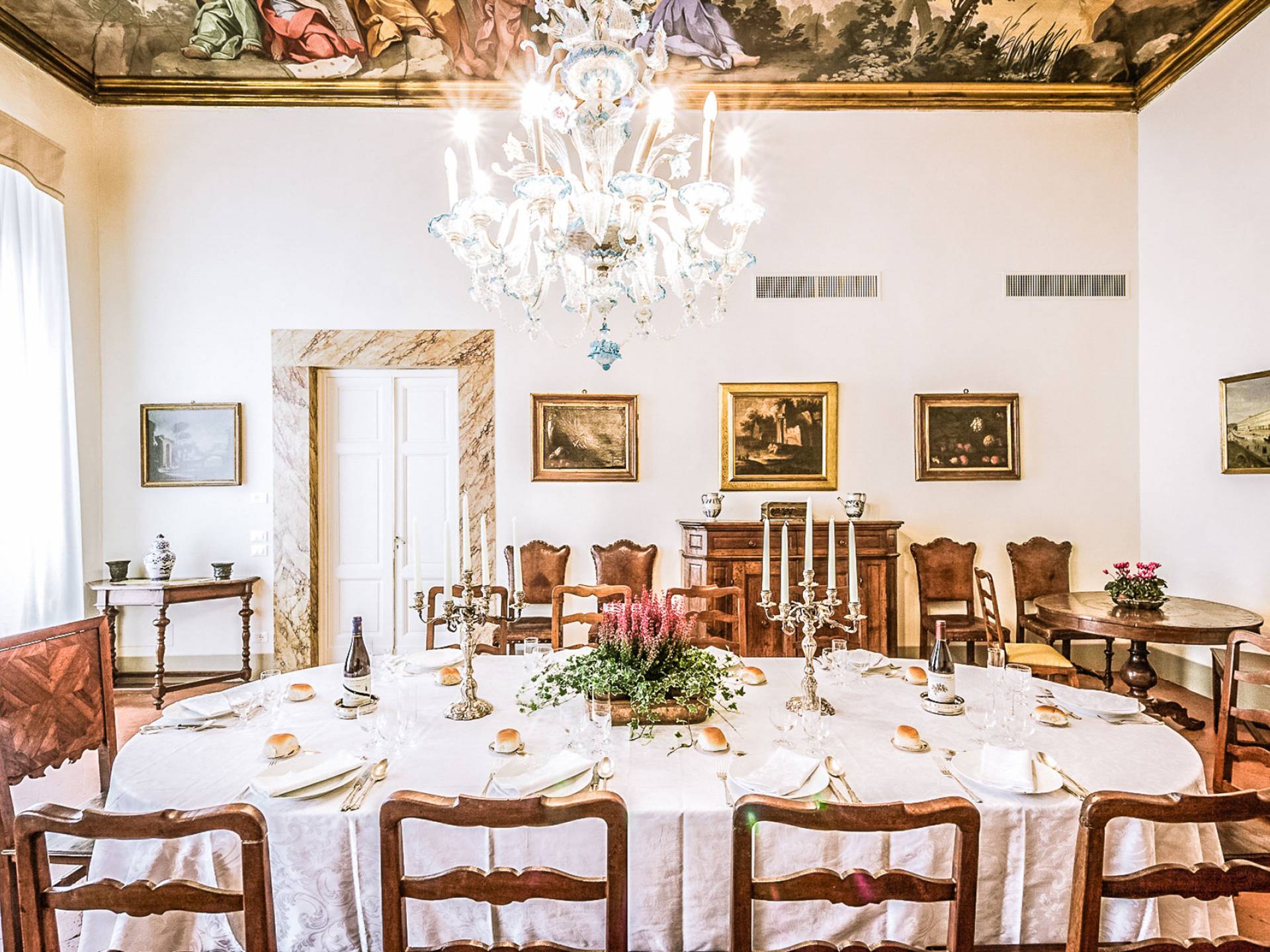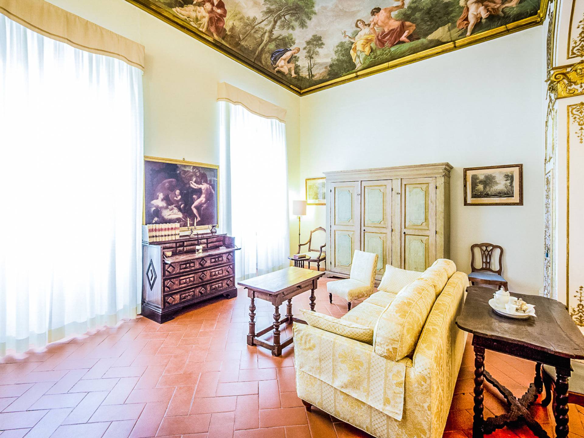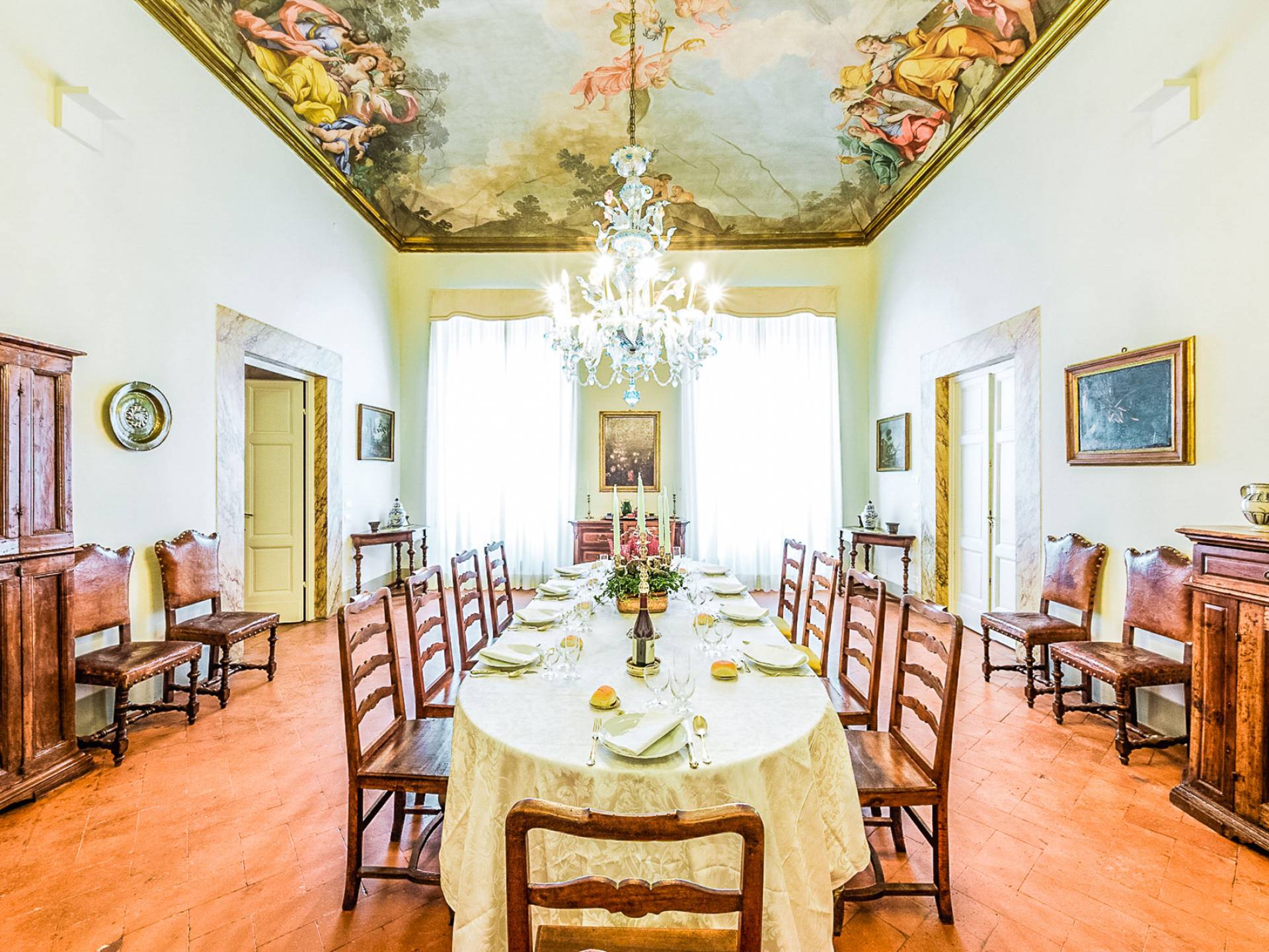1 επίσημη τραπεζαρία (50 τετραγωνικά μέτρα) - Μια μεγάλη τραπεζαρία που βλέπει στην πλατεία. Περιλαμβάνει ένα μεγάλο στρογγυλό τραπέζι (αρκετά μεγάλο για δέκα άτομα), δύο ντουλάπια κουζίνας από τον δέκατο έβδομο αιώνα, μια συρταριέρα Λουδοβίκου XIV, δύο μικρότερα στρογγυλά τραπέζια για μικρότερα γεύματα και δείπνα 4 έως 6 ατόμων. Οι δερμάτινες καρέκλες συμπληρώνουν την επίπλωση. Οι τοίχοι είναι διακοσμημένοι με ελαιογραφίες από διάφορες περιόδους. Το δωμάτιο φωτίζεται από έναν μεγάλο πολύχρωμο γυάλινο πολυέλαιο από το Murano. 1 Κύριο υπνοδωμάτιο με διπλό κρεβάτι (47 m2) - Μεγάλο υπνοδωμάτιο με εσοχή όπου κοιμόταν ο Πάπας Κλήμης Η'. Αποτελείται από μια μικρή είσοδο επιπλωμένη με μια υπέροχη συρταριέρα του δέκατου έβδομου αιώνα από την Piacenza, πάνω από την οποία υπάρχει μια ελαιογραφία που αντιπροσωπεύει μια μυθολογική σκηνή, μια μεγάλη ντουλάπα με τρία χωρίσματα, ένα ντιβάνι 3 ατόμων και πολλές καρέκλες . Το υπνοδωμάτιο περιέχει ένα βασιλικό αντίκες, επιχρυσωμένο διπλό κρεβάτι με ουρανό. Κλιματιζόμενο. Δορυφορική τηλεόραση με πλήρη προγράμματα SKY. Κύριο μπάνιο (6 m2) Το μπάνιο έχει ανακαινιστεί πλήρως κατά τη διάρκεια πρόσφατης αποκατάστασης. Οι τοίχοι είναι από μάρμαρο, τα εξαρτήματα είναι από κλασική λευκή πορσελάνη. Ένα μεγάλο ντους.
