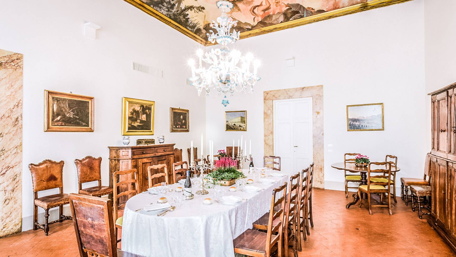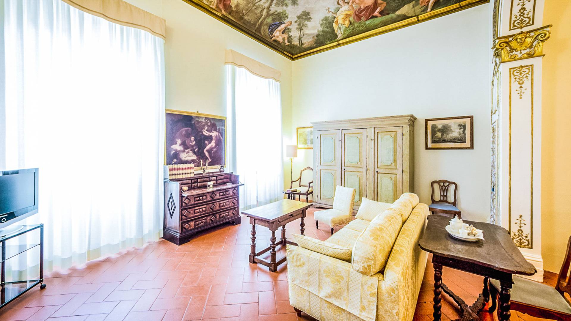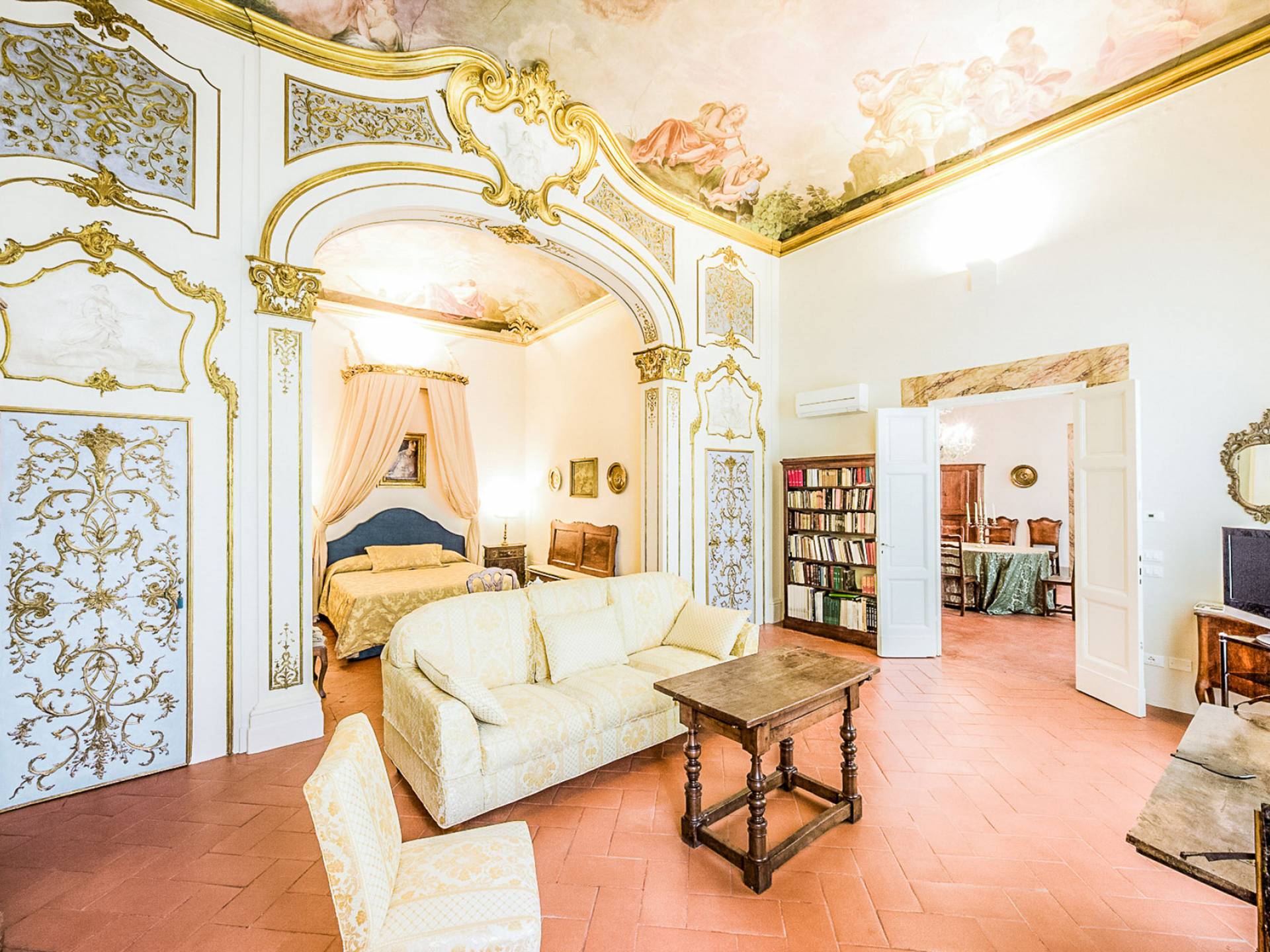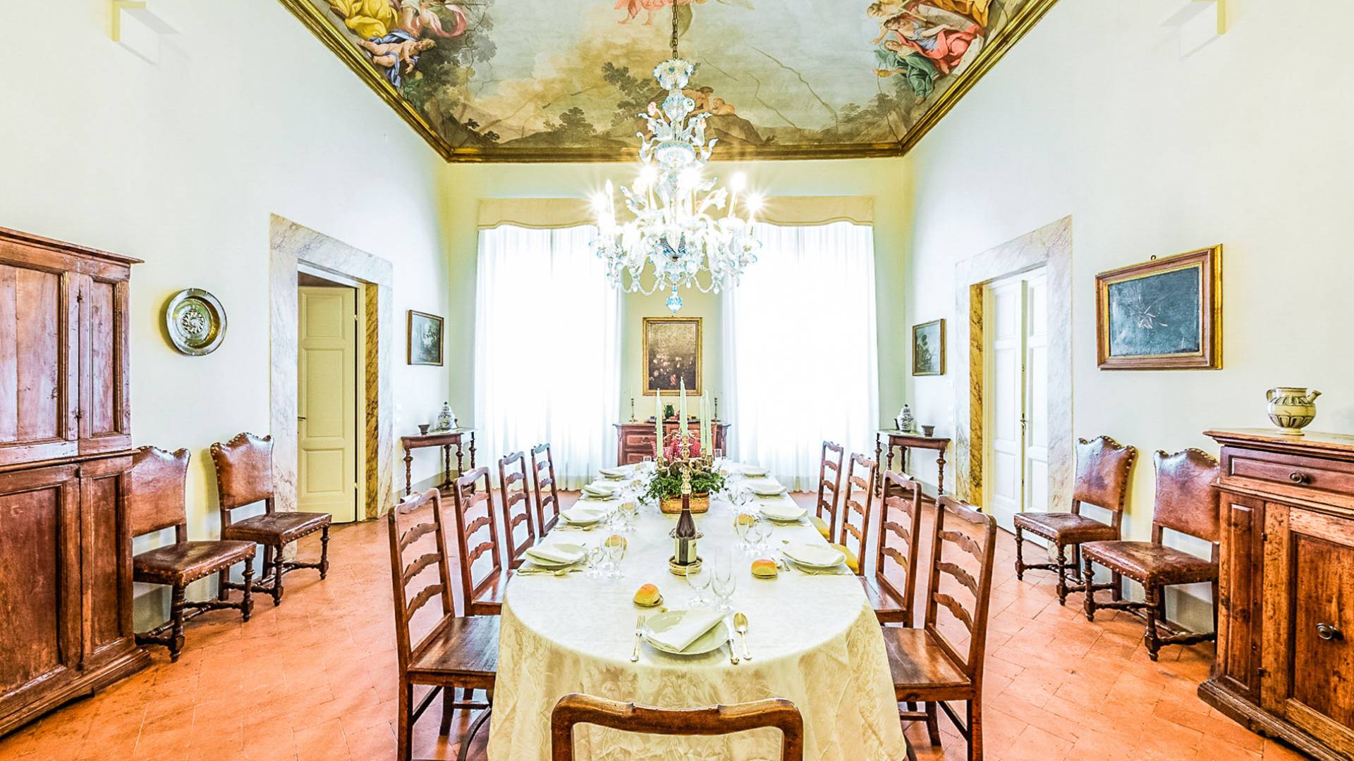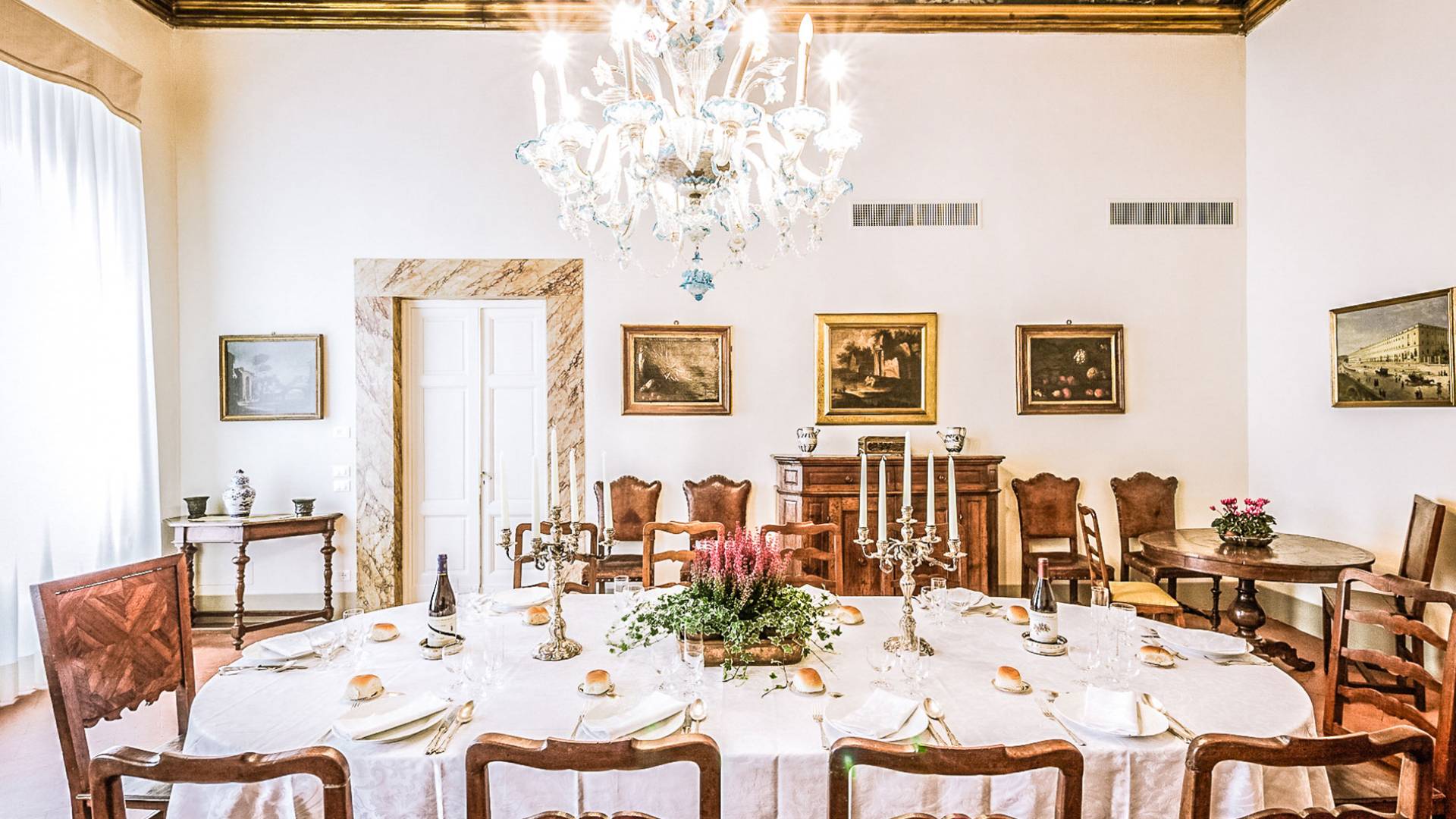 1 επίσημη τραπεζαρία (50 τετραγωνικά μέτρα) - Μια μεγάλη τραπεζαρία που βλέπει στην πλατεία. Περιλαμβάνει ένα μεγάλο στρογγυλό τραπέζι (αρκετά μεγάλο για δέκα άτομα), δύο ντουλάπια κουζίνας από τον δέκατο έβδομο αιώνα, μια συρταριέρα Λουδοβίκου XIV, δύο μικρότερα στρογγυλά τραπέζια για μικρότερα γεύματα και δείπνα 4 έως 6 ατόμων. Οι δερμάτινες καρέκλες συμπληρώνουν την επίπλωση. Οι τοίχοι είναι διακοσμημένοι με ελαιογραφίες από διάφορες περιόδους. Το δωμάτιο φωτίζεται από έναν μεγάλο πολύχρωμο γυάλινο πολυέλαιο από το Murano. 1 Κύριο υπνοδωμάτιο με διπλό κρεβάτι (47 m2) - Μεγάλο υπνοδωμάτιο με εσοχή όπου κοιμόταν ο Πάπας Κλήμης Η'. Αποτελείται από μια μικρή είσοδο επιπλωμένη με μια υπέροχη συρταριέρα του δέκατου έβδομου αιώνα από την Piacenza, πάνω από την οποία υπάρχει μια ελαιογραφία που αντιπροσωπεύει μια μυθολογική σκηνή, μια μεγάλη ντουλάπα με τρία χωρίσματα, ένα ντιβάνι 3 ατόμων και πολλές καρέκλες . Το υπνοδωμάτιο περιέχει ένα βασιλικό αντίκες, επιχρυσωμένο διπλό κρεβάτι με ουρανό. Κλιματιζόμενο. Δορυφορική τηλεόραση με πλήρη προγράμματα SKY. Κύριο μπάνιο (6 m2) Το μπάνιο έχει ανακαινιστεί πλήρως κατά τη διάρκεια πρόσφατης αποκατάστασης. Οι τοίχοι είναι από μάρμαρο, τα εξαρτήματα είναι από κλασική λευκή πορσελάνη. Ένα μεγάλο ντους.