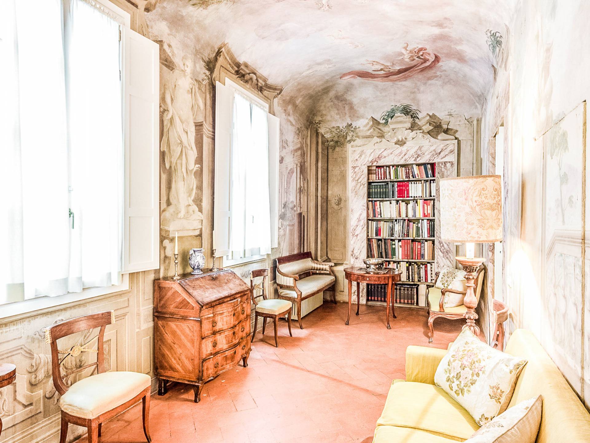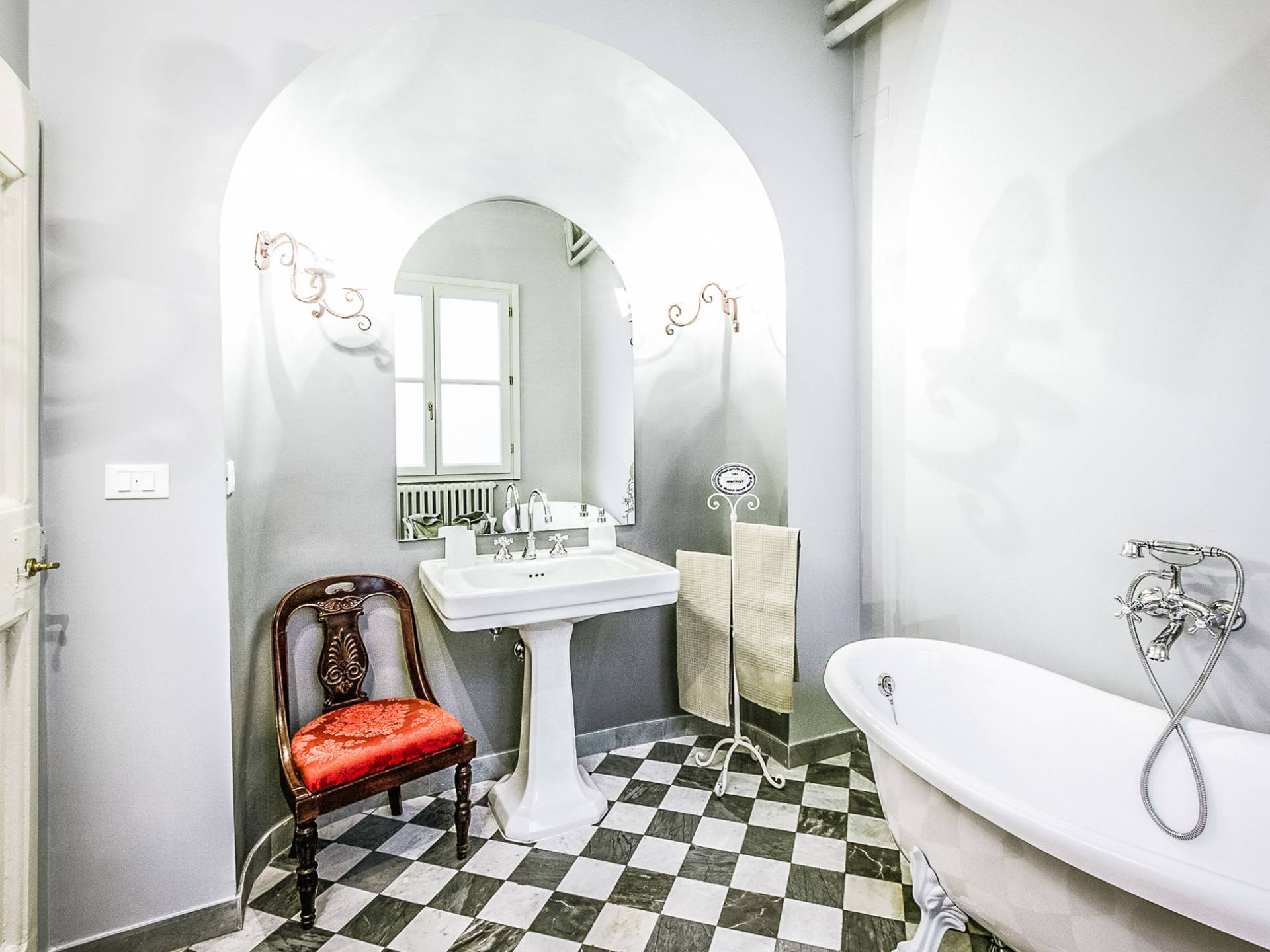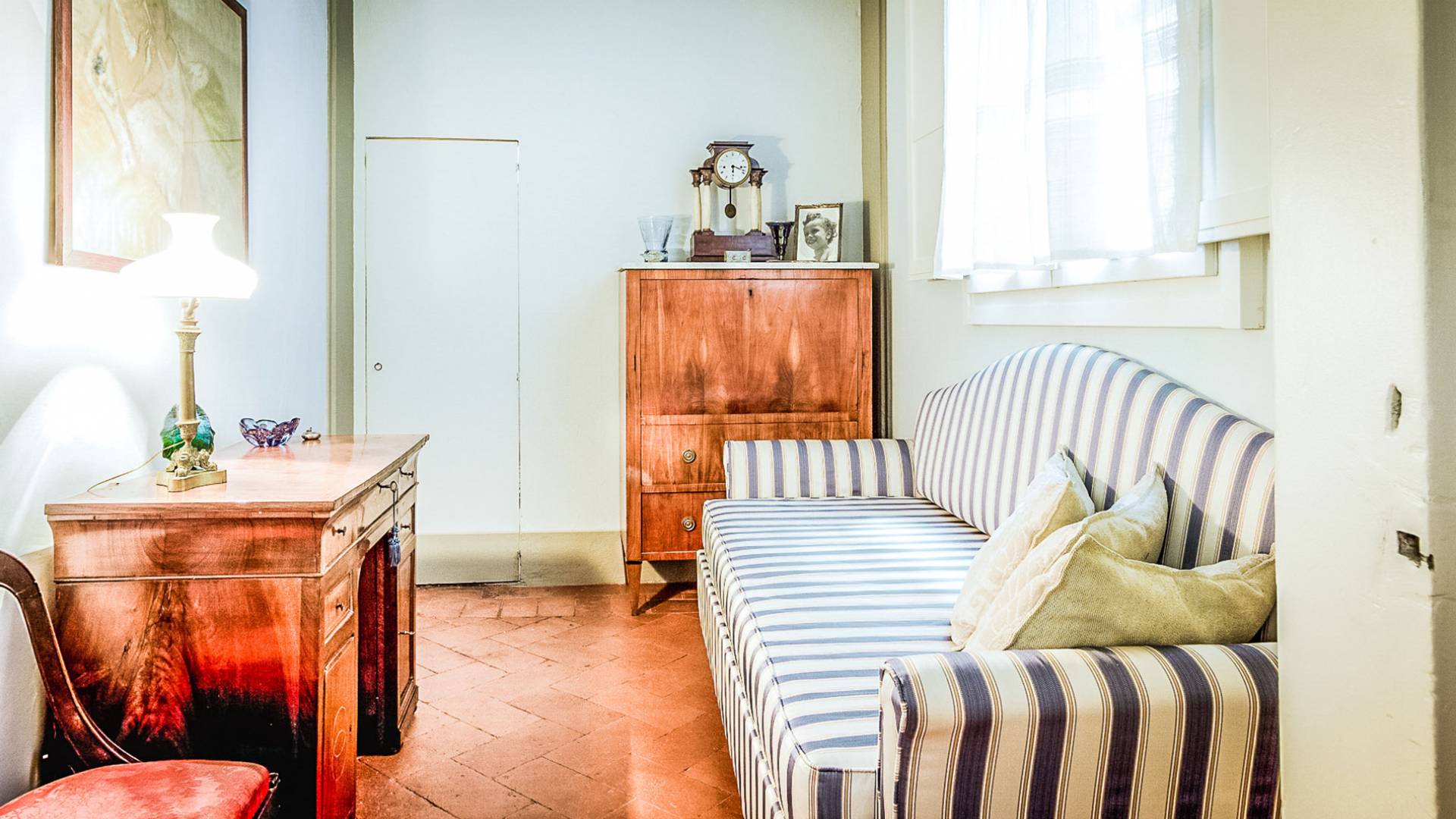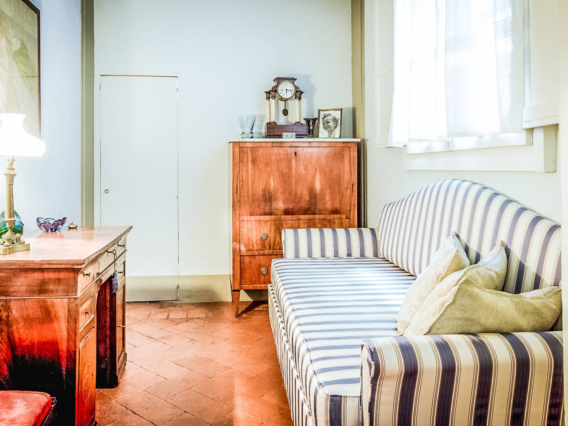 1 δωμάτιο στούντιο με καναπέ-κρεβάτι που γίνεται μονόκλινο υπνοδωμάτιο με ιδιωτικό μπάνιο (8 m2) - Ένα μικρό δωμάτιο με μεγάλο παράθυρο που βλέπει στην εσωτερική αυλή του Palazzo. Περιλαμβάνει μονό καναπέ-κρεβάτι, ένα γραφείο και μια συρταριέρα σε στυλ της Αυτοκρατορίας. Μπάνιο επισκεπτών (6 τετραγωνικά μέτρα). Το μπάνιο επισκεπτών έχει ανακαινιστεί πλήρως, με το αρχικό πάτωμα «bardiglio» να διατηρείται. Τα εξαρτήματα είναι από κλασική λευκή πορσελάνη και περιλαμβάνουν μπανιέρα με σιδερένια πόδια λιονταριού.