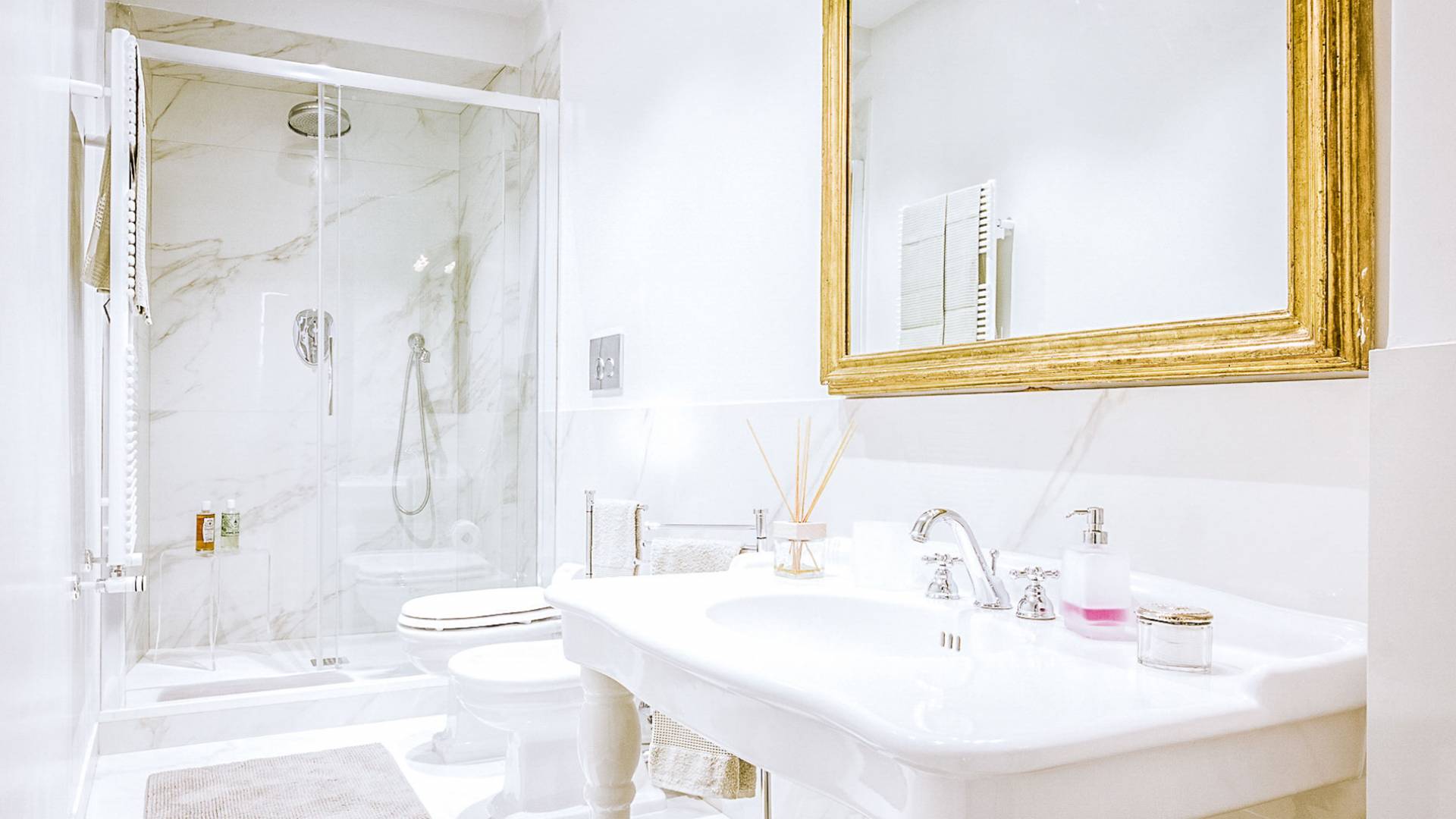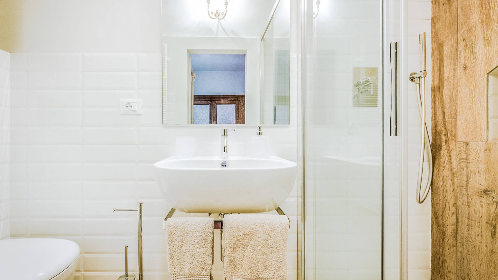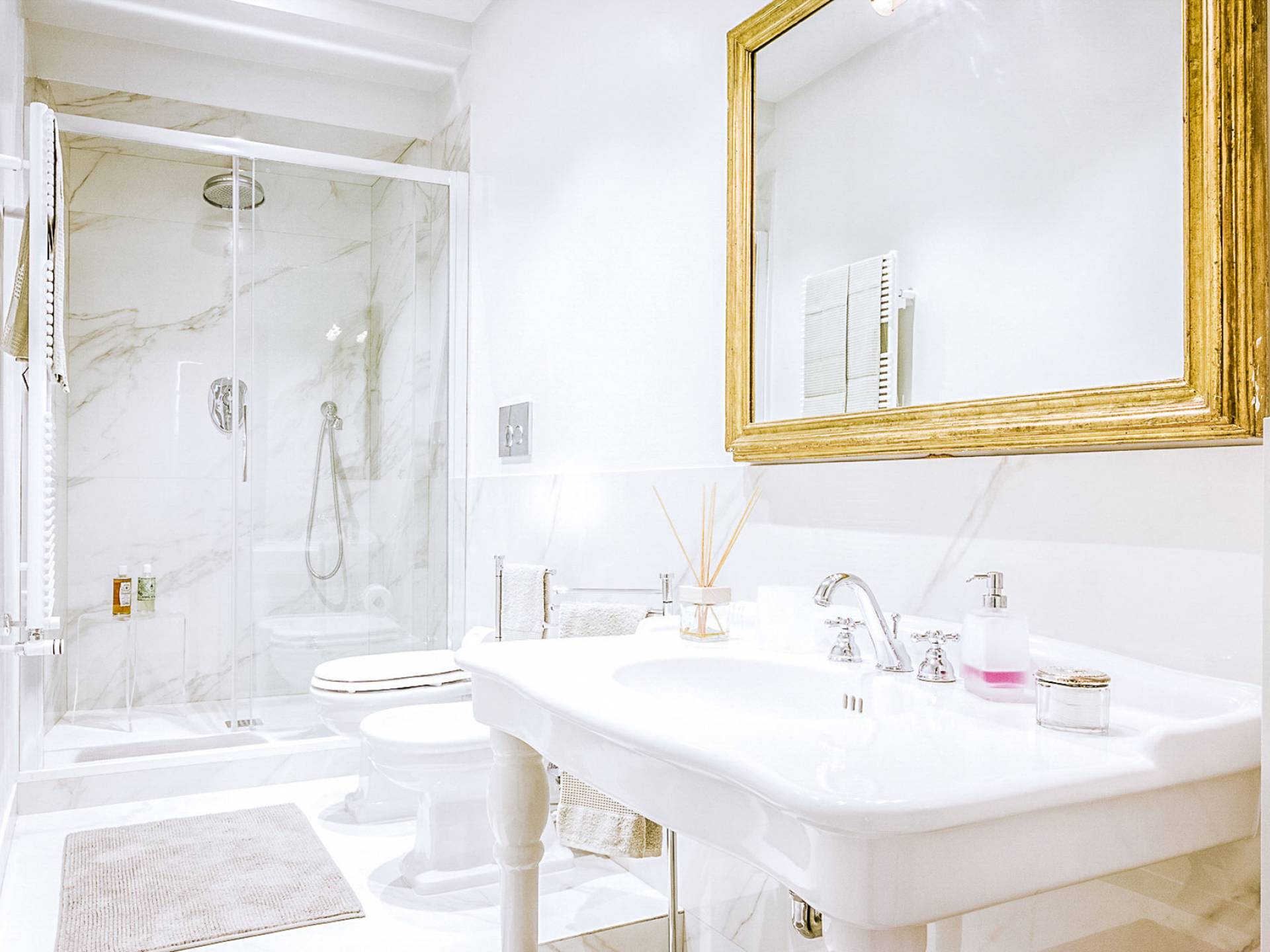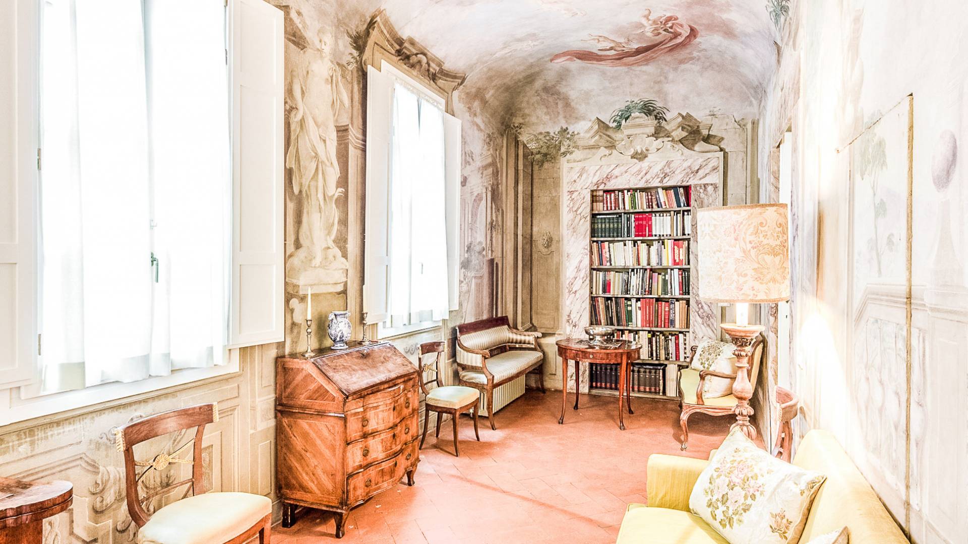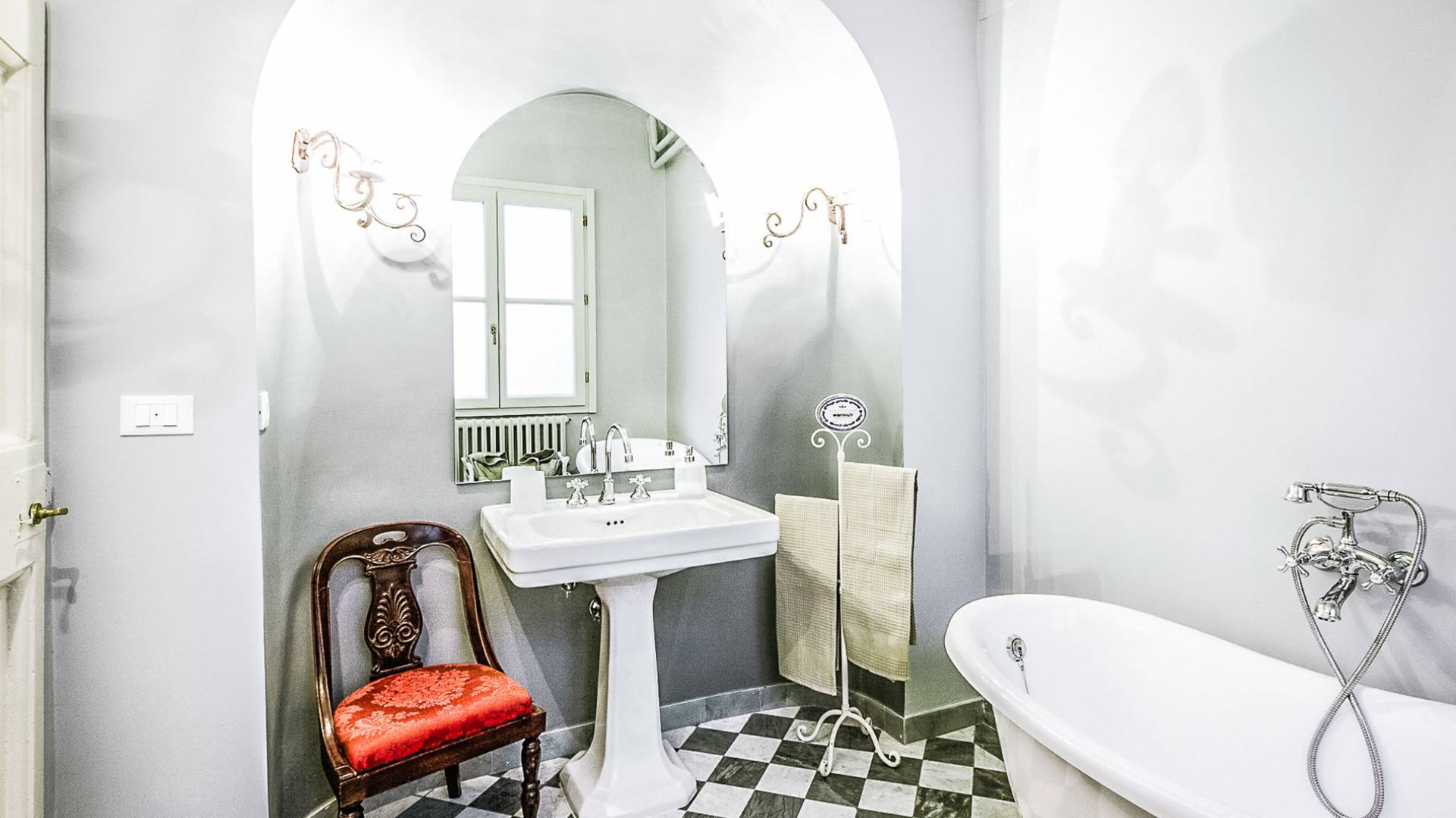 1 δωμάτιο στούντιο με καναπέ-κρεβάτι που γίνεται μονόκλινο υπνοδωμάτιο με ιδιωτικό μπάνιο (8 m2) - Ένα μικρό δωμάτιο με μεγάλο παράθυρο που βλέπει στην εσωτερική αυλή του Palazzo. Περιλαμβάνει μονό καναπέ-κρεβάτι, ένα γραφείο και μια συρταριέρα σε στυλ της Αυτοκρατορίας. Μπάνιο επισκεπτών (6 τετραγωνικά μέτρα). Το μπάνιο επισκεπτών έχει ανακαινιστεί πλήρως, με το αρχικό πάτωμα «bardiglio» να διατηρείται. Τα εξαρτήματα είναι από κλασική λευκή πορσελάνη και περιλαμβάνουν μπανιέρα με σιδερένια πόδια λιονταριού.