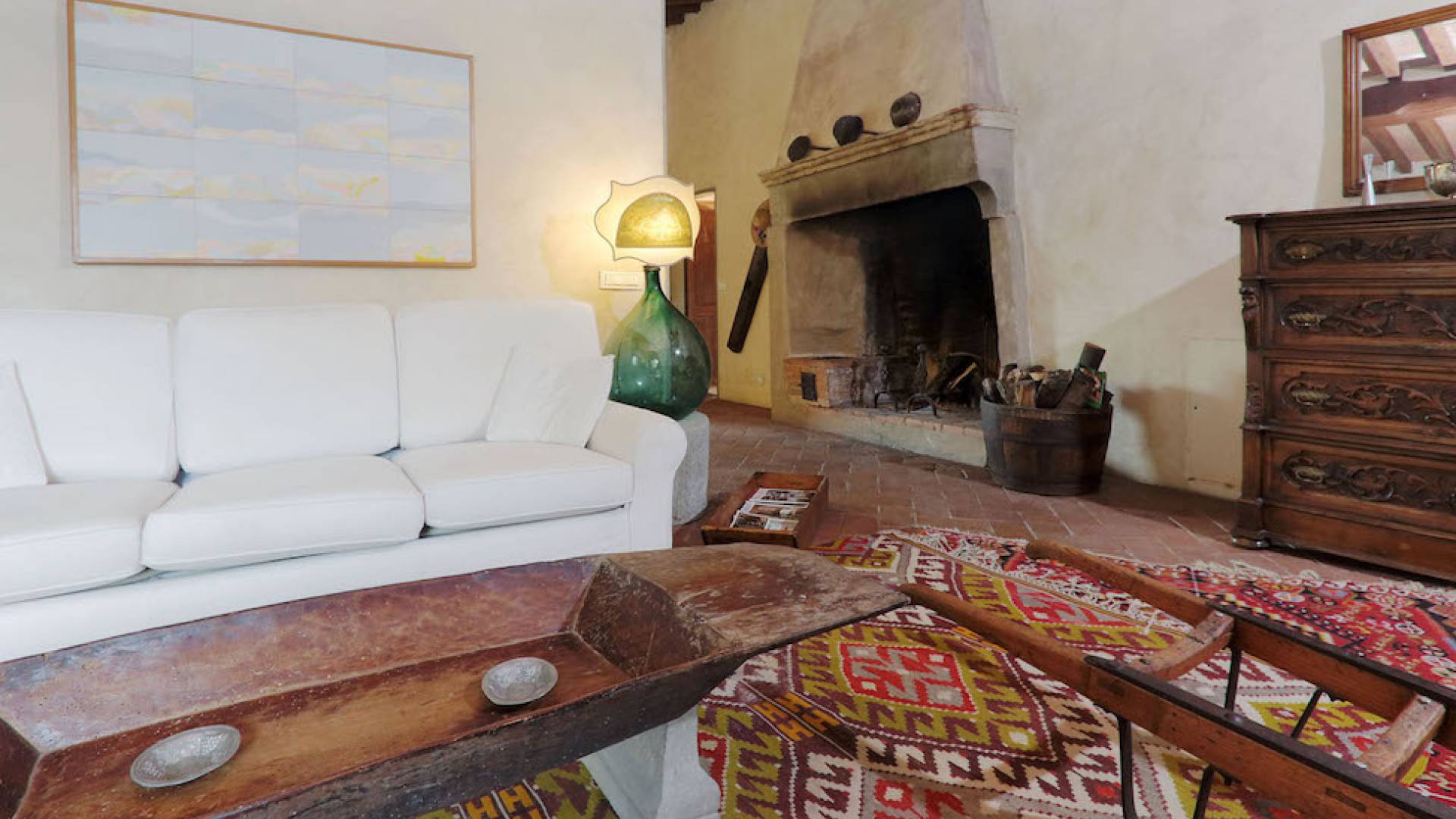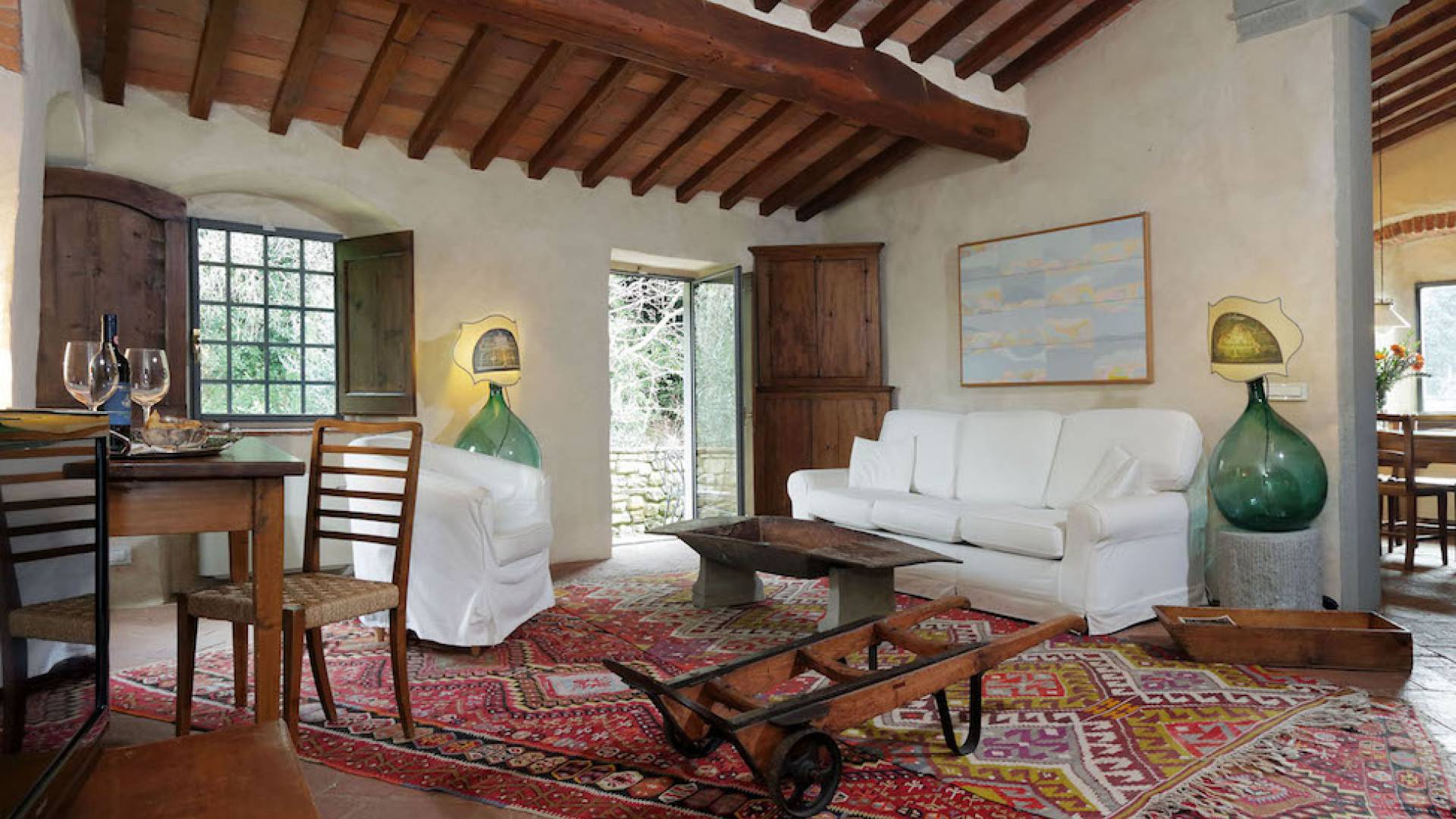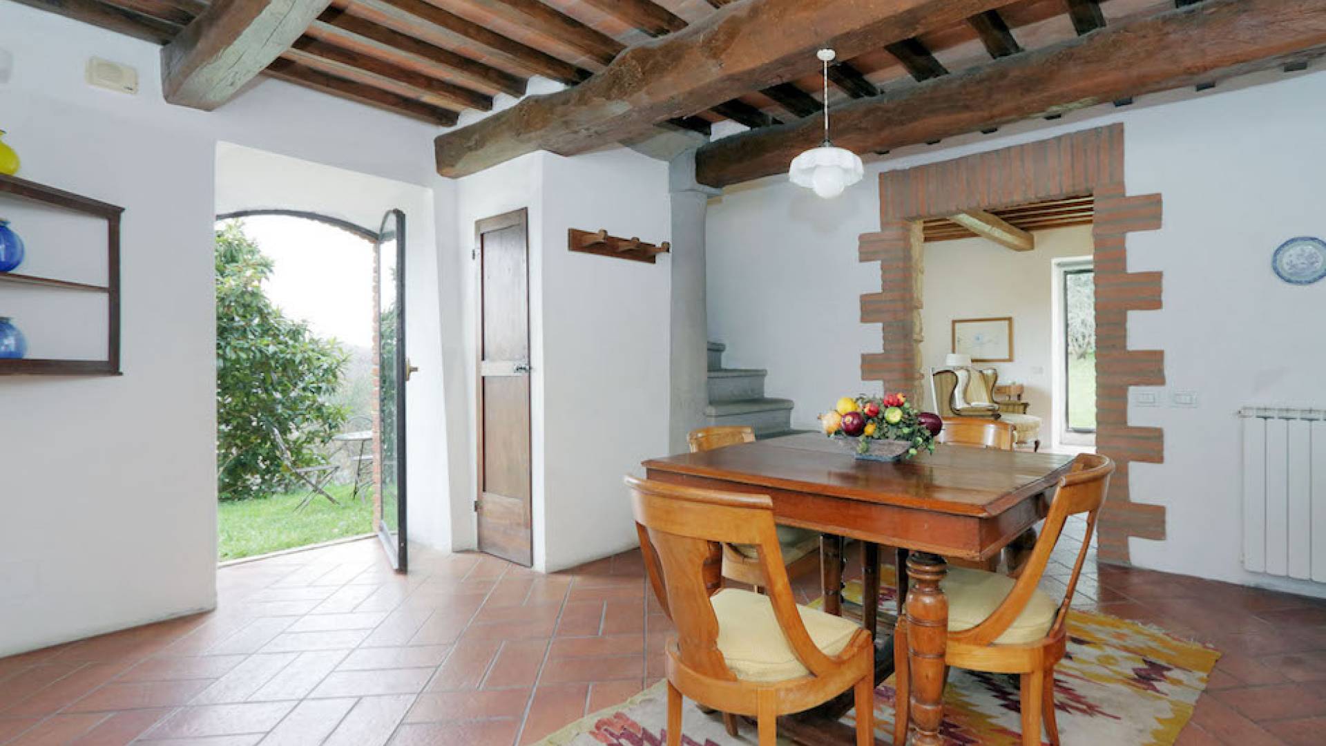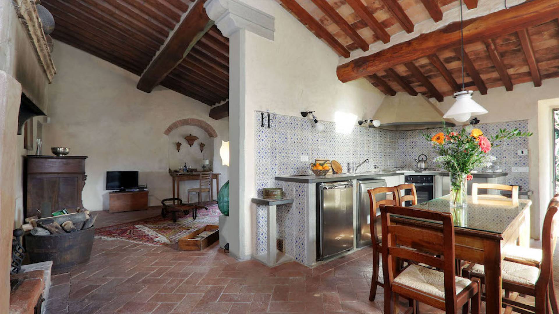 Βρίσκεται στο χωριό, αυτή η διώροφη αγροικία περιβάλλεται από έναν όμορφο γκαζόν. Τα παράθυρα ανοίγουν σε ένα πανόραμα της κοιλάδας της Πέσας και των ελαιώνων του αγροκτήματος. Το μεγάλο σπίτι είναι διακοσμημένο με πολύτιμα έπιπλα, χαλί Kilim και εξοπλισμένο με όλες τις σύγχρονες ανέσεις, διατηρώντας παράλληλα το παραδοσιακό στυλ της Τοσκάνης. Η φωτεινή είσοδος με ένα παλιό τζάκι οδηγεί σε δύο υπνοδωμάτια. Μια παλιά σκάλα σας οδηγεί στο ισόγειο, ο οποίος ανοίγει σε έναν ιδιωτικό κήπο προσβάσιμο από όλα τα δωμάτια: το άνετο σαλόνι, την τραπεζαρία και την κουζίνα διακοσμημένη με αντίκες κεραμίδια από τερακότα. Έξω από την κουζίνα, υπάρχει μπάρμπεκιου από τερακότα και πέτρα, σιδερένιο τραπέζι και καρέκλες όπου μπορεί κανείς να απολαύσει υπέροχες ψησταριές στο ύπαιθρο.