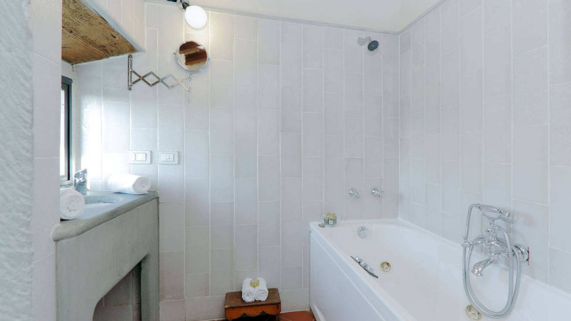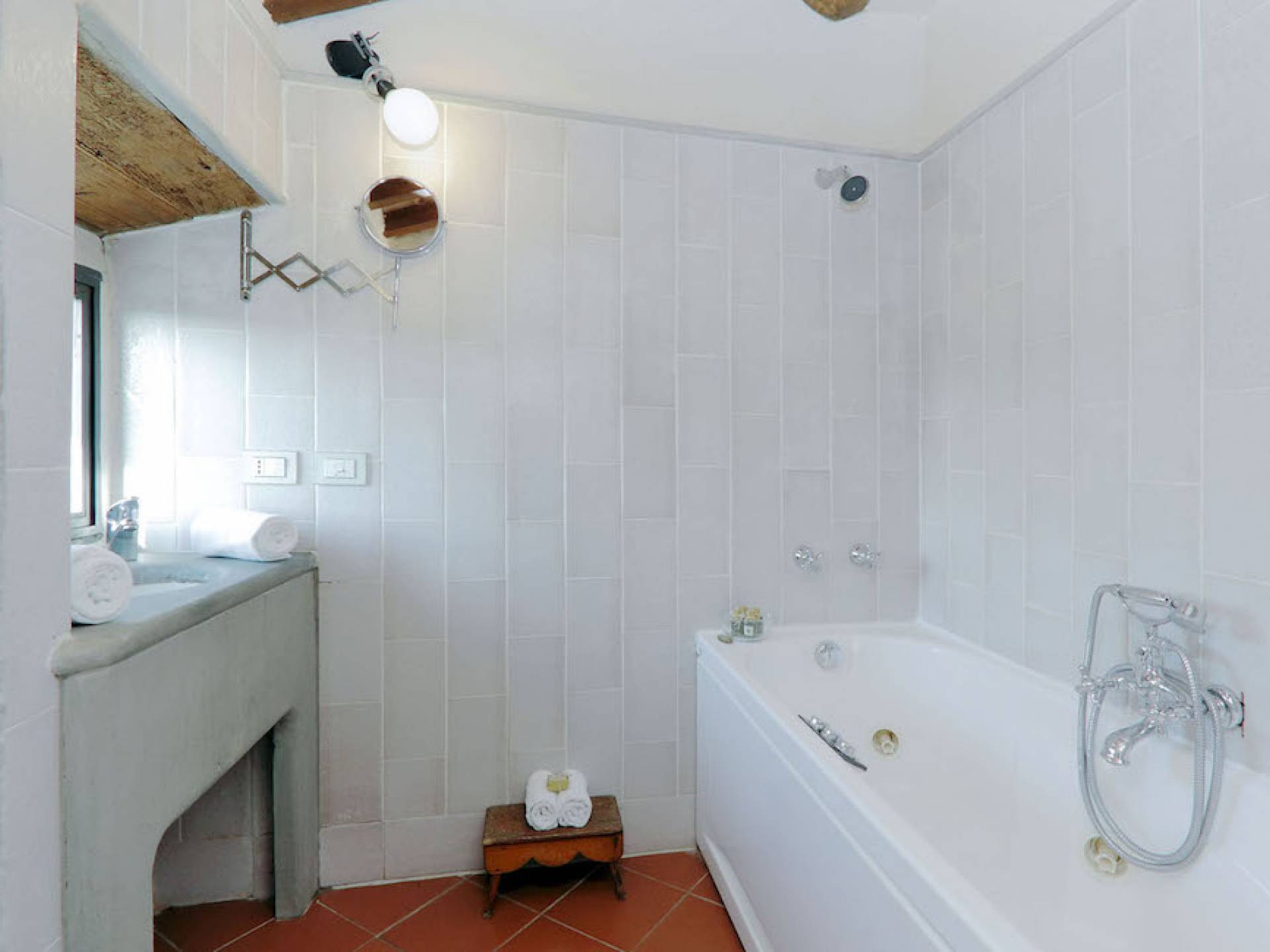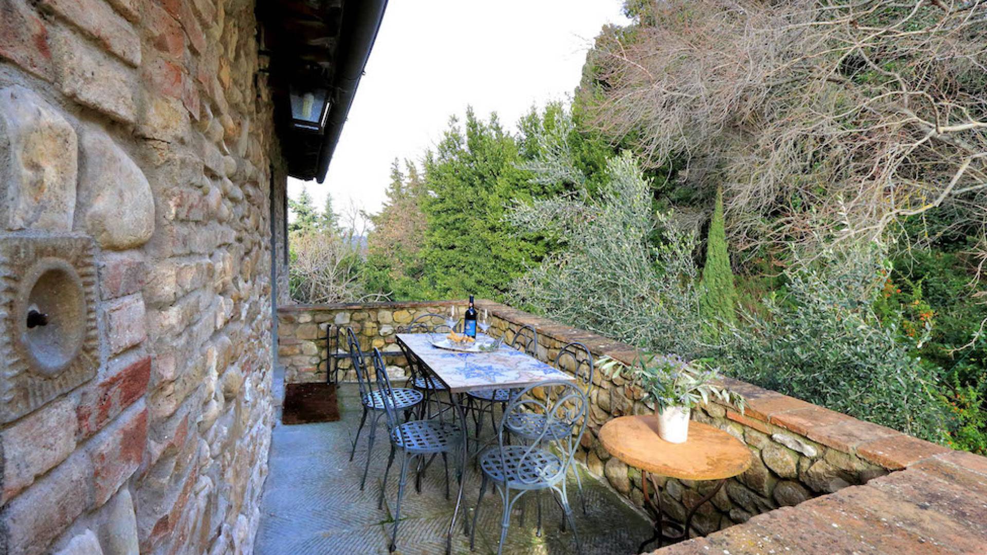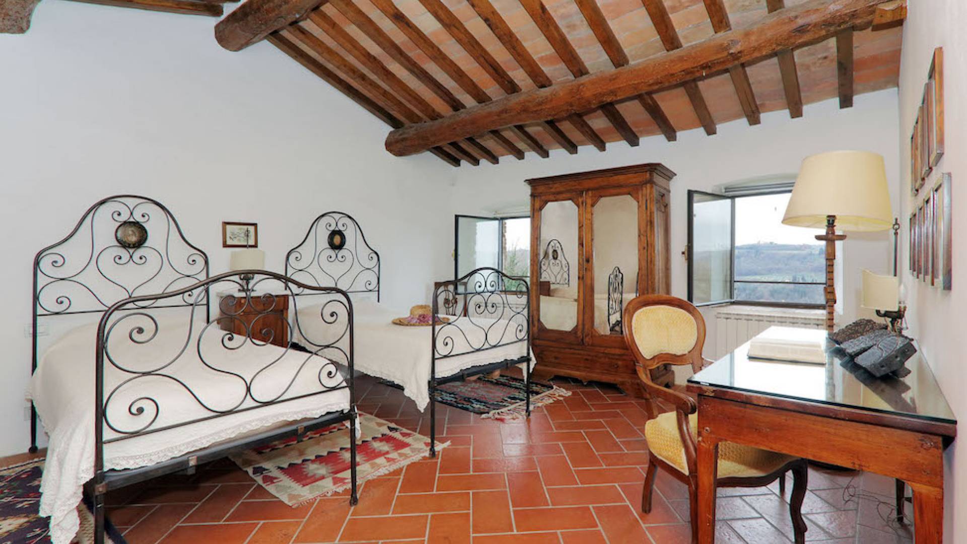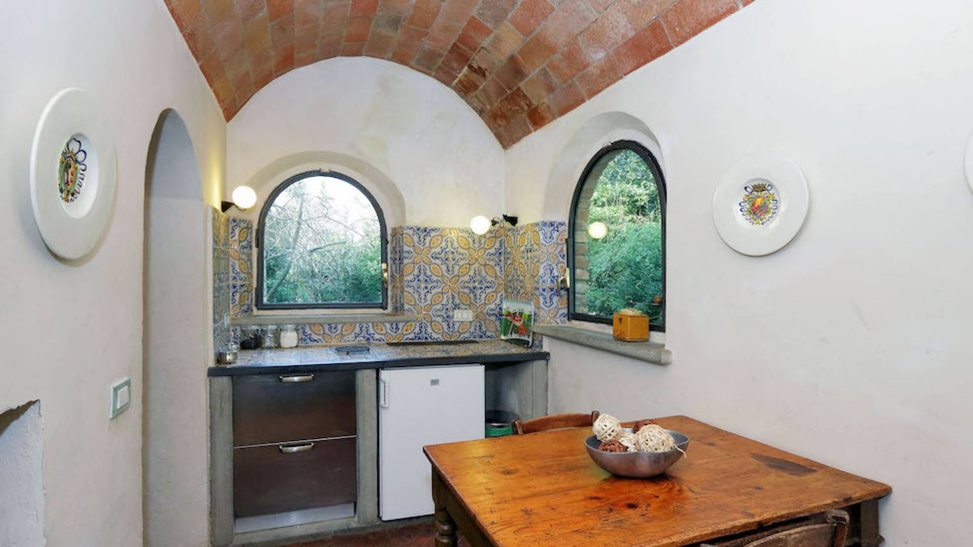 Βρίσκεται στο χωριό, αυτή η διώροφη αγροικία περιβάλλεται από έναν όμορφο γκαζόν. Τα παράθυρα ανοίγουν σε ένα πανόραμα της κοιλάδας της Πέσας και των ελαιώνων του αγροκτήματος. Το μεγάλο σπίτι είναι διακοσμημένο με πολύτιμα έπιπλα, χαλί Kilim και εξοπλισμένο με όλες τις σύγχρονες ανέσεις, διατηρώντας παράλληλα το παραδοσιακό στυλ της Τοσκάνης. Η φωτεινή είσοδος με ένα παλιό τζάκι οδηγεί σε δύο υπνοδωμάτια. Μια παλιά σκάλα σας οδηγεί στο ισόγειο, ο οποίος ανοίγει σε έναν ιδιωτικό κήπο προσβάσιμο από όλα τα δωμάτια: το άνετο σαλόνι, την τραπεζαρία και την κουζίνα διακοσμημένη με αντίκες κεραμίδια από τερακότα. Έξω από την κουζίνα, υπάρχει μπάρμπεκιου από τερακότα και πέτρα, σιδερένιο τραπέζι και καρέκλες όπου μπορεί κανείς να απολαύσει υπέροχες ψησταριές στο ύπαιθρο.