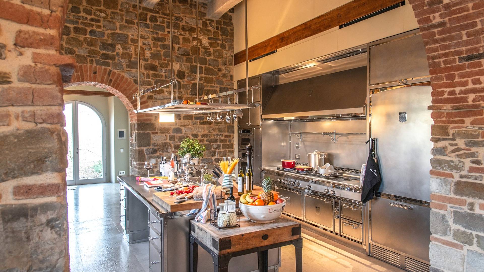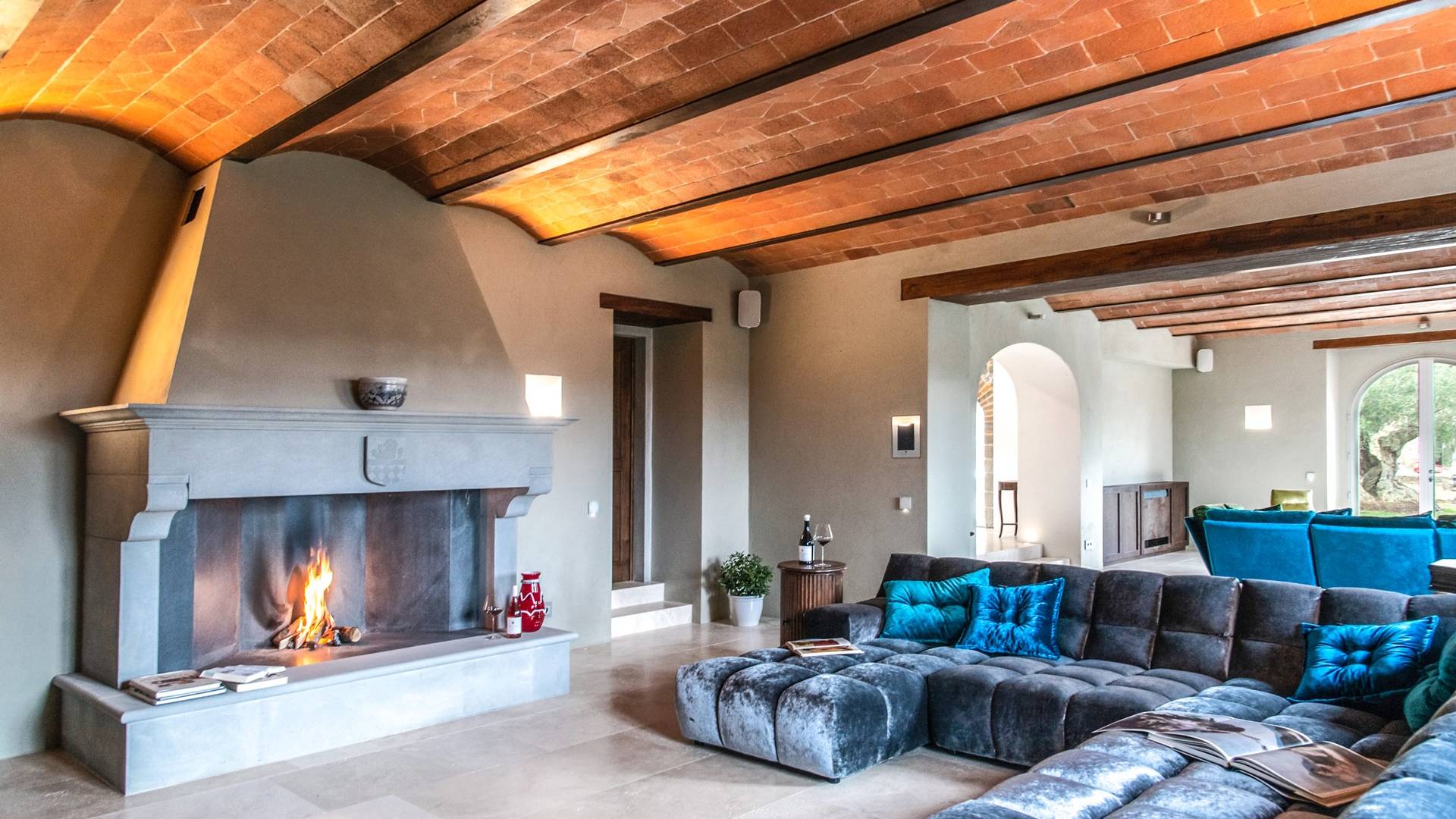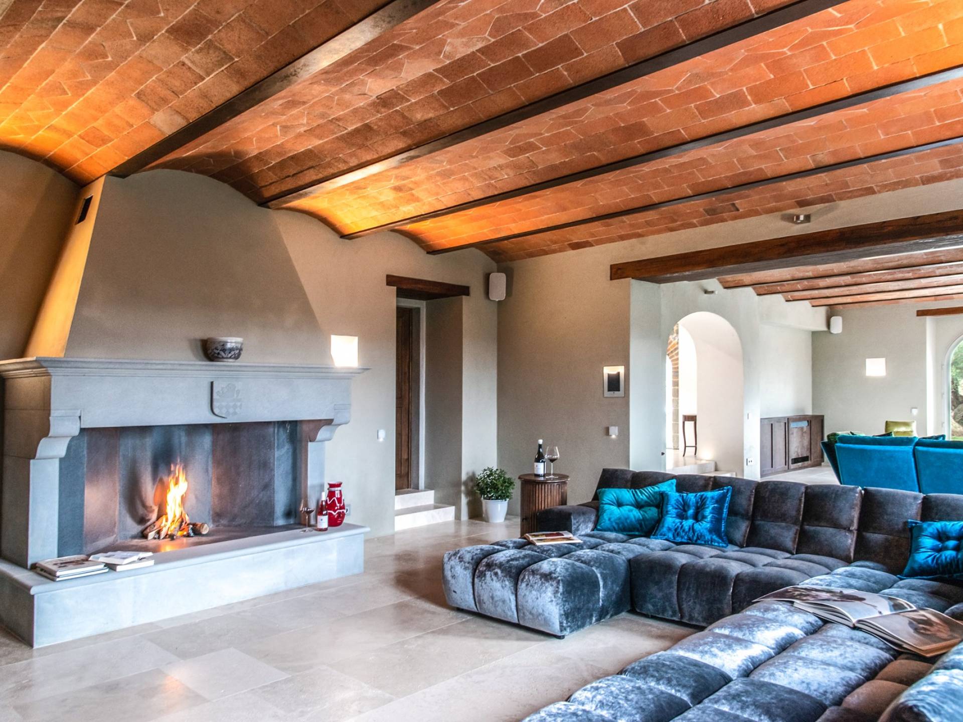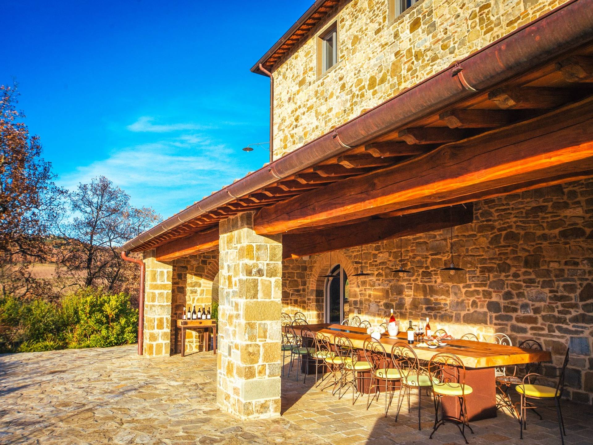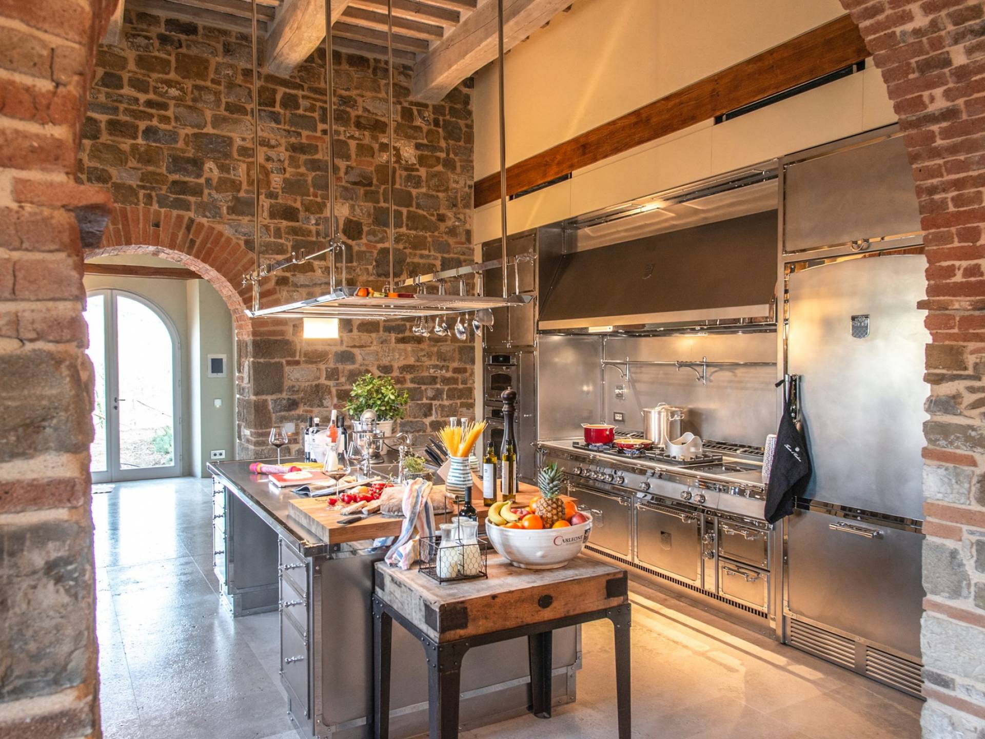 Υπάρχουν καμάρες, θολωτές οροφές, ακανόνιστοι πέτρινοι τοίχοι και μεγάλα παράθυρα που δίνουν φως και θέα στους γύρω λόφους και μαρτυρούν την αιώνια ανάπτυξη που αποσκοπεί σε μια ατμόσφαιρα γαλήνης και ηρεμίας. Αριστερά από τη βίλα, υπάρχει η κουζίνα που οδηγεί σε αίθριο με μπάρμπεκιου, φούρνο για πίτσα και τραπεζαρία "στο ύπαιθρο". Σε αυτήν την πλευρά, υπάρχει ο κήπος με πισίνα, ομπρέλες, ξαπλώστρες και παιδικά παιχνίδια. Στην άλλη πλευρά της βίλας, υπάρχει ένα υπέροχο κιόσκι με τραπέζια και καρέκλες, ιδανικό για πρωινό με γαλήνη και ησυχία. Τα κρασιά Carleone του αμπελώνα έχουν λάβει πολλά βραβεία και το ελαιόλαδο είναι υπέροχο.