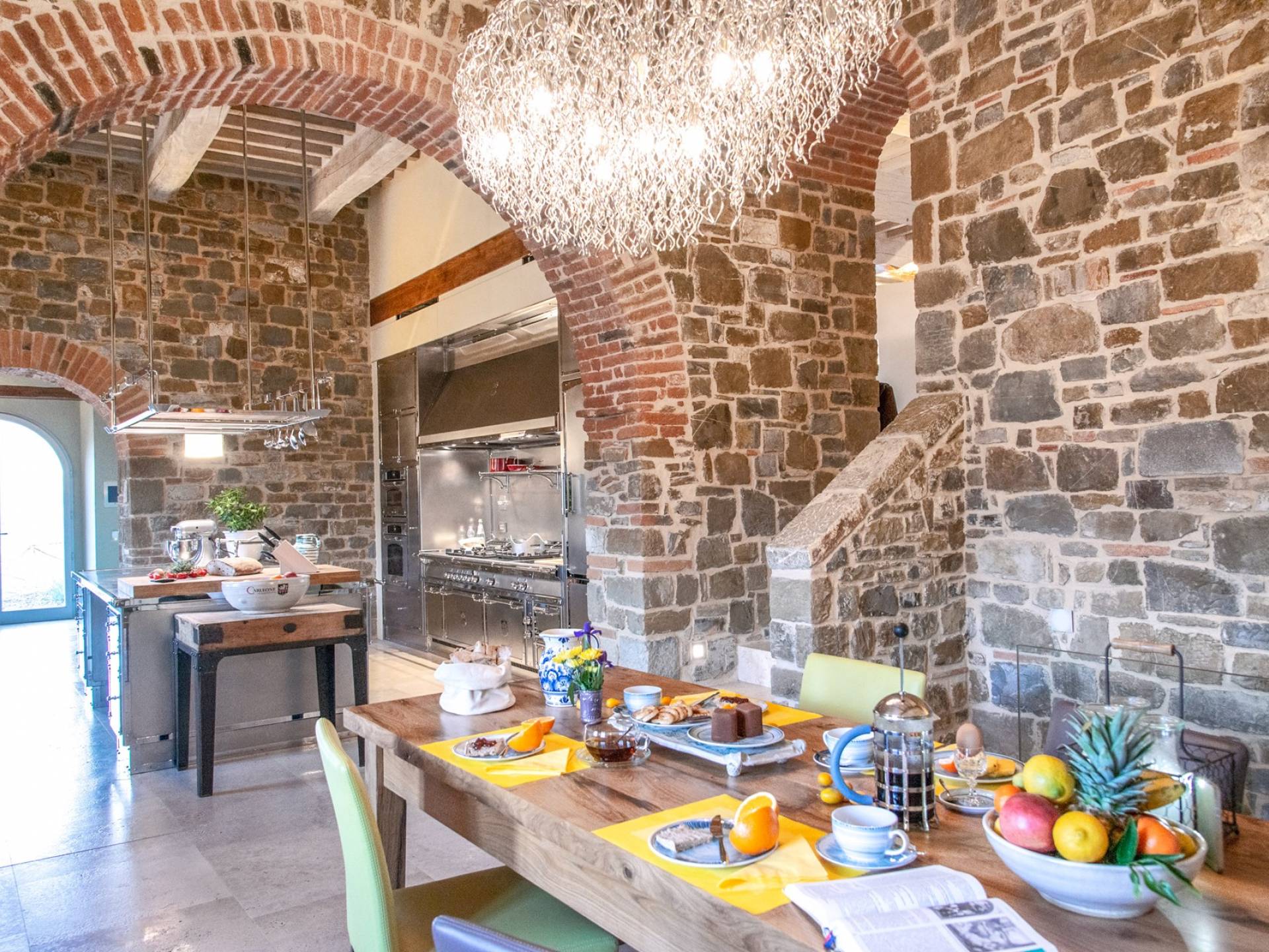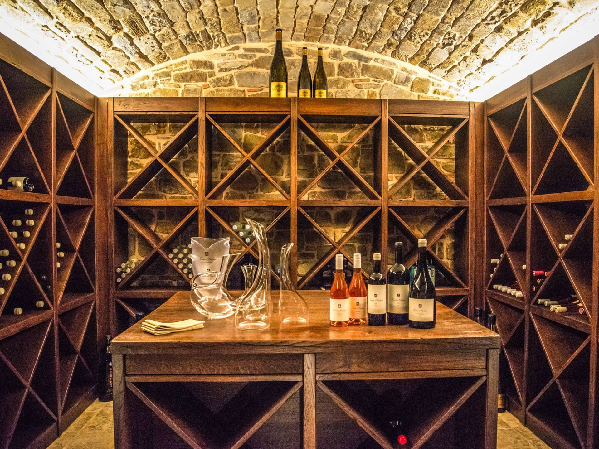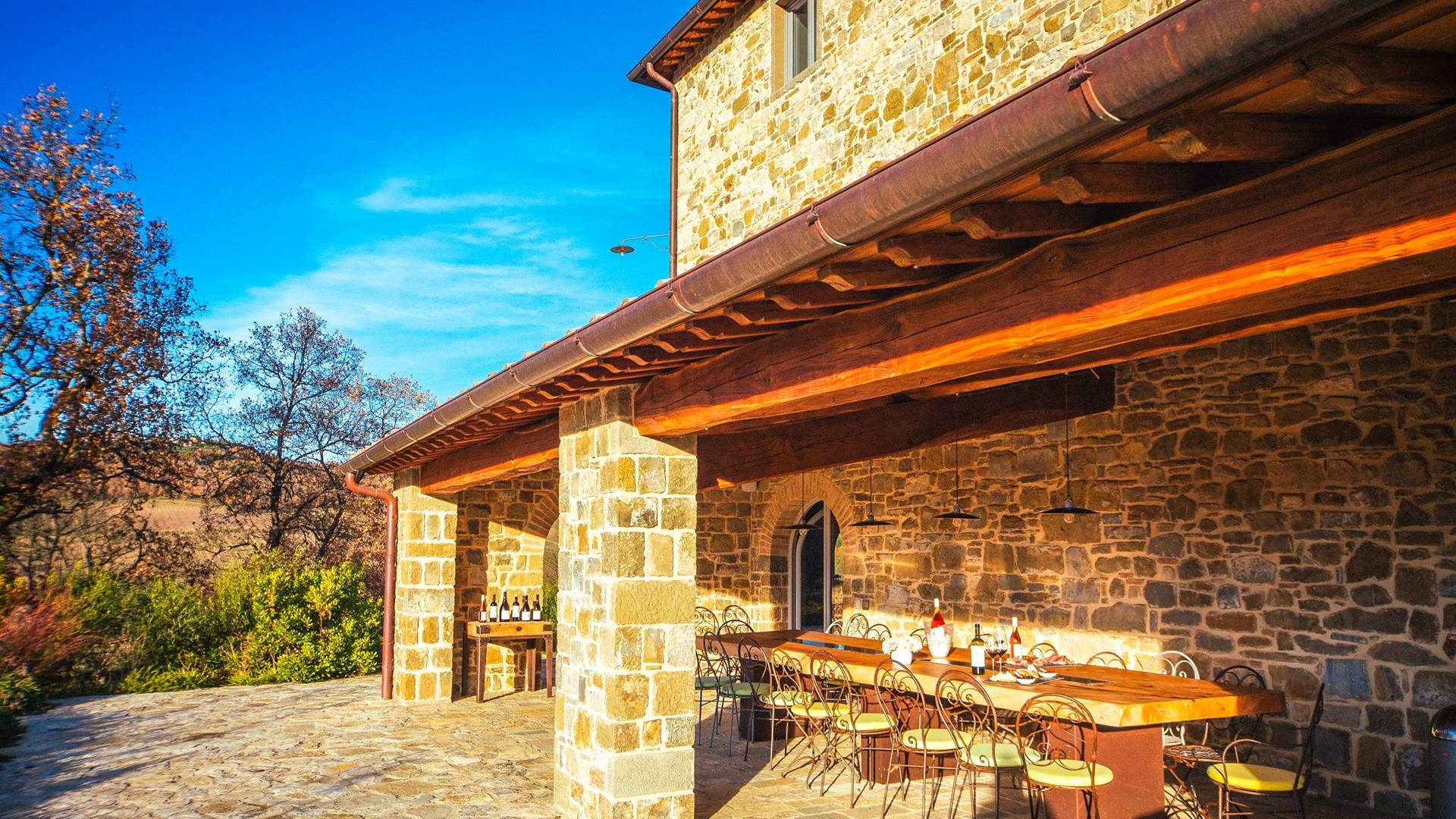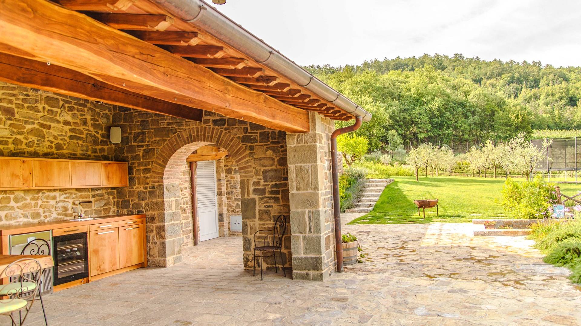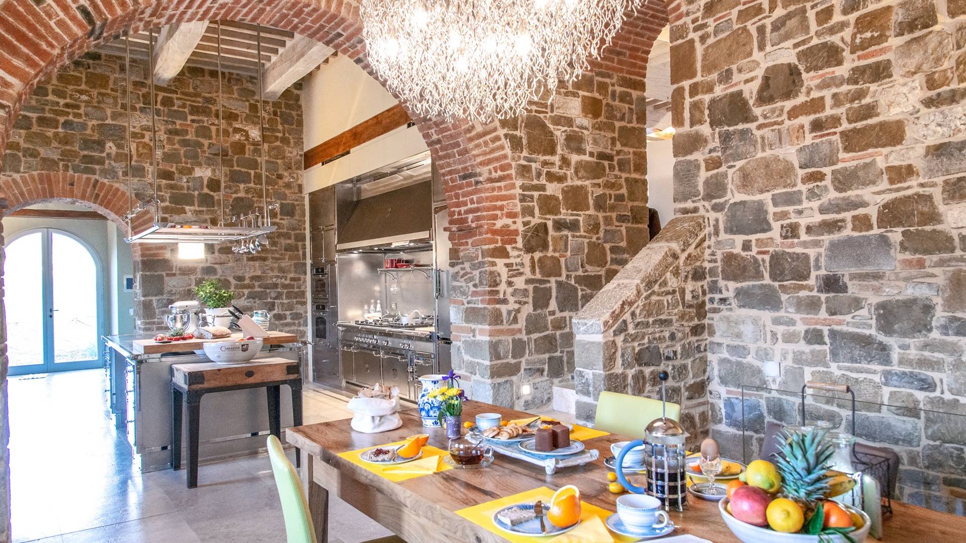 Υπάρχουν καμάρες, θολωτές οροφές, ακανόνιστοι πέτρινοι τοίχοι και μεγάλα παράθυρα που δίνουν φως και θέα στους γύρω λόφους και μαρτυρούν την αιώνια ανάπτυξη που αποσκοπεί σε μια ατμόσφαιρα γαλήνης και ηρεμίας. Αριστερά από τη βίλα, υπάρχει η κουζίνα που οδηγεί σε αίθριο με μπάρμπεκιου, φούρνο για πίτσα και τραπεζαρία "στο ύπαιθρο". Σε αυτήν την πλευρά, υπάρχει ο κήπος με πισίνα, ομπρέλες, ξαπλώστρες και παιδικά παιχνίδια. Στην άλλη πλευρά της βίλας, υπάρχει ένα υπέροχο κιόσκι με τραπέζια και καρέκλες, ιδανικό για πρωινό με γαλήνη και ησυχία. Τα κρασιά Carleone του αμπελώνα έχουν λάβει πολλά βραβεία και το ελαιόλαδο είναι υπέροχο.