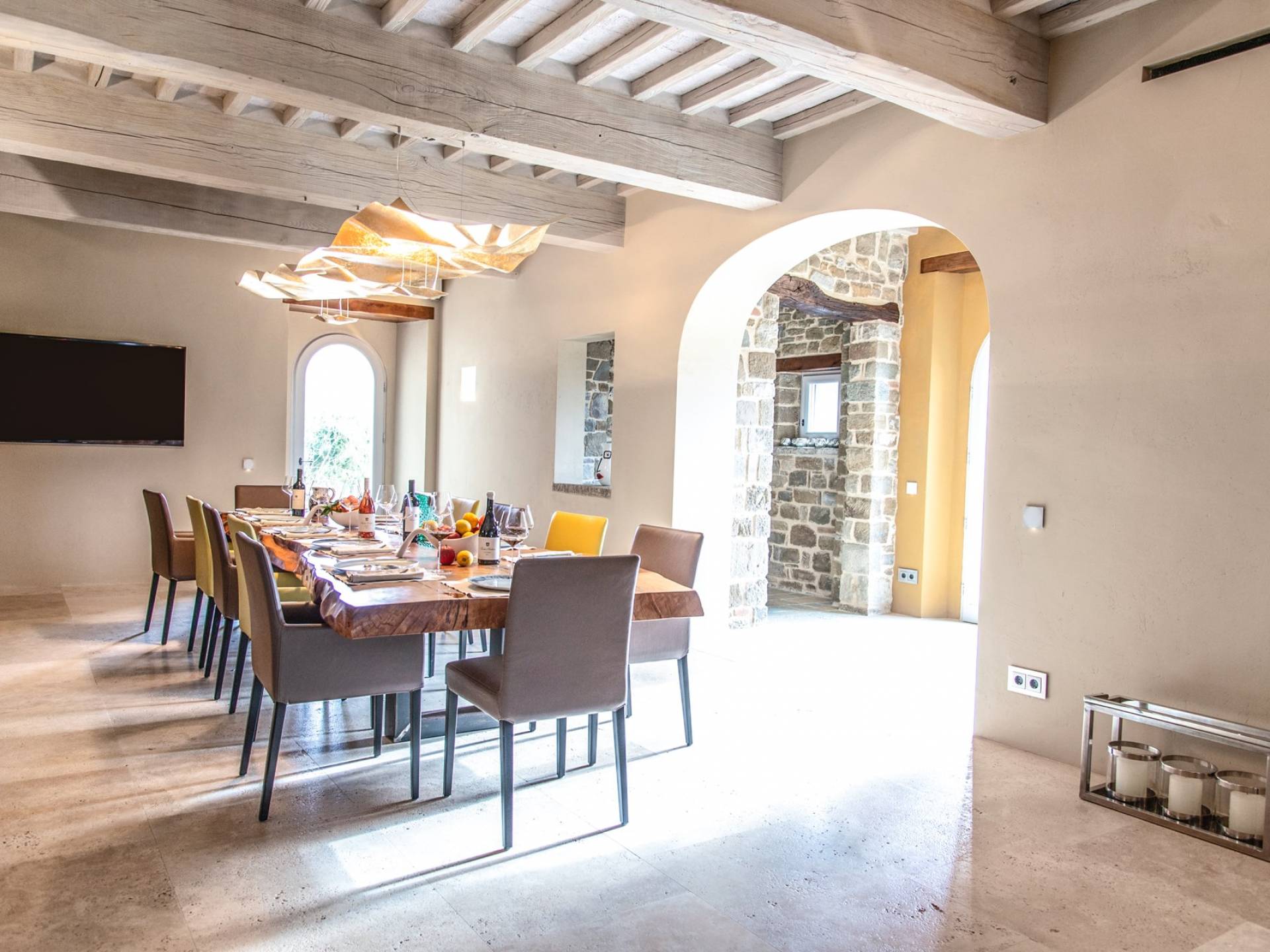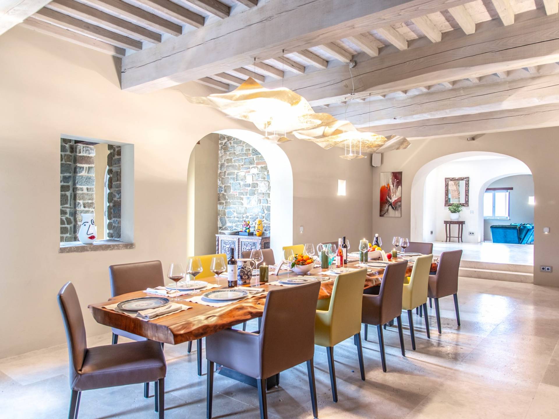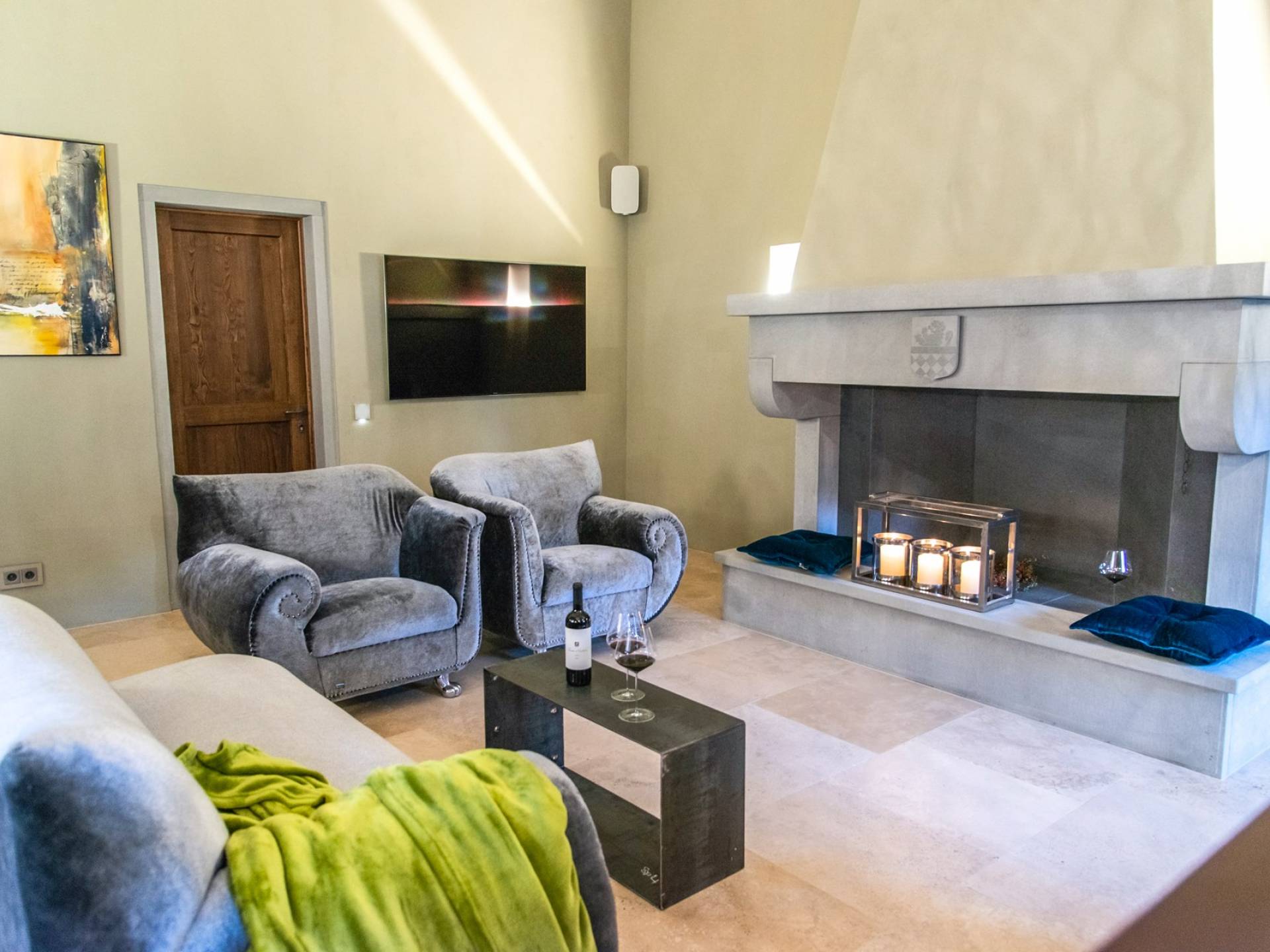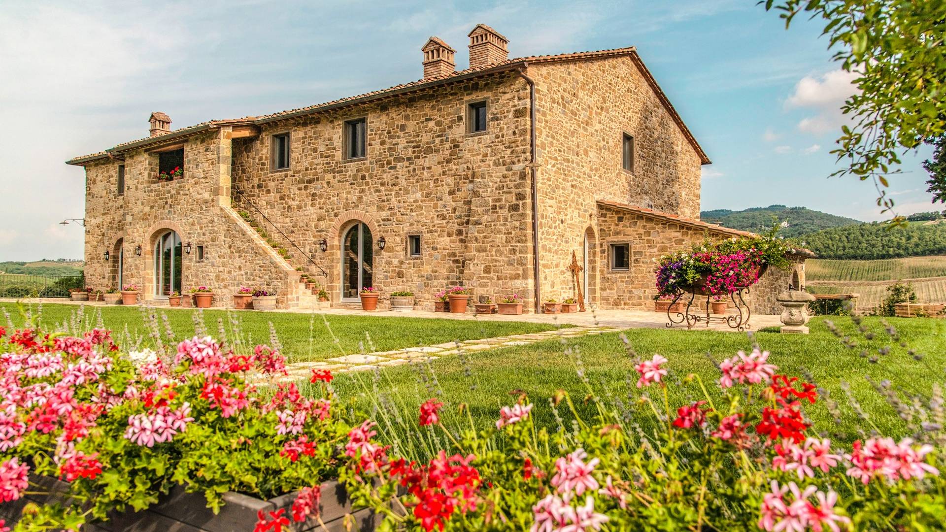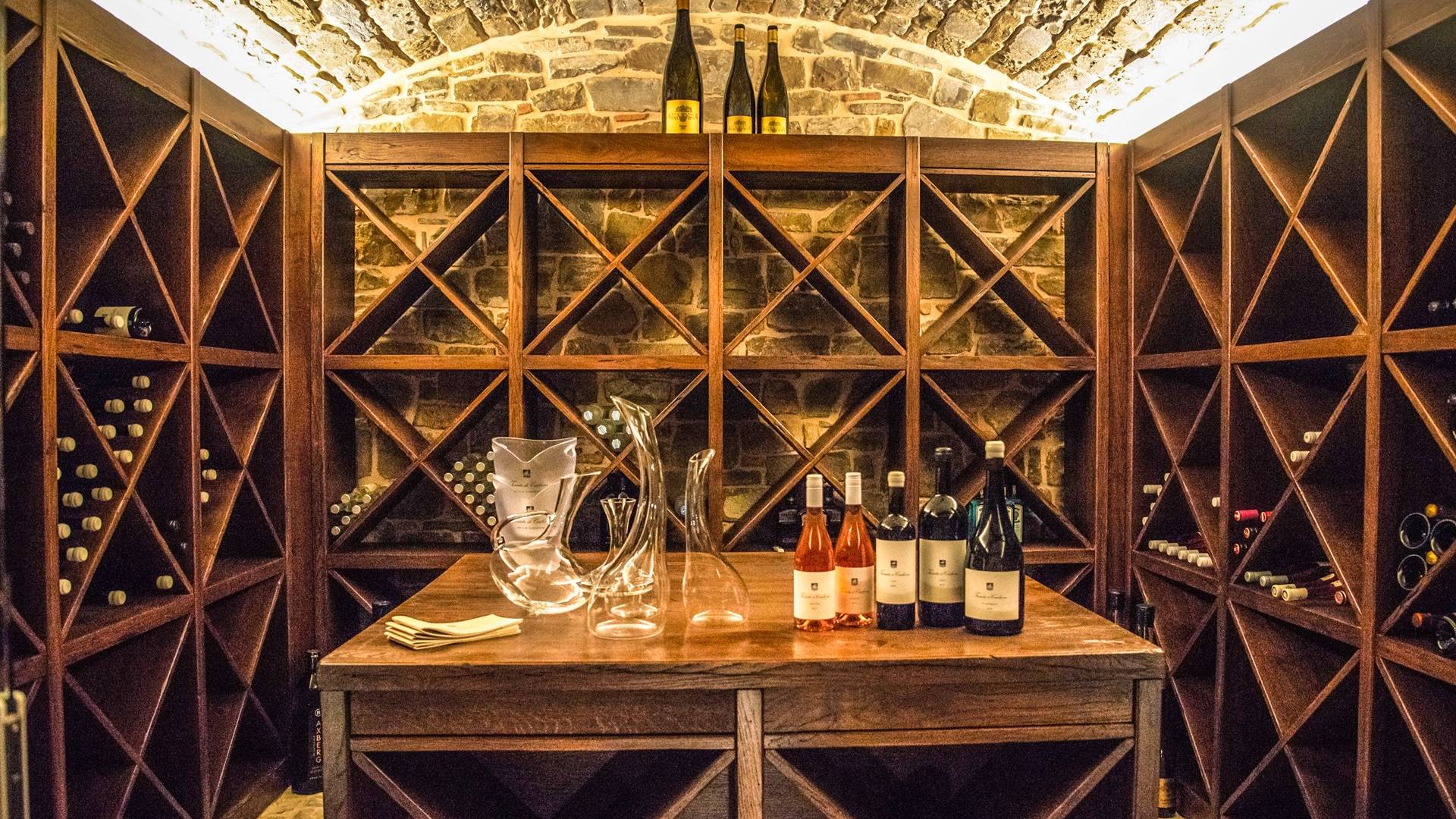 Υπάρχουν καμάρες, θολωτές οροφές, ακανόνιστοι πέτρινοι τοίχοι και μεγάλα παράθυρα που δίνουν φως και θέα στους γύρω λόφους και μαρτυρούν την αιώνια ανάπτυξη που αποσκοπεί σε μια ατμόσφαιρα γαλήνης και ηρεμίας. Αριστερά από τη βίλα, υπάρχει η κουζίνα που οδηγεί σε αίθριο με μπάρμπεκιου, φούρνο για πίτσα και τραπεζαρία "στο ύπαιθρο". Σε αυτήν την πλευρά, υπάρχει ο κήπος με πισίνα, ομπρέλες, ξαπλώστρες και παιδικά παιχνίδια. Στην άλλη πλευρά της βίλας, υπάρχει ένα υπέροχο κιόσκι με τραπέζια και καρέκλες, ιδανικό για πρωινό με γαλήνη και ησυχία. Τα κρασιά Carleone του αμπελώνα έχουν λάβει πολλά βραβεία και το ελαιόλαδο είναι υπέροχο.