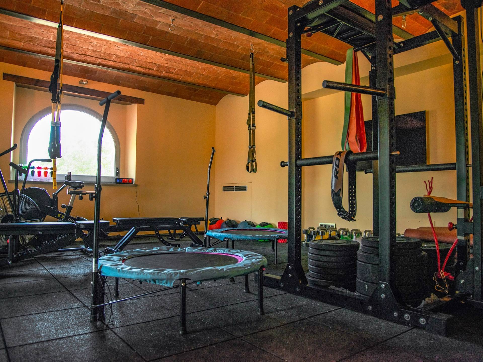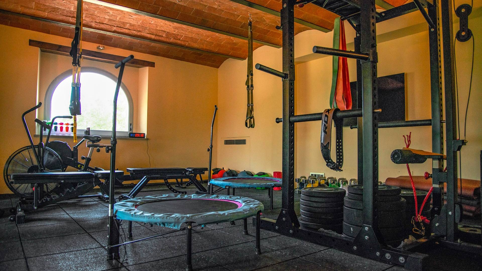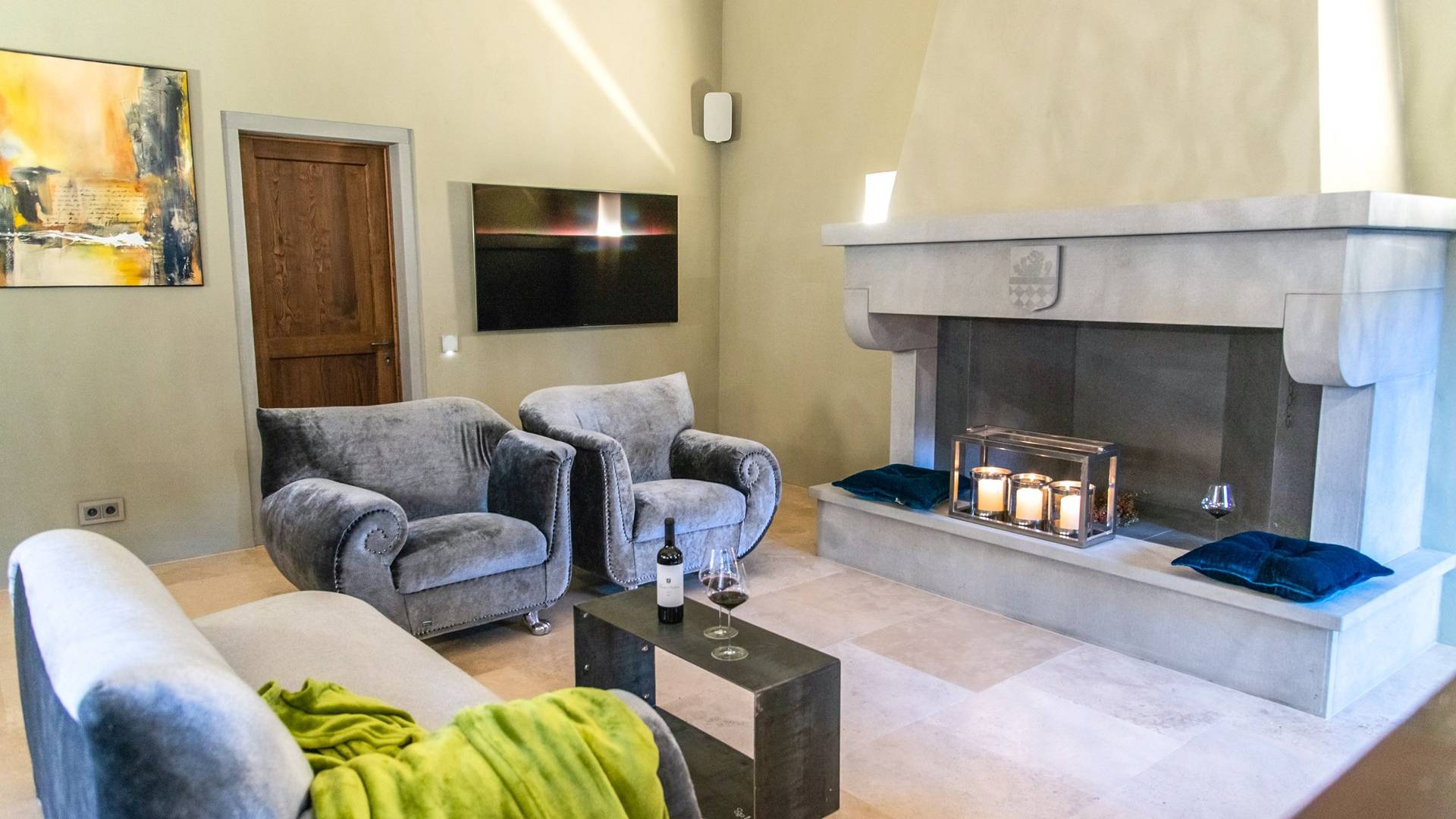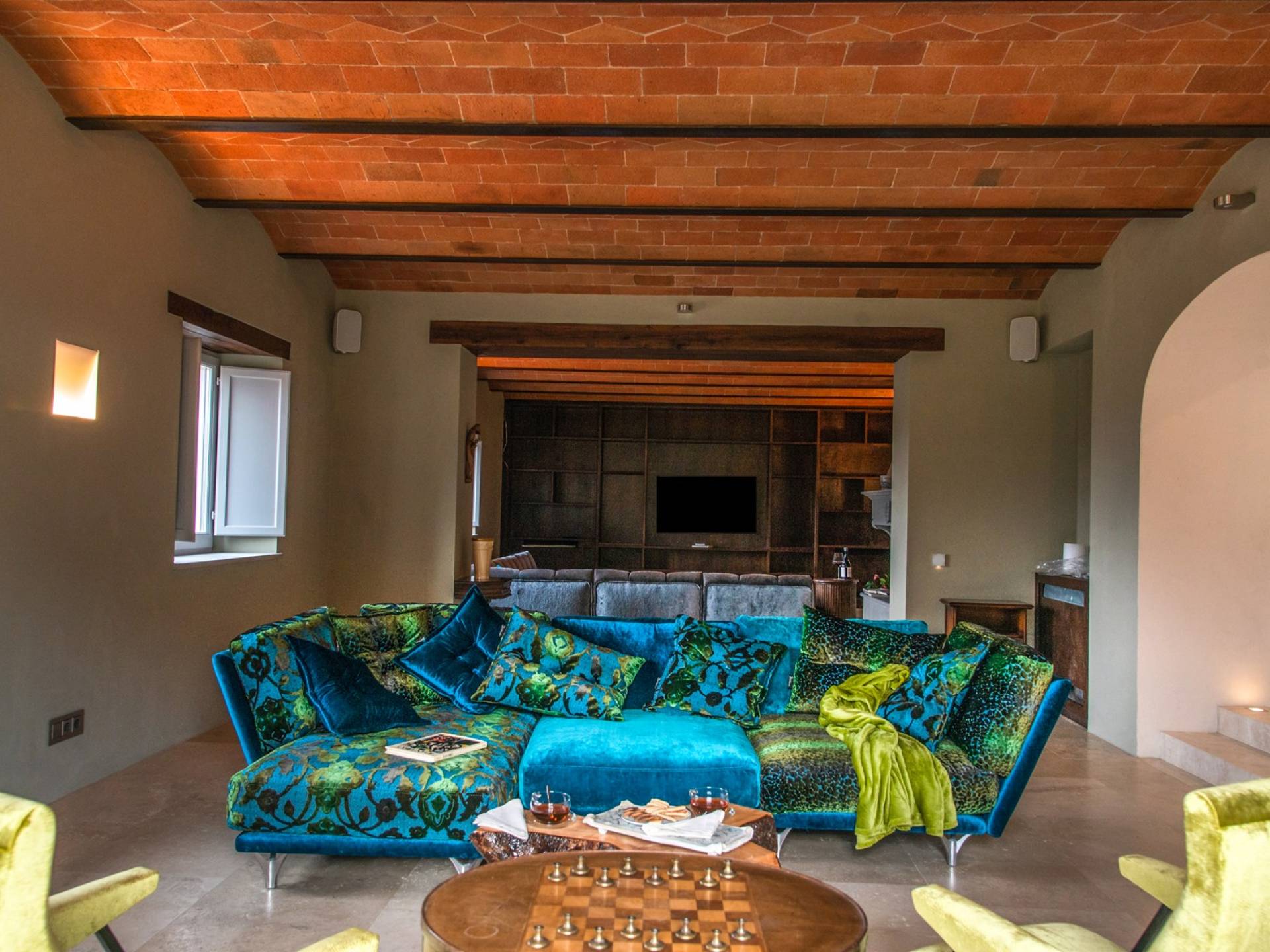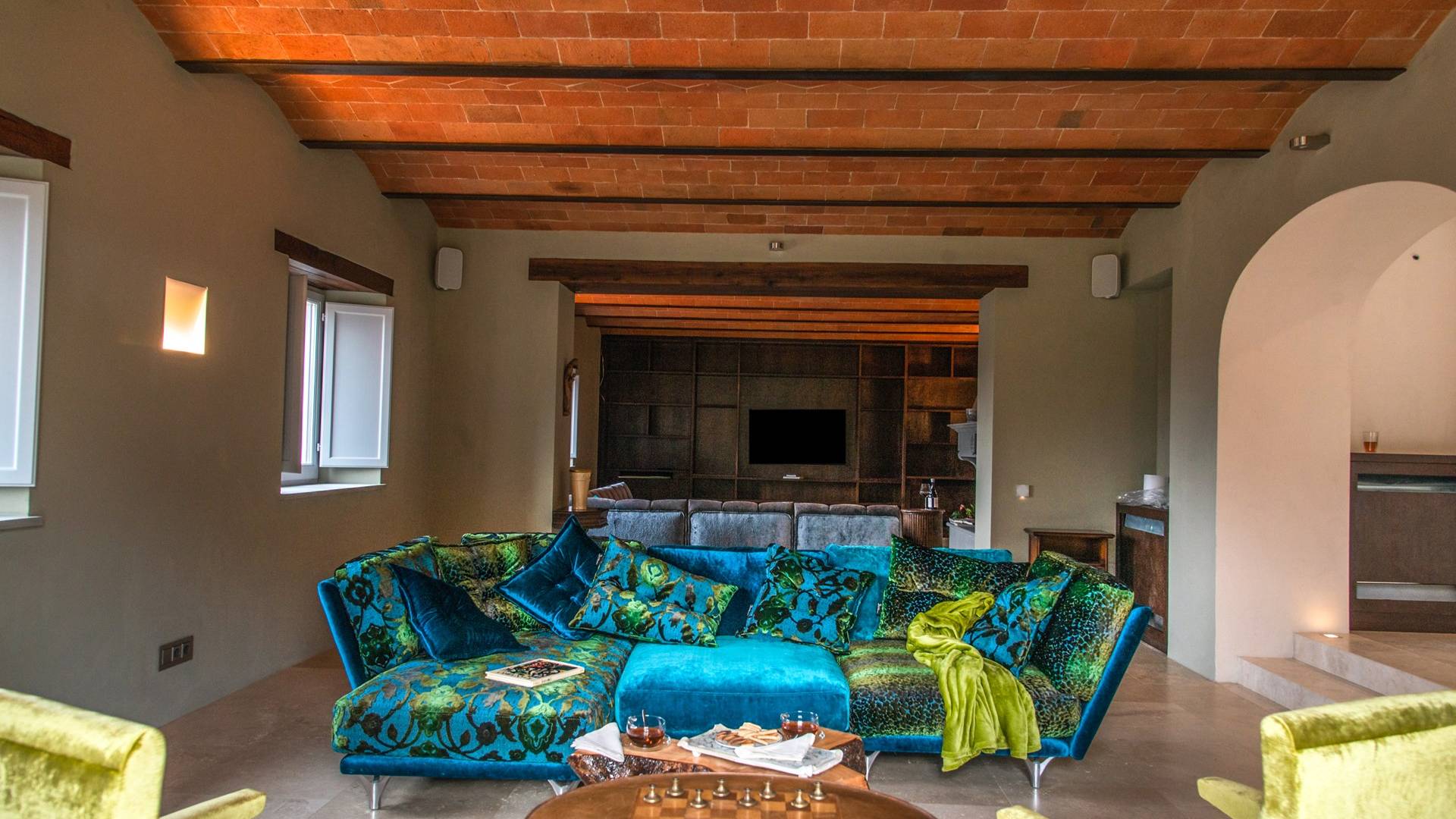 Υπάρχουν καμάρες, θολωτές οροφές, ακανόνιστοι πέτρινοι τοίχοι και μεγάλα παράθυρα που δίνουν φως και θέα στους γύρω λόφους και μαρτυρούν την αιώνια ανάπτυξη που αποσκοπεί σε μια ατμόσφαιρα γαλήνης και ηρεμίας. Αριστερά από τη βίλα, υπάρχει η κουζίνα που οδηγεί σε αίθριο με μπάρμπεκιου, φούρνο για πίτσα και τραπεζαρία "στο ύπαιθρο". Σε αυτήν την πλευρά, υπάρχει ο κήπος με πισίνα, ομπρέλες, ξαπλώστρες και παιδικά παιχνίδια. Στην άλλη πλευρά της βίλας, υπάρχει ένα υπέροχο κιόσκι με τραπέζια και καρέκλες, ιδανικό για πρωινό με γαλήνη και ησυχία. Τα κρασιά Carleone του αμπελώνα έχουν λάβει πολλά βραβεία και το ελαιόλαδο είναι υπέροχο.