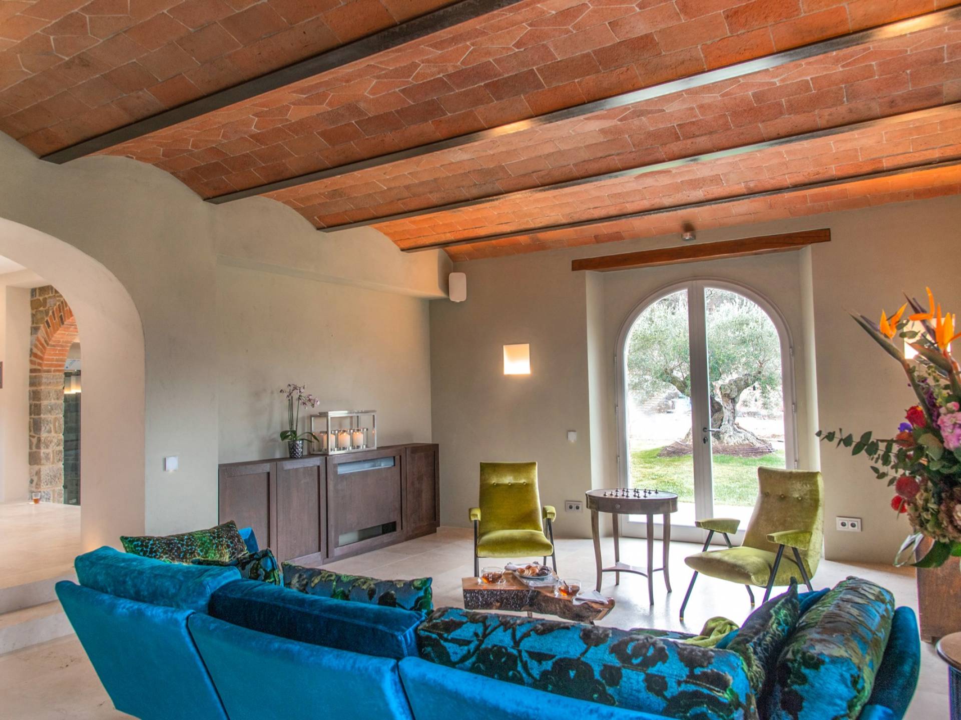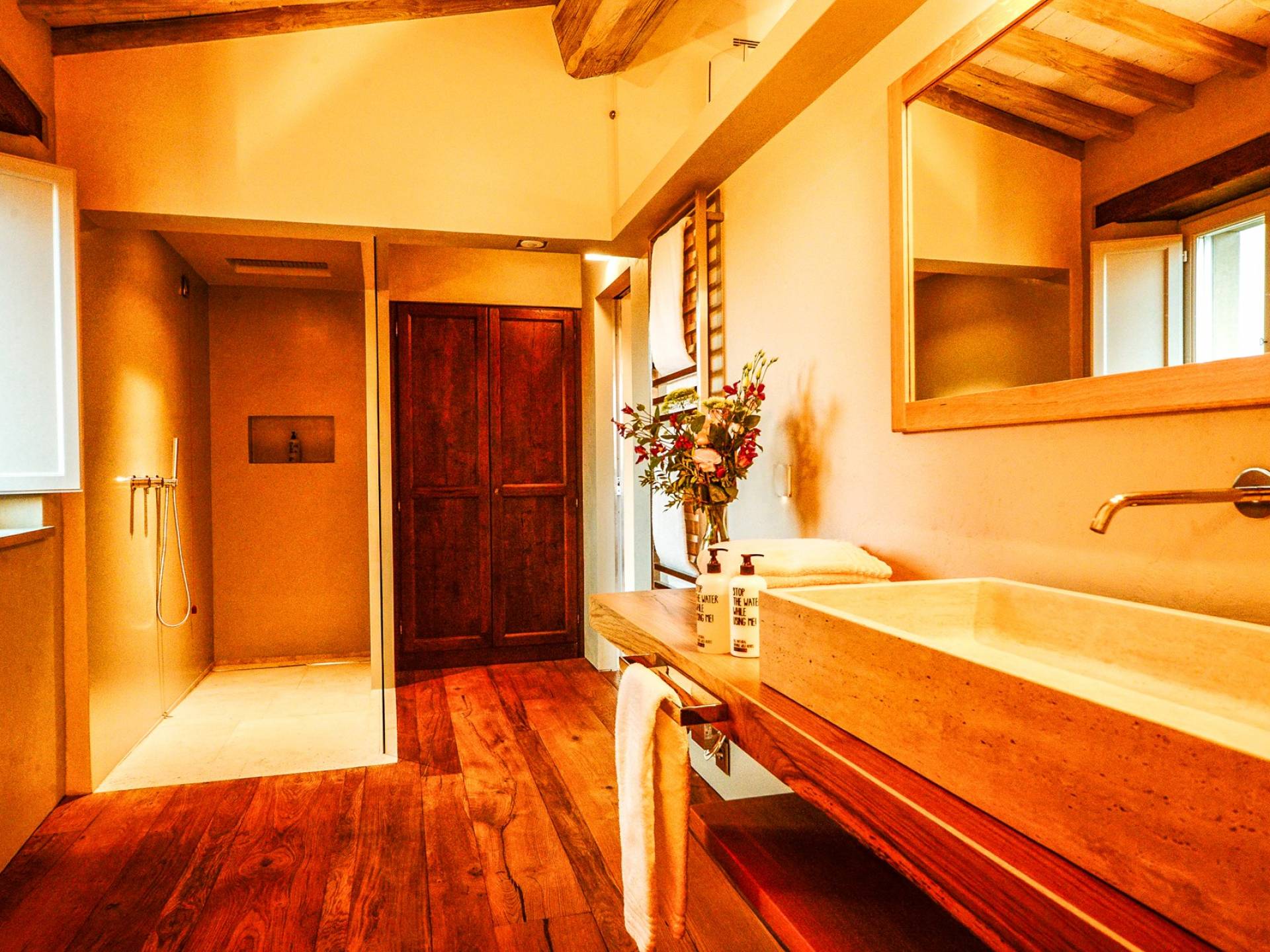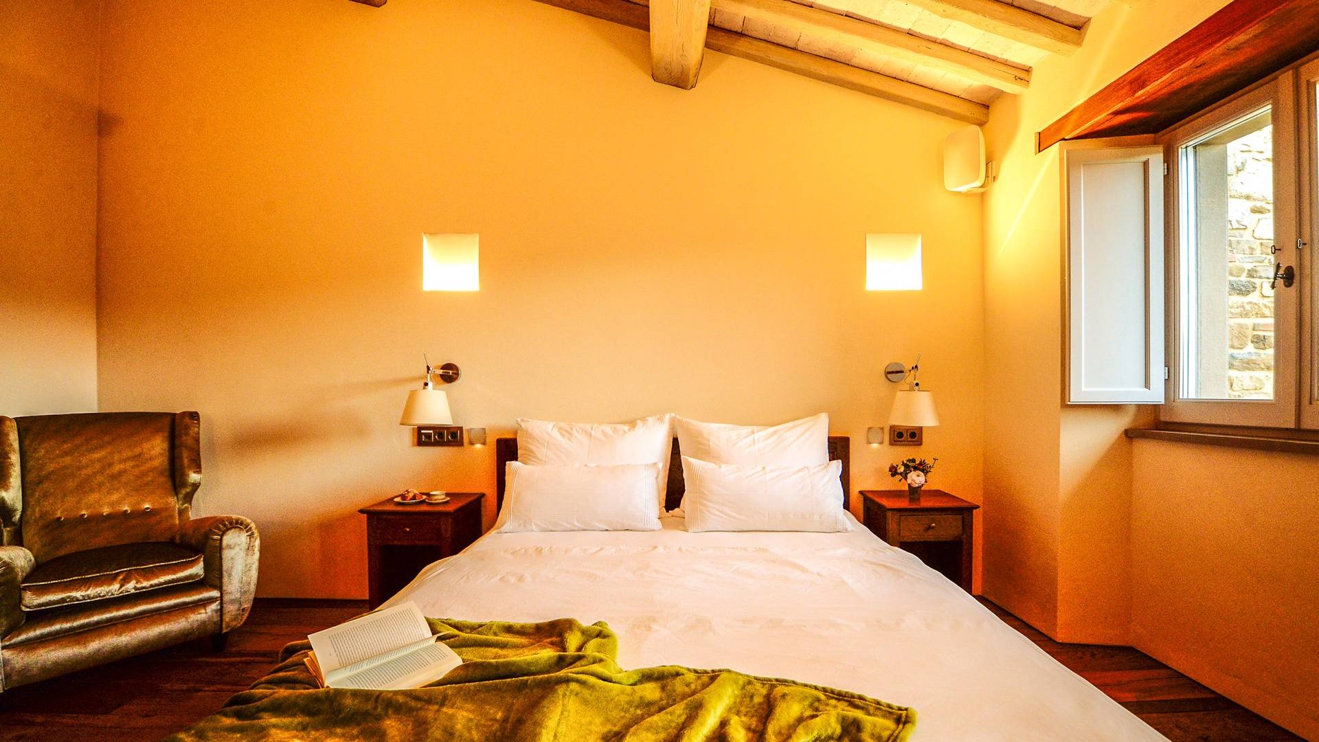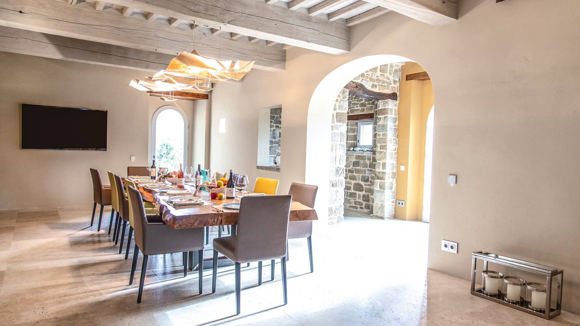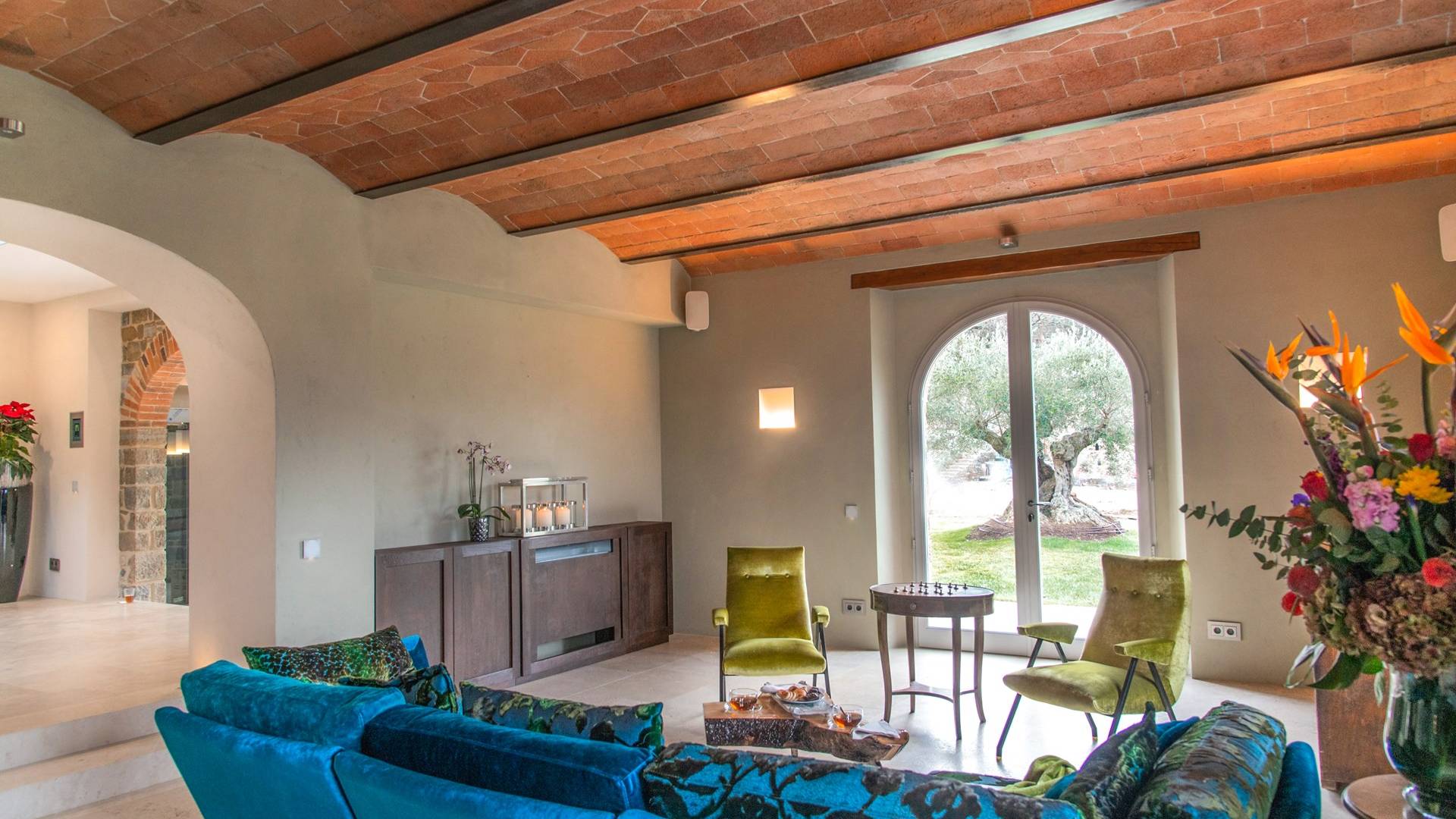 Υπάρχουν καμάρες, θολωτές οροφές, ακανόνιστοι πέτρινοι τοίχοι και μεγάλα παράθυρα που δίνουν φως και θέα στους γύρω λόφους και μαρτυρούν την αιώνια ανάπτυξη που αποσκοπεί σε μια ατμόσφαιρα γαλήνης και ηρεμίας. Αριστερά από τη βίλα, υπάρχει η κουζίνα που οδηγεί σε αίθριο με μπάρμπεκιου, φούρνο για πίτσα και τραπεζαρία "στο ύπαιθρο". Σε αυτήν την πλευρά, υπάρχει ο κήπος με πισίνα, ομπρέλες, ξαπλώστρες και παιδικά παιχνίδια. Στην άλλη πλευρά της βίλας, υπάρχει ένα υπέροχο κιόσκι με τραπέζια και καρέκλες, ιδανικό για πρωινό με γαλήνη και ησυχία. Τα κρασιά Carleone του αμπελώνα έχουν λάβει πολλά βραβεία και το ελαιόλαδο είναι υπέροχο.