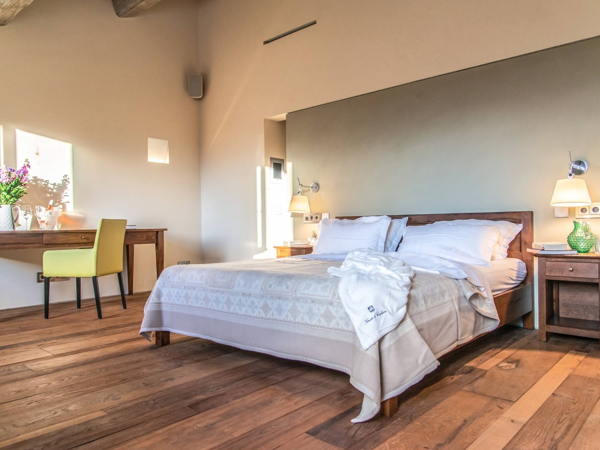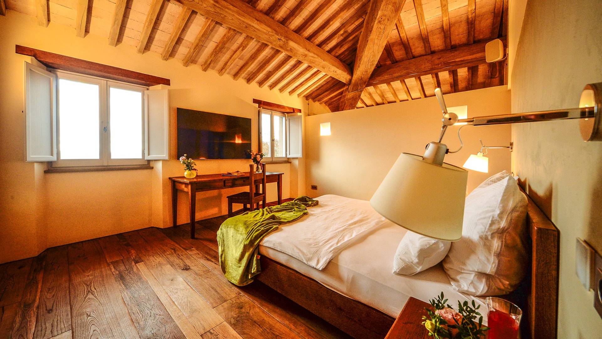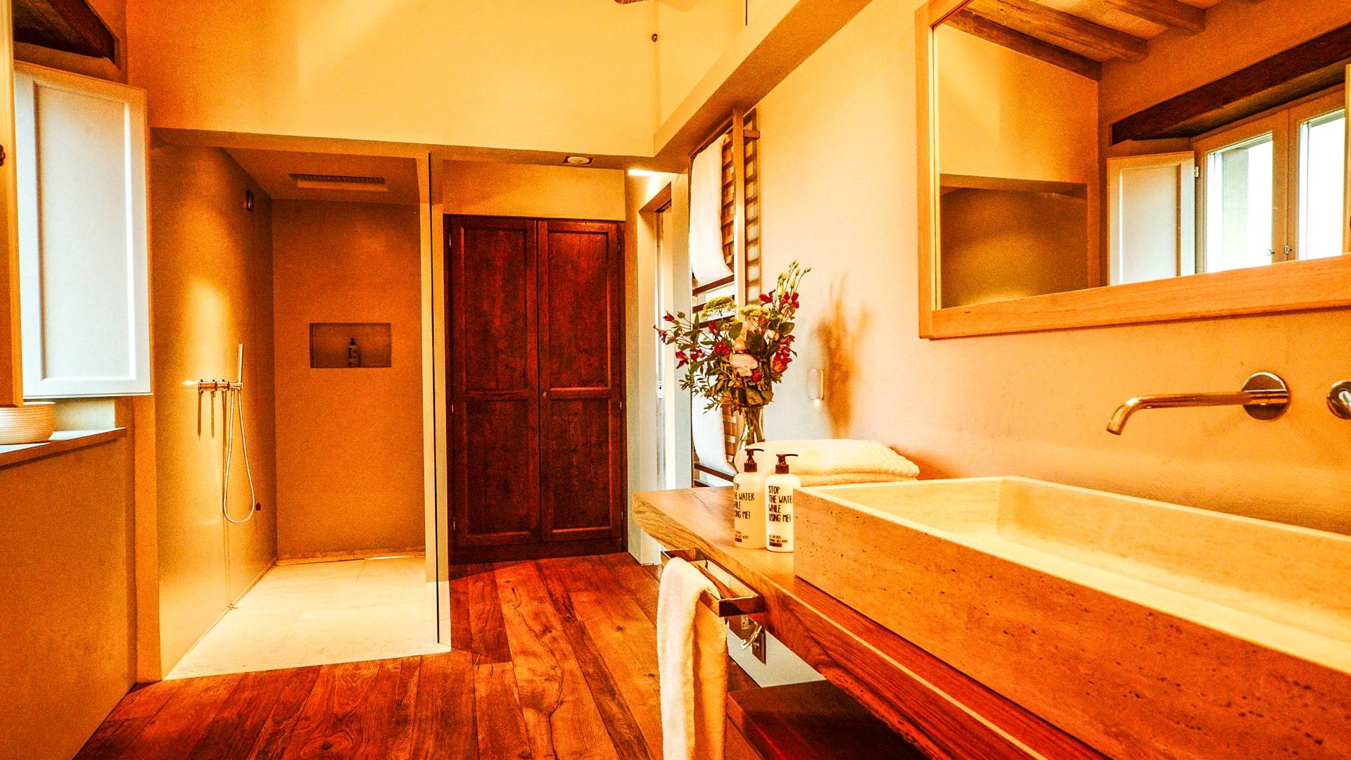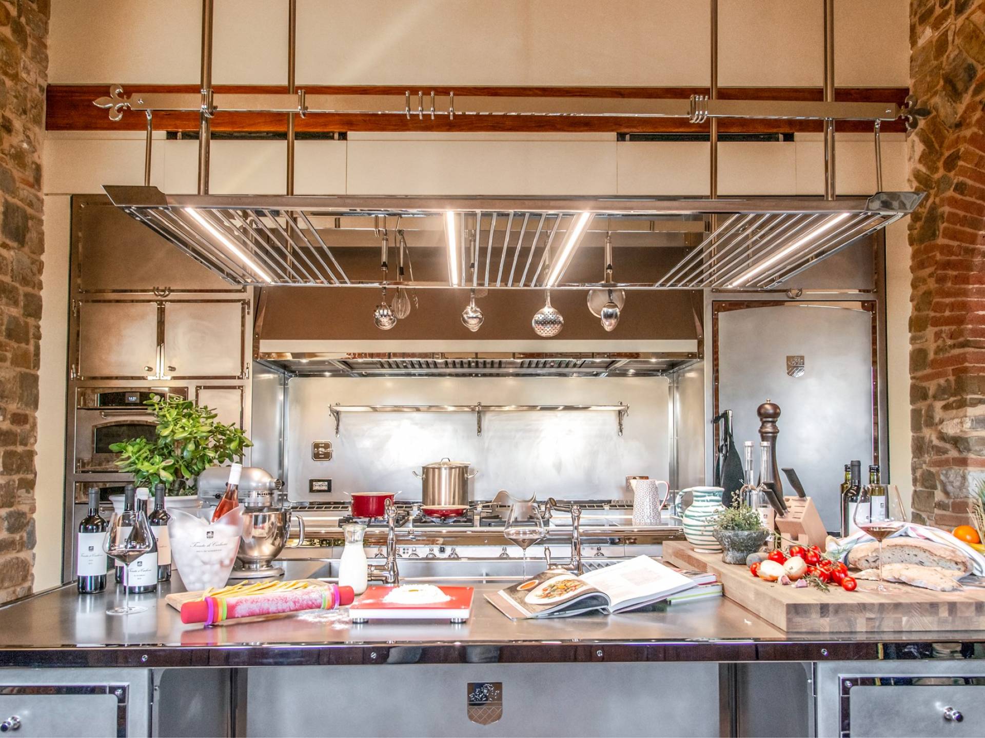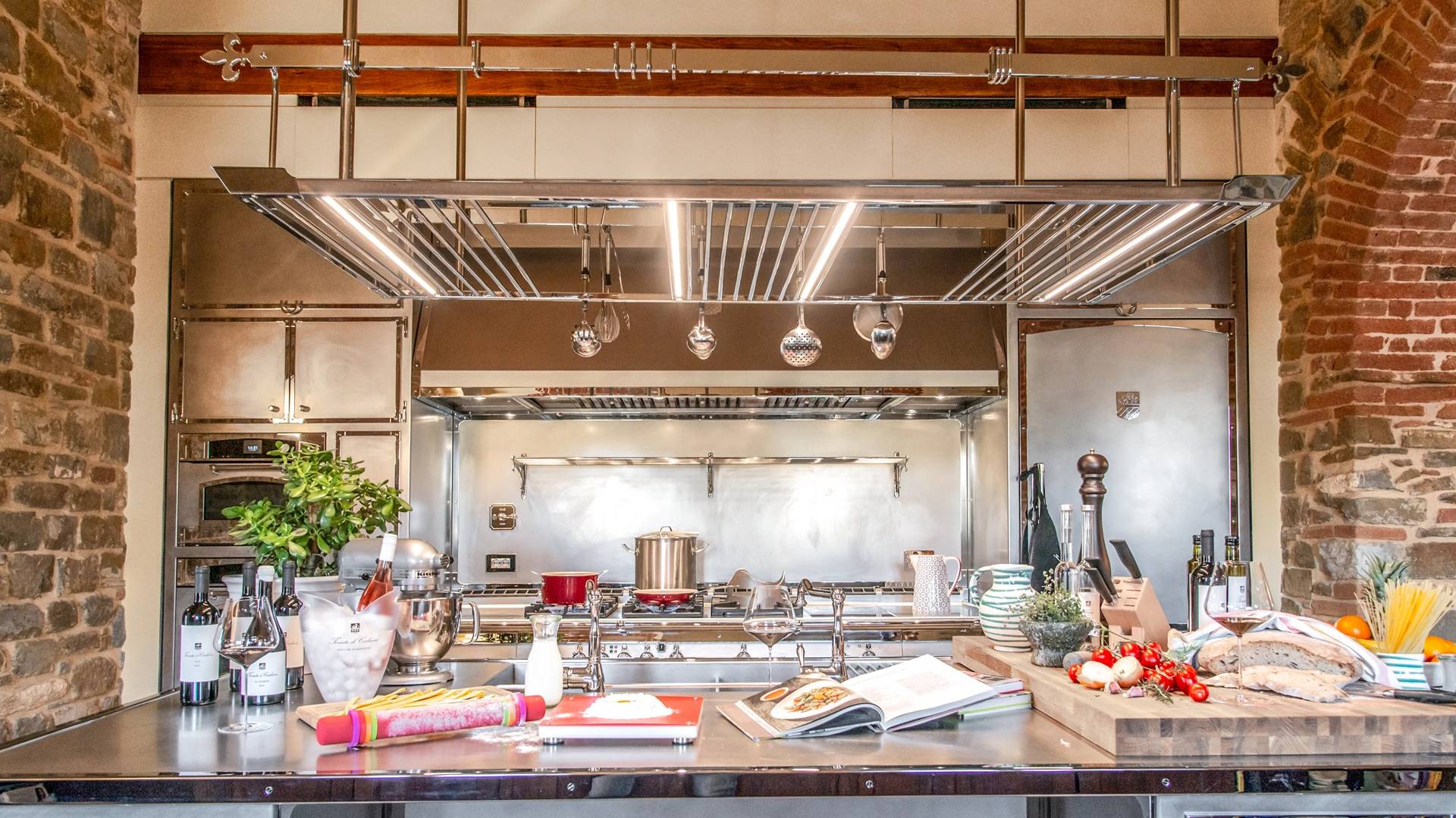 Υπάρχουν καμάρες, θολωτές οροφές, ακανόνιστοι πέτρινοι τοίχοι και μεγάλα παράθυρα που δίνουν φως και θέα στους γύρω λόφους και μαρτυρούν την αιώνια ανάπτυξη που αποσκοπεί σε μια ατμόσφαιρα γαλήνης και ηρεμίας. Αριστερά από τη βίλα, υπάρχει η κουζίνα που οδηγεί σε αίθριο με μπάρμπεκιου, φούρνο για πίτσα και τραπεζαρία "στο ύπαιθρο". Σε αυτήν την πλευρά, υπάρχει ο κήπος με πισίνα, ομπρέλες, ξαπλώστρες και παιδικά παιχνίδια. Στην άλλη πλευρά της βίλας, υπάρχει ένα υπέροχο κιόσκι με τραπέζια και καρέκλες, ιδανικό για πρωινό με γαλήνη και ησυχία. Τα κρασιά Carleone του αμπελώνα έχουν λάβει πολλά βραβεία και το ελαιόλαδο είναι υπέροχο.