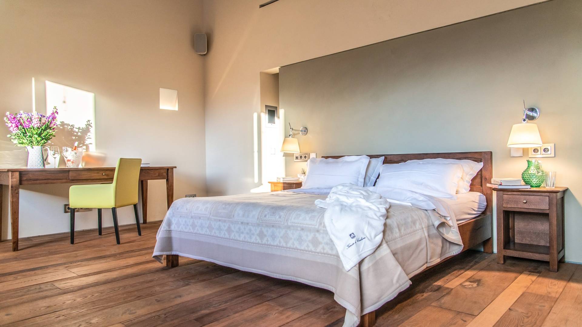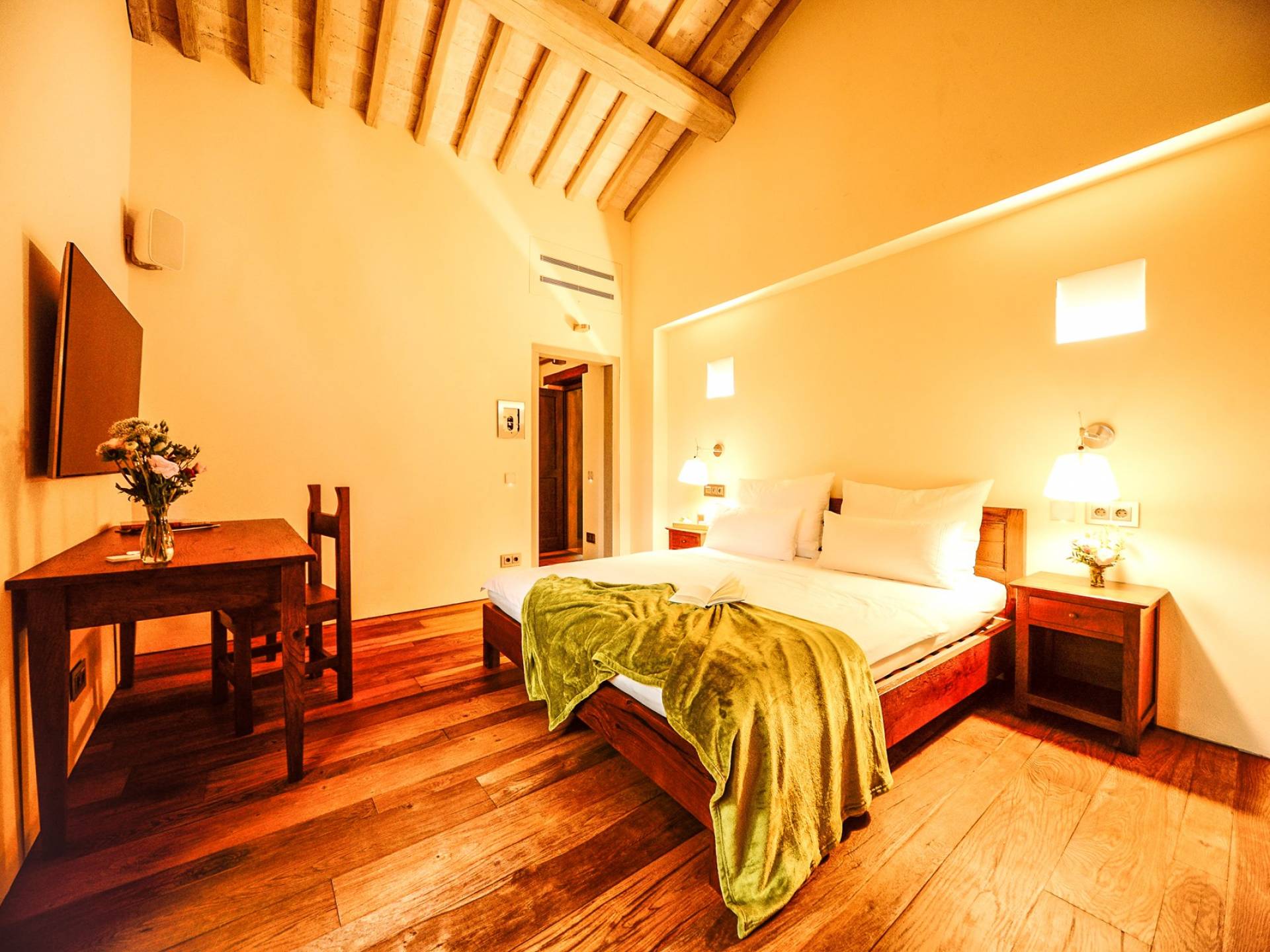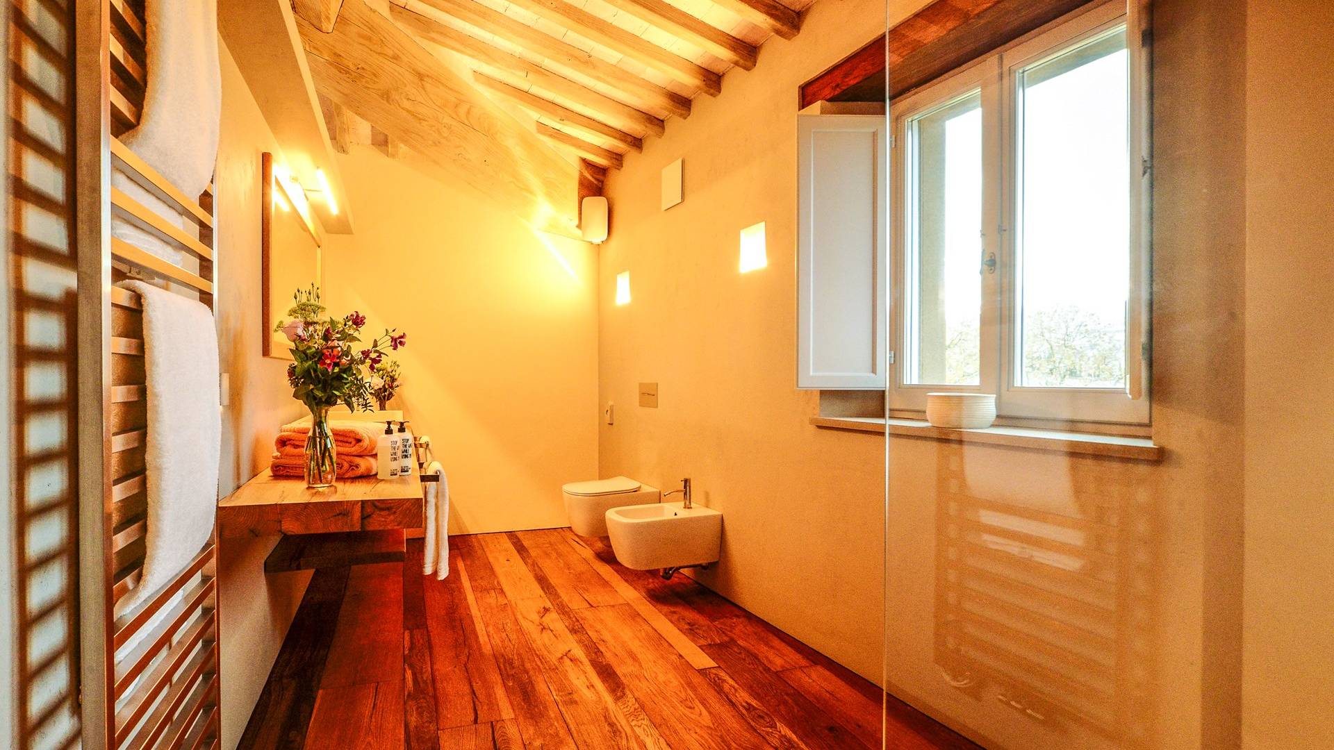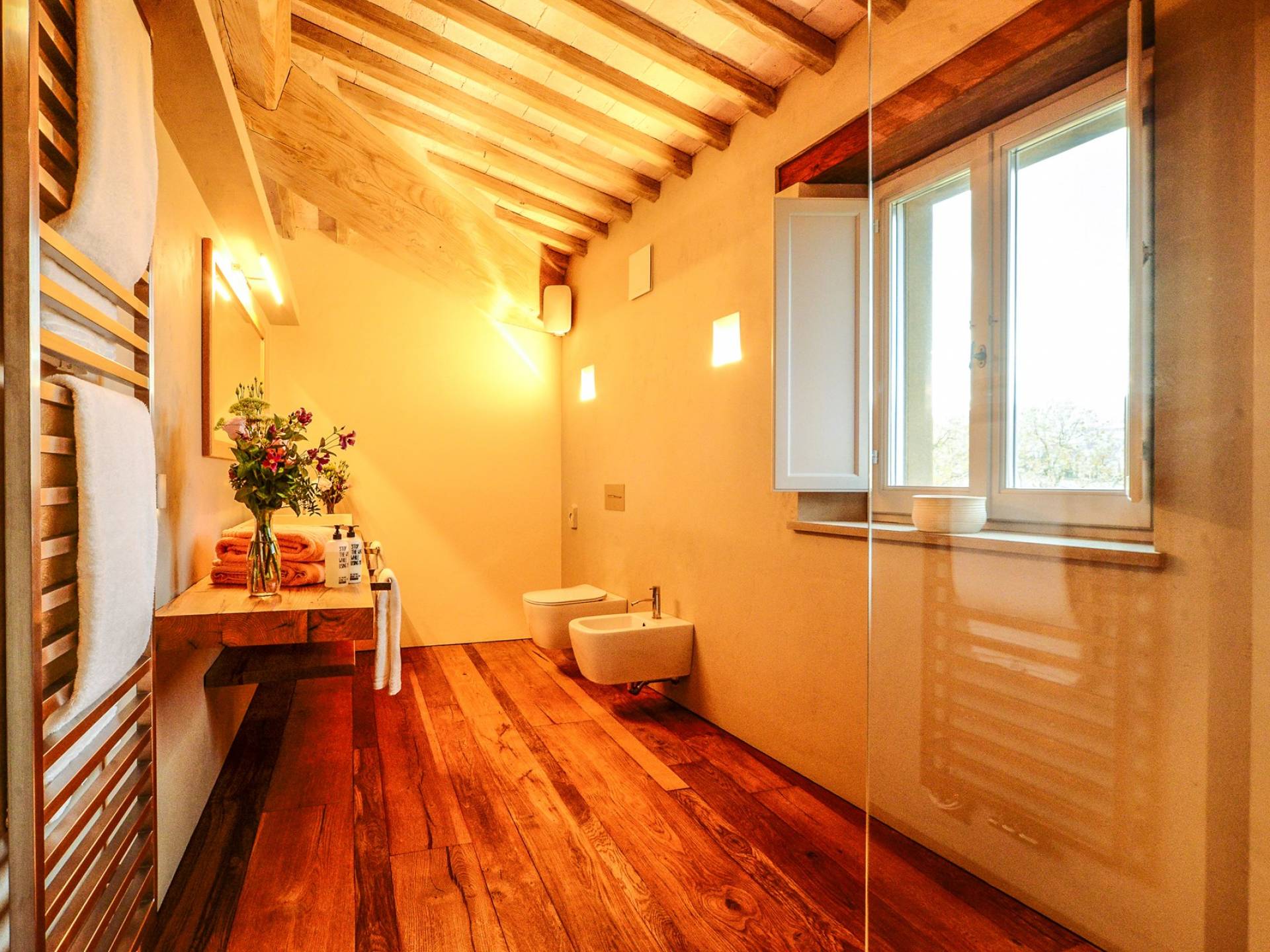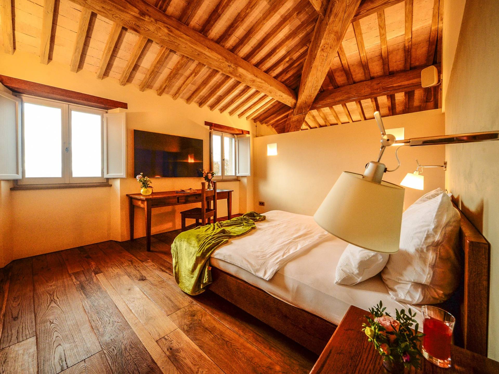 Υπάρχουν καμάρες, θολωτές οροφές, ακανόνιστοι πέτρινοι τοίχοι και μεγάλα παράθυρα που δίνουν φως και θέα στους γύρω λόφους και μαρτυρούν την αιώνια ανάπτυξη που αποσκοπεί σε μια ατμόσφαιρα γαλήνης και ηρεμίας. Αριστερά από τη βίλα, υπάρχει η κουζίνα που οδηγεί σε αίθριο με μπάρμπεκιου, φούρνο για πίτσα και τραπεζαρία "στο ύπαιθρο". Σε αυτήν την πλευρά, υπάρχει ο κήπος με πισίνα, ομπρέλες, ξαπλώστρες και παιδικά παιχνίδια. Στην άλλη πλευρά της βίλας, υπάρχει ένα υπέροχο κιόσκι με τραπέζια και καρέκλες, ιδανικό για πρωινό με γαλήνη και ησυχία. Τα κρασιά Carleone του αμπελώνα έχουν λάβει πολλά βραβεία και το ελαιόλαδο είναι υπέροχο.