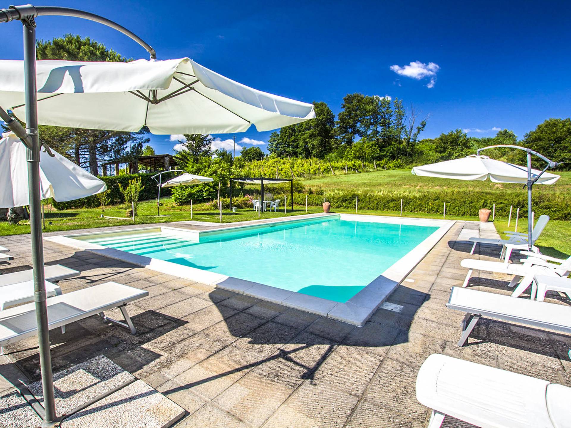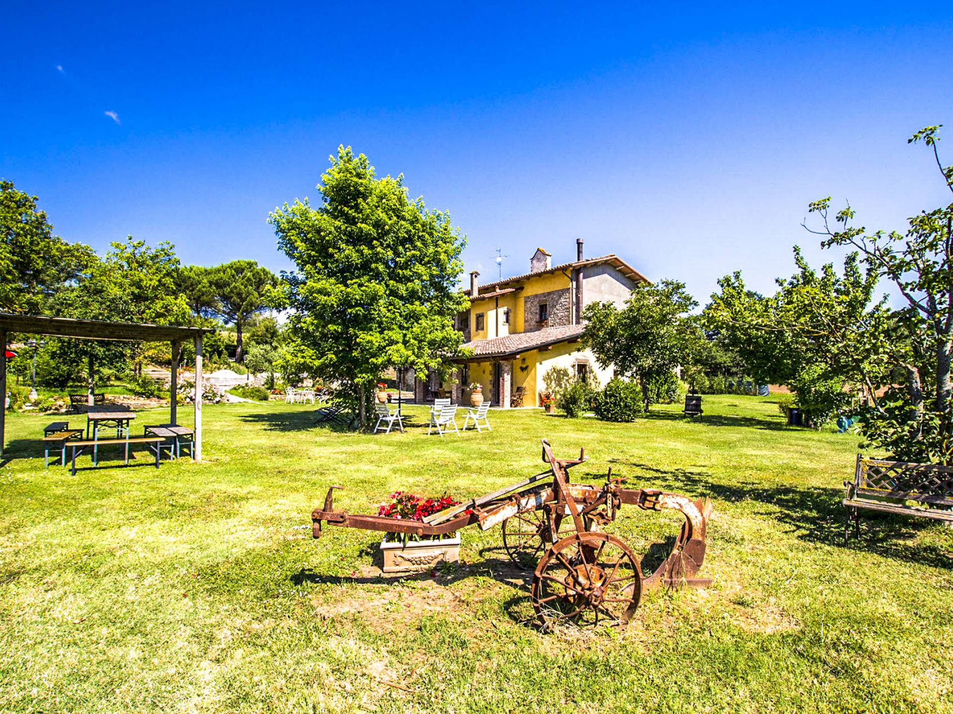 Έξω από το κτήμα, υπάρχει μια μεγάλη και άνετη πισίνα (7 x 14 μέτρα) που περιβάλλεται από έναν καταπράσινο κήπο. Η πισίνα περιβάλλεται από ένα σολάριουμ εξοπλισμένο με ομπρέλες και ξαπλώστρες και κιόσκι με τραπέζια και καρέκλες. Η δομή διαθέτει επίσης μπάρμπεκιου, ξυλόφουρνο, wi-fi, πινγκ-πονγκ, μεγάλο βιολογικό λαχανόκηπο με όλα τα είδη λαχανικών που διατίθενται δωρεάν για τους επισκέπτες και ποδήλατα βουνού για όλους χωρίς επιπλέον κόστος. Στα 300 μέτρα υπάρχει μια μικρή λίμνη για ψάρεμα. Σε κοντινή απόσταση υπάρχει ένα γήπεδο τένις, μια σχολή ιππασίας και ένα εξοπλισμένο αεροδρόμιο για πτήσεις με αεροπλάνα Cesna.