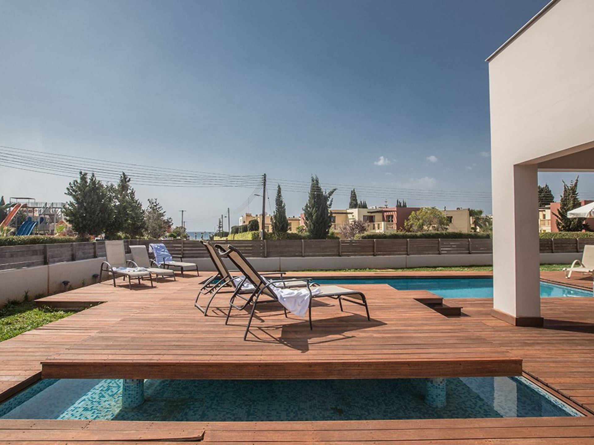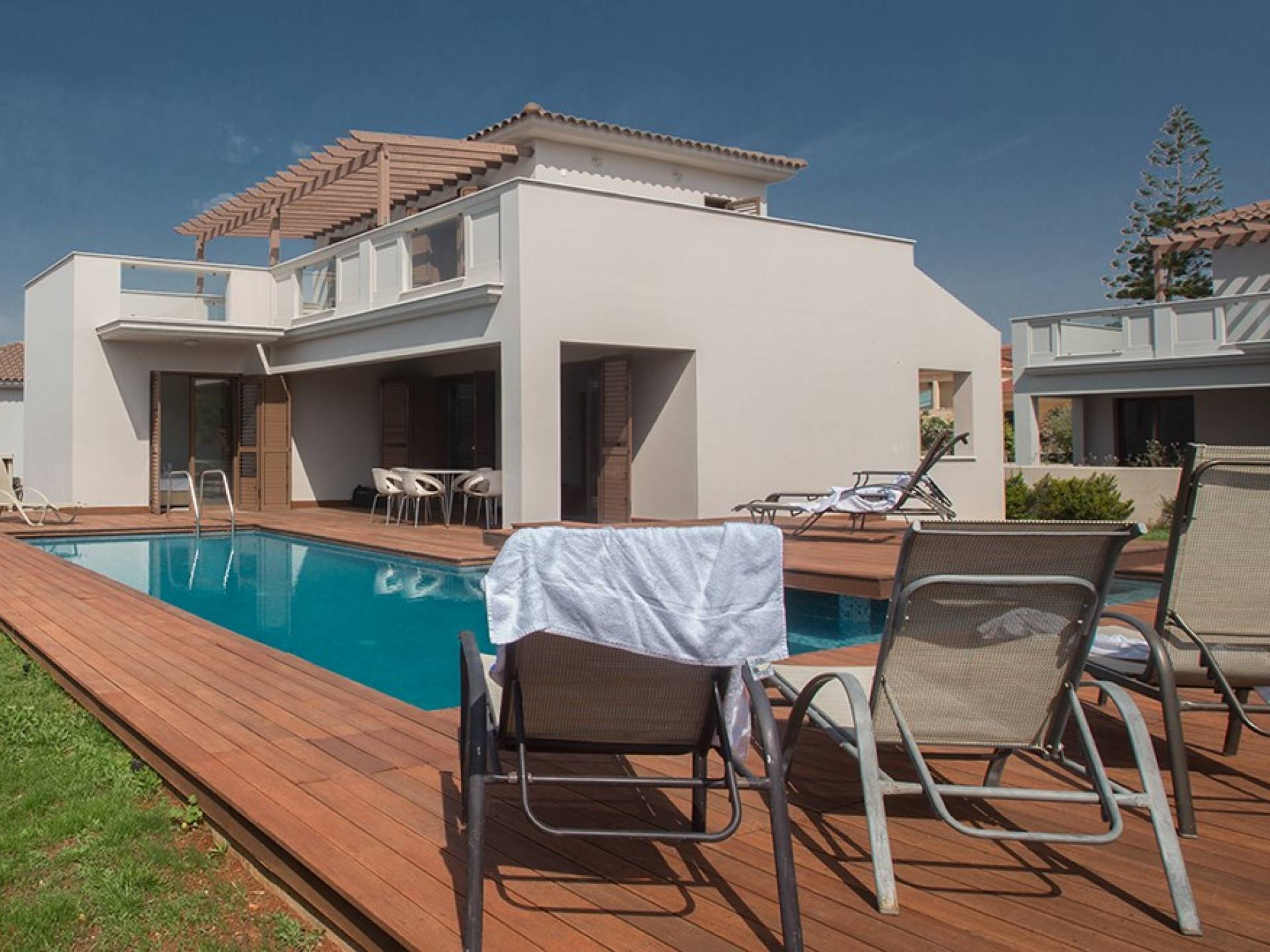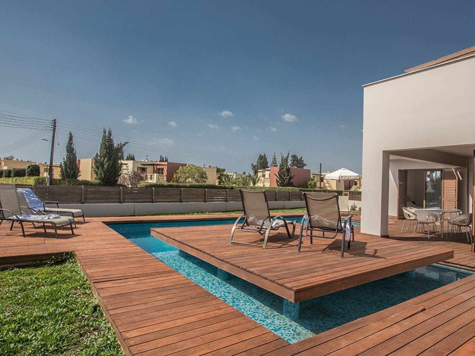 Έξω, η βίλα διαθέτει ευρύχωρο κήπο με μπάρμπεκιου, σκιερή εξωτερική τραπεζαρία, ξαπλώστρες και ιδιωτική πισίνα. Η τέλεια επιλογή για οικογένειες ή φίλους που θέλουν ήρεμες και ήρεμες διακοπές αλλά κοντά στις παραλίες, τις ανέσεις και τη νυχτερινή ζωή.