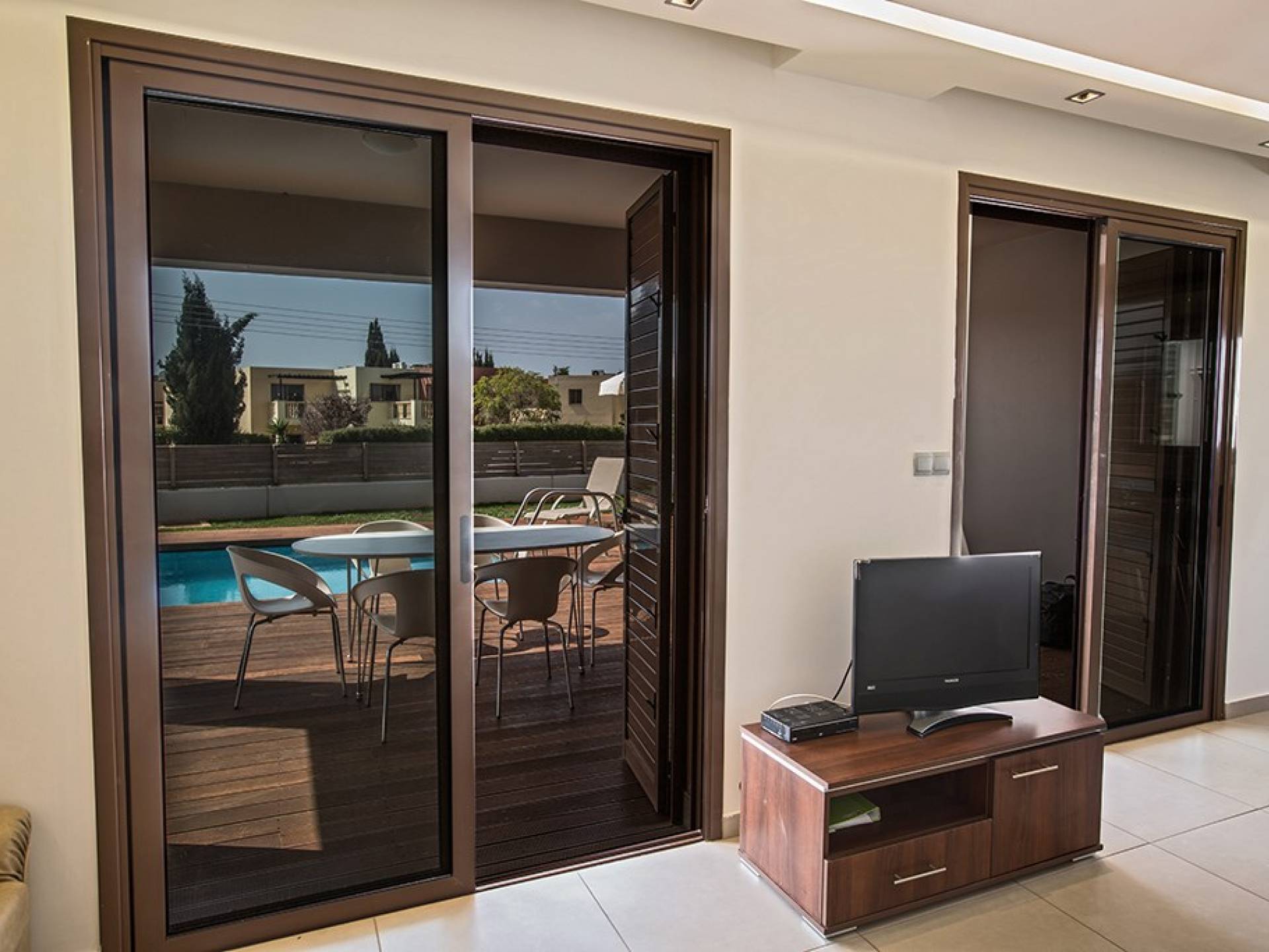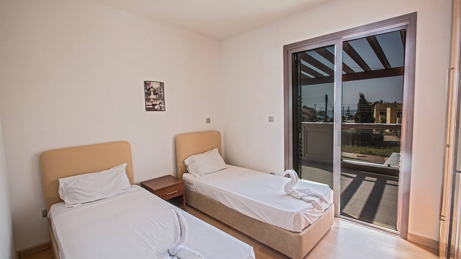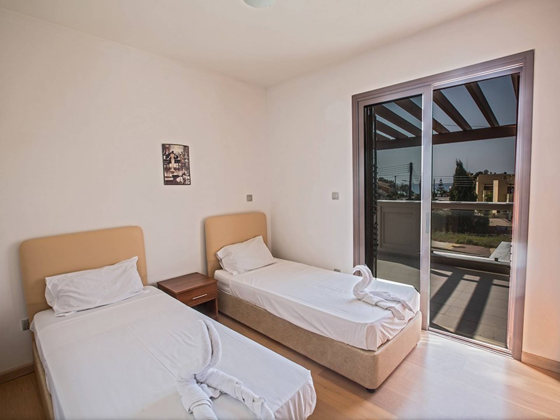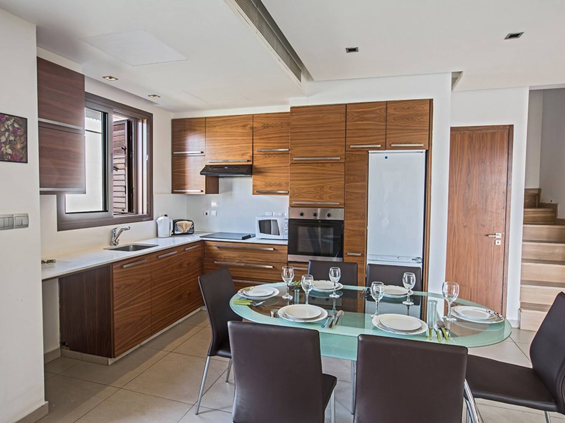 Καθώς μπαίνετε μέσα, θα βρείτε το μεγάλο, ενιαίο σαλόνι, την τραπεζαρία και την κουζίνα. Το σαλόνι διαθέτει άνετους καναπέδες, τηλεόραση ευρείας οθόνης και μεγάλες μπαλκονόπορτες που οδηγούν στον κήπο και την πισίνα. Η τραπεζαρία διαθέτει καθίσματα για 6 άτομα και η κουζίνα είναι εξοπλισμένη με όλα όσα χρειάζεστε για τη διαμονή σας με δυνατότητα προετοιμασίας γευμάτων. Ένα από τα τρία υπνοδωμάτια βρίσκεται σε αυτόν τον όροφο με διπλό κρεβάτι και πόρτες που οδηγούν στον κήπο, ξεχωριστό μπάνιο με ντουζιέρα και WC καθώς και ένα μικρό βοηθητικό δωμάτιο. Στον επάνω όροφο, θα βρείτε τα υπόλοιπα δύο υπνοδωμάτια, τα οποία διαθέτουν δύο μονά κρεβάτια και κοινόχρηστο μπαλκόνι. Όλα τα υπνοδωμάτια διαθέτουν εντοιχισμένες ντουλάπες και κομοδίνα. Υπάρχει ένα άλλο μπάνιο σε αυτόν τον όροφο με μπανιέρα, ντους και WC.
