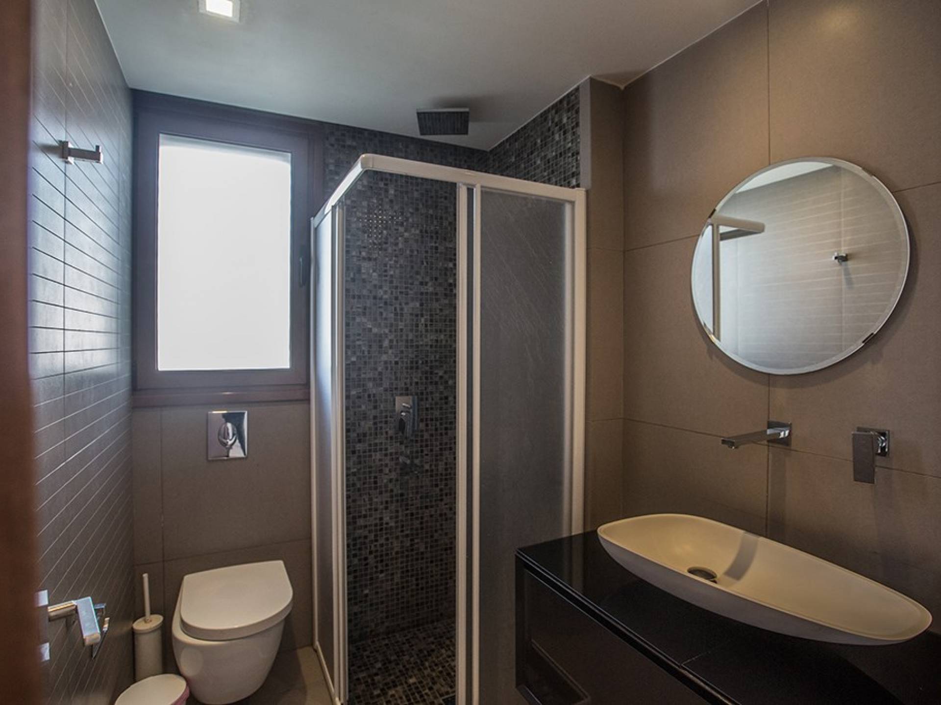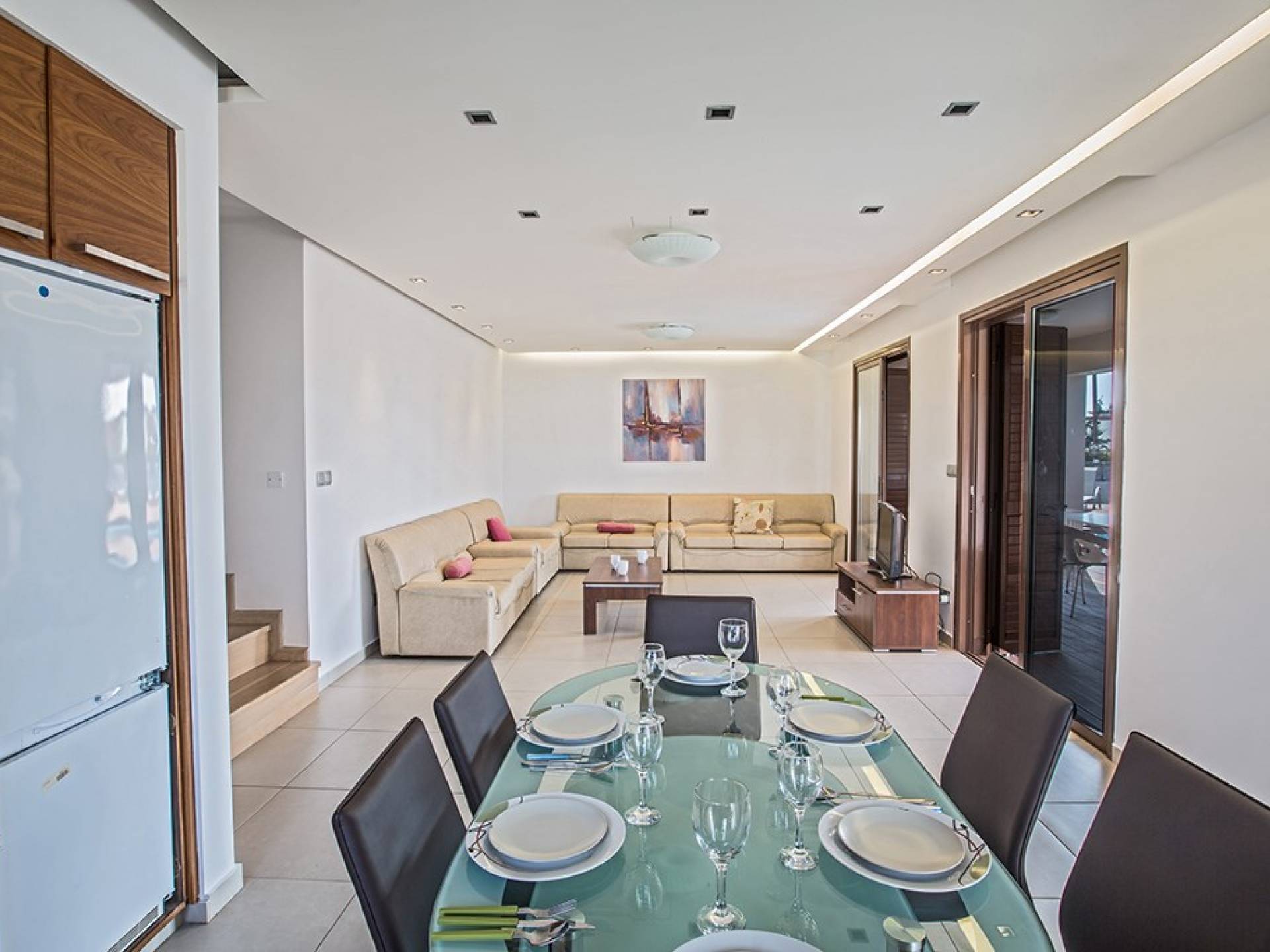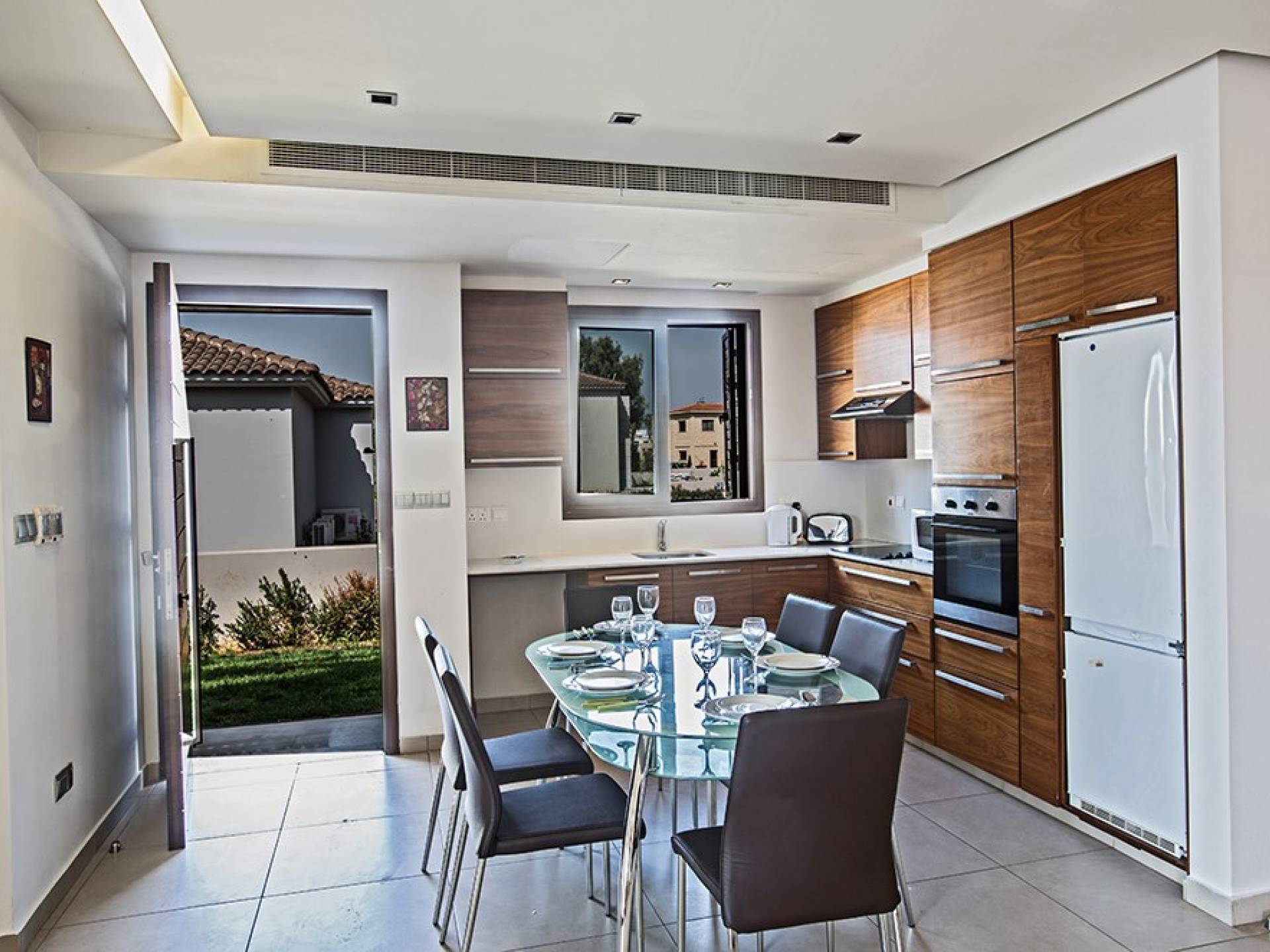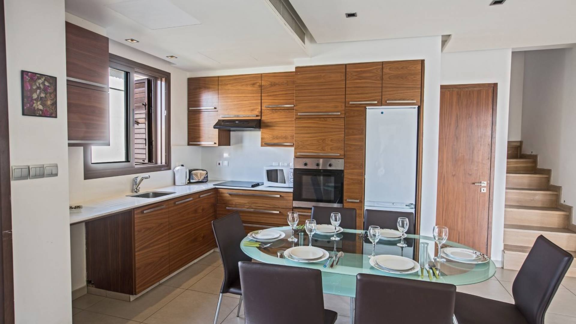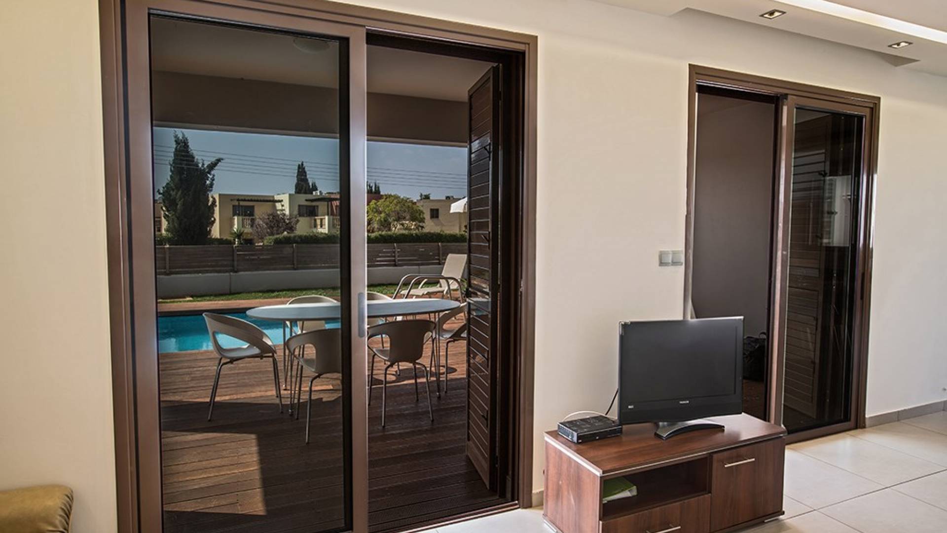 Καθώς μπαίνετε μέσα, θα βρείτε το μεγάλο, ενιαίο σαλόνι, την τραπεζαρία και την κουζίνα. Το σαλόνι διαθέτει άνετους καναπέδες, τηλεόραση ευρείας οθόνης και μεγάλες μπαλκονόπορτες που οδηγούν στον κήπο και την πισίνα. Η τραπεζαρία διαθέτει καθίσματα για 6 άτομα και η κουζίνα είναι εξοπλισμένη με όλα όσα χρειάζεστε για τη διαμονή σας με δυνατότητα προετοιμασίας γευμάτων. Ένα από τα τρία υπνοδωμάτια βρίσκεται σε αυτόν τον όροφο με διπλό κρεβάτι και πόρτες που οδηγούν στον κήπο, ξεχωριστό μπάνιο με ντουζιέρα και WC καθώς και ένα μικρό βοηθητικό δωμάτιο. Στον επάνω όροφο, θα βρείτε τα υπόλοιπα δύο υπνοδωμάτια, τα οποία διαθέτουν δύο μονά κρεβάτια και κοινόχρηστο μπαλκόνι. Όλα τα υπνοδωμάτια διαθέτουν εντοιχισμένες ντουλάπες και κομοδίνα. Υπάρχει ένα άλλο μπάνιο σε αυτόν τον όροφο με μπανιέρα, ντους και WC.