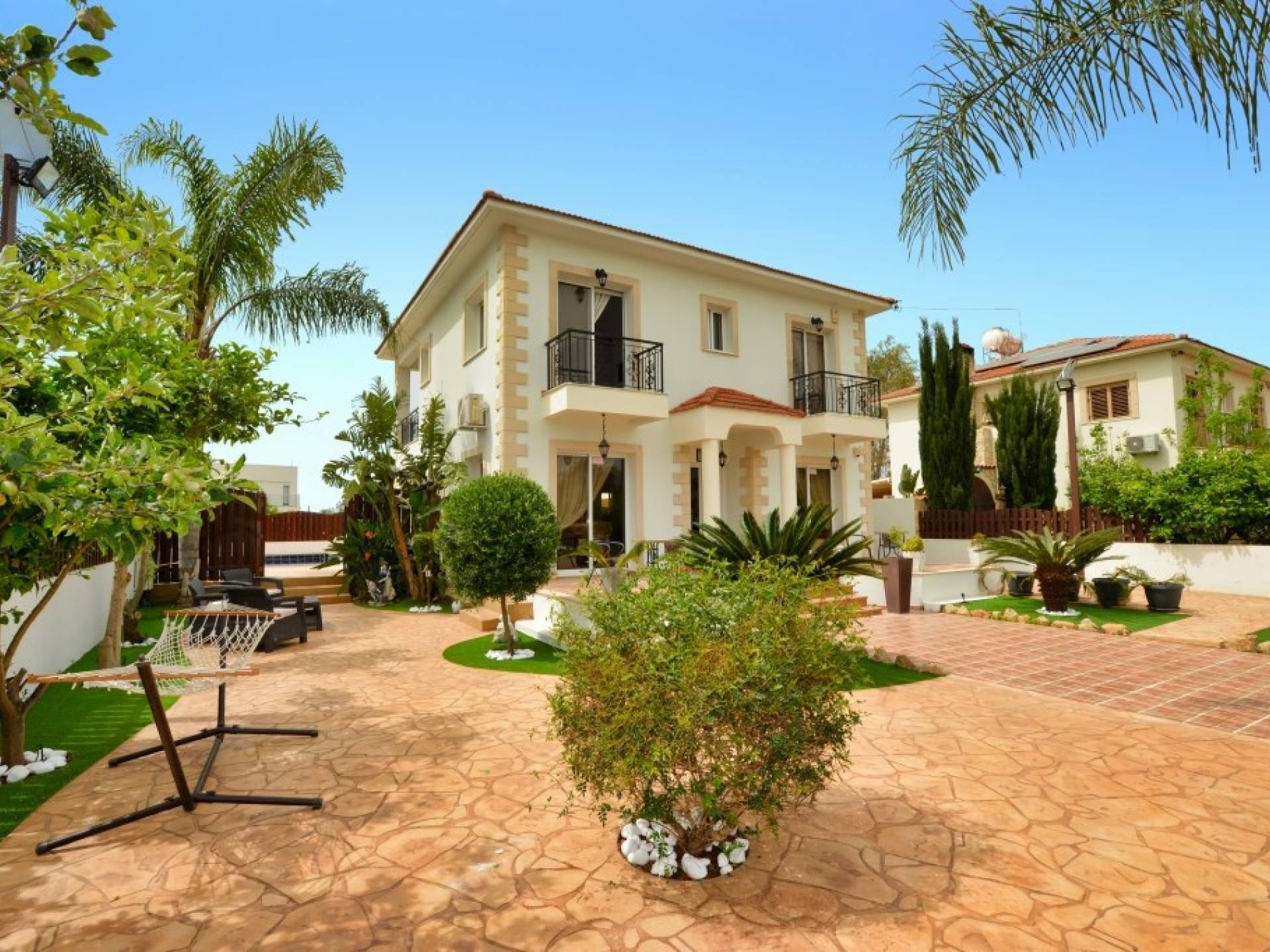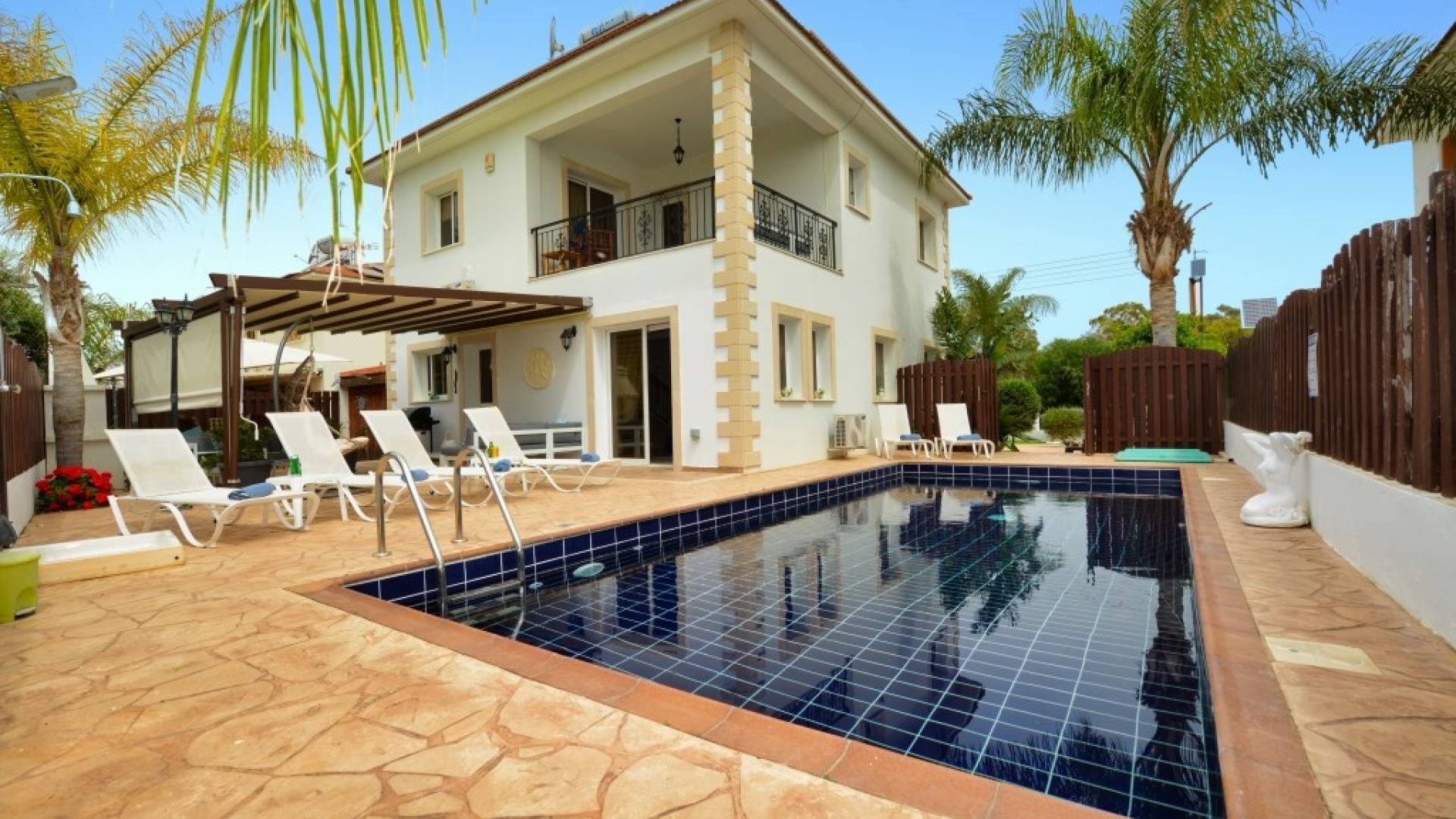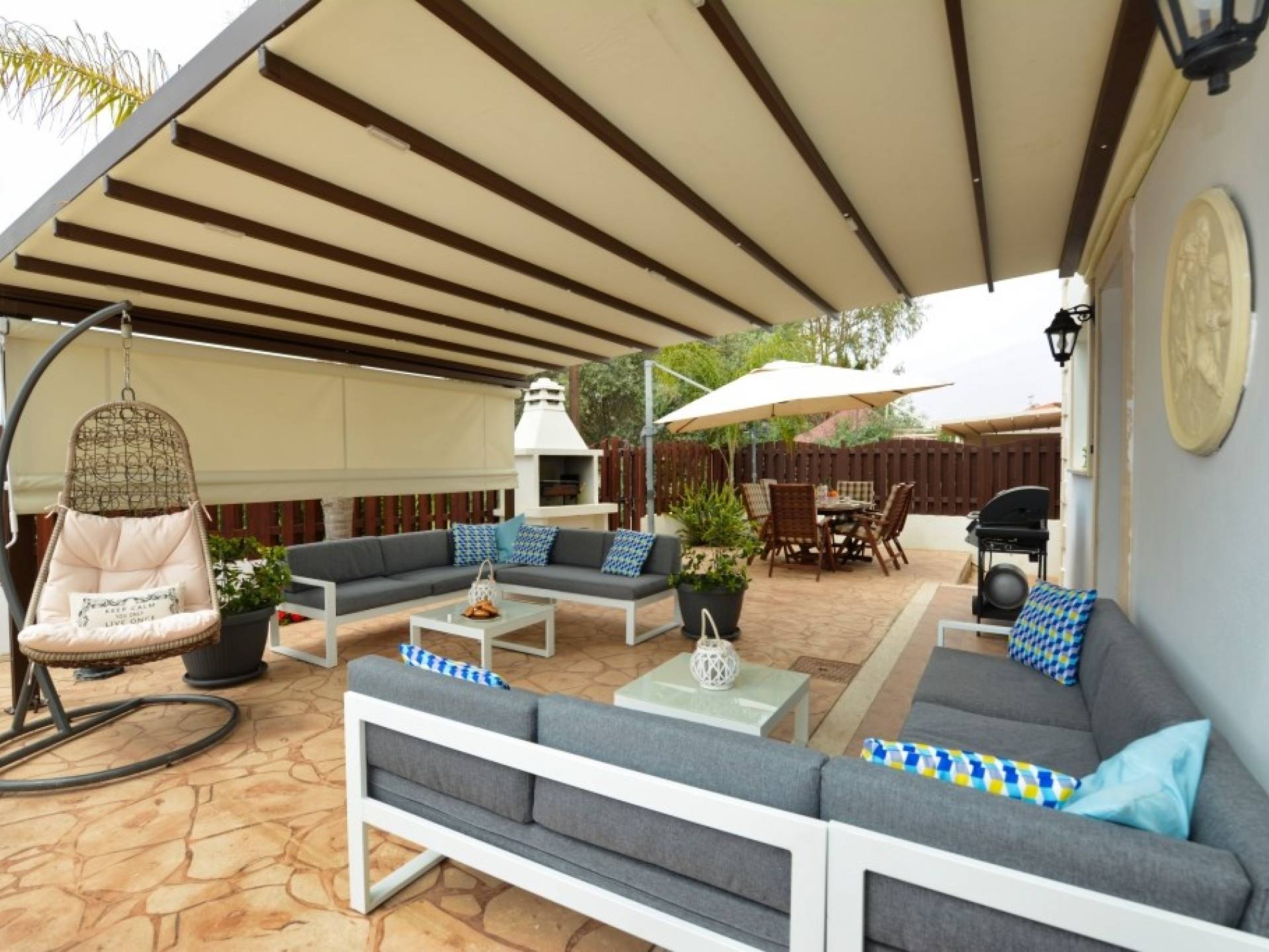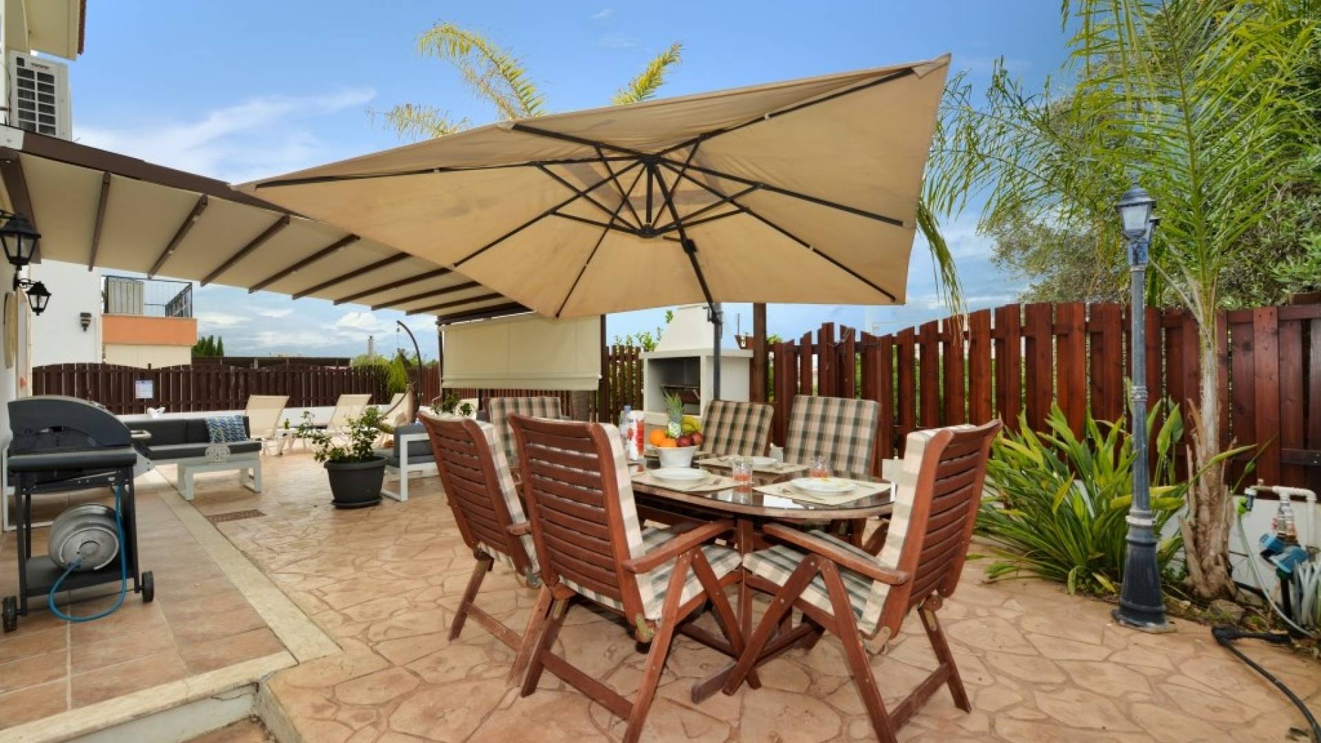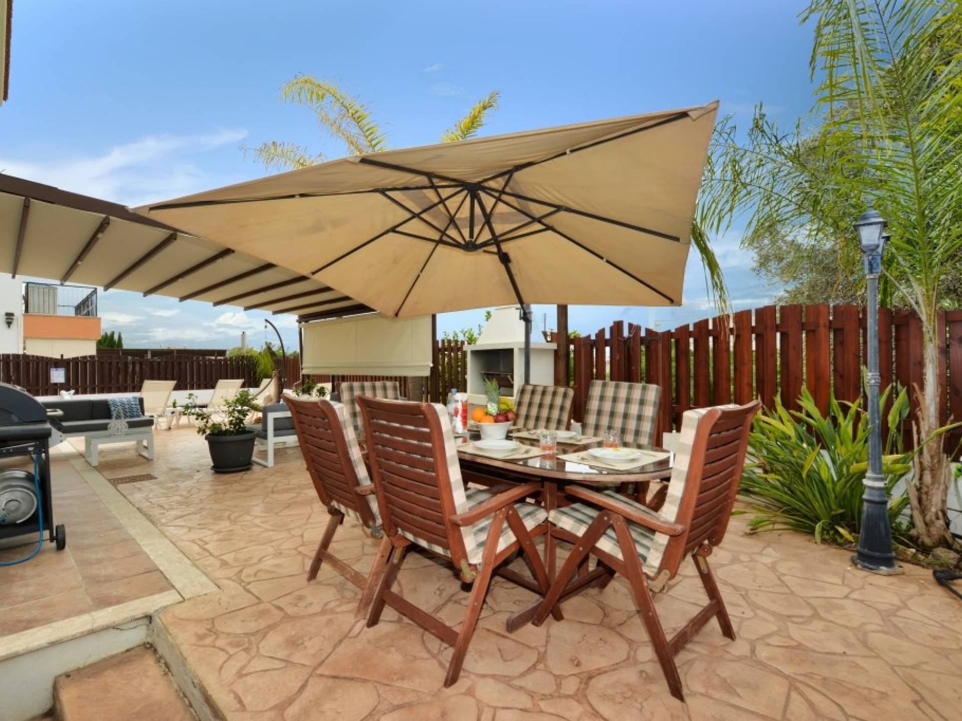 Έξω, η βίλα διαθέτει μεγάλο και περιποιημένο ιδιωτικό κήπο με σκιερή εξωτερική τραπεζαρία, εντοιχισμένο μπάρμπεκιου από τούβλα και μπάρμπεκιου αερίου, ξαπλώστρες και ιδιωτική πισίνα.