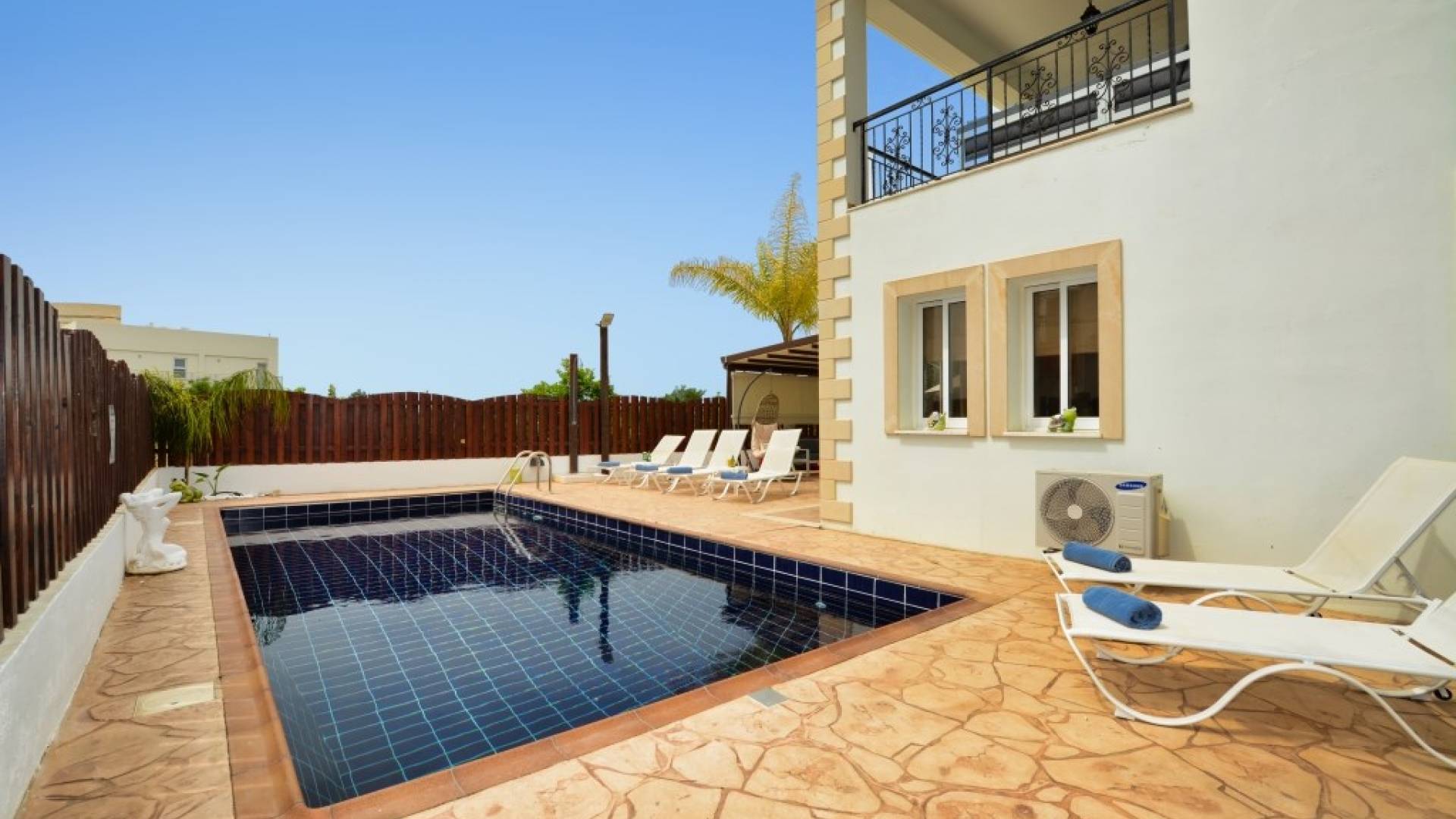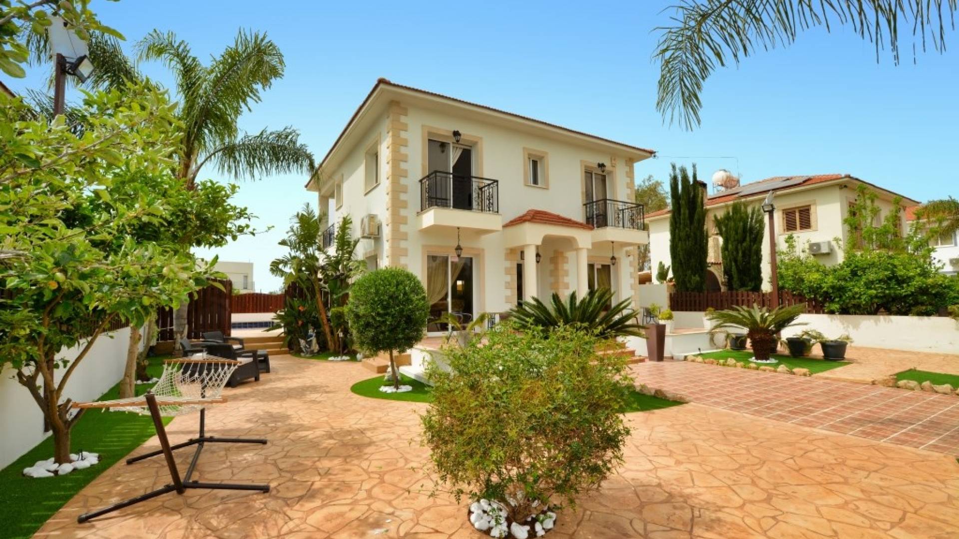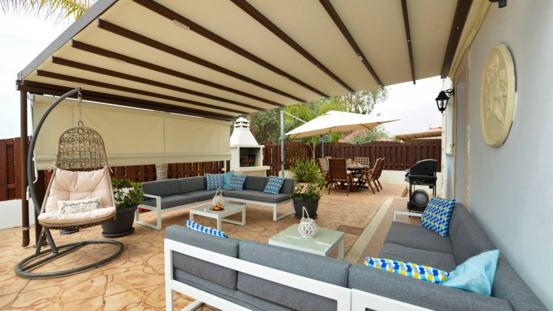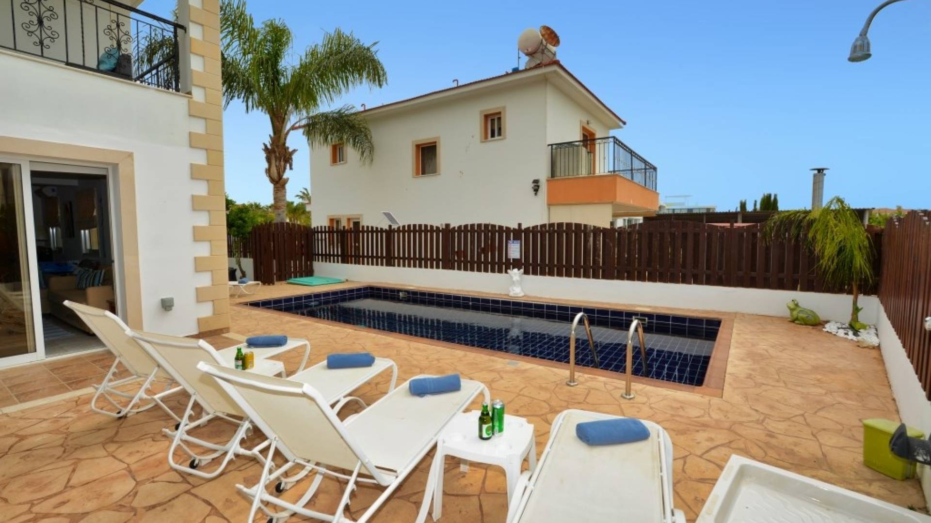 Έξω, η βίλα διαθέτει μεγάλο και περιποιημένο ιδιωτικό κήπο με σκιερή εξωτερική τραπεζαρία, εντοιχισμένο μπάρμπεκιου από τούβλα και μπάρμπεκιου αερίου, ξαπλώστρες και ιδιωτική πισίνα.