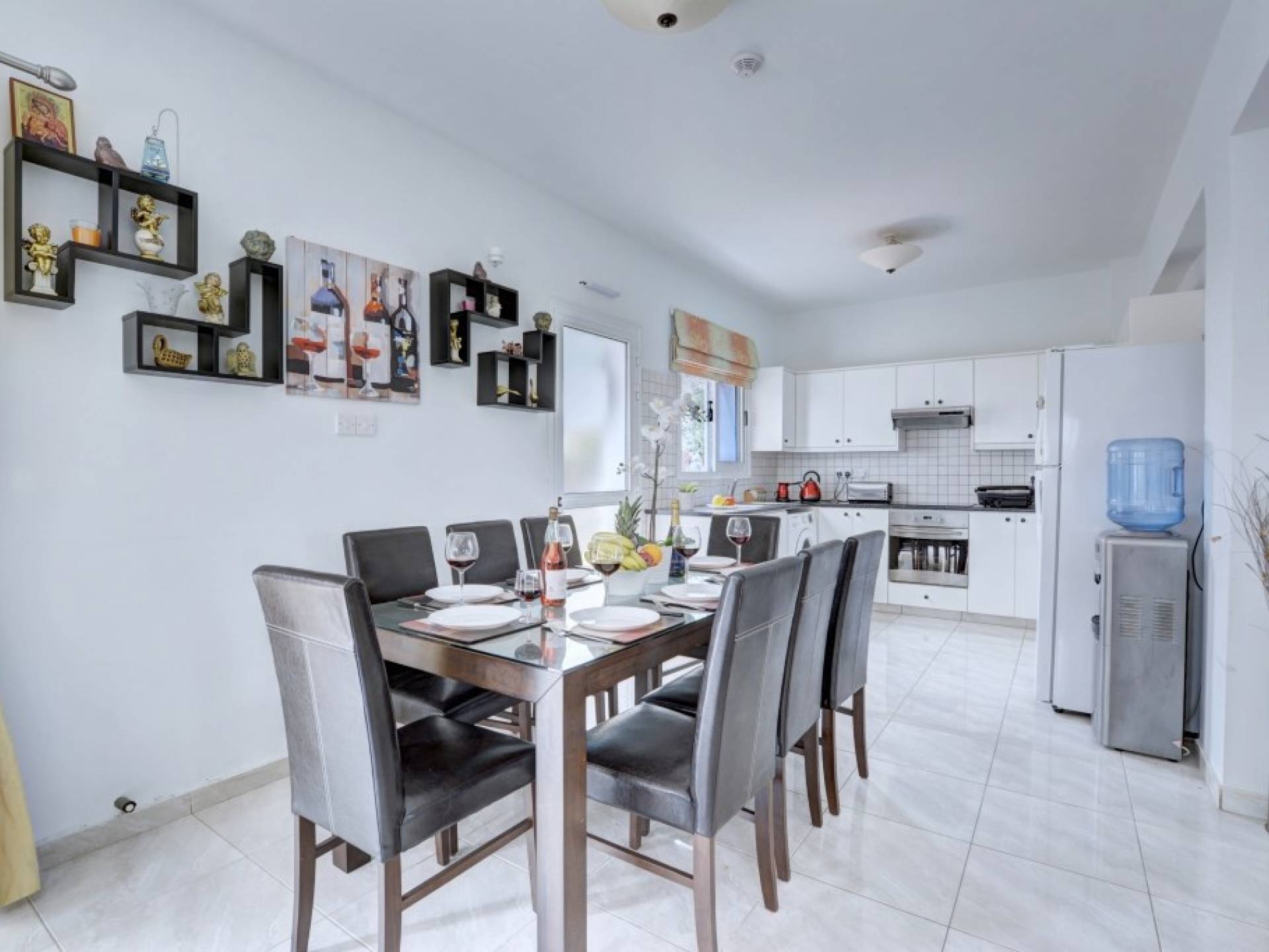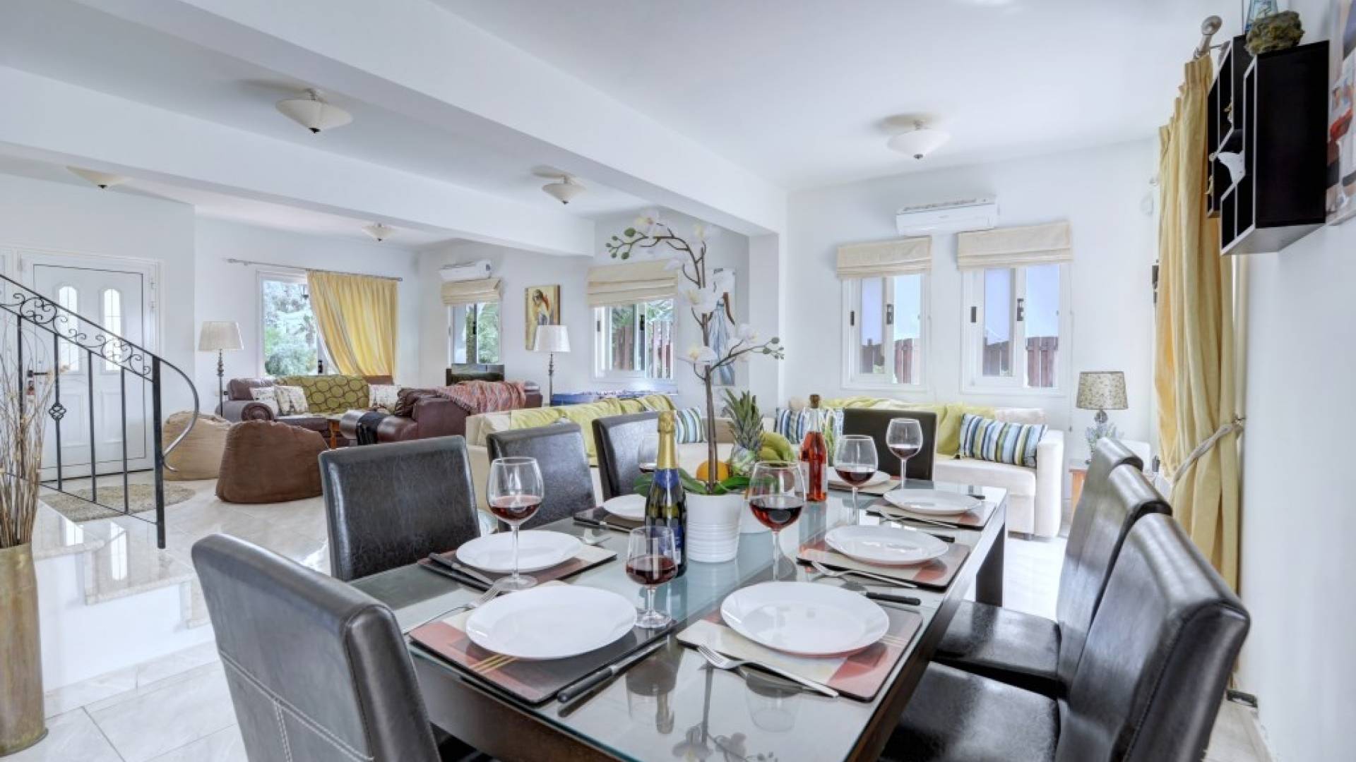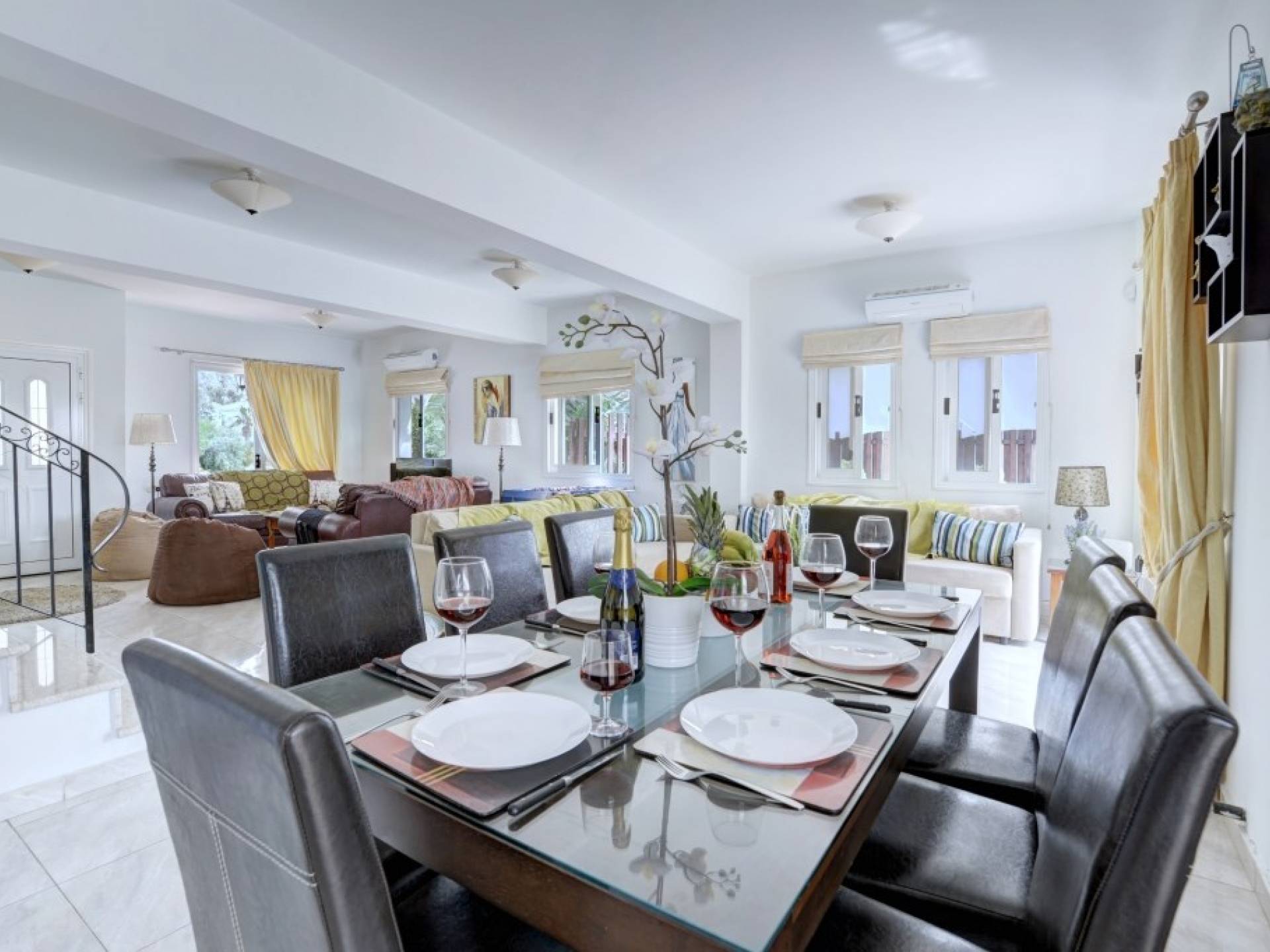 Στον κάτω όροφο, η βίλα διαθέτει ένα ευρύχωρο σαλόνι και τραπεζαρία με μπαλκονόπορτες που οδηγούν στον κήπο. Το σαλόνι διαθέτει άνετους καναπέδες και τηλεόραση ευρείας οθόνης με άφθονο καθιστικό. Από το σαλόνι ξεκινά η μεγάλη κουζίνα με ένα επιπλέον τραπέζι φαγητού με καθίσματα για 8 άτομα, η κουζίνα είναι πλήρως εξοπλισμένη με όλα τα απαραίτητα για μια άνετη διαμονή με δυνατότητα προετοιμασίας γευμάτων. Θα βρείτε επίσης ένα από τα δίκλινα υπνοδωμάτια με 2 μονά κρεβάτια και ένα ξεχωριστό WC σε αυτόν τον όροφο.